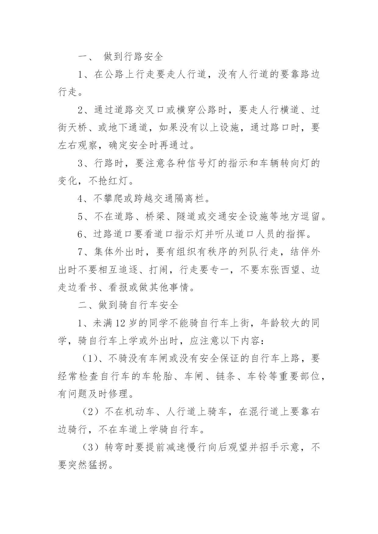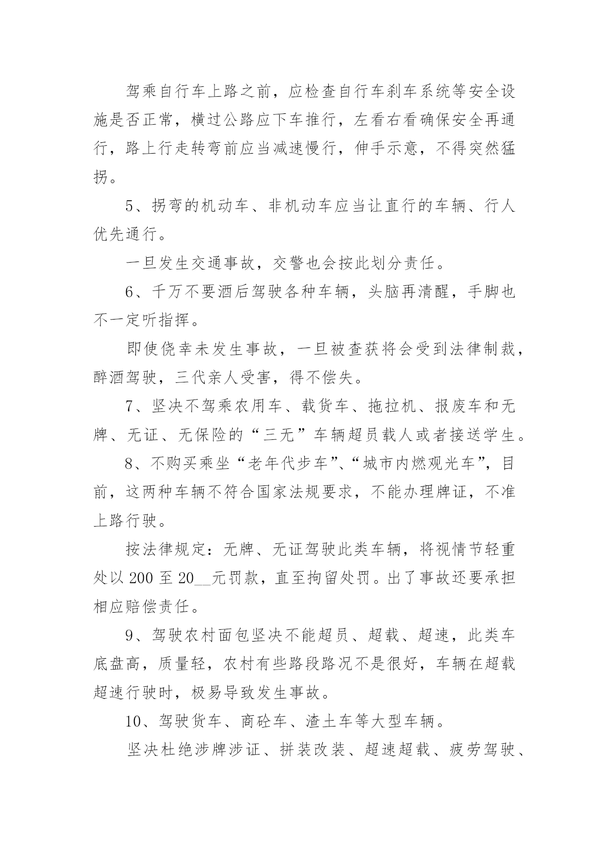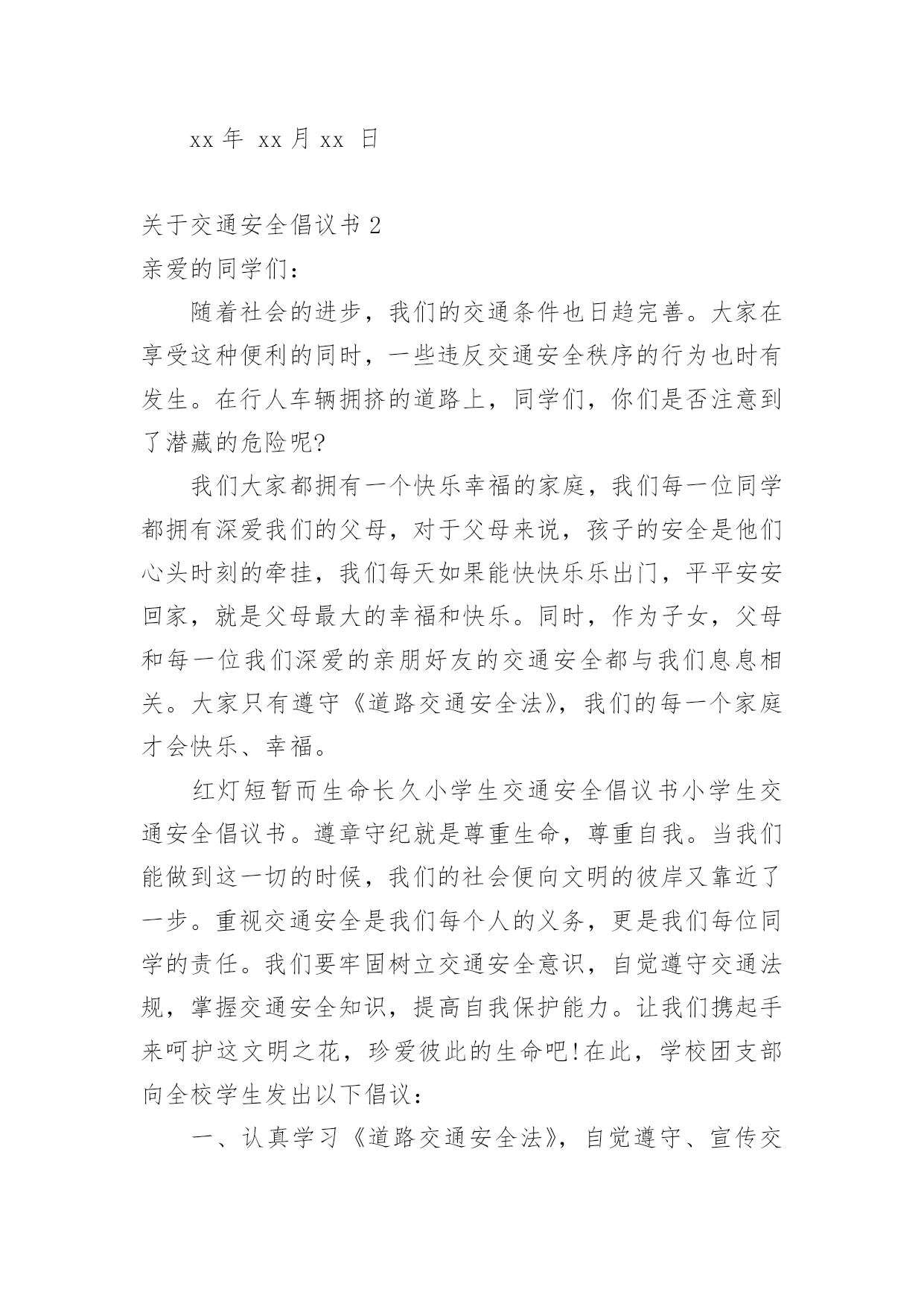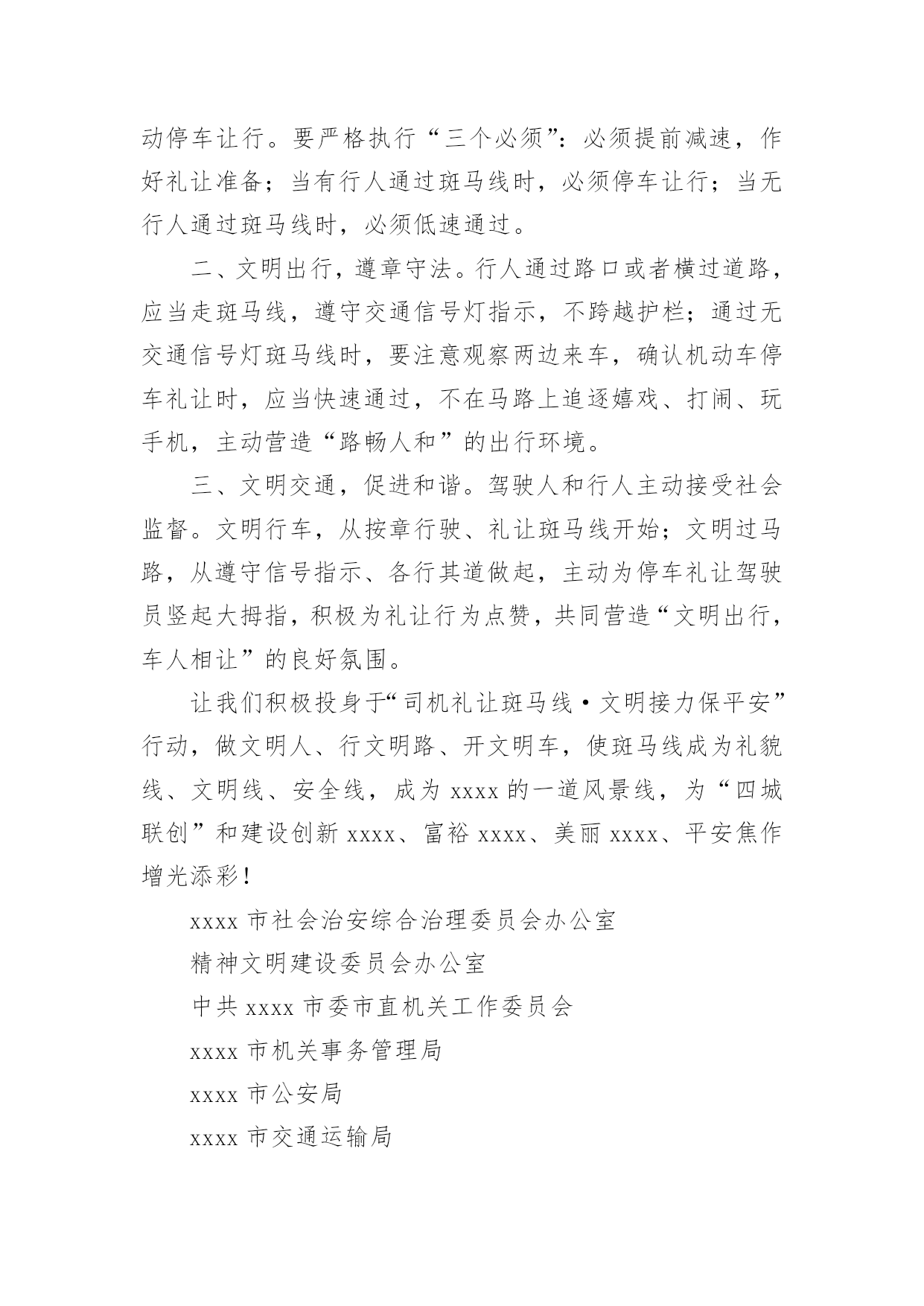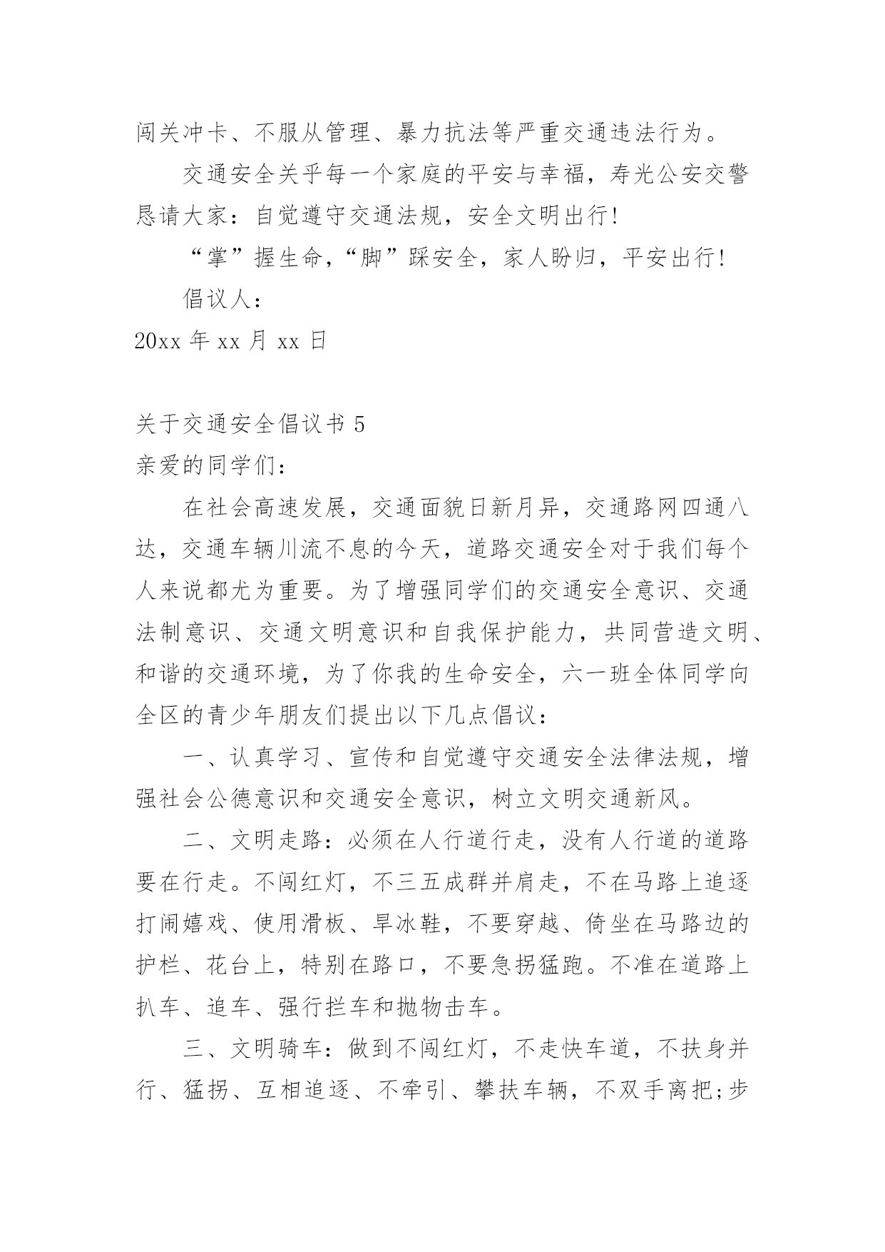 交通安全倡议书关于交通安全倡议书(通用15篇)在学习、工作生活中,接触并使用倡议书的人越来越多,倡议书一般由标题、称呼、正文、结尾、落款五部分组成。还是对倡议书一筹莫展吗?下面是小编为大家整理的关于交通安全倡议书,仅供参考,希望能够帮助到大家。关于交通安全倡议书1广大驾驶员朋友、市民朋友们:当前,我市上下正全力以赴创建全国文明城市提名城市、国家卫生城市、国家全域旅游示范市、国家水生态文明城市。为助力“四城联创”“让群众更满意”,全市政法综治系统率先在公交营运车辆、公务车辆、公职人员私家车范围启动礼让斑马线行动,逐步引导规范广大车主增强礼让斑马线意识。开展“司机礼让斑马线·文明接力保平安”活动,为树立我市文明形象、打造平安和谐软环境、提高城市综合竞争力有着十分重要的意义。作为焦作人,尤其是党政机关企事业单位的党员、干部、职工,我们更要坚决响应市委、市政府关于创建全国文明城市提名城市、“让群众更满意”的号召,理应成为文明交通的实践者、参与者、支持者。为此,特发出如下倡议:一、文明驾车,礼让行人。车辆在行经斑马线路段时,主动减速行驶,不争道抢行;遇行人正在通过斑马线时,主动停车让行。要严格执行“三个必须”:必须提前减速,作好礼让准备;当有行人通过斑马线时,必须停车让行;当无行人通过斑马线时,必须低速通过。二、文明出行,遵章守法。行人通过路口或者横过道路,应当走斑马线,遵守交通信号灯指示,不跨越护栏;通过无交通信号灯斑马线时,要注意观察两边来车,确认机动车停车礼让时,应当快速通过,不在马路上追逐嬉戏、打闹、玩手机,主动营造“路畅人和”的出行环境。三、文明交通,促进和谐。驾驶人和行人主动接受社会监督。文明行车,从按章行驶、礼让斑马线开始;文明过马路,从遵守信号指示、各行其道做起,主动为停车礼让驾驶员竖起大拇指,积极为礼让行为点赞,共同营造“文明出行,车人相让”的良好氛围。让我们积极投身于“司机礼让斑马线·文明接力保平安”行动,做文明人、行文明路、开文明车,使斑马线成为礼貌线、文明线、安全线,成为xxxx的一道风景线,为“四城联创”和建设创新xxxx、富裕xxxx、美丽xxxx、平安焦作增光添彩!xxxx市社会治安综合治理委员会办公室精神文明建设委员会办公室中共xxxx市委市直机关工作委员会xxxx市机关事务管理局xxxx市公安局xxxx市交通运输局xx年xx月xx日关于交通安全倡议书2亲爱的同学们:随着社会的进步,我们的交通条件也日趋完善。大家在享受这种便利的同时,一些违反交通安全秩序的行为也时有发生。在行人车辆拥挤的道路上,同学们,你们是否注意到了潜藏的危险呢?我们大家都拥有一个快乐幸福的家庭,我们每一位同学都拥有深爱我们的父母,对于父母来说,孩子的安全是他们心头时刻的牵挂,我们每天如果能快快乐乐出门,平平安安回家,就是父母最大的幸福和快乐。同时,作为子女,父母和每一位我们深爱的亲朋好友的交通安全都与我们息息相关。大家只有遵守《道路交通安全法》,我们的每一个家庭才会快乐、幸福。红灯短暂而生命长久小学生交通安全倡议书小学生交通安全倡议书。遵章守纪就是尊重生命,尊重自我。当我们能做到这一切的时候,我们的社会便向文明的彼岸又靠近了一步。重视交通安全是我们每个人的义务,更是我们每位同学的责任。我们要牢固树立交通安全意识,自觉遵守交通法规,掌握交通安全知识,提高自我保护能力。让我们携起手来呵护这文明之花,珍爱彼此的生命吧!在此,学校团支部向全校学生发出以下倡议:一、认真学习《道路交通安全法》,自觉遵守、宣传交通法规,从走路、乘车、骑车等方面养成良好的交通习惯,告别交通陋习,争做遵章守法“小公民”。(1)通过路口要遵守“红灯停、绿灯行”,做到停车不越线;(2)人车各行其道,在没有分车道的路段,要靠右行驶;(3)行人须在人行横道内行走,在没有人行横道的路段,要靠路边右侧行走;(4)不骑车带人,不违章载物;与同学结伴行走时,不在公路上追逐玩耍、三五成群并肩行走或聚集停留;(5)确保自行车闸、铃、锁、牌齐全有效,要在划有停车区域停放车辆,不乱停、乱放;(6)骑自行车横过机动车道时,应下车推行;行人横穿马路时须走人行横道;不斜穿、猛跑,不贪图方便翻越、钻跨交通隔离护栏和隔离墩。(7)乘坐公交车时,请在站台或人行道上等候,车辆停稳后依次先下后上二、主动宣传交通安全法规,积极参加交通安全社会公益活动小学生交通安全倡议书默认。三、要提高自我防范意识及遇到紧急情况时的处置能力。见到交通肇事逃逸车要设法记住车牌号码和车辆特征,并及时向公安机关报告(电话:110、112)。车让人,让出一份文明;人让车,让出一份安全;车让车,让出一份秩序。同学们!让我们积极行动起来,珍视安全,珍爱生命,为了你和他人的生命财产安全,共同抵制不文明的交通行为,自觉遵守交通法规,安全文
