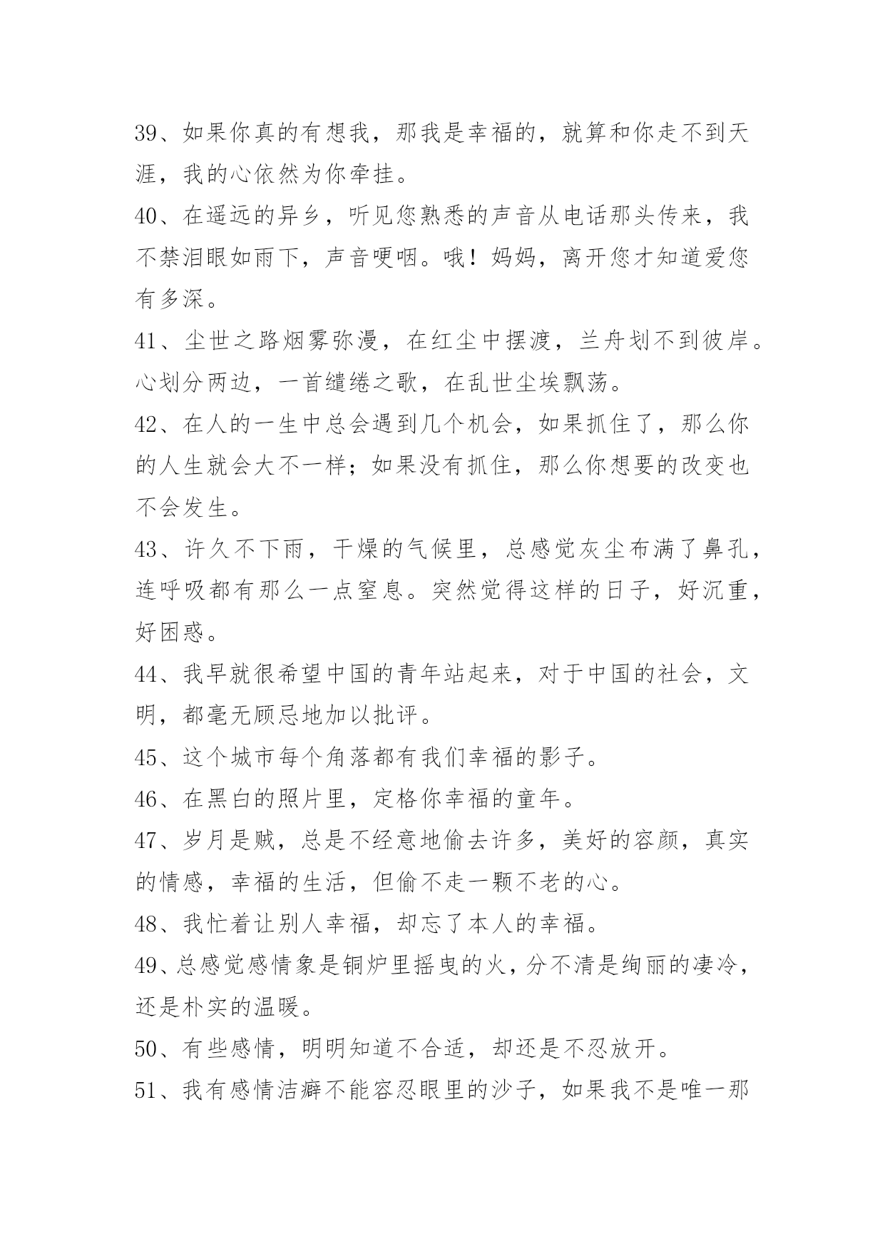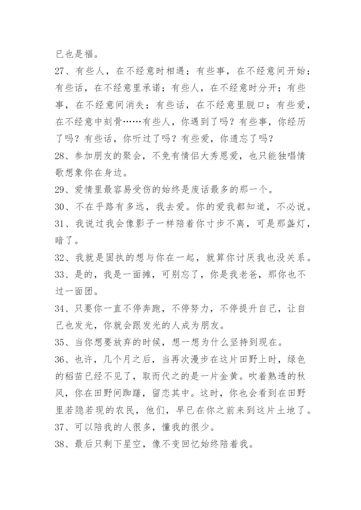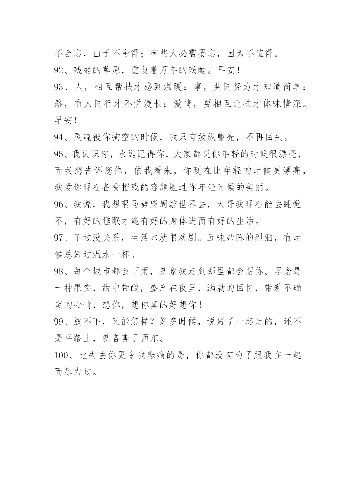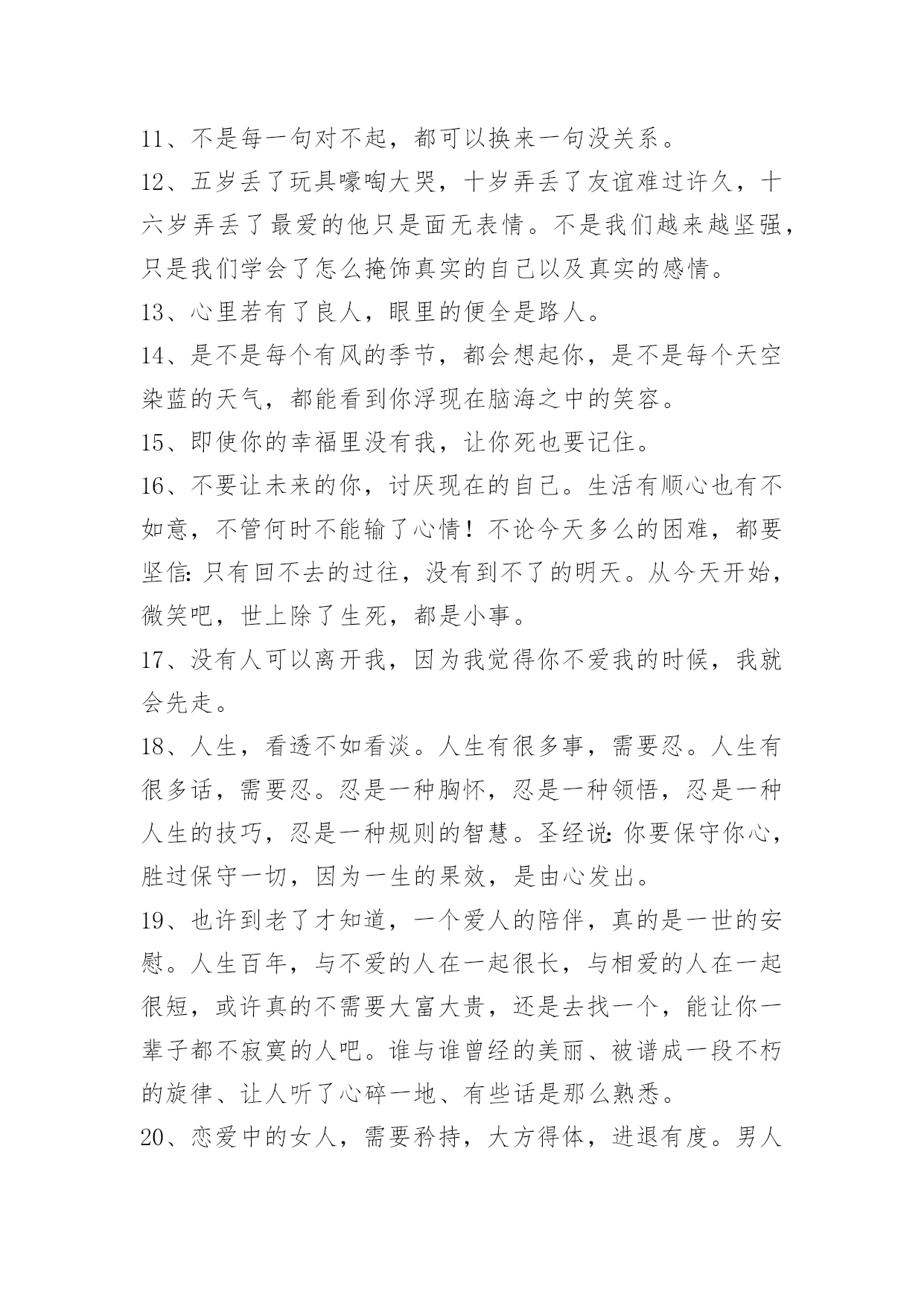 感人的情感语录100条【推荐】2023年感人的情感语录大集合100条伴侣,不是说话时总是把"你"和"我"翻译成"我们"的那个人,而是时而说"你",时而说"我",时而说"我们"的那个人。以下是小编整理的感人的情感语录100条,一起来看一下吧。1、曾经以为我的生命里再也不会有彩色,可是,你的出现让我看到了满眼生命的色彩。美丽的相识,甜蜜的邂逅,在心灵深处扎根。茫然不知,美景总那样短暂,还不及说声挽留,你就走了。2、那些曾经说要陪我到地老天荒的人,如今你们又在那里。3、其实一切最后都是回忆,所以,请尽量正确的记忆。4、翻阅着以前的回忆,才发现当初的自己多么的傻。5、到不了的远方即使永远,忘不了的就是那曾经。6、臣妾以为臣妾用尽全力,便可以填满君感情的缺口。7、你就是我的计划表,一切行动只为你一笑;你就是我的生物钟,一切时刻都只为你轻松。希望有我的分分秒秒,你都能幸福得溢于言表。8、有些事注定成为故事,有些人注定成为故人,不必挂念,不必留恋,偶尔记起。9、生活就像新闻联播,不是换台就能逃避的。10、如果放弃真那么容易,谁会选择纠缠,道理谁都懂,可是真正喜欢的人,怎么能那么轻易的放手。11、不是每一句对不起,都可以换来一句没关系。12、五岁丢了玩具嚎啕大哭,十岁弄丢了友谊难过许久,十六岁弄丢了最爱的他只是面无表情。不是我们越来越坚强,只是我们学会了怎么掩饰真实的自己以及真实的感情。13、心里若有了良人,眼里的便全是路人。14、是不是每个有风的季节,都会想起你,是不是每个天空染蓝的天气,都能看到你浮现在脑海之中的笑容。15、即使你的幸福里没有我,让你死也要记住。16、不要让未来的你,讨厌现在的自己。生活有顺心也有不如意,不管何时不能输了心情!不论今天多么的困难,都要坚信:只有回不去的过往,没有到不了的明天。从今天开始,微笑吧,世上除了生死,都是小事。17、没有人可以离开我,因为我觉得你不爱我的时候,我就会先走。18、人生,看透不如看淡。人生有很多事,需要忍。人生有很多话,需要忍。忍是一种胸怀,忍是一种领悟,忍是一种人生的技巧,忍是一种规则的智慧。圣经说:你要保守你心,胜过保守一切,因为一生的果效,是由心发出。19、也许到老了才知道,一个爱人的陪伴,真的是一世的安慰。人生百年,与不爱的人在一起很长,与相爱的人在一起很短,或许真的不需要大富大贵,还是去找一个,能让你一辈子都不寂寞的人吧。谁与谁曾经的美丽、被谱成一段不朽的旋律、让人听了心碎一地、有些话是那么熟悉。20、恋爱中的女人,需要矜持,大方得体,进退有度。男人是烈火,女人则是温泉,用你的矜持,保持自己不被燃烧,不要等到风情万种之后,剩下的只有寂寞与灰暗,孤独与失望,如同绽放的烟花,烟花散尽,灰飞烟灭。婚姻中的女人,也需要矜持。在家人的面前,也不可过于随便,不要因为家是放松的港湾,而失去矜持的一面。21、我没有看上去听上去那么幸福,我过得很不好,我真的不想说谎。22、我们都在找寻着幸福,只是幸福像个调皮的孩子,常常躲在我们。23、我,要笑得和她一样甜。要你知道,没有你,我依然幸福。24、如果有一天你走得太倦,只要一转身我的祝福就在你身边;不管离多远、不管多少年,化这祝福为蓝星点点!闪在晨曦,闪在日暮,闪在你生命的每一天!25、迷茫于孤独的风口,你在哀叹,在幽怨,在寻找着自己情感的归属。26、亏己者,能让人们觉得他有肚量而加以敬重。这样,亏己者的人际关系自然就比别人好。当他遇到困难时,别人也乐于向他伸出援助之手;当他干事业时,别人也肯给予支持,给予帮助。他的事业自然就容易获得成功。只要留心一下历史和身边的人,就不难发现,那些取得了巨大成就的人,尤其是那些有杰出成就的人,无一不是胸怀宽广又能亏已的人。相反,看看我们身边那些一生无所作为、无所建树的人,有哪一个不是心胸窄、爱计较、不肯亏已之辈?由此可见,亏已也是福。27、有些人,在不经意时相遇;有些事,在不经意间开始;有些话,在不经意里承诺;有些人,在不经意时分开;有些事,在不经意间消失;有些话,在不经意里脱口;有些爱,在不经意中刻骨……有些人,你遇到了吗?有些事,你经历了吗?有些话,你听过了吗?有些爱,你遗忘了吗?28、参加朋友的聚会,不免有情侣大秀恩爱,也只能独唱情歌想象你在身边。29、爱情里最容易受伤的始终是废话最多的那一个。30、不在乎路有多远,我去爱。你的爱我都知道,不必说。31、我说过我会像影子一样陪着你寸步不离,可是那盏灯,暗了。32、我就是固执的想与你在一起,就算你讨厌我也没关系。33、是的,我是一面摊,可别忘了,你是我老爸,那你也不过一面团。34、只要你一直不停奔跑,不停努力,不停提升自己,让自己也发光,你就会跟发光的人成为朋友。35、当你想要放弃的时候,想一想为什么坚持到现在。36、也许,几个月之后,当再次漫步在这片田野上