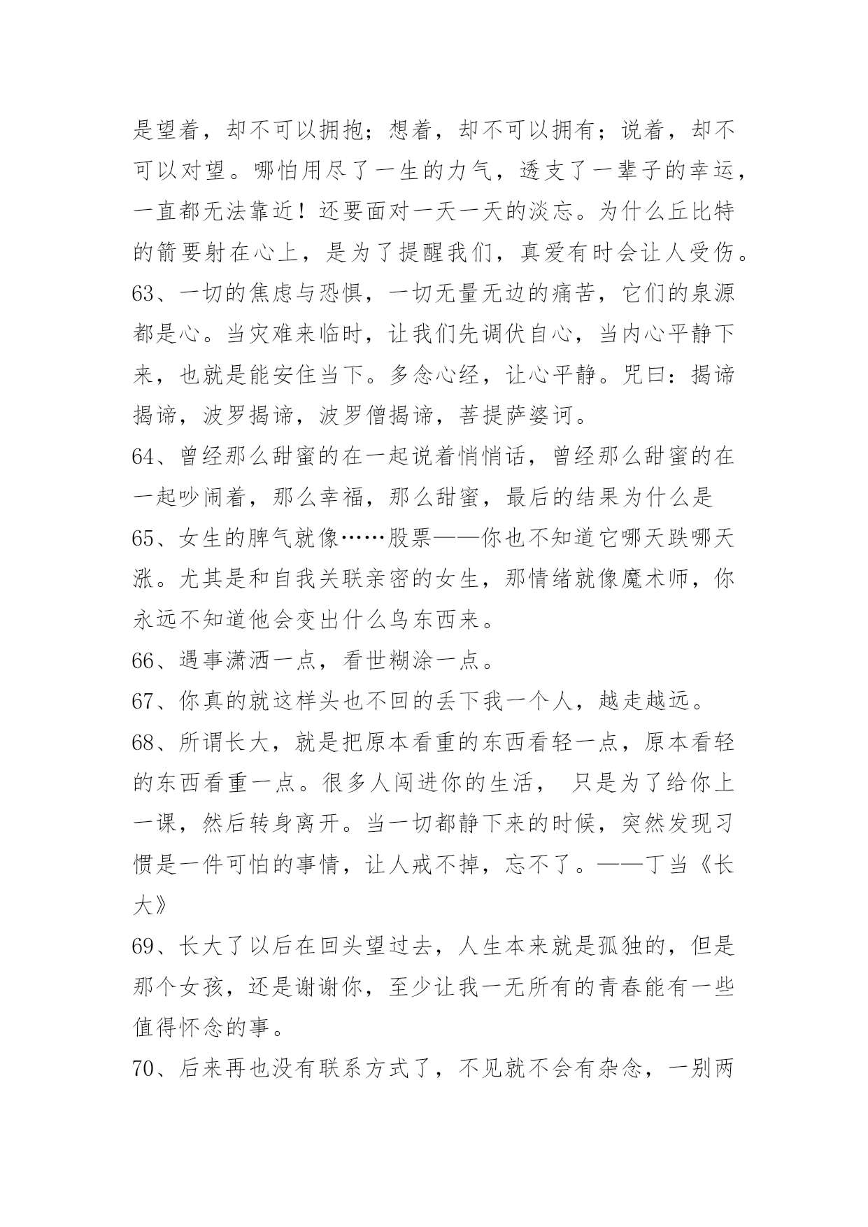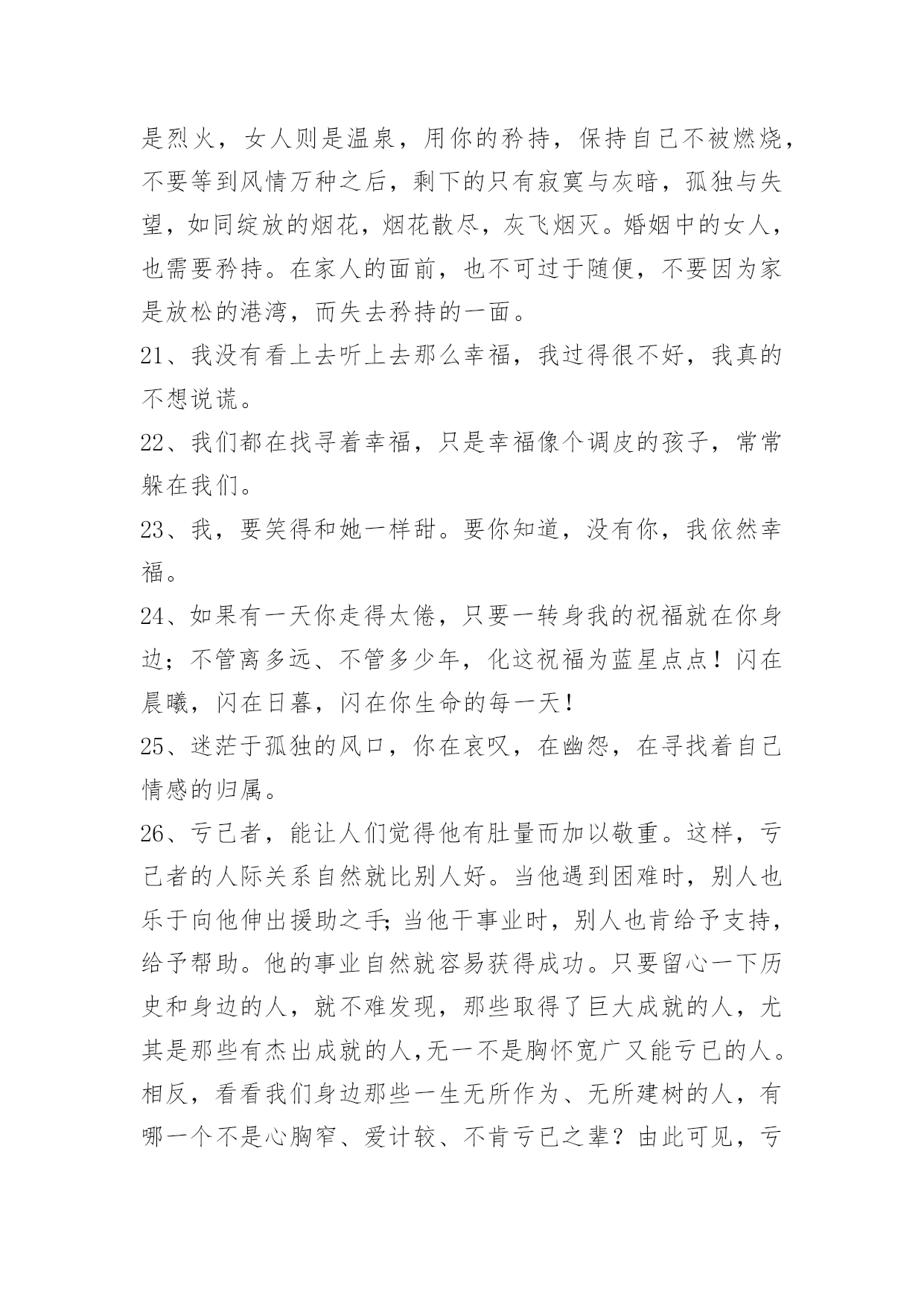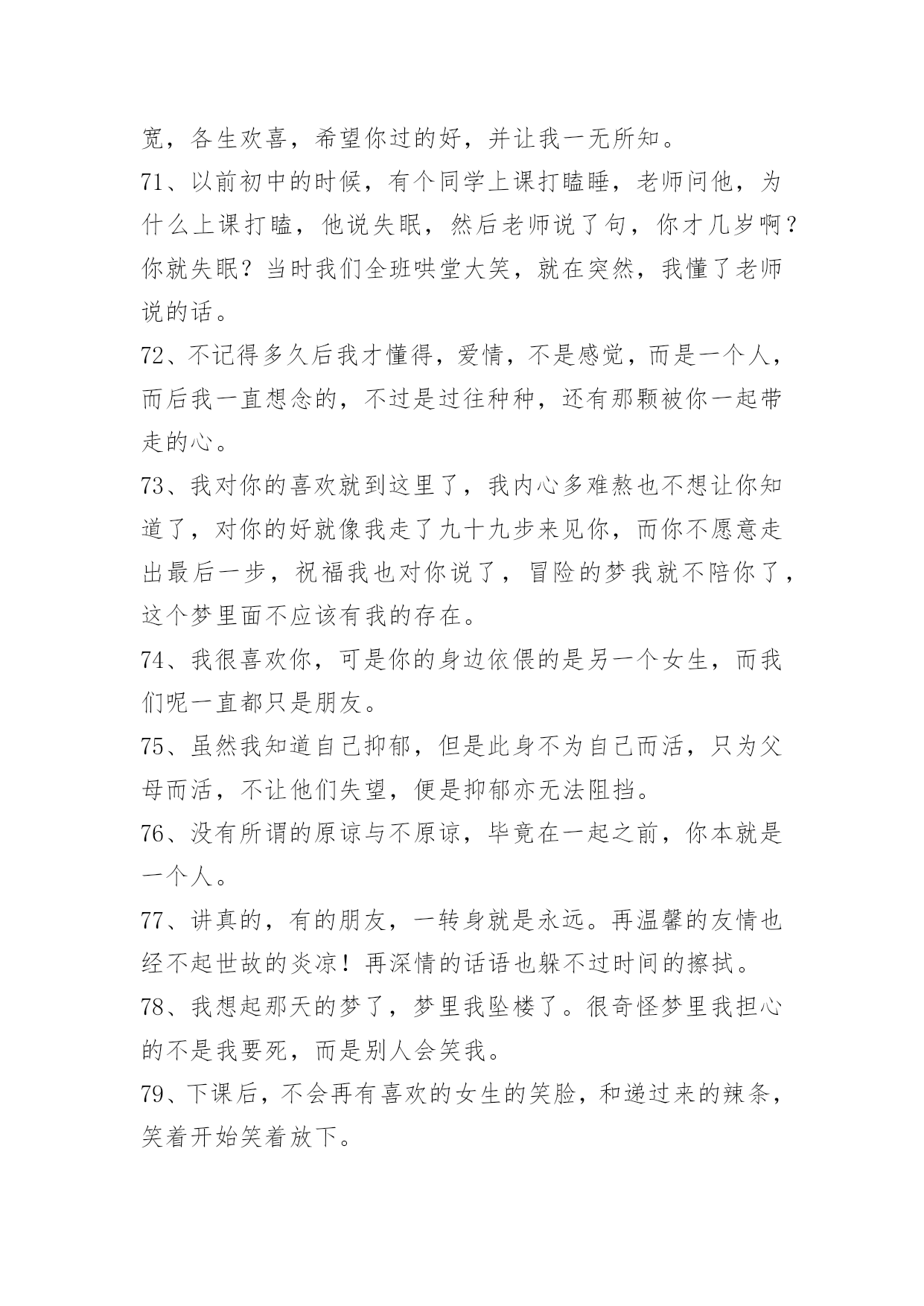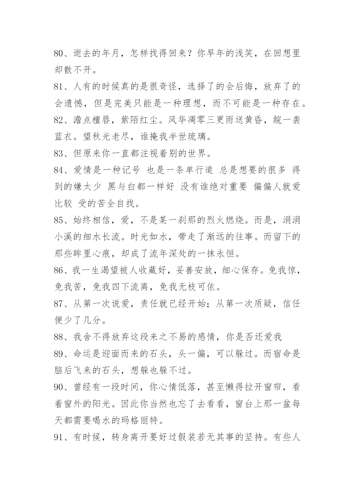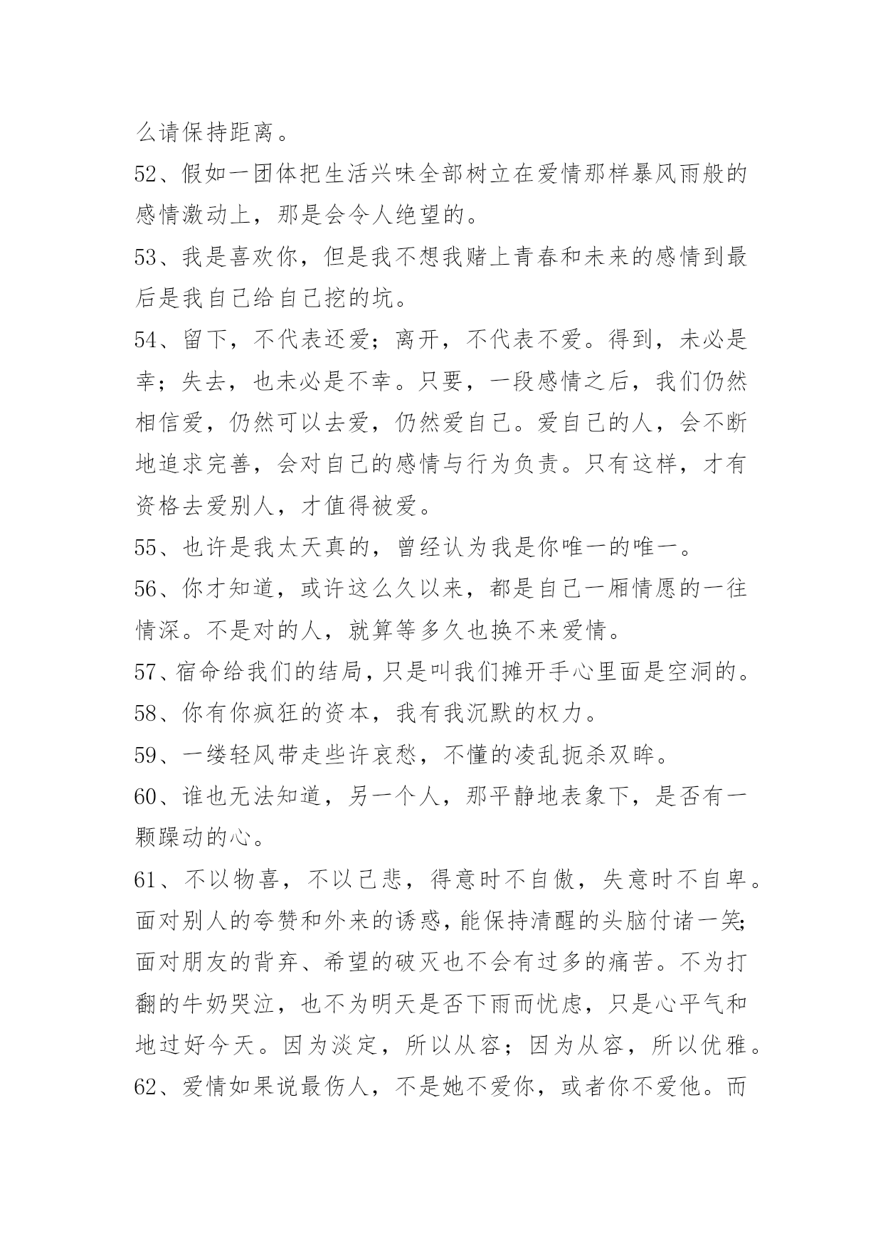 感人的情感语录100条【推荐】2023年感人的情感语录大集合100条伴侣,不是说话时总是把"你"和"我"翻译成"我们"的那个人,而是时而说"你",时而说"我",时而说"我们"的那个人。以下是小编整理的感人的情感语录100条,一起来看一下吧。1、曾经以为我的生命里再也不会有彩色,可是,你的出现让我看到了满眼生命的色彩。美丽的相识,甜蜜的邂逅,在心灵深处扎根。茫然不知,美景总那样短暂,还不及说声挽留,你就走了。2、那些曾经说要陪我到地老天荒的人,如今你们又在那里。3、其实一切最后都是回忆,所以,请尽量正确的记忆。4、翻阅着以前的回忆,才发现当初的自己多么的傻。5、到不了的远方即使永远,忘不了的就是那曾经。6、臣妾以为臣妾用尽全力,便可以填满君感情的缺口。7、你就是我的计划表,一切行动只为你一笑;你就是我的生物钟,一切时刻都只为你轻松。希望有我的分分秒秒,你都能幸福得溢于言表。8、有些事注定成为故事,有些人注定成为故人,不必挂念,不必留恋,偶尔记起。9、生活就像新闻联播,不是换台就能逃避的。10、如果放弃真那么容易,谁会选择纠缠,道理谁都懂,可是真正喜欢的人,怎么能那么轻易的放手。11、不是每一句对不起,都可以换来一句没关系。12、五岁丢了玩具嚎啕大哭,十岁弄丢了友谊难过许久,十六岁弄丢了最爱的他只是面无表情。不是我们越来越坚强,只是我们学会了怎么掩饰真实的自己以及真实的感情。13、心里若有了良人,眼里的便全是路人。14、是不是每个有风的季节,都会想起你,是不是每个天空染蓝的天气,都能看到你浮现在脑海之中的笑容。15、即使你的幸福里没有我,让你死也要记住。16、不要让未来的你,讨厌现在的自己。生活有顺心也有不如意,不管何时不能输了心情!不论今天多么的困难,都要坚信:只有回不去的过往,没有到不了的明天。从今天开始,微笑吧,世上除了生死,都是小事。17、没有人可以离开我,因为我觉得你不爱我的时候,我就会先走。18、人生,看透不如看淡。人生有很多事,需要忍。人生有很多话,需要忍。忍是一种胸怀,忍是一种领悟,忍是一种人生的技巧,忍是一种规则的智慧。圣经说:你要保守你心,胜过保守一切,因为一生的果效,是由心发出。19、也许到老了才知道,一个爱人的陪伴,真的是一世的安慰。人生百年,与不爱的人在一起很长,与相爱的人在一起很短,或许真的不需要大富大贵,还是去找一个,能让你一辈子都不寂寞的人吧。谁与谁曾经的美丽、被谱成一段不朽的旋律、让人听了心碎一地、有些话是那么熟悉。20、恋爱中的女人,需要矜持,大方得体,进退有度。男人是烈火,女人则是温泉,用你的矜持,保持自己不被燃烧,不要等到风情万种之后,剩下的只有寂寞与灰暗,孤独与失望,如同绽放的烟花,烟花散尽,灰飞烟灭。婚姻中的女人,也需要矜持。在家人的面前,也不可过于随便,不要因为家是放松的港湾,而失去矜持的一面。21、我没有看上去听上去那么幸福,我过得很不好,我真的不想说谎。22、我们都在找寻着幸福,只是幸福像个调皮的孩子,常常躲在我们。23、我,要笑得和她一样甜。要你知道,没有你,我依然幸福。24、如果有一天你走得太倦,只要一转身我的祝福就在你身边;不管离多远、不管多少年,化这祝福为蓝星点点!闪在晨曦,闪在日暮,闪在你生命的每一天!25、迷茫于孤独的风口,你在哀叹,在幽怨,在寻找着自己情感的归属。26、亏己者,能让人们觉得他有肚量而加以敬重。这样,亏己者的人际关系自然就比别人好。当他遇到困难时,别人也乐于向他伸出援助之手;当他干事业时,别人也肯给予支持,给予帮助。他的事业自然就容易获得成功。只要留心一下历史和身边的人,就不难发现,那些取得了巨大成就的人,尤其是那些有杰出成就的人,无一不是胸怀宽广又能亏已的人。相反,看看我们身边那些一生无所作为、无所建树的人,有哪一个不是心胸窄、爱计较、不肯亏已之辈?由此可见,亏已也是福。27、有些人,在不经意时相遇;有些事,在不经意间开始;有些话,在不经意里承诺;有些人,在不经意时分开;有些事,在不经意间消失;有些话,在不经意里脱口;有些爱,在不经意中刻骨……有些人,你遇到了吗?有些事,你经历了吗?有些话,你听过了吗?有些爱,你遗忘了吗?28、参加朋友的聚会,不免有情侣大秀恩爱,也只能独唱情歌想象你在身边。29、爱情里最容易受伤的始终是废话最多的那一个。30、不在乎路有多远,我去爱。你的爱我都知道,不必说。31、我说过我会像影子一样陪着你寸步不离,可是那盏灯,暗了。32、我就是固执的想与你在一起,就算你讨厌我也没关系。33、是的,我是一面摊,可别忘了,你是我老爸,那你也不过一面团。34、只要你一直不停奔跑,不停努力,不停提升自己,让自己也发光,你就会跟发光的人成为朋友。35、当你想要放弃的时候,想一想为什么坚持到现在。36、也许,几个月之后,当再次漫步在这片田野上