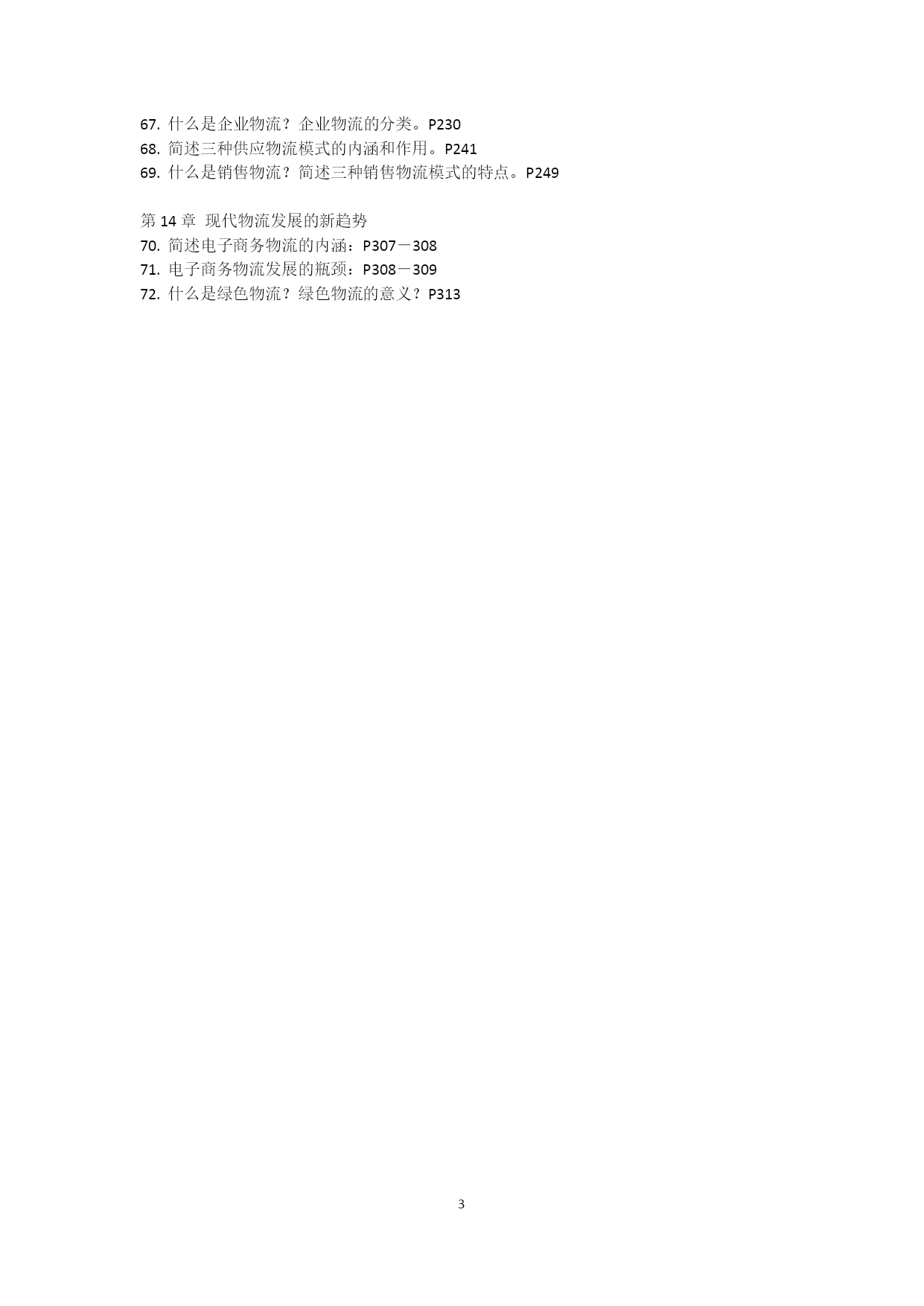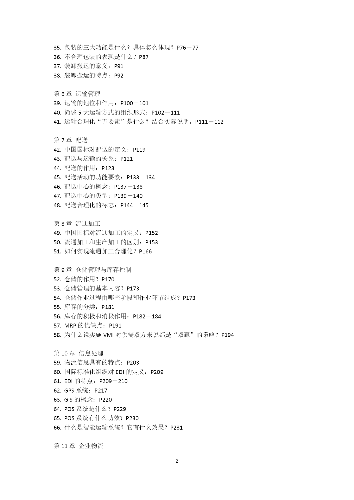 PAGE\*MERGEFORMAT3第1章物流学基础理论中国国标对物流的定义:P2美国物流管理协会对物流的定义:P2物流的总体功能:P3物流的具体功能:P3物流的微观价值:P4-5物流在国民经济中的作用:P6-8物流学主要观点(“黑大陆”学说、“物流冰山”学说、“第三利润源”学说、“效益背反”学说)P9-11第2章物流与供应链管理中国国标对供应链的定义:P17教材对供应链的定义:P17中国国标对供应链管理的定义:P21美国供应链协会对供应链管理的定义:P21供应链管理的最根本目的是什么,首要目标是什么?P21供应链管理主要涉及的四个主要领域是什么?P21全球供应链论坛提出了哪8项供应链管理的关键业务流程?P21供应链中的5链是哪些?简述其各自作用。P23什么是基于电子商务的供应链管理?P24第3章物流系统什么是物流系统?现代物流系统的定义?P32物流系统的特点是什么?P32-33物流系统的一般要素是哪3个?P33物流系统的功能要素有哪7个?P33物流系统的物质基础要素是那些?P34物流系统的总目标和具体目标是什么?P35-36物流系统增值服务的含义?P39增值性物流服务的内容:P39-40物流合理化的主要方法:P44精益物流的概念和特点:P45准时物流的概念、关键问题和风险:P46-48物流结点的作用和功能:P50-51物流结点的种类:P51三个层次物流结点的概念界定、层次关系和配置:P53第4章采购管理采购的三个基本目标:P60采购流程:P62进行供应商选择和管理时需要考虑的因素有哪些?P63第5章包装与装卸搬运中国国标对包装的定义:P75包装的三大功能是什么?具体怎么体现?P76-77不合理包装的表现是什么?P87装卸搬运的意义:P91装卸搬运的特点:P92第6章运输管理运输的地位和作用:P100-101简述5大运输方式的组织形式:P102-111运输合理化“五要素”是什么?结合实际说明。P111-112第7章配送中国国标对配送的定义:P119配送与运输的关系:P121配送的作用:P123配送活动的功能要素:P133-134配送中心的概念:P137-138配送中心的类型:P139-140配送合理化的标志:P144-145第8章流通加工中国国标对流通加工的定义:P152流通加工和生产加工的区别:P153如何实现流通加工合理化?P166第9章仓储管理与库存控制仓储的作用?P170仓储管理的基本内容?P173仓储作业过程由哪些阶段和作业环节组成?P173库存的分类:P181库存的积极和消极作用:P182-184MRP的优缺点:P191为什么说实施VMI对供需双方来说都是“双赢”的策略?P194第10章信息处理物流信息具有的特点:P203国际标准化组织对EDI的定义:P209EDI的特点:P209-210GPS系统:P217GIS的概念:P220POS系统是什么?P229POS系统有什么功效?P230什么是智能运输系统?它有什么效果?P231第11章企业物流什么是企业物流?企业物流的分类。P230简述三种供应物流模式的内涵和作用。P241什么是销售物流?简述三种销售物流模式的特点。P249第14章现代物流发展的新趋势简述电子商务物流的内涵:P307-308电子商务物流发展的瓶颈:P308-309什么是绿色物流?绿色物流的意义?P313