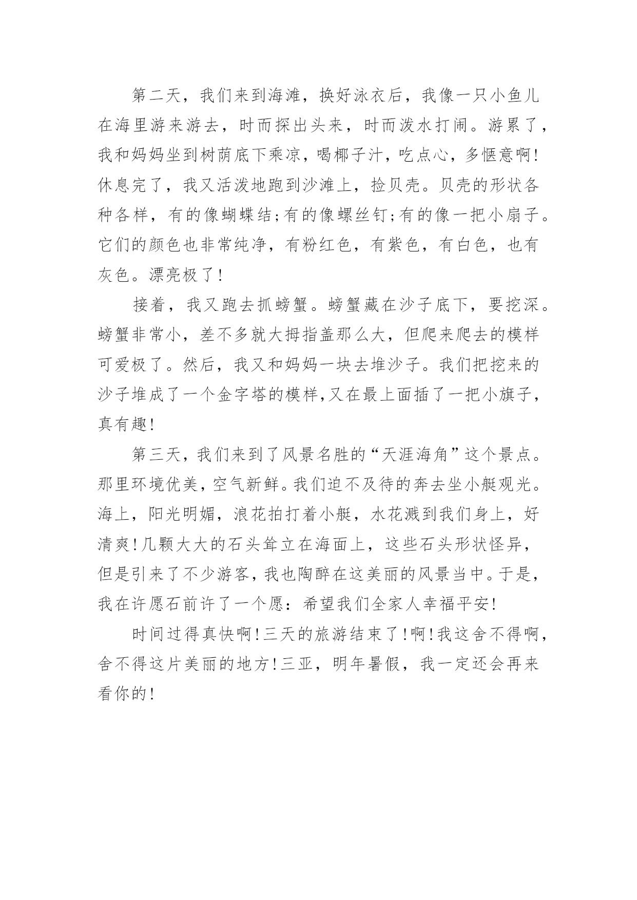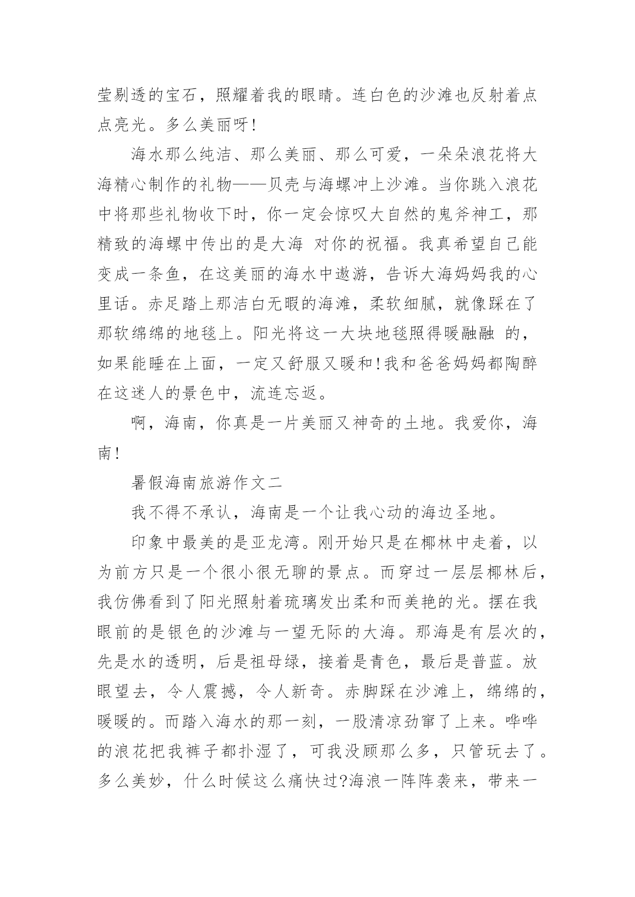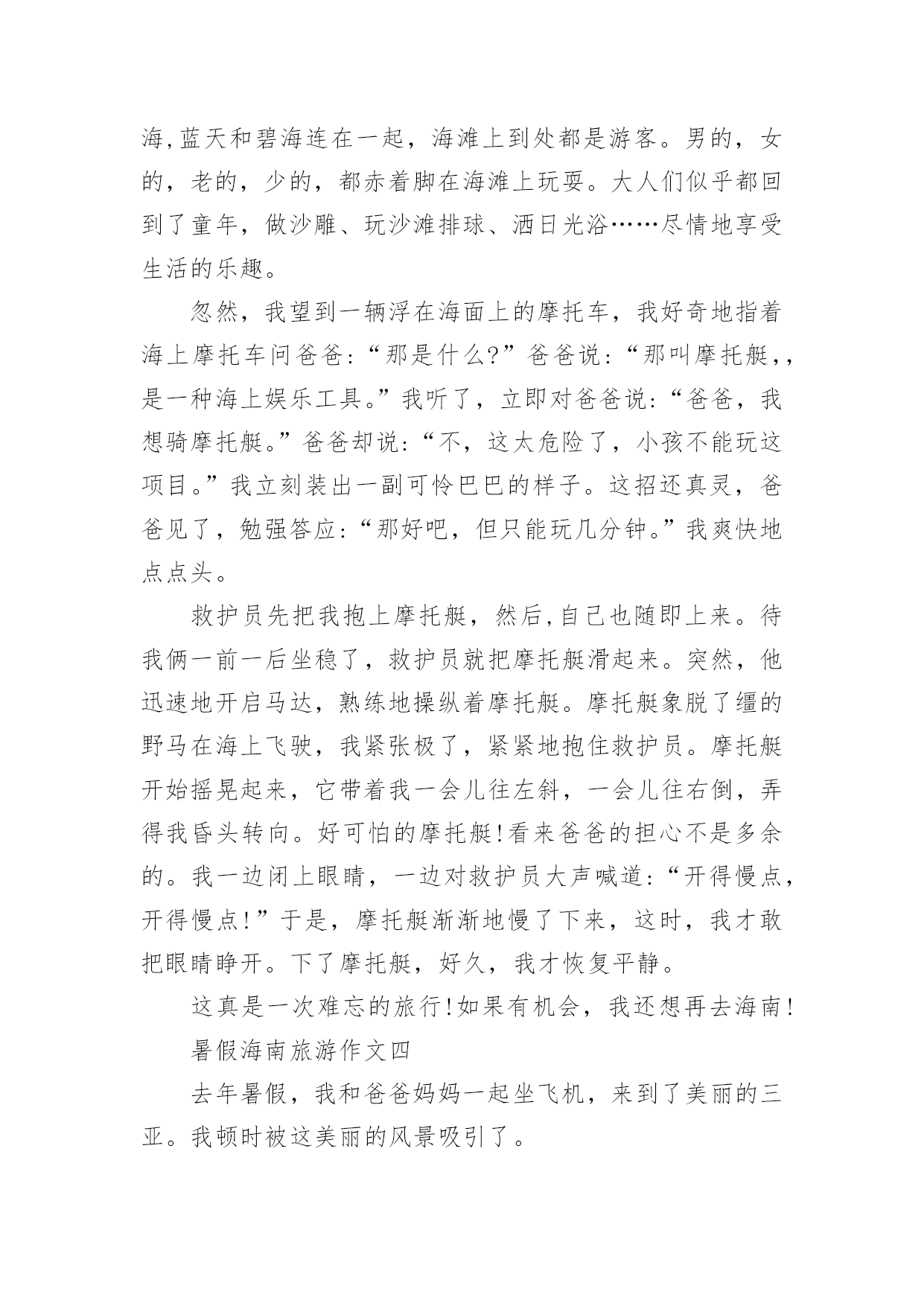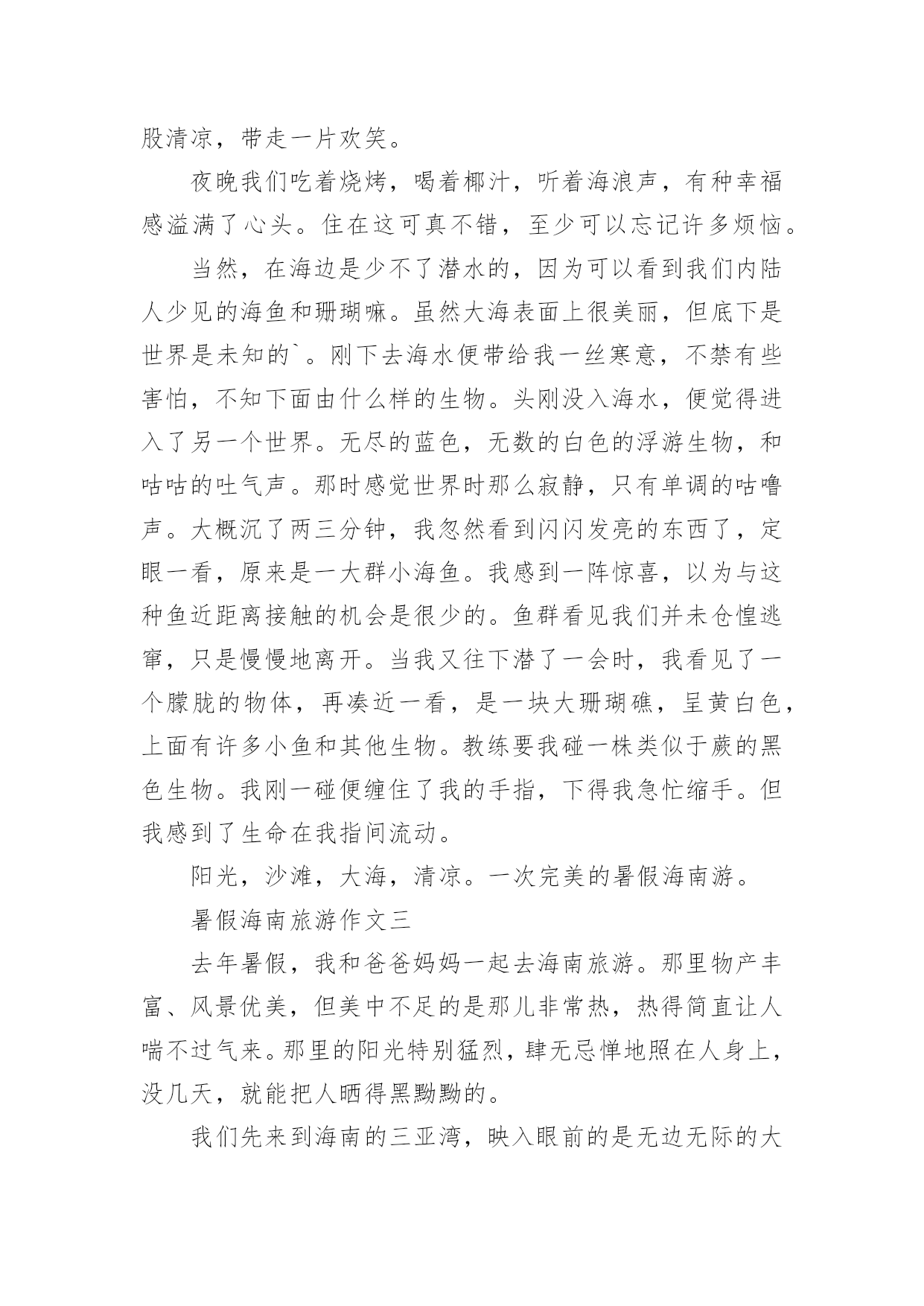 暑假海南旅游的作文暑假海南旅游的作文暑假海南旅游作文一海南是一个令人向往的地方。那里风光旖旎迷人。我们一家三口曾在两年前的暑假去海南旅游。至今我还常常回味起那段难忘的浪漫之旅。在海南我们游览了许多美丽的景点。像蝶舞花香的蝴蝶谷,曲径通幽的大小洞天,号称天下第一湾的亚龙湾,物种丰富的兴隆热带植物园……都给我留下了深刻的印象。但最令我难忘的是神奇的博鳌岛和迷人的蜈支洲岛。博鳌岛因为“博鳌亚洲论坛会址”闻名世界。由于海南的特殊地形,博鳌被称为岛中岛。为什么叫博鳌呢?原来,这座岛中岛形状奇特,很像一种传说中的神兽——鳌。博鳌风光秀丽,最神奇的是玉带滩。这座又细又长的沙滩半岛犹如一条玉带,将烟波浩渺的大海与平静如镜的河水分割开来。它最宽处有三百多米,而最窄处只有十多米。一边是波涛汹涌的南海,而另一边则是静静流淌的万泉河。千百年来,任凭海水冲刷、河水浸泡,玉带滩还是稳稳当当地卧在海、河之间,从未被淹没过。这难道不是奇迹吗?在海南我们去过好几处的海。蜈支洲岛的海水是最美丽最迷人的。站在海边,由近到远欣赏辽阔无边的大海,海水从清澈见底、浅蓝、蔚蓝、深蓝直至天边,过度得那么柔和、自然。当耀眼的阳光照在海面上,美丽的大海就像一块晶莹剔透的宝石,照耀着我的眼睛。连白色的沙滩也反射着点点亮光。多么美丽呀!海水那么纯洁、那么美丽、那么可爱,一朵朵浪花将大海精心制作的礼物——贝壳与海螺冲上沙滩。当你跳入浪花中将那些礼物收下时,你一定会惊叹大自然的鬼斧神工,那精致的海螺中传出的是大海对你的祝福。我真希望自己能变成一条鱼,在这美丽的海水中遨游,告诉大海妈妈我的心里话。赤足踏上那洁白无暇的海滩,柔软细腻,就像踩在了那软绵绵的地毯上。阳光将这一大块地毯照得暖融融的,如果能睡在上面,一定又舒服又暖和!我和爸爸妈妈都陶醉在这迷人的景色中,流连忘返。啊,海南,你真是一片美丽又神奇的土地。我爱你,海南!暑假海南旅游作文二我不得不承认,海南是一个让我心动的海边圣地。印象中最美的是亚龙湾。刚开始只是在椰林中走着,以为前方只是一个很小很无聊的景点。而穿过一层层椰林后,我仿佛看到了阳光照射着琉璃发出柔和而美艳的光。摆在我眼前的是银色的沙滩与一望无际的大海。那海是有层次的,先是水的透明,后是祖母绿,接着是青色,最后是普蓝。放眼望去,令人震撼,令人新奇。赤脚踩在沙滩上,绵绵的,暖暖的。而踏入海水的那一刻,一股清凉劲窜了上来。哗哗的浪花把我裤子都扑湿了,可我没顾那么多,只管玩去了。多么美妙,什么时候这么痛快过?海浪一阵阵袭来,带来一股清凉,带走一片欢笑。夜晚我们吃着烧烤,喝着椰汁,听着海浪声,有种幸福感溢满了心头。住在这可真不错,至少可以忘记许多烦恼。当然,在海边是少不了潜水的,因为可以看到我们内陆人少见的海鱼和珊瑚嘛。虽然大海表面上很美丽,但底下是世界是未知的`。刚下去海水便带给我一丝寒意,不禁有些害怕,不知下面由什么样的生物。头刚没入海水,便觉得进入了另一个世界。无尽的蓝色,无数的白色的浮游生物,和咕咕的吐气声。那时感觉世界时那么寂静,只有单调的咕噜声。大概沉了两三分钟,我忽然看到闪闪发亮的东西了,定眼一看,原来是一大群小海鱼。我感到一阵惊喜,以为与这种鱼近距离接触的机会是很少的。鱼群看见我们并未仓惶逃窜,只是慢慢地离开。当我又往下潜了一会时,我看见了一个朦胧的物体,再凑近一看,是一块大珊瑚礁,呈黄白色,上面有许多小鱼和其他生物。教练要我碰一株类似于蕨的黑色生物。我刚一碰便缠住了我的手指,下得我急忙缩手。但我感到了生命在我指间流动。阳光,沙滩,大海,清凉。一次完美的暑假海南游。暑假海南旅游作文三去年暑假,我和爸爸妈妈一起去海南旅游。那里物产丰富、风景优美,但美中不足的是那儿非常热,热得简直让人喘不过气来。那里的阳光特别猛烈,肆无忌惮地照在人身上,没几天,就能把人晒得黑黝黝的。我们先来到海南的三亚湾,映入眼前的是无边无际的大海,蓝天和碧海连在一起,海滩上到处都是游客。男的,女的,老的,少的,都赤着脚在海滩上玩耍。大人们似乎都回到了童年,做沙雕、玩沙滩排球、洒日光浴……尽情地享受生活的乐趣。忽然,我望到一辆浮在海面上的摩托车,我好奇地指着海上摩托车问爸爸:“那是什么?”爸爸说:“那叫摩托艇,,是一种海上娱乐工具。”我听了,立即对爸爸说:“爸爸,我想骑摩托艇。”爸爸却说:“不,这太危险了,小孩不能玩这项目。”我立刻装出一副可怜巴巴的样子。这招还真灵,爸爸见了,勉强答应:“那好吧,但只能玩几分钟。”我爽快地点点头。救护员先把我抱上摩托艇,然后,自己也随即上来。待我俩一前一后坐稳了,救护员就把摩托艇滑起来。突然,他迅速地开启马达,熟练地操纵着摩托艇。摩托艇象脱了缰的野马在海上飞驶,我紧张极了,紧紧地抱住救护员。摩托艇开始摇晃起来,它带着我一会儿往左斜,一会儿往右倒,弄得我昏头转向。好可