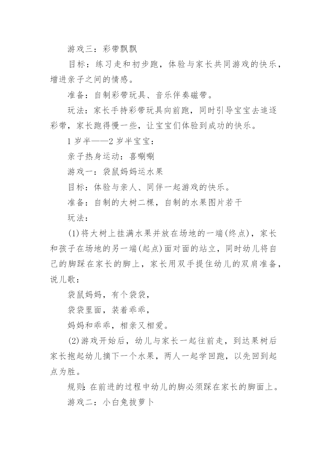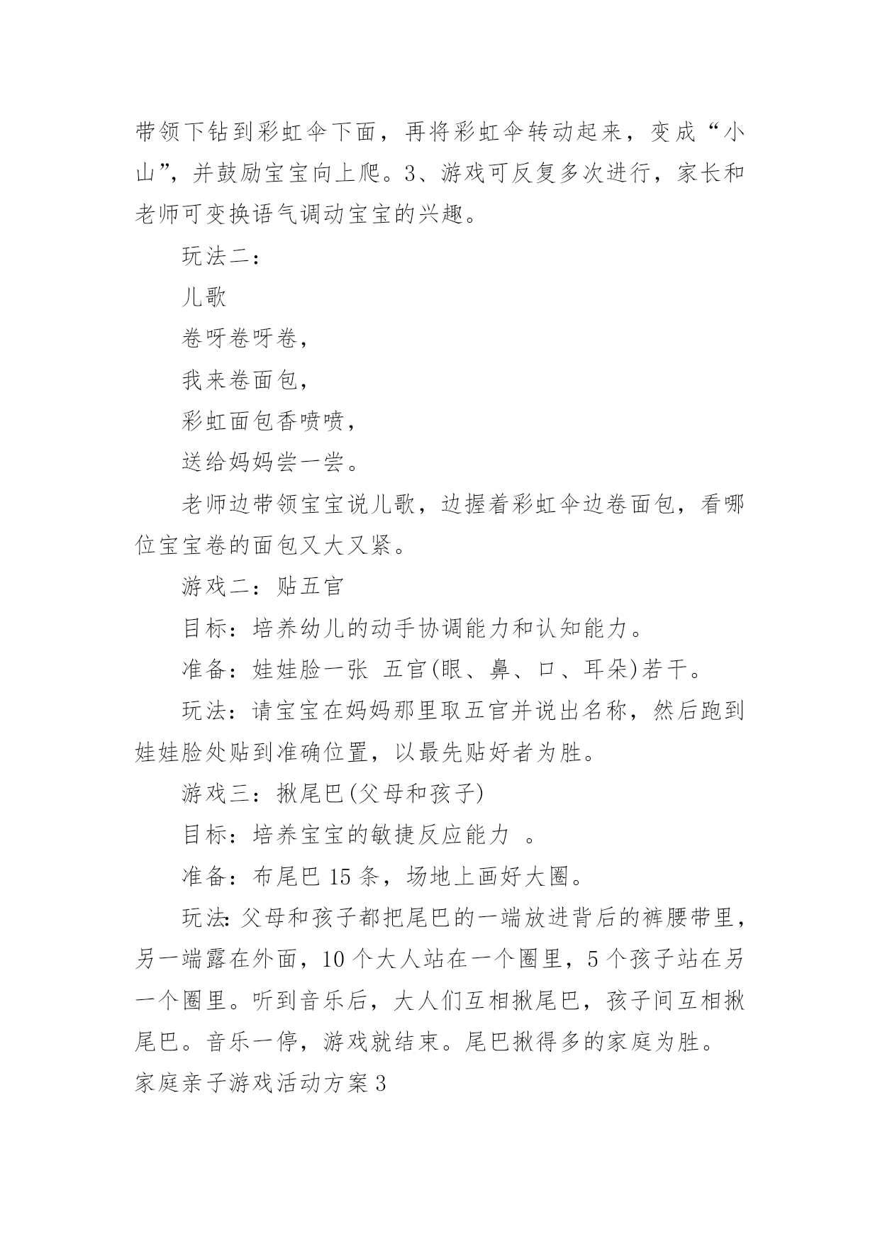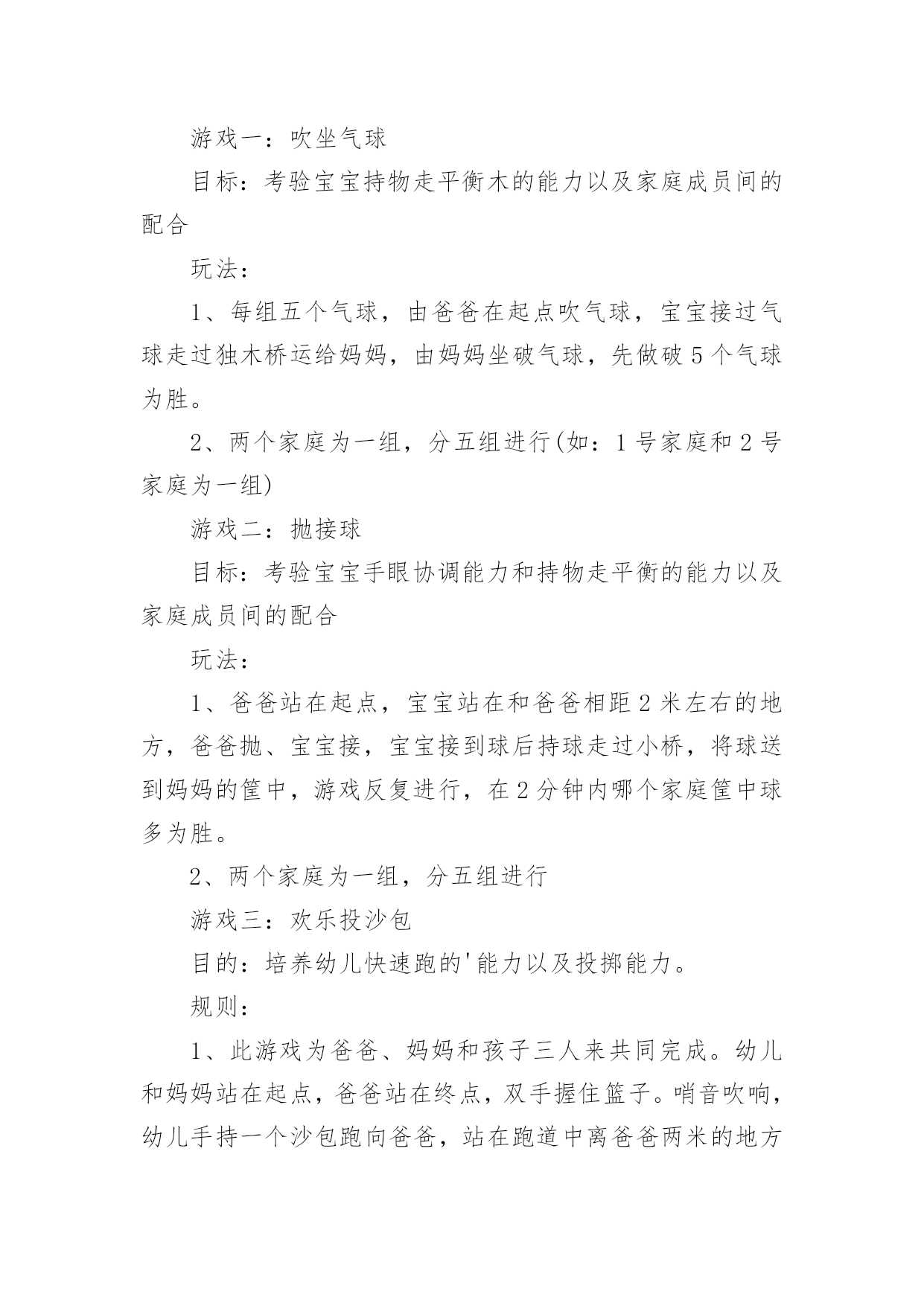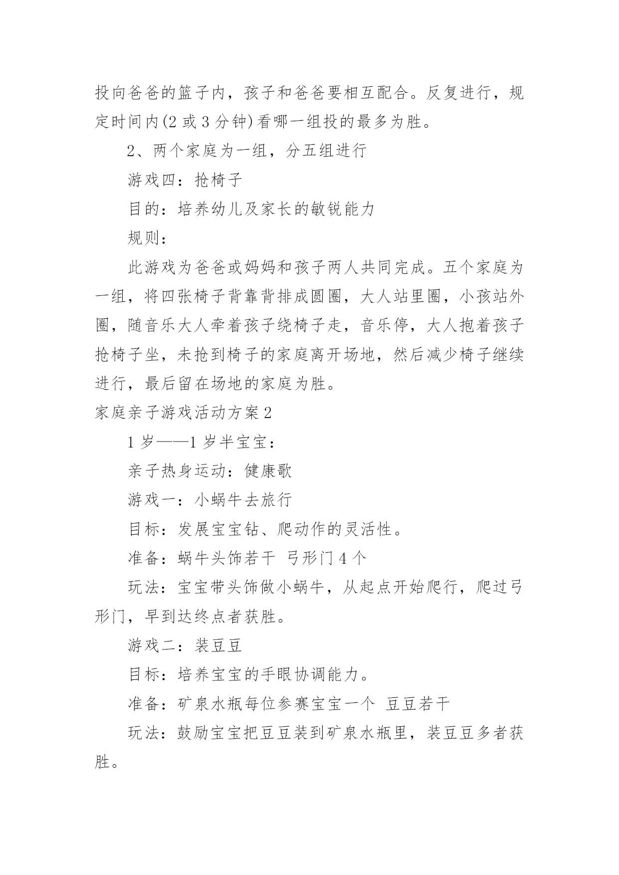 家庭亲子游戏活动方案家庭亲子游戏活动方案为了确保事情或工作有效开展,时常需要预先制定方案,方案是从目的、要求、方式、方法、进度等都部署具体、周密,并有很强可操作性的计划。写方案需要注意哪些格式呢?下面是小编为大家收集的家庭亲子游戏活动方案,希望能够帮助到大家。家庭亲子游戏活动方案1【活动目标】我们精心为宝贝们策划了“宝贝一家亲”亲子活动。将邀请每一位爸爸妈妈与孩子共同来参加本次活动,让家长和孩子在共同完成亲子游戏的过程中,体验游戏的乐趣,增进亲子间的情感,促进宝宝健康快乐成长。【活动流程】流程一:1:10-1:30幼儿和家长入场(播放背景音乐)流程二:1:30活动正式开始1、主持人开场白2、领导致辞3、分组活动(1-10号家庭留在大活动室进行亲子游戏,11-20号家庭进对面活动室进行自主性区域游戏)【游戏方案】游戏一:吹坐气球目标:考验宝宝持物走平衡木的能力以及家庭成员间的配合玩法:1、每组五个气球,由爸爸在起点吹气球,宝宝接过气球走过独木桥运给妈妈,由妈妈坐破气球,先做破5个气球为胜。2、两个家庭为一组,分五组进行(如:1号家庭和2号家庭为一组)游戏二:抛接球目标:考验宝宝手眼协调能力和持物走平衡的能力以及家庭成员间的配合玩法:1、爸爸站在起点,宝宝站在和爸爸相距2米左右的地方,爸爸抛、宝宝接,宝宝接到球后持球走过小桥,将球送到妈妈的筐中,游戏反复进行,在2分钟内哪个家庭筐中球多为胜。2、两个家庭为一组,分五组进行游戏三:欢乐投沙包目的:培养幼儿快速跑的'能力以及投掷能力。规则:1、此游戏为爸爸、妈妈和孩子三人来共同完成。幼儿和妈妈站在起点,爸爸站在终点,双手握住篮子。哨音吹响,幼儿手持一个沙包跑向爸爸,站在跑道中离爸爸两米的地方投向爸爸的篮子内,孩子和爸爸要相互配合。反复进行,规定时间内(2或3分钟)看哪一组投的最多为胜。2、两个家庭为一组,分五组进行游戏四:抢椅子目的:培养幼儿及家长的敏锐能力规则:此游戏为爸爸或妈妈和孩子两人共同完成。五个家庭为一组,将四张椅子背靠背排成圆圈,大人站里圈,小孩站外圈,随音乐大人牵着孩子绕椅子走,音乐停,大人抱着孩子抢椅子坐,未抢到椅子的家庭离开场地,然后减少椅子继续进行,最后留在场地的家庭为胜。家庭亲子游戏活动方案21岁——1岁半宝宝:亲子热身运动:健康歌游戏一:小蜗牛去旅行目标:发展宝宝钻、爬动作的灵活性。准备:蜗牛头饰若干弓形门4个玩法:宝宝带头饰做小蜗牛,从起点开始爬行,爬过弓形门,早到达终点者获胜。游戏二:装豆豆目标:培养宝宝的手眼协调能力。准备:矿泉水瓶每位参赛宝宝一个豆豆若干玩法:鼓励宝宝把豆豆装到矿泉水瓶里,装豆豆多者获胜。游戏三:彩带飘飘目标:练习走和初步跑,体验与家长共同游戏的快乐,增进亲子之间的情感。准备:自制彩带玩具、音乐伴奏磁带。玩法:家长手持彩带玩具向前跑,同时引导宝宝去追逐彩带,家长跑得慢一些,让宝宝们体验到成功的快乐。1岁半——2岁半宝宝:亲子热身运动:喜唰唰游戏一:袋鼠妈妈运水果目标:体验与亲人、同伴一起游戏的快乐。准备:自制的大树二棵,自制的水果图片若干玩法:(1)将大树上挂满水果并放在场地的一端(终点),家长和孩子在场地的另一端(起点)面对面的站立,同时幼儿将自己的脚踩在家长的脚上,家长用双手提住幼儿的双肩准备,说儿歌:袋鼠妈妈,有个袋袋,袋袋里面,装着乖乖,妈妈和乖乖,相亲又相爱。(2)游戏开始后,幼儿与家长一起往前走,到达果树后家长抱起幼儿摘下一个水果,两人一起学回跑,以先回到起点为胜。规则:在前进的过程中幼儿的脚必须踩在家长的脚面上。游戏二:小白兔拔萝卜目标:培养宝宝跑、跳的能力和竞争意识。准备:小白兔头饰若干自制萝卜若干玩法:宝宝扮演小白兔,从起点学白兔往前跳,到达萝卜筐处拔萝卜回到起点,在规定时间内,以拔萝卜最多者获胜。游戏三:串珠子比赛目标:培养宝宝的手眼协调能力。准备:带孔的玩具若干绳子每位宝宝一条。玩法:请宝宝把带孔的玩具穿在绳子上,在规定时间内以穿的数量多的宝宝为胜。2岁半——3岁半宝宝:亲子热身运动:快乐天使游戏一:美丽的彩虹伞目标:1、发展宝宝钻、爬动作的灵活性。2、引导宝宝体验亲子游戏的.快乐。准备:彩虹伞一把。玩法一:儿歌彩虹伞,转转转,躲在伞下看不见,彩虹伞,转转转,爬到上面看得见。1、老师先带领宝宝说儿歌。2、老师和家长撑起伞,一边说儿歌一边做游戏。先将彩虹伞转动起来,宝宝在家长的带领下钻到彩虹伞下面,再将彩虹伞转动起来,变成“小山”,并鼓励宝宝向上爬。3、游戏可反复多次进行,家长和老师可变换语气调动宝宝的兴趣。玩法二:儿歌卷呀卷呀卷,我来卷面包,彩虹面包香喷喷,送给妈妈尝一尝。老师边带领宝宝说儿歌,边握着彩虹伞边卷面包,看哪位宝宝卷的面包又大又紧。游戏二:贴五官目标:培养幼儿的动手协调能力和认知能力。准备:娃娃脸一张