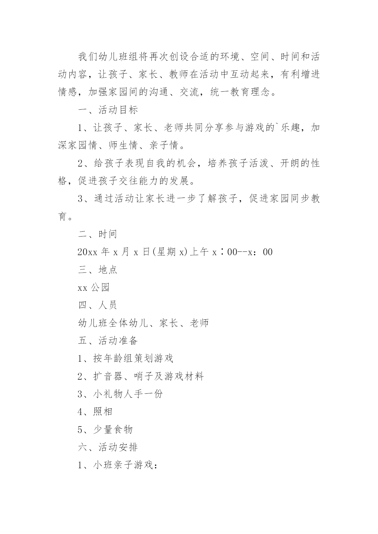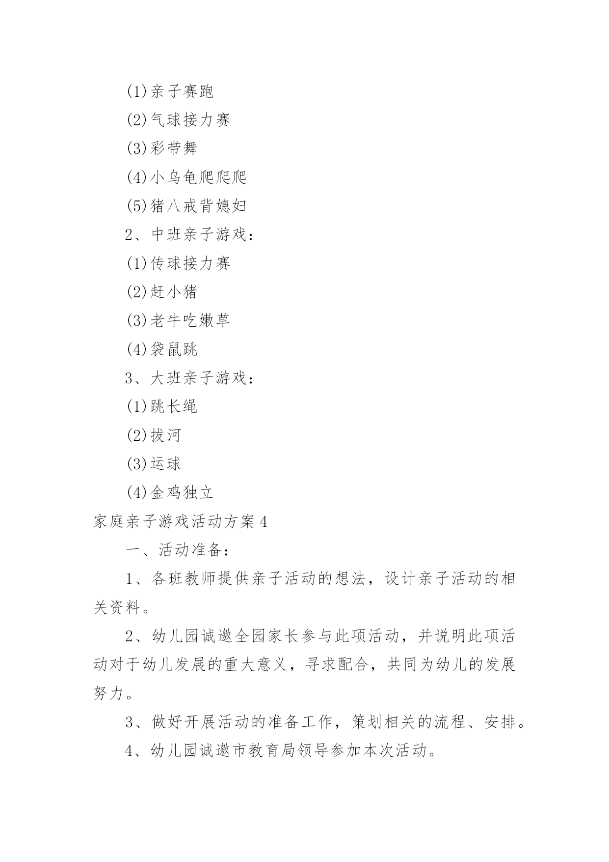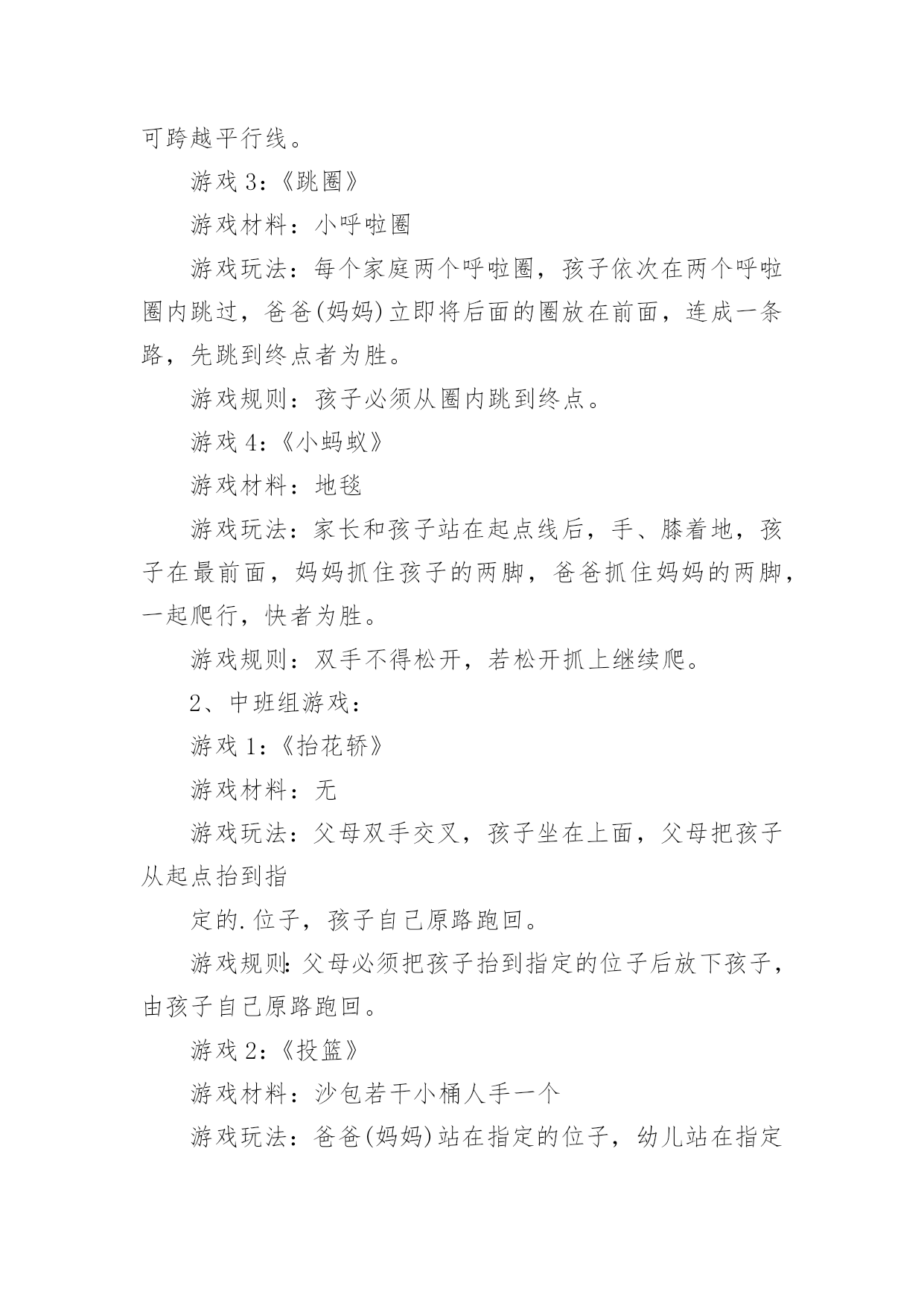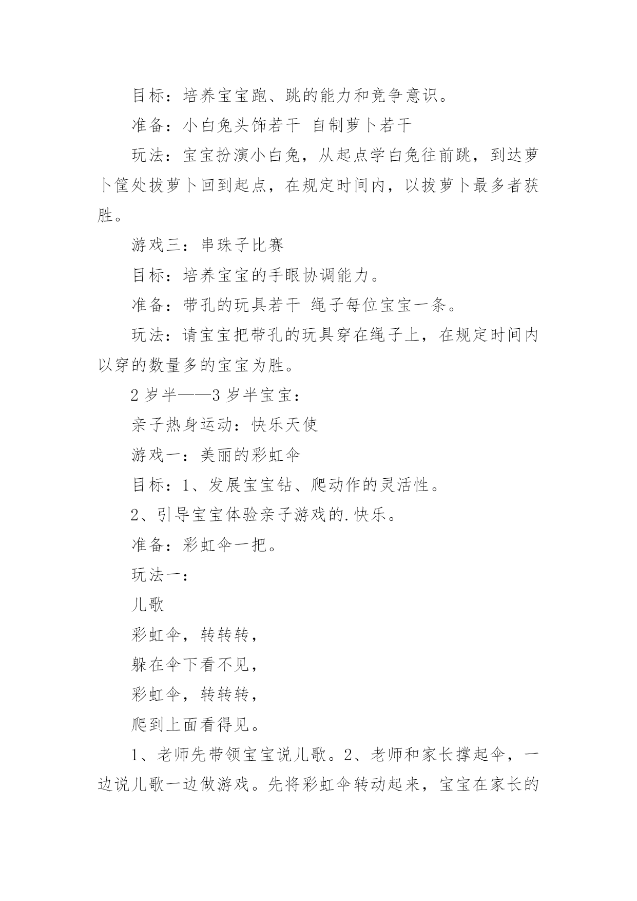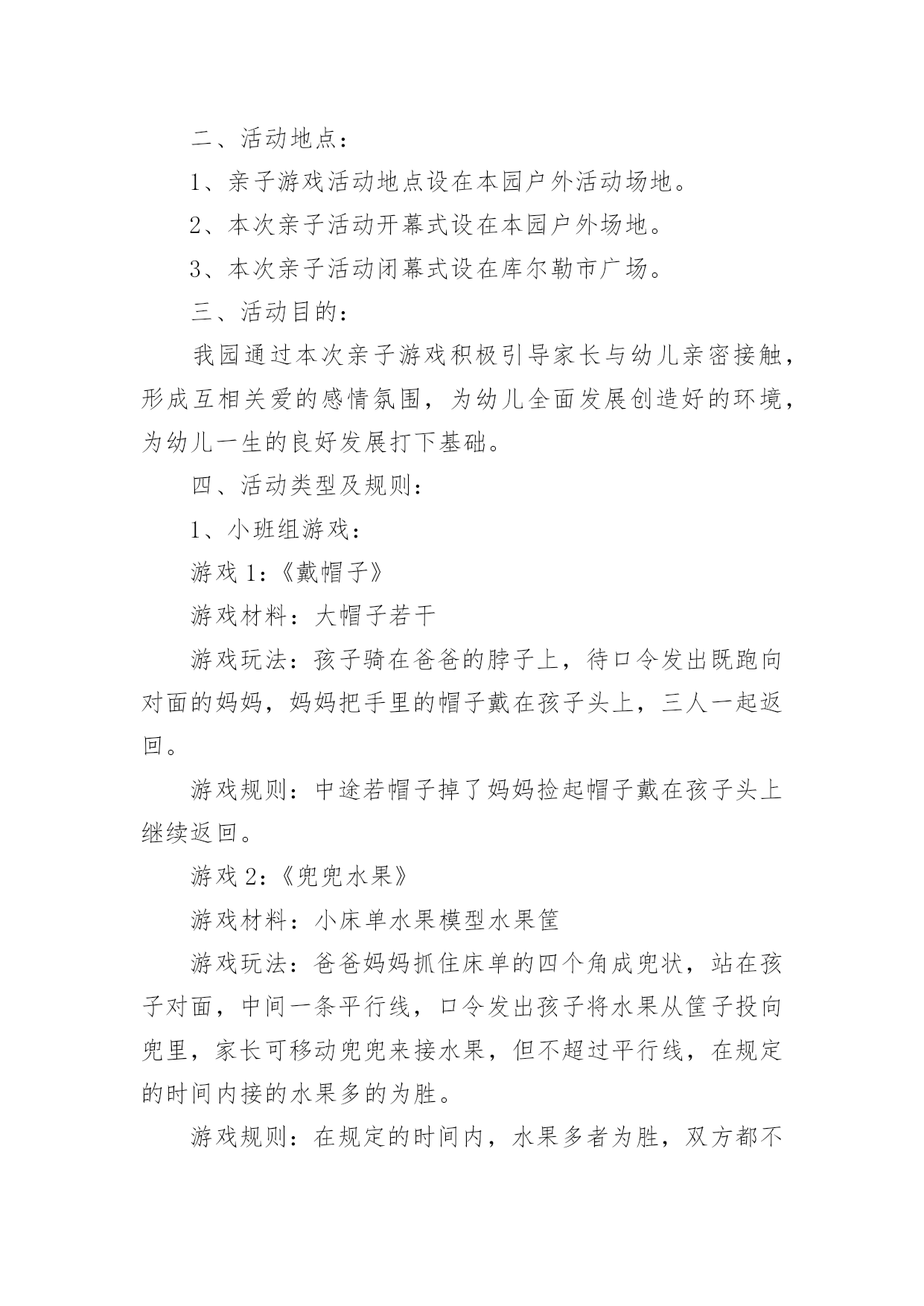家庭亲子游戏活动方案家庭亲子游戏活动方案为了确保事情或工作有效开展,时常需要预先制定方案,方案是从目的、要求、方式、方法、进度等都部署具体、周密,并有很强可操作性的计划。写方案需要注意哪些格式呢?下面是小编为大家收集的家庭亲子游戏活动方案,希望能够帮助到大家。家庭亲子游戏活动方案1【活动目标】我们精心为宝贝们策划了“宝贝一家亲”亲子活动。将邀请每一位爸爸妈妈与孩子共同来参加本次活动,让家长和孩子在共同完成亲子游戏的过程中,体验游戏的乐趣,增进亲子间的情感,促进宝宝健康快乐成长。【活动流程】流程一:1:10-1:30幼儿和家长入场(播放背景音乐)流程二:1:30活动正式开始1、主持人开场白2、领导致辞3、分组活动(1-10号家庭留在大活动室进行亲子游戏,11-20号家庭进对面活动室进行自主性区域游戏)【游戏方案】游戏一:吹坐气球目标:考验宝宝持物走平衡木的能力以及家庭成员间的配合玩法:1、每组五个气球,由爸爸在起点吹气球,宝宝接过气球走过独木桥运给妈妈,由妈妈坐破气球,先做破5个气球为胜。2、两个家庭为一组,分五组进行(如:1号家庭和2号家庭为一组)游戏二:抛接球目标:考验宝宝手眼协调能力和持物走平衡的能力以及家庭成员间的配合玩法:1、爸爸站在起点,宝宝站在和爸爸相距2米左右的地方,爸爸抛、宝宝接,宝宝接到球后持球走过小桥,将球送到妈妈的筐中,游戏反复进行,在2分钟内哪个家庭筐中球多为胜。2、两个家庭为一组,分五组进行游戏三:欢乐投沙包目的:培养幼儿快速跑的'能力以及投掷能力。规则:1、此游戏为爸爸、妈妈和孩子三人来共同完成。幼儿和妈妈站在起点,爸爸站在终点,双手握住篮子。哨音吹响,幼儿手持一个沙包跑向爸爸,站在跑道中离爸爸两米的地方投向爸爸的篮子内,孩子和爸爸要相互配合。反复进行,规定时间内(2或3分钟)看哪一组投的最多为胜。2、两个家庭为一组,分五组进行游戏四:抢椅子目的:培养幼儿及家长的敏锐能力规则:此游戏为爸爸或妈妈和孩子两人共同完成。五个家庭为一组,将四张椅子背靠背排成圆圈,大人站里圈,小孩站外圈,随音乐大人牵着孩子绕椅子走,音乐停,大人抱着孩子抢椅子坐,未抢到椅子的家庭离开场地,然后减少椅子继续进行,最后留在场地的家庭为胜。家庭亲子游戏活动方案21岁——1岁半宝宝:亲子热身运动:健康歌游戏一:小蜗牛去旅行目标:发展宝宝钻、爬动作的灵活性。准备:蜗牛头饰若干弓形门4个玩法:宝宝带头饰做小蜗牛,从起点开始爬行,爬过弓形门,早到达终点者获胜。游戏二:装豆豆目标:培养宝宝的手眼协调能力。准备:矿泉水瓶每位参赛宝宝一个豆豆若干玩法:鼓励宝宝把豆豆装到矿泉水瓶里,装豆豆多者获胜。游戏三:彩带飘飘目标:练习走和初步跑,体验与家长共同游戏的快乐,增进亲子之间的情感。准备:自制彩带玩具、音乐伴奏磁带。玩法:家长手持彩带玩具向前跑,同时引导宝宝去追逐彩带,家长跑得慢一些,让宝宝们体验到成功的快乐。1岁半——2岁半宝宝:亲子热身运动:喜唰唰游戏一:袋鼠妈妈运水果目标:体验与亲人、同伴一起游戏的快乐。准备:自制的大树二棵,自制的水果图片若干玩法:(1)将大树上挂满水果并放在场地的一端(终点),家长和孩子在场地的另一端(起点)面对面的站立,同时幼儿将自己的脚踩在家长的脚上,家长用双手提住幼儿的双肩准备,说儿歌:袋鼠妈妈,有个袋袋,袋袋里面,装着乖乖,妈妈和乖乖,相亲又相爱。(2)游戏开始后,幼儿与家长一起往前走,到达果树后家长抱起幼儿摘下一个水果,两人一起学回跑,以先回到起点为胜。规则:在前进的过程中幼儿的脚必须踩在家长的脚面上。游戏二:小白兔拔萝卜目标:培养宝宝跑、跳的能力和竞争意识。准备:小白兔头饰若干自制萝卜若干玩法:宝宝扮演小白兔,从起点学白兔往前跳,到达萝卜筐处拔萝卜回到起点,在规定时间内,以拔萝卜最多者获胜。游戏三:串珠子比赛目标:培养宝宝的手眼协调能力。准备:带孔的玩具若干绳子每位宝宝一条。玩法:请宝宝把带孔的玩具穿在绳子上,在规定时间内以穿的数量多的宝宝为胜。2岁半——3岁半宝宝:亲子热身运动:快乐天使游戏一:美丽的彩虹伞目标:1、发展宝宝钻、爬动作的灵活性。2、引导宝宝体验亲子游戏的.快乐。准备:彩虹伞一把。玩法一:儿歌彩虹伞,转转转,躲在伞下看不见,彩虹伞,转转转,爬到上面看得见。1、老师先带领宝宝说儿歌。2、老师和家长撑起伞,一边说儿歌一边做游戏。先将彩虹伞转动起来,宝宝在家长的带领下钻到彩虹伞下面,再将彩虹伞转动起来,变成“小山”,并鼓励宝宝向上爬。3、游戏可反复多次进行,家长和老师可变换语气调动宝宝的兴趣。玩法二:儿歌卷呀卷呀卷,我来卷面包,彩虹面包香喷喷,送给妈妈尝一尝。老师边带领宝宝说儿歌,边握着彩虹伞边卷面包,看哪位宝宝卷的面包又大又紧。游戏二:贴五官目标:培养幼儿的动手协调能力和认知能力。准备:娃娃脸一张