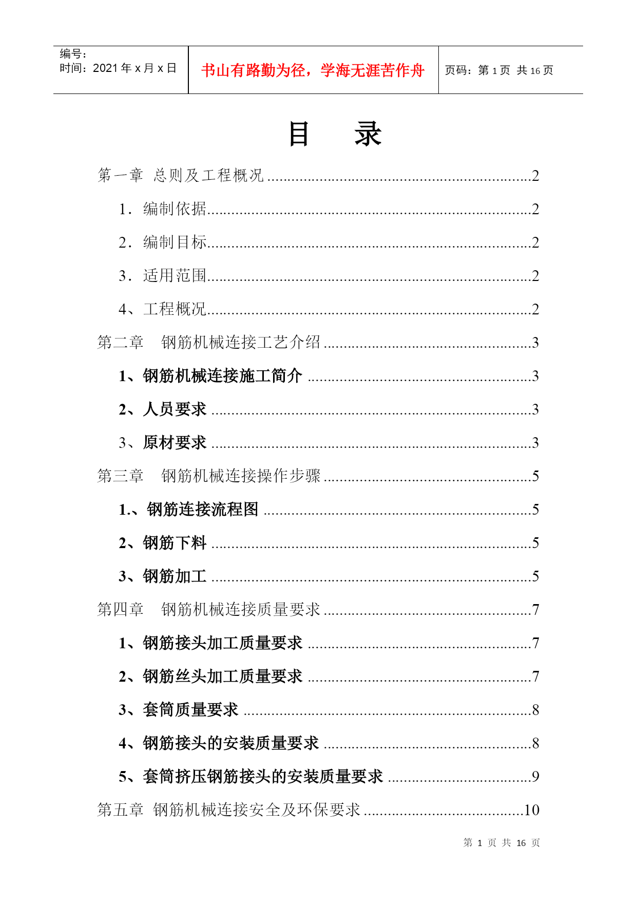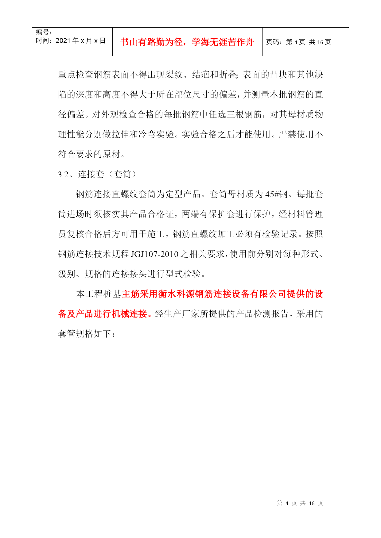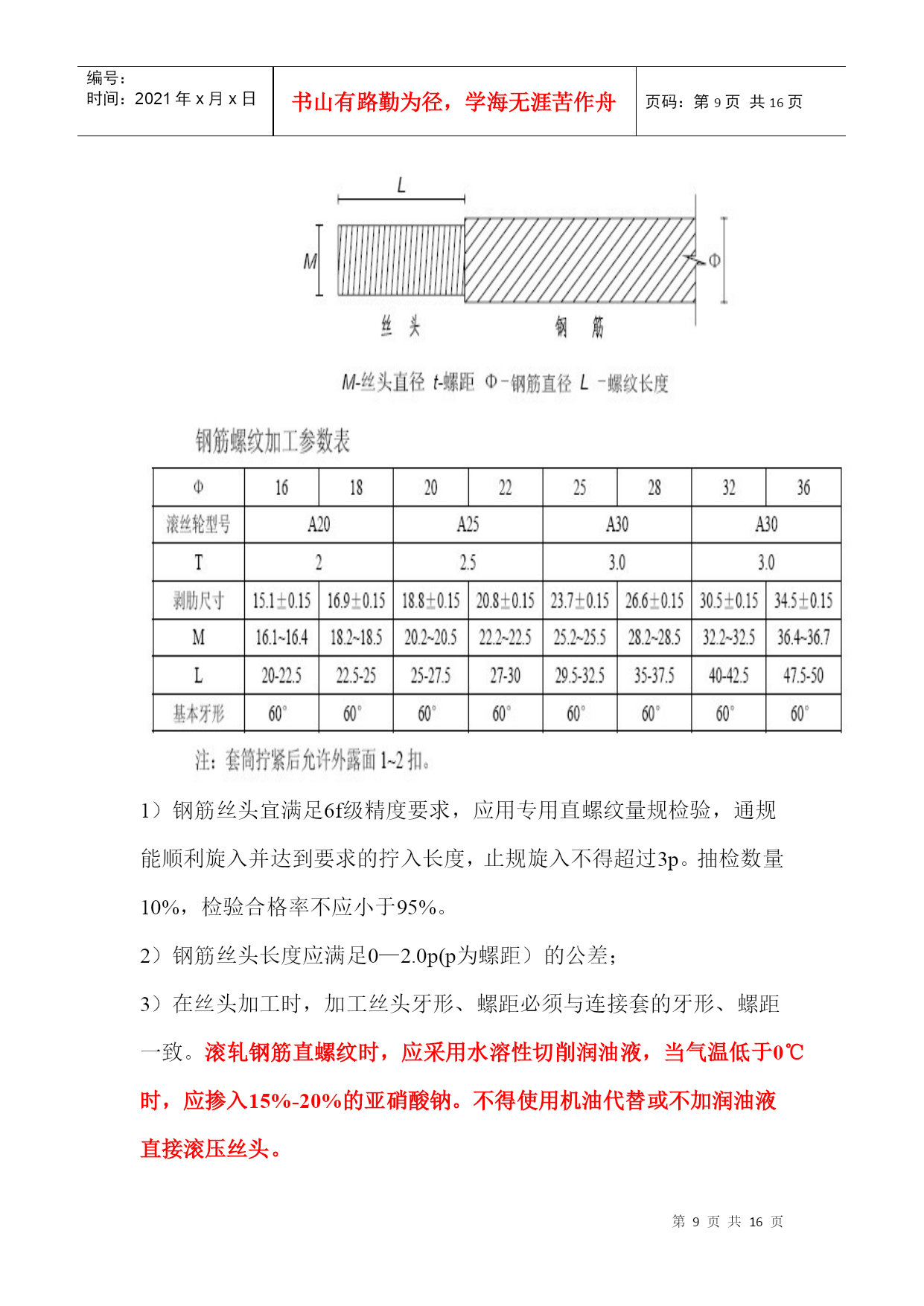 PAGE溪洛渡-浙西±800kV特高压直流输电工程赣江大跨越工程钢筋机械连接施工方案PAGE第PAGE3页编号:时间:2021年x月x日书山有路勤为径,学海无涯苦作舟页码:第PAGE15页共NUMPAGES16页第PAGE\*MERGEFORMAT15页共NUMPAGES\*MERGEFORMAT16页目录TOC\o"1-3"\h\z\uHYPERLINK\l"_Toc320218592"第一章总则及工程概况PAGEREF_Toc320218592\h2HYPERLINK\l"_Toc320218593"1.编制依据PAGEREF_Toc320218593\h2HYPERLINK\l"_Toc320218594"2.编制目标PAGEREF_Toc320218594\h2HYPERLINK\l"_Toc320218595"3.适用范围PAGEREF_Toc320218595\h2HYPERLINK\l"_Toc320218596"4、工程概况PAGEREF_Toc320218596\h2HYPERLINK\l"_Toc320218597"第二章钢筋机械连接工艺介绍PAGEREF_Toc320218597\h3HYPERLINK\l"_Toc320218598"1、钢筋机械连接施工简介PAGEREF_Toc320218598\h3HYPERLINK\l"_Toc320218599"2、人员要求PAGEREF_Toc320218599\h3HYPERLINK\l"_Toc320218600"3、原材要求PAGEREF_Toc320218600\h3HYPERLINK\l"_Toc320218601"第三章钢筋机械连接操作步骤PAGEREF_Toc320218601\h5HYPERLINK\l"_Toc320218602"1.、钢筋连接流程图PAGEREF_Toc320218602\h5HYPERLINK\l"_Toc320218603"2、钢筋下料PAGEREF_Toc320218603\h5HYPERLINK\l"_Toc320218604"3、钢筋加工PAGEREF_Toc320218604\h5HYPERLINK\l"_Toc320218605"第四章钢筋机械连接质量要求PAGEREF_Toc320218605\h7HYPERLINK\l"_Toc320218606"1、钢筋接头加工质量要求PAGEREF_Toc320218606\h7HYPERLINK\l"_Toc320218607"2、钢筋丝头加工质量要求PAGEREF_Toc320218607\h7HYPERLINK\l"_Toc320218608"3、套筒质量要求PAGEREF_Toc320218608\h8HYPERLINK\l"_Toc320218609"4、钢筋接头的安装质量要求PAGEREF_Toc320218609\h8HYPERLINK\l"_Toc320218610"5、套筒挤压钢筋接头的安装质量要求PAGEREF_Toc320218610\h9HYPERLINK\l"_Toc320218611"第五章钢筋机械连接安全及环保要求PAGEREF_Toc320218611\h10HYPERLINK\l"_Toc320218612"第六章试件要求PAGEREF_Toc320218612\h11第一章总则及工程概况1.编制依据1)《钢筋机械连接通用技术规程》(JGJ107-2010)2)《混凝土结构设计规范》(GB50010-2002)3)《水工混凝土施工规范》(DL/T5144-2001)2.编制目标实行本作业指导书的目的是做到技术先进、安全适用、经济合理,使钢筋机械连接施工程序化,以实现本工程施工快速、优质、安全、高效,同时提高本工程的施工质量和施工队伍素质。3.适用范围本作业指导书适用于江西省送变电建设公司施工的溪洛渡-浙西±800kV特高压直流输电工程赣江大跨越工程。4、工程概况赣江大跨越金家跨越点位于丰城市小港镇下游约1km处,左岸位于丰城市曲江镇金家村,为丘陵地貌,右岸在丰城市小港镇吊上尾村,为平地。左岸跨越塔设置于赣江西岸土堤背水侧,基础外缘距堤脚50m,塔位处为水稻田;右岸跨越塔设置于“赣东堤”背水侧,基础外缘