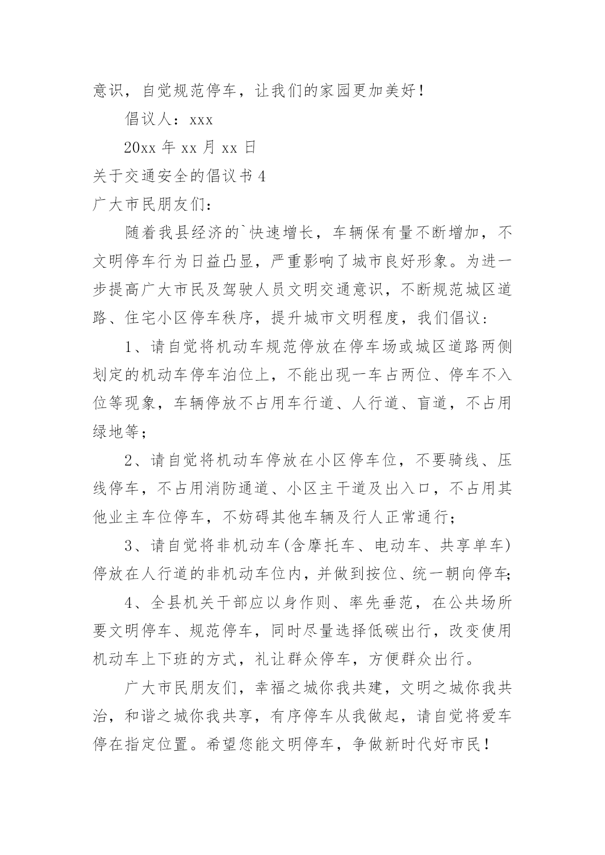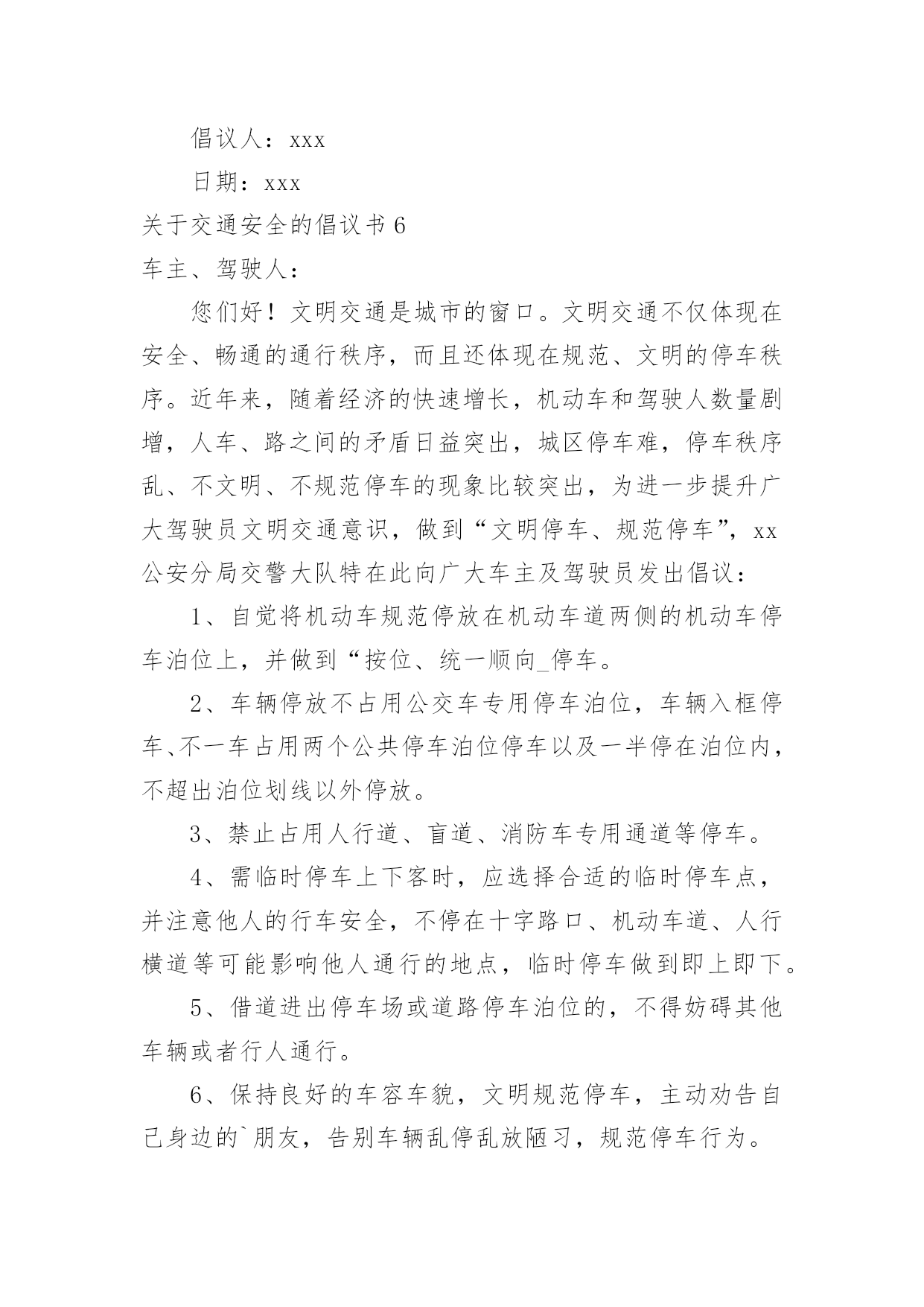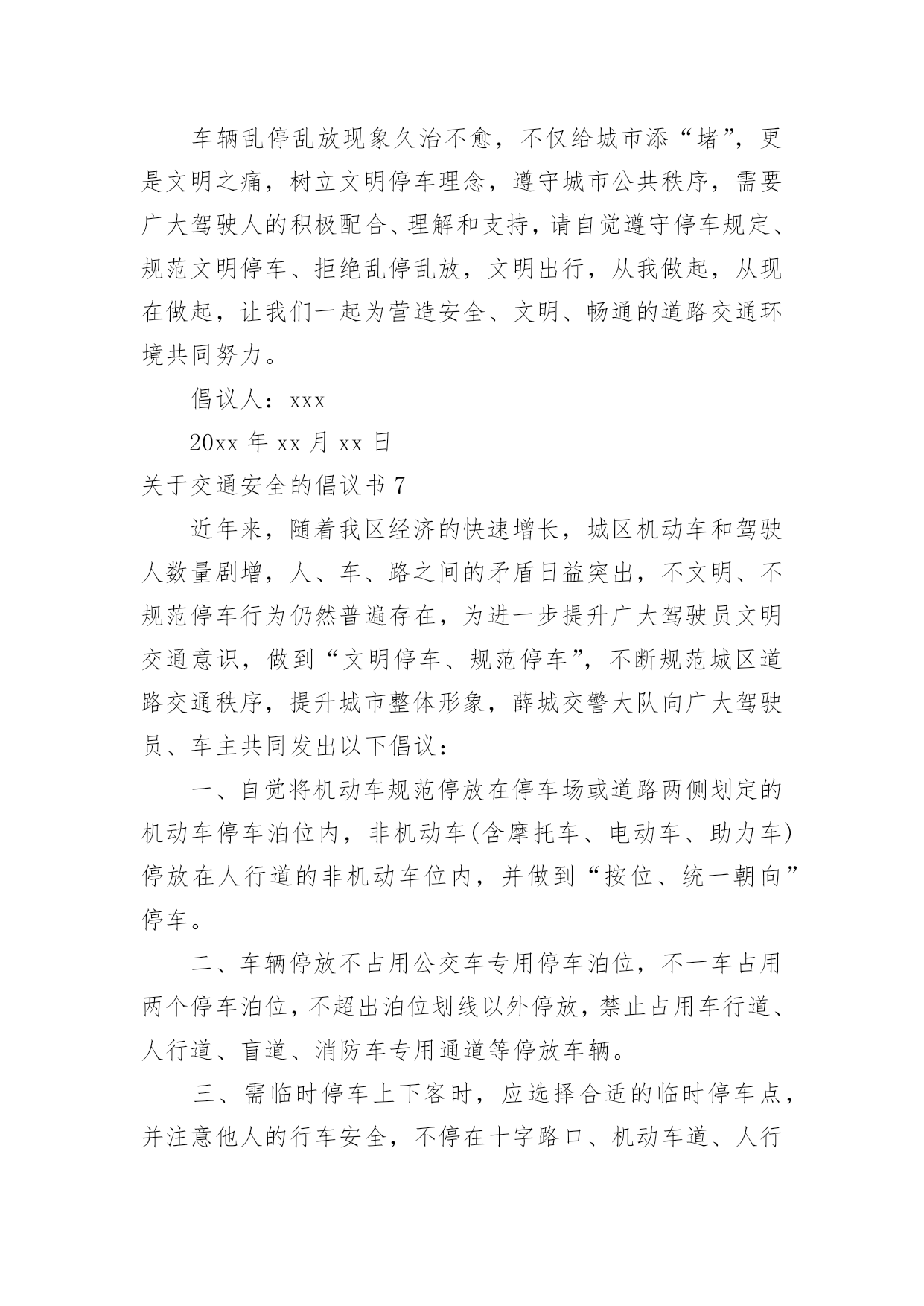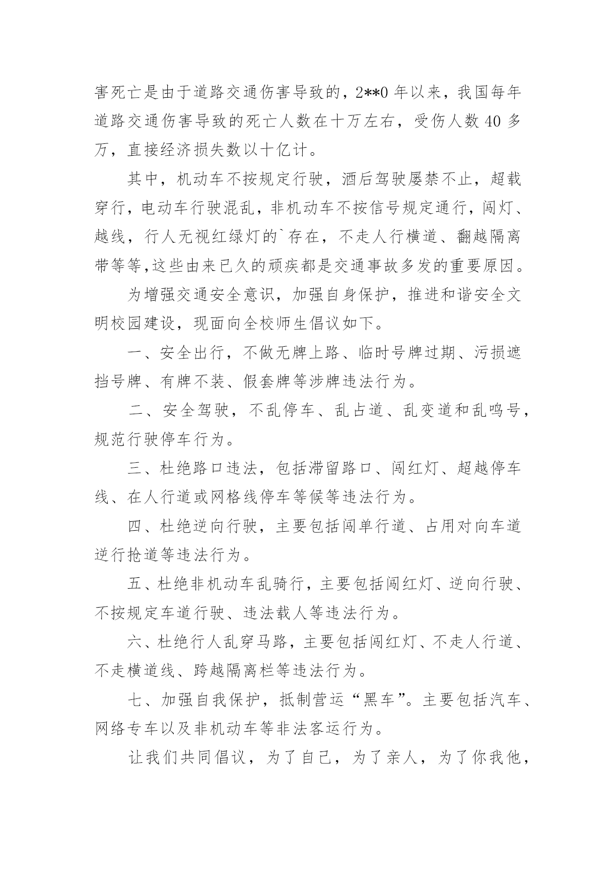 交通安全的倡议书关于交通安全的倡议书18篇[优秀]在不断进步的时代,用到倡议书的地方越来越多,在写作上,倡议书有一定的书写规范。倡议书的注意事项有许多,你确定会写吗?以下是小编为大家整理的关于交通安全的倡议书,欢迎阅读与收藏。关于交通安全的倡议书1广大驾驶员朋友:文明、安全、畅通的道路交通环境是城市的名片。近年来,随着古城区经济的.快速增长,城区机动车和驾驶人数量剧增,人、车、路之间的矛盾日益突出,不文明、不规范停车行为仍然普遍存在。为进一步提升广大驾驶员文明交通意识,做到“文明停车、规范停车”,不断规范城区道路交通秩序,提升丽江城市整体形象,向广大驾驶员、车主共同发出以下倡议:一、在划有停车泊位的路段,应当将机动车按顺行方向,车身紧靠道路右侧边缘线停入泊位;机动车停放不得超出泊位线,不得占用两个停车泊位。二、机动车不得在停车泊位外停放,不得占用公共汽车停靠站、人行道、消防通道、绿色通道等停车,摩托车、非机动车(含自行车、电动车、三轮车)的'停放不得占用机动车道、人行道及机动车泊位。三、需临时停车上下客的,应靠道路右侧顺行方向临时停车上下乘客并快速驶离,不得在交叉路口、机动车道、人行横道等妨碍其他车辆、行人通行的地方临时停车。四、保持车容车貌良好,做到文明规范停车,倡导身边朋友以实际行动告别车辆乱停乱放陋习。五、广大交通参与者要树立主人翁意识,争做车辆乱停乱放违法行为的监督员,要做到主动抵制、坚决制止。美丽丽江是我家、文明停车靠大家。文明出行,从你我做起,从现在做起,让我们共同为营造安全、有序、文明、畅通的道路交通环境贡献自己的力量。倡议人:xxx日期:xxx关于交通安全的倡议书2尊敬的家长朋友、亲爱的同学们:大家好!为确保学生的出行安全,我校特开展了“文明交通绿色出行”的活动,因此我们倡议同学们认真学习交通安全知识,提高交通安全意识和自我防护能力,同时希望家长朋友规范自己的.交通行为,以自身的一言一行引导孩子养成良好的交通习惯。为此,我们倡议全校师生及家长做到以下几点:1、在道路上行走时,要在人行道内行走或靠路边行走。不要在道路两侧嬉戏、追逐或长时间逗留,不要突然横过道路。横过道路时,必须从人行横道、天桥及其他行人过街设施通过;在通过人行横道时,也要注意观察来往车辆,加强自身安全防范。2、通过设有交通信号灯和人行横道的路口时,应当注意观察人行横道指示灯,在绿灯亮时通行;通过没有交通信号灯或人行横道的路口,应注意避让通行的车辆,在没有车辆通行的前提下安全通行。3、横过道路要做到:左看、右看、再左看,三次确认保安全,即;左看,确认近处无驶来车辆;再右看,确认远处无车辆通过;再次左看确认安全,才能迅速安全通过。4、家长要带头并教育自己的孩子不乘坐无牌、无证及无证人员驾驶的机动车、农用车三轮车、电瓶三轮车和拖拉机等交通工具;不乘坐车况差、改装车座和超员、超载的车辆。5、每一名小学生要自觉学习交通安全知识,学会自我保护,并劝告家长文明通行,不酒后驾驶、不超速、不违法超车、不疲劳驾驶、不闯红灯、不乱停乱放,驾驶和乘坐二轮摩托车时须戴好安全头盔。交通的文明需要大家共同建设,文明的交通需要大家共同呵护。让我们携起手来,倡导文明交通,树立文明新风,为创设安全、畅通、和谐、文明的交通环境作出自已应有的贡献!xxxxx月xx日关于交通安全的倡议书3尊敬的业主朋友们:文明,是日照最优雅的气质、最美丽的风景。我们这座城市,既有蓝天碧海金沙滩的自然风光,也有崇德向善、文明尚礼的人文气质。为进一步规范住宅小区车辆停放秩序,提升城市文明程度,营造道路畅通、出行方便、安全舒适的居住环境,市住房城乡建设局、市文明办、市委市直机关工委、市公安局、市消防救援支队和市物业管理协会向广大业主朋友们发出以下倡议:一、保持生命通道畅通。消防通道是生命通道,当火灾发生时,消防通道堵塞会延误救援灭火的最佳时机,当小区居民身体不适急需医疗救援时,消防通道堵塞也会延误病人的'最佳抢救时间。为了我们每位居民的安全,请自觉有序停车,不要将车辆停放在消防通道、小区主干道及出入口。二、安全有序文明停车。小区内停车有序、保持畅通,是我们方便出行的前提条件,停车混乱、堵塞,容易延误大家的出行时间。为维护小区良好的停车秩序,开车进入小区请减速慢行,请勿在非停车位区域停车,不要骑线、压线停车,不要占用其他业主车位停车,不要妨碍其他车辆及行人正常通行。三、爱护公共停车设施。请爱护小区内车棚、车库、车位、道闸等公共停车设施,让它们更好地为全体业主服务。小区是我家,管理靠大家。让我们携起手来,提高文明意识,自觉规范停车,让我们的家园更加美好!倡议人:xxx20xx年xx月xx日关于交通安全的倡议书4广大市民朋友们:随着我县经济的`快速增长,车辆保有量不断增加,不文明停车行为日益凸显,严重影响了城市