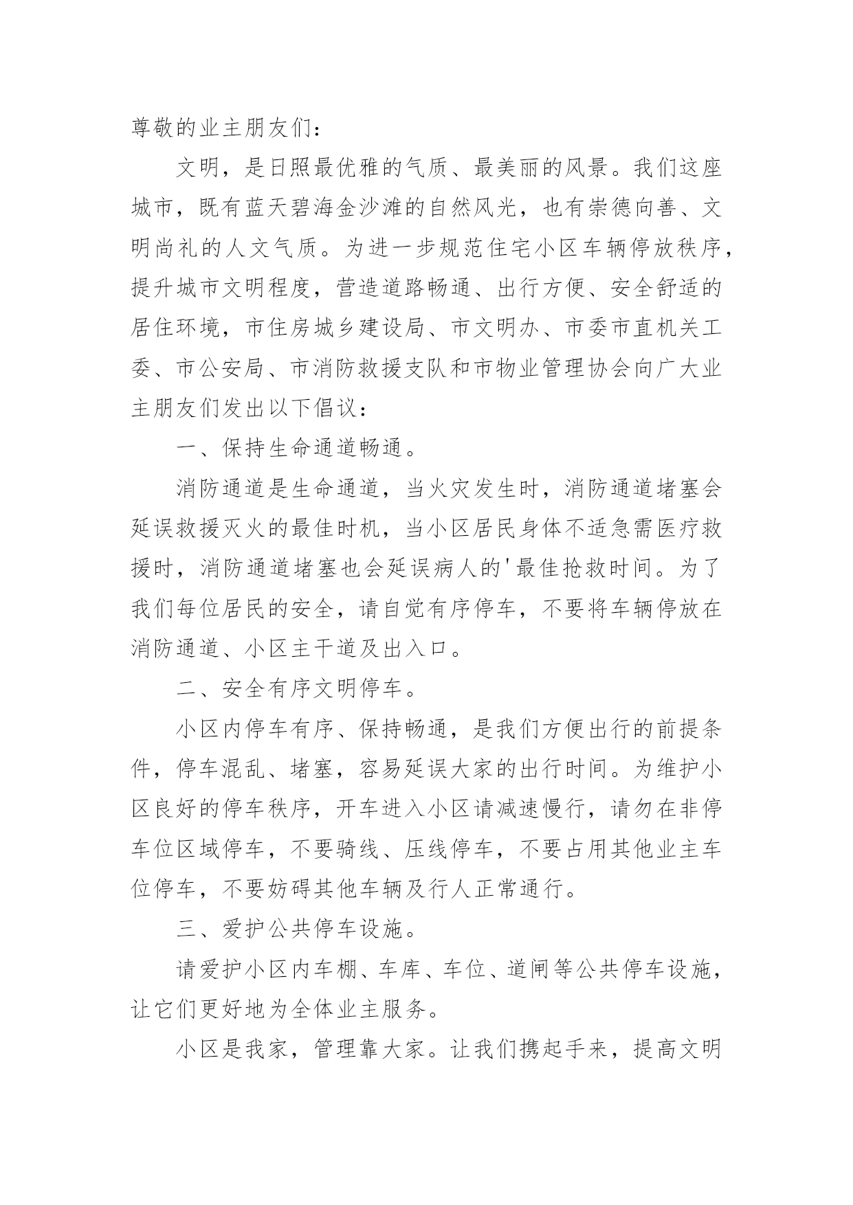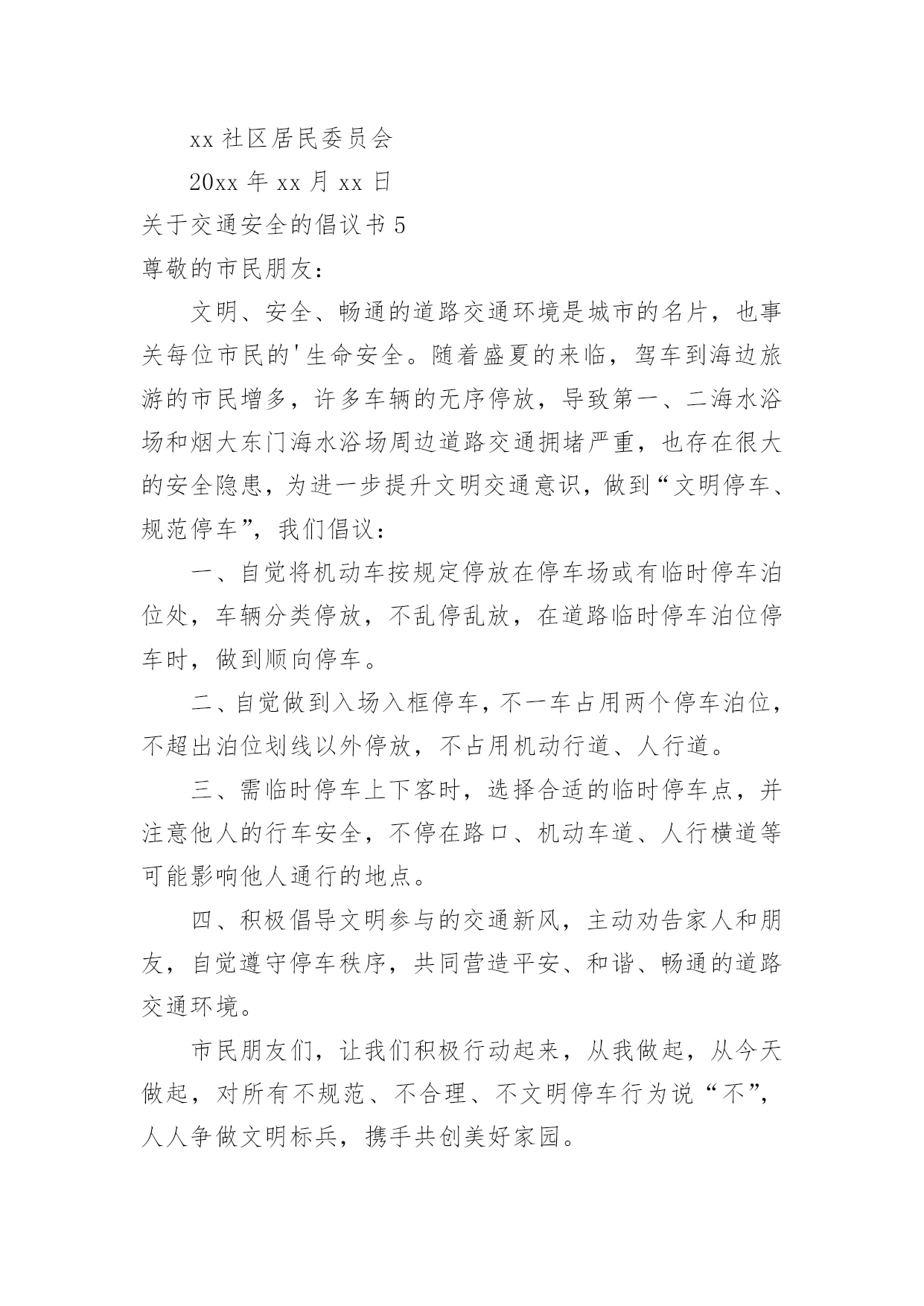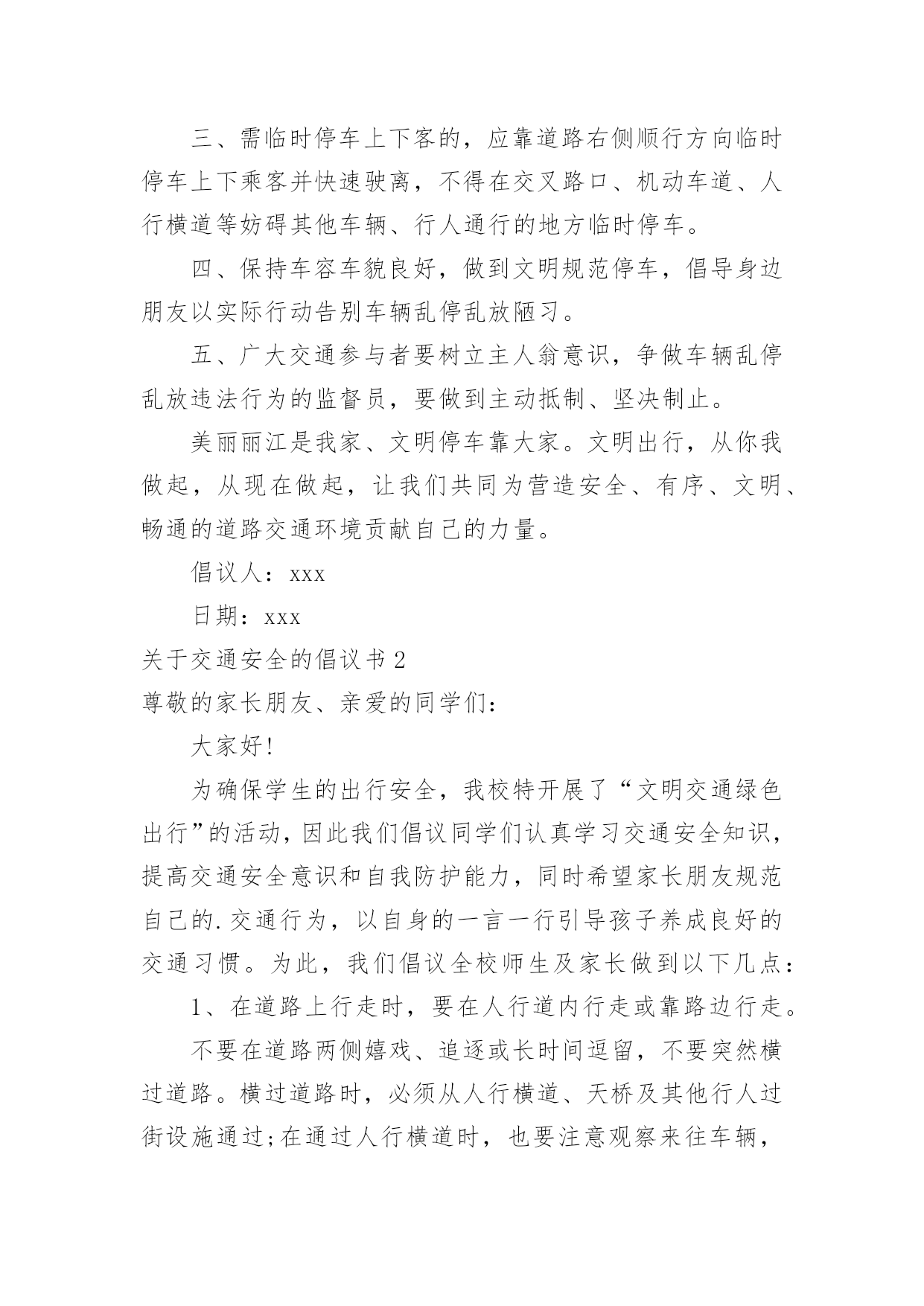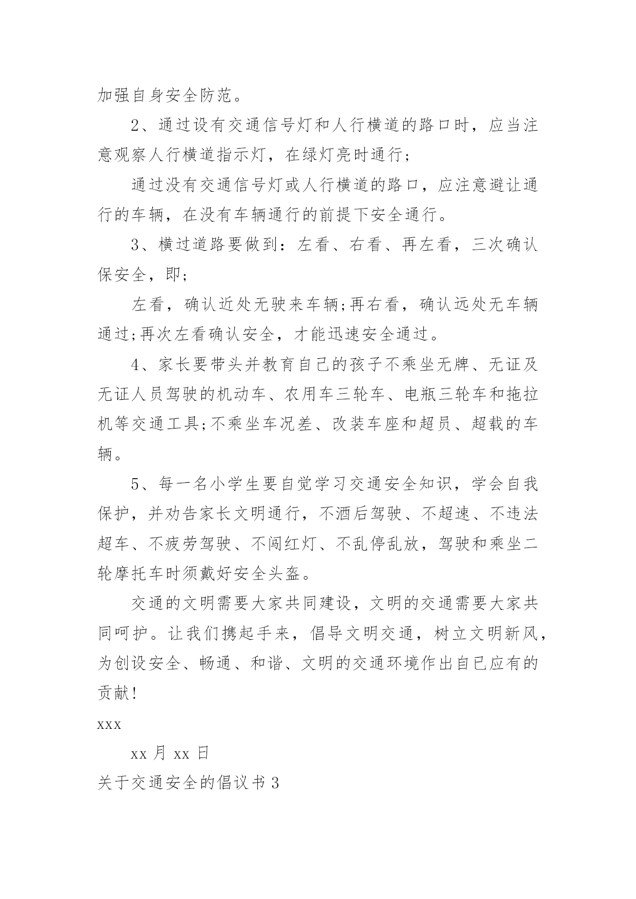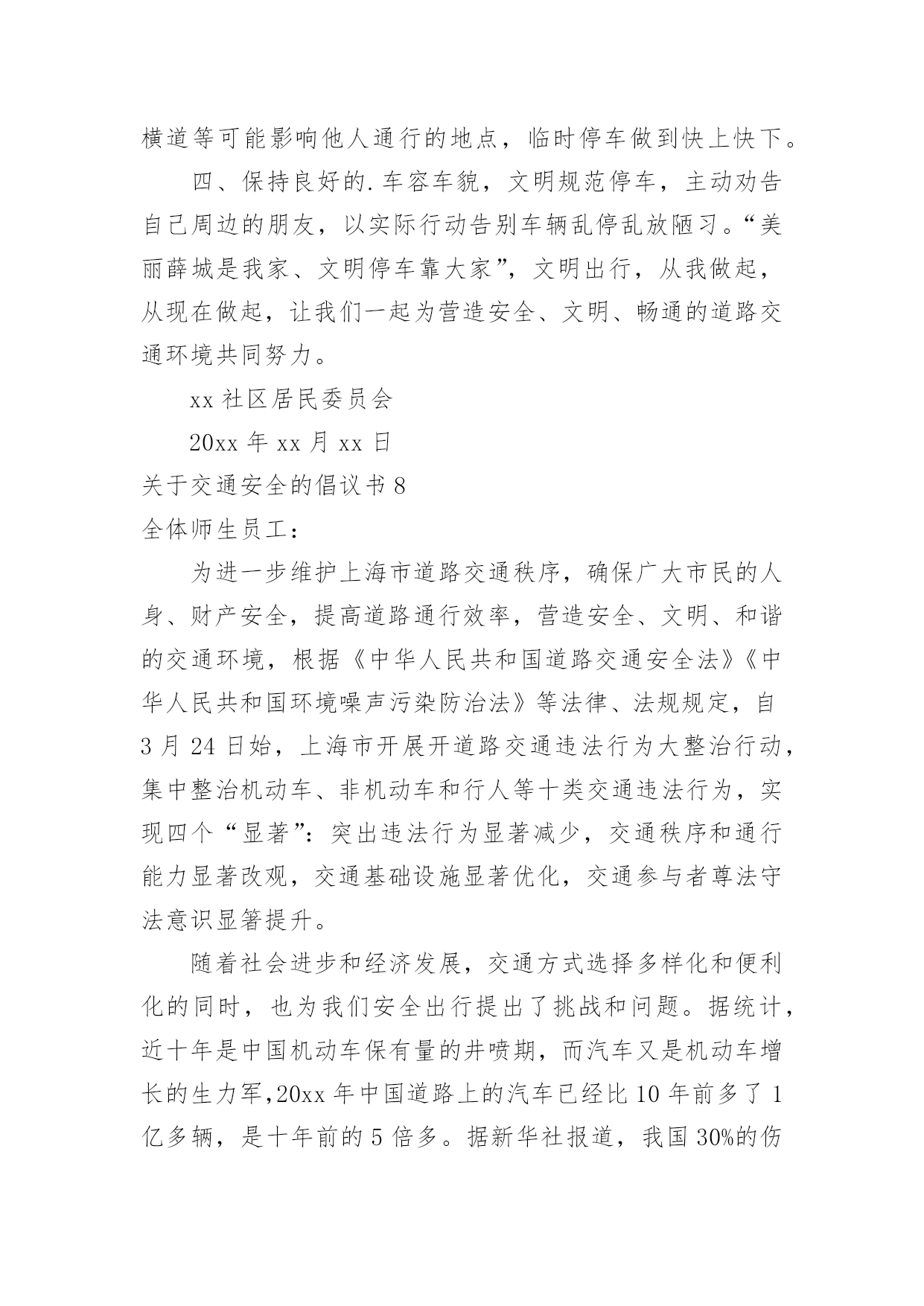 交通安全的倡议书关于交通安全的倡议书18篇[优秀]在不断进步的时代,用到倡议书的地方越来越多,在写作上,倡议书有一定的书写规范。倡议书的注意事项有许多,你确定会写吗?以下是小编为大家整理的关于交通安全的倡议书,欢迎阅读与收藏。关于交通安全的倡议书1广大驾驶员朋友:文明、安全、畅通的道路交通环境是城市的名片。近年来,随着古城区经济的.快速增长,城区机动车和驾驶人数量剧增,人、车、路之间的矛盾日益突出,不文明、不规范停车行为仍然普遍存在。为进一步提升广大驾驶员文明交通意识,做到“文明停车、规范停车”,不断规范城区道路交通秩序,提升丽江城市整体形象,向广大驾驶员、车主共同发出以下倡议:一、在划有停车泊位的路段,应当将机动车按顺行方向,车身紧靠道路右侧边缘线停入泊位;机动车停放不得超出泊位线,不得占用两个停车泊位。二、机动车不得在停车泊位外停放,不得占用公共汽车停靠站、人行道、消防通道、绿色通道等停车,摩托车、非机动车(含自行车、电动车、三轮车)的'停放不得占用机动车道、人行道及机动车泊位。三、需临时停车上下客的,应靠道路右侧顺行方向临时停车上下乘客并快速驶离,不得在交叉路口、机动车道、人行横道等妨碍其他车辆、行人通行的地方临时停车。四、保持车容车貌良好,做到文明规范停车,倡导身边朋友以实际行动告别车辆乱停乱放陋习。五、广大交通参与者要树立主人翁意识,争做车辆乱停乱放违法行为的监督员,要做到主动抵制、坚决制止。美丽丽江是我家、文明停车靠大家。文明出行,从你我做起,从现在做起,让我们共同为营造安全、有序、文明、畅通的道路交通环境贡献自己的力量。倡议人:xxx日期:xxx关于交通安全的倡议书2尊敬的家长朋友、亲爱的同学们:大家好!为确保学生的出行安全,我校特开展了“文明交通绿色出行”的活动,因此我们倡议同学们认真学习交通安全知识,提高交通安全意识和自我防护能力,同时希望家长朋友规范自己的.交通行为,以自身的一言一行引导孩子养成良好的交通习惯。为此,我们倡议全校师生及家长做到以下几点:1、在道路上行走时,要在人行道内行走或靠路边行走。不要在道路两侧嬉戏、追逐或长时间逗留,不要突然横过道路。横过道路时,必须从人行横道、天桥及其他行人过街设施通过;在通过人行横道时,也要注意观察来往车辆,加强自身安全防范。2、通过设有交通信号灯和人行横道的路口时,应当注意观察人行横道指示灯,在绿灯亮时通行;通过没有交通信号灯或人行横道的路口,应注意避让通行的车辆,在没有车辆通行的前提下安全通行。3、横过道路要做到:左看、右看、再左看,三次确认保安全,即;左看,确认近处无驶来车辆;再右看,确认远处无车辆通过;再次左看确认安全,才能迅速安全通过。4、家长要带头并教育自己的孩子不乘坐无牌、无证及无证人员驾驶的机动车、农用车三轮车、电瓶三轮车和拖拉机等交通工具;不乘坐车况差、改装车座和超员、超载的车辆。5、每一名小学生要自觉学习交通安全知识,学会自我保护,并劝告家长文明通行,不酒后驾驶、不超速、不违法超车、不疲劳驾驶、不闯红灯、不乱停乱放,驾驶和乘坐二轮摩托车时须戴好安全头盔。交通的文明需要大家共同建设,文明的交通需要大家共同呵护。让我们携起手来,倡导文明交通,树立文明新风,为创设安全、畅通、和谐、文明的交通环境作出自已应有的贡献!xxxxx月xx日关于交通安全的倡议书3尊敬的业主朋友们:文明,是日照最优雅的气质、最美丽的风景。我们这座城市,既有蓝天碧海金沙滩的自然风光,也有崇德向善、文明尚礼的人文气质。为进一步规范住宅小区车辆停放秩序,提升城市文明程度,营造道路畅通、出行方便、安全舒适的居住环境,市住房城乡建设局、市文明办、市委市直机关工委、市公安局、市消防救援支队和市物业管理协会向广大业主朋友们发出以下倡议:一、保持生命通道畅通。消防通道是生命通道,当火灾发生时,消防通道堵塞会延误救援灭火的最佳时机,当小区居民身体不适急需医疗救援时,消防通道堵塞也会延误病人的'最佳抢救时间。为了我们每位居民的安全,请自觉有序停车,不要将车辆停放在消防通道、小区主干道及出入口。二、安全有序文明停车。小区内停车有序、保持畅通,是我们方便出行的前提条件,停车混乱、堵塞,容易延误大家的出行时间。为维护小区良好的停车秩序,开车进入小区请减速慢行,请勿在非停车位区域停车,不要骑线、压线停车,不要占用其他业主车位停车,不要妨碍其他车辆及行人正常通行。三、爱护公共停车设施。请爱护小区内车棚、车库、车位、道闸等公共停车设施,让它们更好地为全体业主服务。小区是我家,管理靠大家。让我们携起手来,提高文明意识,自觉规范停车,让我们的家园更加美好!倡议人:xxx20xx年xx月xx日关于交通安全的倡议书4广大市民朋友们:随着我县经济的`快速增长,车辆保有量不断增加,不文明停车行为日益凸显,严重影响了城市