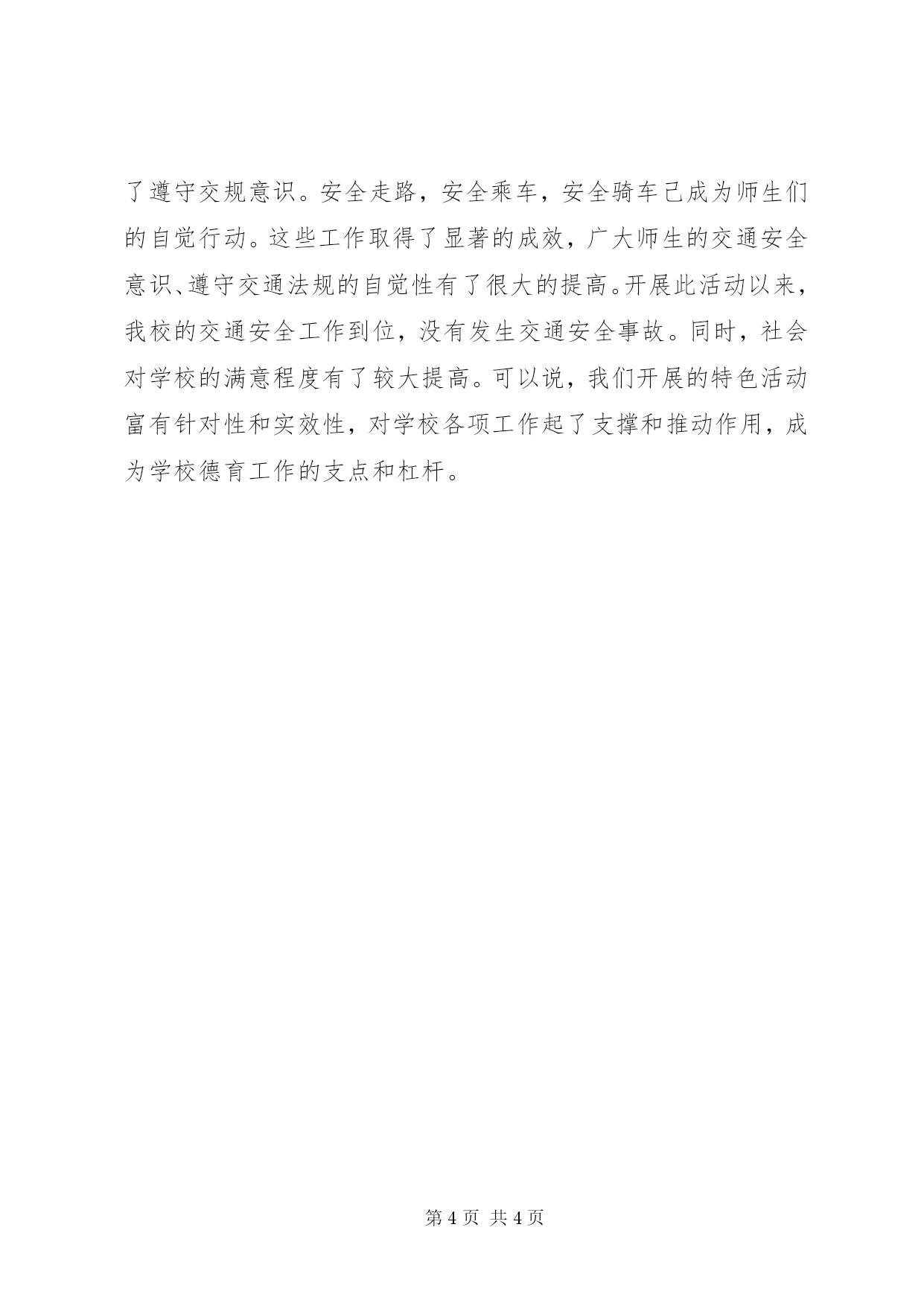第PAGE\*Arabic\*MERGEFORMAT4页共NUMPAGES\*MERGEFORMAT4页学校交通安全工作总结小学xxxx年秋学校交通安全工作总结交通安全教育是我校德育的重点工作,为了强化学生交通法规和安全常识的意识,提高学生自我防护能力,我校通过开展形式多样的学习教育活动,对学生进行交通安全教育,使学生懂得交通安全的重要性,帮助学生从小养成良好的交通行为习惯,增强学生交通安全意识,确保学生交通安全。现把我们学校的交通安全教育工作总结如下:一、加强领导,落实责任1、成立了交通安全教育领导小组为保证活动长期有序地开展,我校成立了“学校交通安全教育领导小组”,负责组织和安排学校的交通安全教育工作,把学生的交通安全教育列入重要的议事日程。组长:赵育梅(校长)副组长:范悦(副校长)杨万立(交警)刘丽妍(德育处主任)高宝路(后勤主任)组员:杜素敏(大队辅导员)年级组长(张艳、赵瑞雪、王洪梅、马懿、叶宝娜、宁培萍)、各班班主任德育处与大队辅导员、各个年级组长、各班班主任负责交通安全工作的具体操作与交通安全教育。交通安全工作领导小组的建立,使我校的交通安全工作有了一个行之有效的组织保障,各项具体工作得到了很好的落实。2、建立健全了学校交通安全工作相关制度我校先后制订了《嵩山道小学交通安全制度》、《嵩山道小学教师自驾机动车管理制度》等。在交通安全工作小组的领导下,我校还制定了《学校交通安全工作预案》。二、加强宣传,增强意识1、我校的开学教育就是以“交通安全教育”为主题的,在开学典礼和国旗下讲话中,“交通安全”一直是重要主题。可以说,一开学我校就将交通安全教育放在首位,将交通安全意识的培养放在了重要位置。2、交通安全教育课。我们利用校会课,请交警进行“交通安全伴我行”为内容的课程,使全校师生受教育率达100%,实现了交通安全教育进学校的目的,交通安全知识讲座使全体学生深受教育。3、组织学生观看《中小学生交通安全知识讲座》宣传片,通过宣传片中一些场景感染学生,提升安全意识。4、我们与交警中队联系,索取有关交通安全的图片资料、电影片,并将交通安全有关的道路交通法律、法规、交通标志牌和事故案例图片等展板,在学校橱窗内进行展览。校园都设置了交通安全教育标语和宣传画,使学校形成浓厚的交通安全氛围,学生在潜移默化中受到教育。5、各班黑板报出“交通安全专版”进行宣传;进行题为“关爱生命,安全出行”征文比赛;交通安全知识问卷;交通安全广播;组织学生编写交通安全手抄报,举行交通安全知识竞赛,等形式普及交通安全知识教育,扩大学生的知识面。6、组织班级以交通安全为主题的班会,通过班会学生们对自己身边发生的交通事故的感受,增强自我安全保护意识。7、学校开展了“大小交警手拉手”的活动,组织学生接受了包括交警手势操、道路交通安全知识等项目在内的多项训练。8、通过家长会等形式,对家长进行交通安全教育。要求家长配合学校对子女进行必要的走路和行车安全提醒,要严格遵守交通法规。这样,不仅使能提高学生的交通安全意识,而且能辐射家长,规范家长的交通行为。三、高度重视,加强管理1、加强对学校教师自行车、电动车、汽车的管理,教育教师严格做到“安全行车、规范停车”,通过教育、检查等形式制约教师遵守交通法规以及校纪校规。2、我校交通安全隐患最大的时间是学生上学、放学四个时段,地点是学生过马路的地方。为加强学生的出入管理,加强对上学和放学的管理,降低交通安全隐患,我校每天的上学和放学都安排有值日行政领导和值日教师在校门前护导,再加上保安和值勤生,共同疏导、维持上学和放学的交通秩序,监督和纠正个别不遵守交通规则和交通秩序的行为。交通安全工作已深入人心,老师、学生和家长都深有感触。学生了解了交通安全常识,提高了遵守交规意识。安全走路,安全乘车,安全骑车己成为师生们的自觉行动。这些工作取得了显著的成效,广大师生的交通安全意识、遵守交通法规的自觉性有了很大的提高。开展此活动以来,我校的交通安全工作到位,没有发生交通安全事故。同时,社会对学校的满意程度有了较大提高。可以说,我们开展的特色活动富有针对性和实效性,对学校各项工作起了支撑和推动作用,成为学校德育工作的支点和杠杆。
