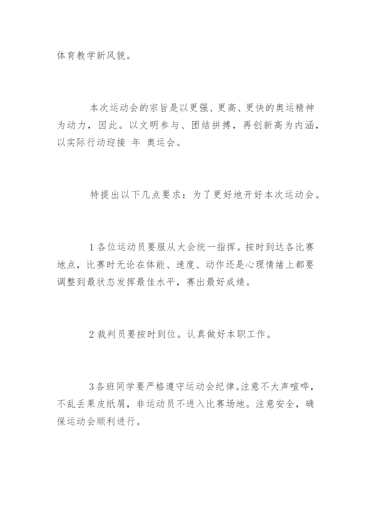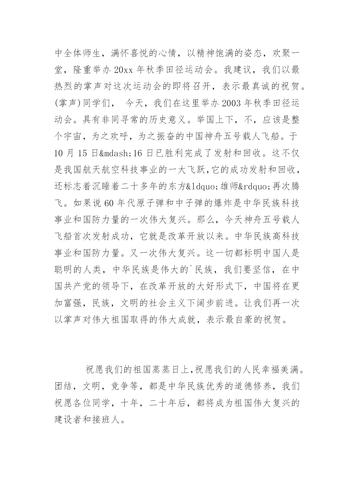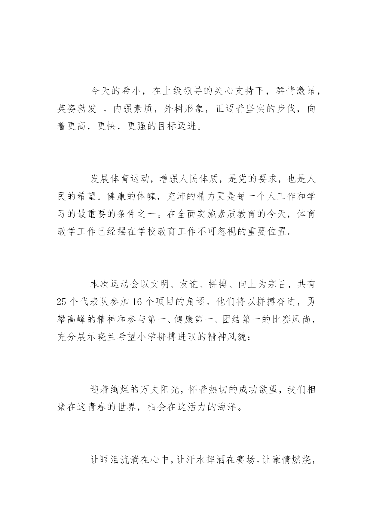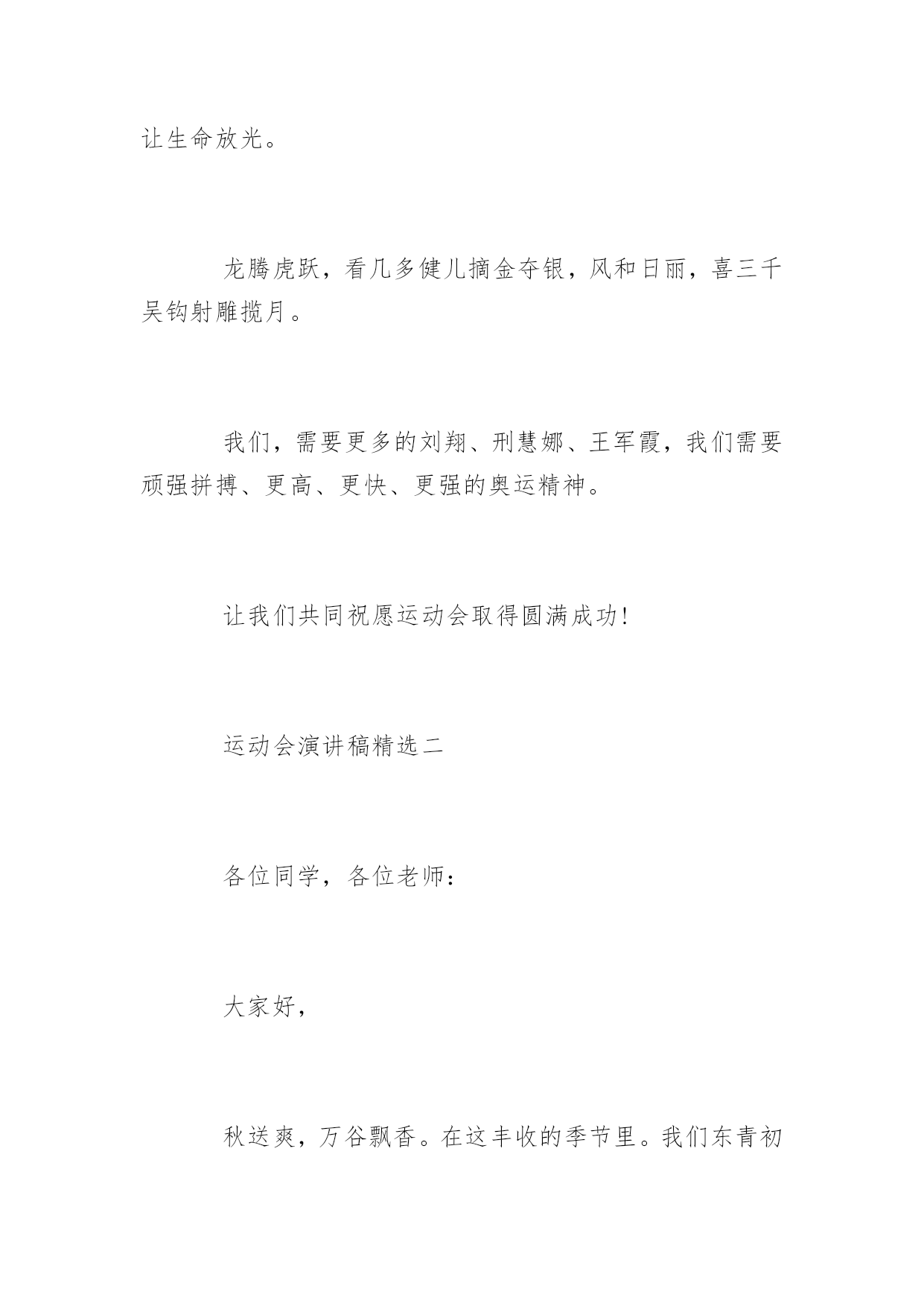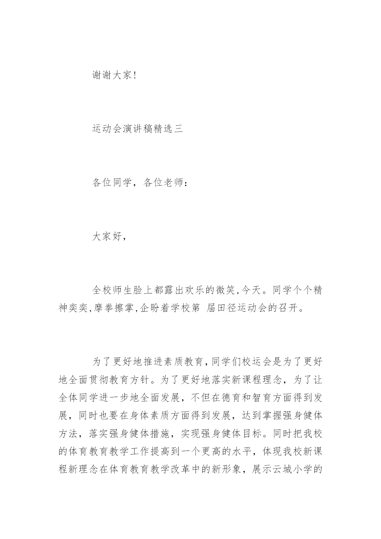运动会演讲稿运动会演讲稿400字范文又到了一年中校运会的时间了,在此,小编为大家整理了一些关于运动会的演讲稿,有需要的同学可以过来看一下哦!运动会演讲稿精选一各位同学,各位老师:大家好,追逐四月的和风,沐浴初夏的阳光!今天,我们晓兰希望小学迎来了一年一度的春季田径运动会。今天的希小,风含情,水含笑,花儿更妖娆。今天的希小,在上级领导的关心支持下,群情激昂,英姿勃发。内强素质,外树形象,正迈着坚实的步伐,向着更高,更快,更强的目标迈进。发展体育运动,增强人民体质,是党的要求,也是人民的希望。健康的体魄,充沛的精力更是每一个人工作和学习的最重要的条件之一。在全面实施素质教育的今天,体育教学工作已经摆在学校教育工作不可忽视的重要位置。本次运动会以文明、友谊、拼搏、向上为宗旨,共有25个代表队参加16个项目的角逐。他们将以拼搏奋进,勇攀高峰的精神和参与第一、健康第一、团结第一的比赛风尚,充分展示晓兰希望小学拼搏进取的精神风貌:迎着绚烂的万丈阳光,怀着热切的成功欲望,我们相聚在这青春的世界,相会在这活力的海洋。让眼泪流淌在心中,让汗水挥洒在赛场。让豪情燃烧,让生命放光。龙腾虎跃,看几多健儿摘金夺银,风和日丽,喜三千吴钩射雕揽月。我们,需要更多的刘翔、刑慧娜、王军霞,我们需要顽强拼搏、更高、更快、更强的奥运精神。让我们共同祝愿运动会取得圆满成功!运动会演讲稿精选二各位同学,各位老师:大家好,秋送爽,万谷飘香。在这丰收的季节里。我们东青初中全体师生,满怀喜悦的心情,以精神饱满的姿态,欢聚一堂,隆重举办20xx年秋季田径运动会。我建议,我们以最热烈的掌声对这次运动会的即将召开,表示最真诚的祝贺。(掌声)同学们,今天,我们在这里举办2003年秋季田径运动会。具有非同寻常的历史意义。举国上下,不,应该是整个宇宙,为之欢呼,为之振奋的中国神舟五号载人飞船。于10月15日—16日已胜利完成了发射和回收。这不仅是我国航天航空科技事业的一大飞跃,它的成功发射和回收,还标志着沉睡着二十多年的东方“雄师”再次腾飞。如果说60年代原子弹和中子弹的爆炸是中华民族科技事业和国防力量的一次伟大复兴。那么,今天神舟五号载人飞船首次发射成功,它就是改革开放以来。中华民族高科技事业和国防力量。又一次伟大复兴。这一切都标明中国人是聪明的人类,中华民族是伟大的`民族,我们要坚信,在中国共产党的领导下,在改革开放的大好形式下,中国将在更加富强,民族,文明的社会主义下阔步前进。让我们再一次以掌声对伟大祖国取得的伟大成就,表示最自豪的祝贺。祝愿我们的祖国蒸蒸日上,祝愿我们的人民幸福美满。团结,文明,竞争等,都是中华民族优秀的道德修养,我们祝愿各位同学,十年,二十年后,都将成为祖国伟大复兴的建设者和接班人。谢谢大家!运动会演讲稿精选三各位同学,各位老师:大家好,全校师生脸上都露出欢乐的微笑,今天。同学个个精神奕奕,摩拳擦掌,企盼着学校第届田径运动会的召开。为了更好地推进素质教育,同学们校运会是为了更好地全面贯彻教育方针。为了更好地落实新课程理念,为了让全体同学进一步地全面发展,不但在德育和智育方面得到发展,同时也要在身体素质方面得到发展,达到掌握强身健体方法,落实强身健体措施,实现强身健体目标。同时把我校的体育教育教学工作提高到一个更高的水平,体现我校新课程新理念在体育教育教学改革中的新形象,展示云城小学的体育教学新风貌。本次运动会的宗旨是以更强、更高、更快的奥运精神为动力,因此。以文明参与、团结拼搏,再创新高为内涵,以实际行动迎接年奥运会。特提出以下几点要求:为了更好地开好本次运动会。1各位运动员要服从大会统一指挥。按时到达各比赛地点,比赛时无论在体能、速度、动作还是心理情绪上都要调整到最状态发挥最佳水平,赛出最好成绩。2裁判员要按时到位。认真做好本职工作。3各班同学要严格遵守运动会纪律。注意不大声喧哗,不乱丢果皮纸屑,非运动员不进入比赛场地。注意安全,确保运动会顺利进行。锻炼中得到成长。预祝云城小学第四届田径运动会圆满成功要把本次运动会开成一个团结、文明、健康、向上的学校盛会。祝全体同学在参与中得到锻炼!