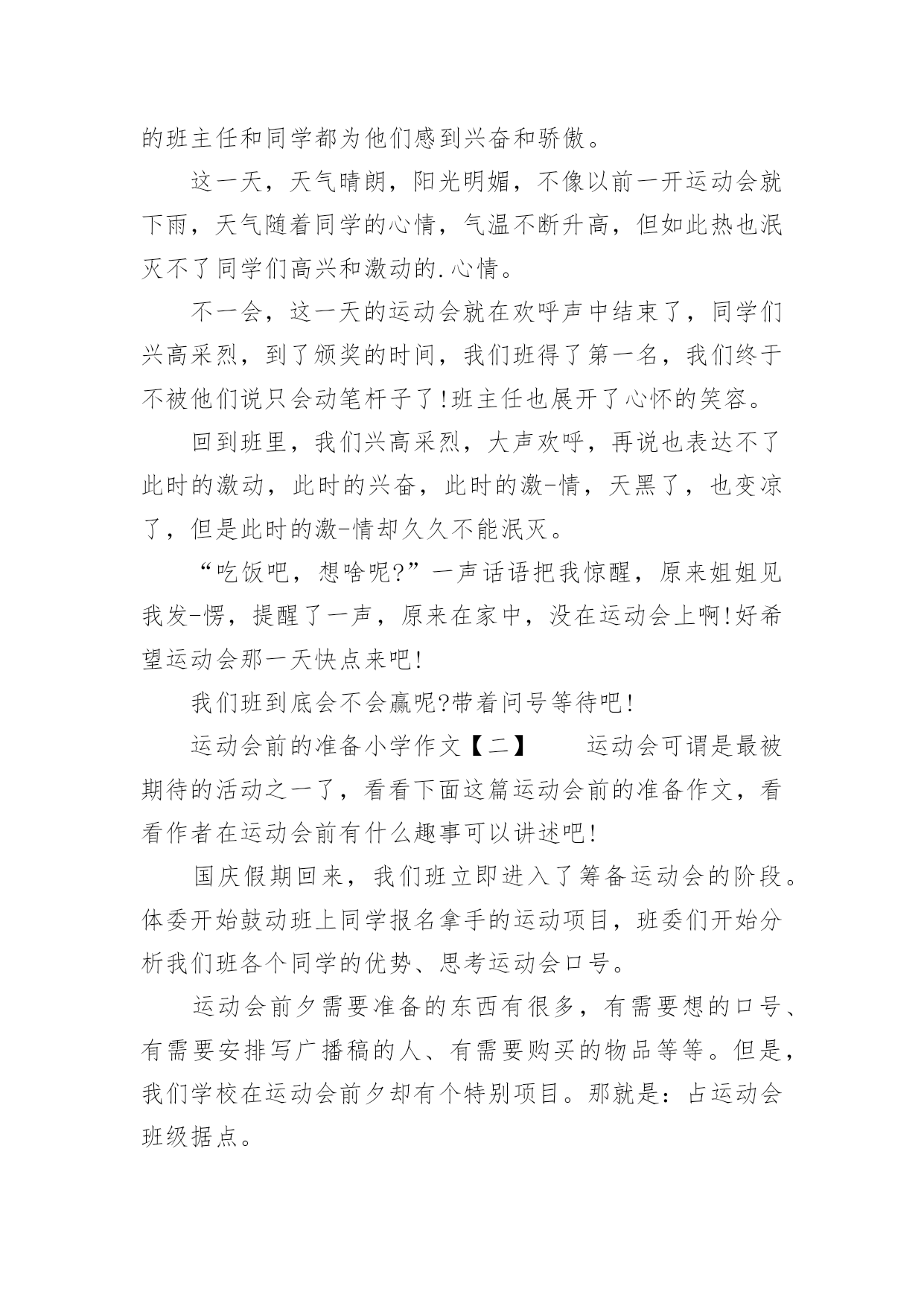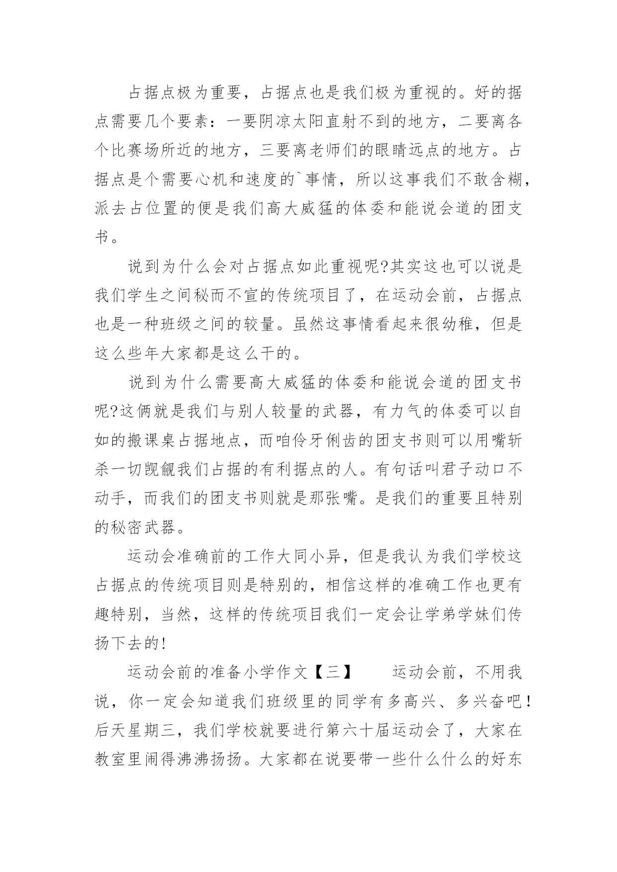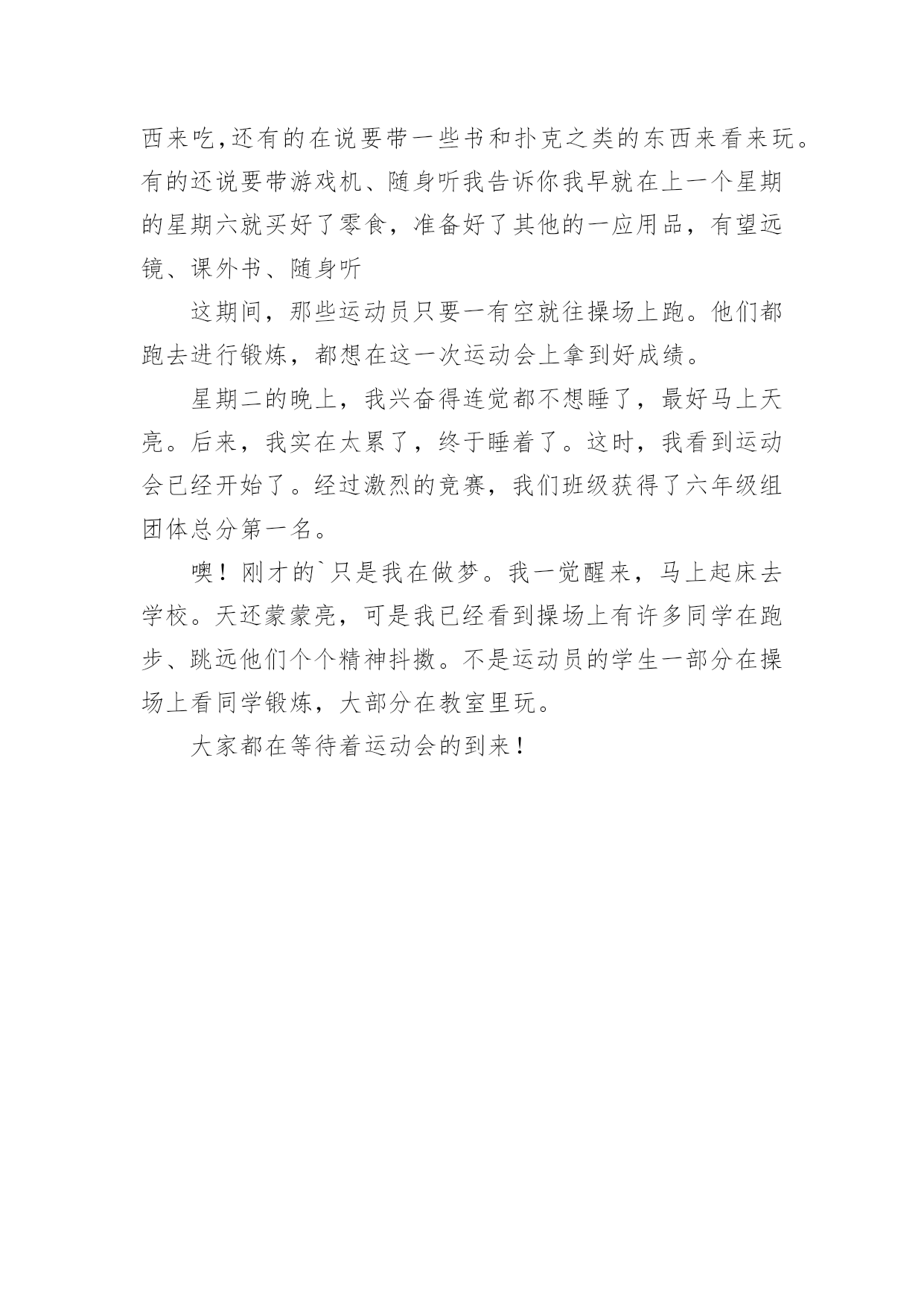 运动会前的准备小学作文运动会前的准备小学作文运动会的竞赛项目多、持续时间长、运动强度大、参加人数多,安全问题十分重要。那么运动会前的准备小学作文有哪些?大家不妨来看看小编推送的运动会前的准备小学作文,希望给大家带来帮助!运动会前的准备小学作文【一】时间来去匆匆,伴随着悄声无息的时间的脚步,眼看着今年的校运动会又要即将来临,听同学说好像在10月27/28号举行,运动会前的作文。每天在无聊的时间,总会想想校运动会的事,这不,刚又想入非非了……这一天,校运动会即将开始,老师让我们搬着椅子下去了坐在操场上,我们都穿着校服,远看一片整齐,我们直挺挺的坐着,准备迎接我们这一届第一次在28中的运动会,主持人上了台,郑重其事的说明运动会要开始了。我们满怀着无比的激动,看!我们的运动员很尽力的奔跑,用尽自己全力!可是赛场上是无情的,有欢喜,有快乐、又激动、又伤心、又懊悔……这就是赛场,是无情的,这不,一会儿又到了跳远的时间,同学们一个比一个奋勇,一个比一个跳得远,有的班级兴奋,有的班级失落,我们班的同学一个比一个奋勇,过关斩将,赢得了这次宝贵的比赛,我们的班主任和同学都为他们感到兴奋和骄傲。这一天,天气晴朗,阳光明媚,不像以前一开运动会就下雨,天气随着同学的心情,气温不断升高,但如此热也泯灭不了同学们高兴和激动的.心情。不一会,这一天的运动会就在欢呼声中结束了,同学们兴高采烈,到了颁奖的时间,我们班得了第一名,我们终于不被他们说只会动笔杆子了!班主任也展开了心怀的笑容。回到班里,我们兴高采烈,大声欢呼,再说也表达不了此时的激动,此时的兴奋,此时的激-情,天黑了,也变凉了,但是此时的激-情却久久不能泯灭。“吃饭吧,想啥呢?”一声话语把我惊醒,原来姐姐见我发-愣,提醒了一声,原来在家中,没在运动会上啊!好希望运动会那一天快点来吧!我们班到底会不会赢呢?带着问号等待吧!运动会前的准备小学作文【二】运动会可谓是最被期待的活动之一了,看看下面这篇运动会前的准备作文,看看作者在运动会前有什么趣事可以讲述吧!国庆假期回来,我们班立即进入了筹备运动会的阶段。体委开始鼓动班上同学报名拿手的运动项目,班委们开始分析我们班各个同学的优势、思考运动会口号。运动会前夕需要准备的东西有很多,有需要想的口号、有需要安排写广播稿的人、有需要购买的物品等等。但是,我们学校在运动会前夕却有个特别项目。那就是:占运动会班级据点。占据点极为重要,占据点也是我们极为重视的。好的据点需要几个要素:一要阴凉太阳直射不到的地方,二要离各个比赛场所近的地方,三要离老师们的眼睛远点的地方。占据点是个需要心机和速度的`事情,所以这事我们不敢含糊,派去占位置的便是我们高大威猛的体委和能说会道的团支书。说到为什么会对占据点如此重视呢?其实这也可以说是我们学生之间秘而不宣的传统项目了,在运动会前,占据点也是一种班级之间的较量。虽然这事情看起来很幼稚,但是这么些年大家都是这么干的。说到为什么需要高大威猛的体委和能说会道的团支书呢?这俩就是我们与别人较量的武器,有力气的体委可以自如的搬课桌占据地点,而咱伶牙俐齿的团支书则可以用嘴斩杀一切觊觎我们占据的有利据点的人。有句话叫君子动口不动手,而我们的团支书则就是那张嘴。是我们的重要且特别的秘密武器。运动会准确前的工作大同小异,但是我认为我们学校这占据点的传统项目则是特别的,相信这样的准确工作也更有趣特别,当然,这样的传统项目我们一定会让学弟学妹们传扬下去的!运动会前的准备小学作文【三】运动会前,不用我说,你一定会知道我们班级里的同学有多高兴、多兴奋吧!后天星期三,我们学校就要进行第六十届运动会了,大家在教室里闹得沸沸扬扬。大家都在说要带一些什么什么的好东西来吃,还有的在说要带一些书和扑克之类的东西来看来玩。有的还说要带游戏机、随身听我告诉你我早就在上一个星期的星期六就买好了零食,准备好了其他的一应用品,有望远镜、课外书、随身听这期间,那些运动员只要一有空就往操场上跑。他们都跑去进行锻炼,都想在这一次运动会上拿到好成绩。星期二的晚上,我兴奋得连觉都不想睡了,最好马上天亮。后来,我实在太累了,终于睡着了。这时,我看到运动会已经开始了。经过激烈的竞赛,我们班级获得了六年级组团体总分第一名。噢!刚才的`只是我在做梦。我一觉醒来,马上起床去学校。天还蒙蒙亮,可是我已经看到操场上有许多同学在跑步、跳远他们个个精神抖擞。不是运动员的学生一部分在操场上看同学锻炼,大部分在教室里玩。大家都在等待着运动会的到来!