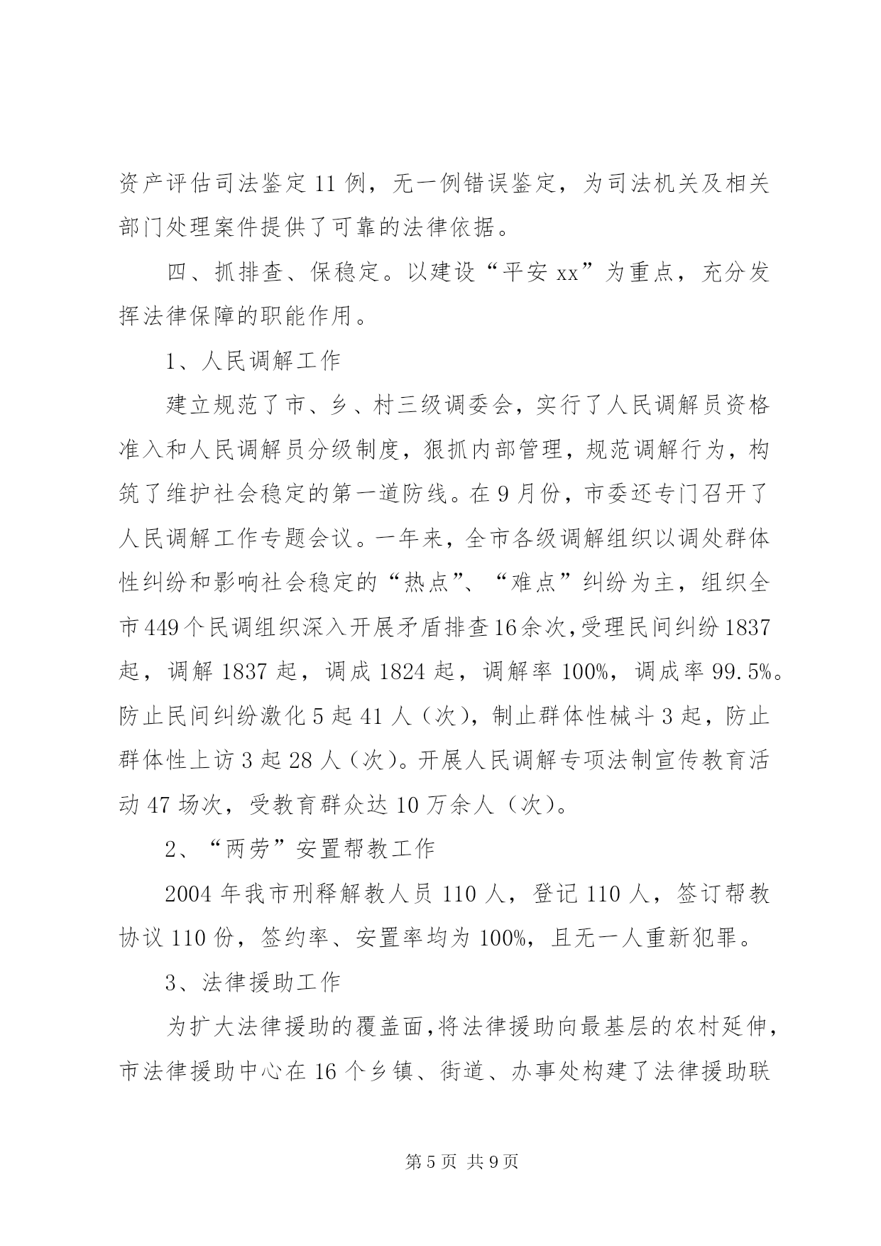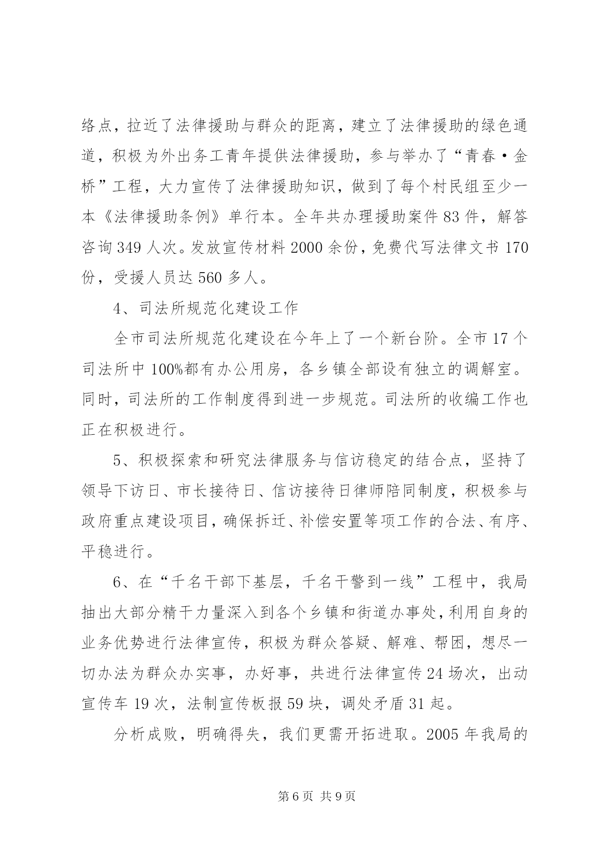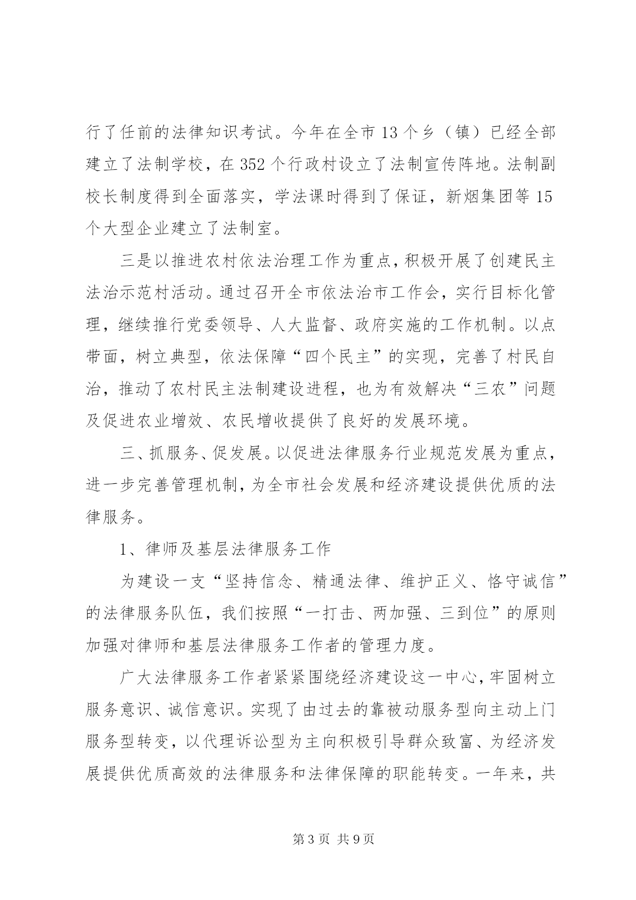 第PAGE\*Arabic\*MERGEFORMAT9页共NUMPAGES\*MERGEFORMAT9页司法行政工作汇报材料2004年度,xx市司法行政工作在xx市司法局的指导下,按照“突出四个强化,促进四个转变,达到四个提高,实现两个保持”的工作思路,以服务经济建设、促进社会稳定为首任,坚持以人为本、贴近实际、贴近生活、贴近群众的原则,以服务农业、服务农村、服务农民为重点,充分发挥法制教育、法律服务、法律保障三大职能,扎实工作,拼搏进取,为维护全市社会安宁、政治稳定,促进经济快速、健康、平稳发展做出了积极的贡献。一、严措施、抓落实。以加强队伍建设为重点,以“十争十优”活动和“八个一”工程为载体,不断提高全体干警的整体素质,为各项工作的开展打下了基础。在队伍建设中始终坚持以人为本、效率优先、开拓创新、常抓不懈。通过采取分散自学和集中学习相结合、讨论交流与调查研究相结合、各类培训与专题讲座相结合的方法,全面推行“八个一”工程,整体推进了文明执法和行风建设。特别是坚持了每周五下午的干警讲课制度,提高了全体干警的业务素质。机关工作人员以建设服务型机关为中心,不断改进工作作风,提高了工作效率。在全体干警中开展了以“公正执法树形象”为主题的专项教育整顿活动和“十争”活动。树立“十争”标兵,推出“十优”科室,榜样示范,模范带动,激发了热情,激活了队伍。“十争十优”活动的广泛开展,使广大干警立警为公,司法为民的信念更加坚定,服务意识进一步增强,精神面貌大为改观,工作效率明显提高。二、抓宣传,重实效。以“四五”普法和“二五”依法治市工作为总揽,加强法制宣传教育,为政府中心工作营造良好的法治环境。一是坚持以人为本,贴近实际、贴近生活、贴近群众,用丰富多采、生动活泼、喜闻乐见、寓教于乐的形式,培养公众学法的兴趣,提高了公民用法的能力和护法的自觉性。在12·4普法活动中,共组织21个执法单位的500多名执法人员在炎黄广场进行了声势浩大的宣誓和咨询活动。全年共组织法制文艺演出20余场(次),发放各类普法宣传材料40000余册(份),放映法制电影230余场次。共组织普法讲师、律师、公证员送法律下乡450余人(次),把贴近农民生产生活需要的法律知识,送到了农村,送给了农民,引导农民群众学法、懂法、守法、护法、依法办事,学会用法律武器维护自己的合法权益。受教育群众达9万余人(次)。二是以“法律五入”活动为载体,加大了对社会各个阶层特别是政府公务员和行政执法人员的普法教育力度。今年我们特别邀请了全国人大法工委法制室李援主任及省市等有关法学专家对全市的干部进行了以《行政许可法》为内容的法律知识培训。人大还根据《xx市干部学法八项制度》对新任命的领导干部进行了任前的法律知识考试。今年在全市13个乡(镇)已经全部建立了法制学校,在352个行政村设立了法制宣传阵地。法制副校长制度得到全面落实,学法课时得到了保证,新烟集团等15个大型企业建立了法制室。三是以推进农村依法治理工作为重点,积极开展了创建民主法治示范村活动。通过召开全市依法治市工作会,实行目标化管理,继续推行党委领导、人大监督、政府实施的工作机制。以点带面,树立典型,依法保障“四个民主”的实现,完善了村民自治,推动了农村民主法制建设进程,也为有效解决“三农”问题及促进农业增效、农民增收提供了良好的发展环境。三、抓服务、促发展。以促进法律服务行业规范发展为重点,进一步完善管理机制,为全市社会发展和经济建设提供优质的法律服务。1、律师及基层法律服务工作为建设一支“坚持信念、精通法律、维护正义、恪守诚信”的法律服务队伍,我们按照“一打击、两加强、三到位”的原则加强对律师和基层法律服务工作者的管理力度。广大法律服务工作者紧紧围绕经济建设这一中心,牢固树立服务意识、诚信意识。实现了由过去的靠被动服务型向主动上门服务型转变,以代理诉讼型为主向积极引导群众致富、为经济发展提供优质高效的法律服务和法律保障的职能转变。一年来,共担任企业、事业单位、政府机关、社会团体和个人法律顾问544家;办理诉讼、非诉讼案件2317件;办理法律援助案件52件,解答法律咨询7万人次,为当事人挽回和避免经济损失660多万元。2、公证工作公证工作积极发挥减少诉讼,预防纠纷的作用,为国土资源局土地挂牌出让保驾护航,涉及标的3500万元;为住房按揭贷款公证15家,涉及标的75万元;积极开拓证源,为华信集团毕业生就业安置办理了公证,深受学校师生的好评,解除了学生的后顾之忧。全年共受理各类公证5100余件,主动与xx热电厂、天津药业集团、xx药厂、xx化工集团、xxxx公司等大中型企业建立常年公证联络点15家,开拓新证源3家,为企事业单位和个人避免经济损失140万元,挽回经济损失80万元,所办理的各类公证事项无错、假、伪证。3、