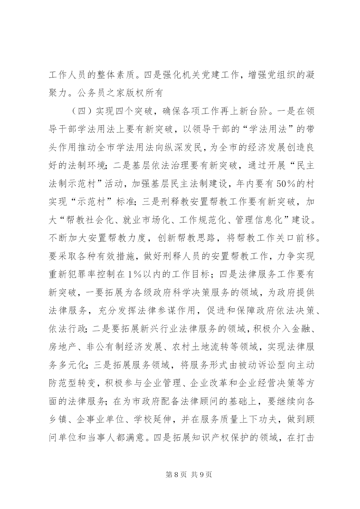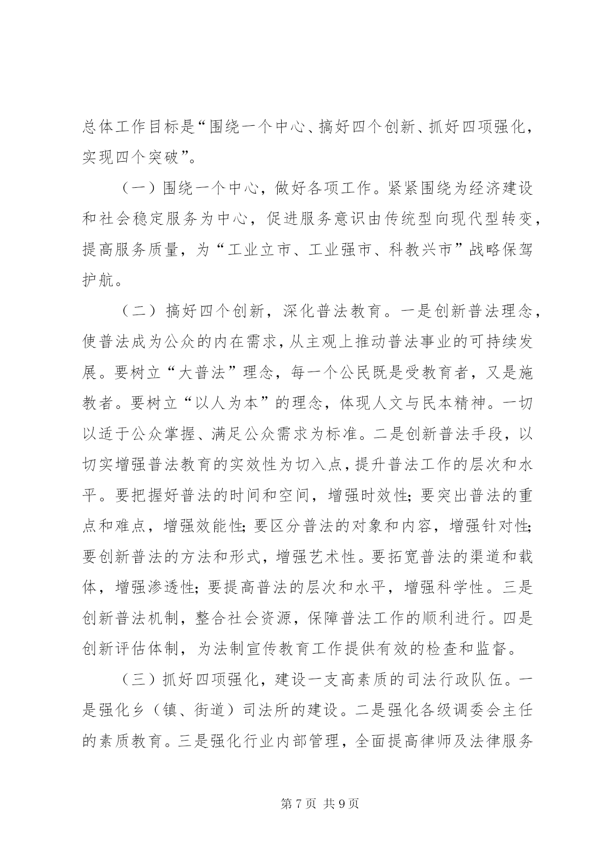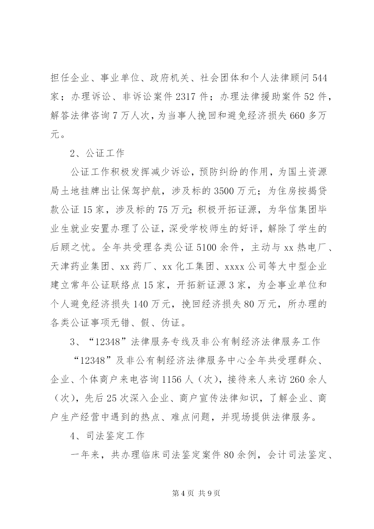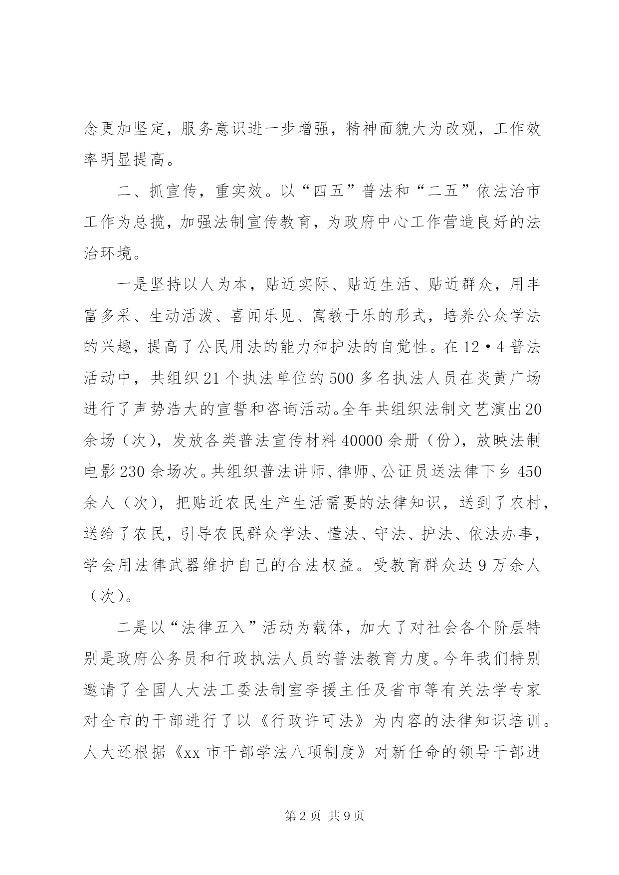 第PAGE\*Arabic\*MERGEFORMAT9页共NUMPAGES\*MERGEFORMAT9页司法行政工作汇报材料2004年度,xx市司法行政工作在xx市司法局的指导下,按照“突出四个强化,促进四个转变,达到四个提高,实现两个保持”的工作思路,以服务经济建设、促进社会稳定为首任,坚持以人为本、贴近实际、贴近生活、贴近群众的原则,以服务农业、服务农村、服务农民为重点,充分发挥法制教育、法律服务、法律保障三大职能,扎实工作,拼搏进取,为维护全市社会安宁、政治稳定,促进经济快速、健康、平稳发展做出了积极的贡献。一、严措施、抓落实。以加强队伍建设为重点,以“十争十优”活动和“八个一”工程为载体,不断提高全体干警的整体素质,为各项工作的开展打下了基础。在队伍建设中始终坚持以人为本、效率优先、开拓创新、常抓不懈。通过采取分散自学和集中学习相结合、讨论交流与调查研究相结合、各类培训与专题讲座相结合的方法,全面推行“八个一”工程,整体推进了文明执法和行风建设。特别是坚持了每周五下午的干警讲课制度,提高了全体干警的业务素质。机关工作人员以建设服务型机关为中心,不断改进工作作风,提高了工作效率。在全体干警中开展了以“公正执法树形象”为主题的专项教育整顿活动和“十争”活动。树立“十争”标兵,推出“十优”科室,榜样示范,模范带动,激发了热情,激活了队伍。“十争十优”活动的广泛开展,使广大干警立警为公,司法为民的信念更加坚定,服务意识进一步增强,精神面貌大为改观,工作效率明显提高。二、抓宣传,重实效。以“四五”普法和“二五”依法治市工作为总揽,加强法制宣传教育,为政府中心工作营造良好的法治环境。一是坚持以人为本,贴近实际、贴近生活、贴近群众,用丰富多采、生动活泼、喜闻乐见、寓教于乐的形式,培养公众学法的兴趣,提高了公民用法的能力和护法的自觉性。在12·4普法活动中,共组织21个执法单位的500多名执法人员在炎黄广场进行了声势浩大的宣誓和咨询活动。全年共组织法制文艺演出20余场(次),发放各类普法宣传材料40000余册(份),放映法制电影230余场次。共组织普法讲师、律师、公证员送法律下乡450余人(次),把贴近农民生产生活需要的法律知识,送到了农村,送给了农民,引导农民群众学法、懂法、守法、护法、依法办事,学会用法律武器维护自己的合法权益。受教育群众达9万余人(次)。二是以“法律五入”活动为载体,加大了对社会各个阶层特别是政府公务员和行政执法人员的普法教育力度。今年我们特别邀请了全国人大法工委法制室李援主任及省市等有关法学专家对全市的干部进行了以《行政许可法》为内容的法律知识培训。人大还根据《xx市干部学法八项制度》对新任命的领导干部进行了任前的法律知识考试。今年在全市13个乡(镇)已经全部建立了法制学校,在352个行政村设立了法制宣传阵地。法制副校长制度得到全面落实,学法课时得到了保证,新烟集团等15个大型企业建立了法制室。三是以推进农村依法治理工作为重点,积极开展了创建民主法治示范村活动。通过召开全市依法治市工作会,实行目标化管理,继续推行党委领导、人大监督、政府实施的工作机制。以点带面,树立典型,依法保障“四个民主”的实现,完善了村民自治,推动了农村民主法制建设进程,也为有效解决“三农”问题及促进农业增效、农民增收提供了良好的发展环境。三、抓服务、促发展。以促进法律服务行业规范发展为重点,进一步完善管理机制,为全市社会发展和经济建设提供优质的法律服务。1、律师及基层法律服务工作为建设一支“坚持信念、精通法律、维护正义、恪守诚信”的法律服务队伍,我们按照“一打击、两加强、三到位”的原则加强对律师和基层法律服务工作者的管理力度。广大法律服务工作者紧紧围绕经济建设这一中心,牢固树立服务意识、诚信意识。实现了由过去的靠被动服务型向主动上门服务型转变,以代理诉讼型为主向积极引导群众致富、为经济发展提供优质高效的法律服务和法律保障的职能转变。一年来,共担任企业、事业单位、政府机关、社会团体和个人法律顾问544家;办理诉讼、非诉讼案件2317件;办理法律援助案件52件,解答法律咨询7万人次,为当事人挽回和避免经济损失660多万元。2、公证工作公证工作积极发挥减少诉讼,预防纠纷的作用,为国土资源局土地挂牌出让保驾护航,涉及标的3500万元;为住房按揭贷款公证15家,涉及标的75万元;积极开拓证源,为华信集团毕业生就业安置办理了公证,深受学校师生的好评,解除了学生的后顾之忧。全年共受理各类公证5100余件,主动与xx热电厂、天津药业集团、xx药厂、xx化工集团、xxxx公司等大中型企业建立常年公证联络点15家,开拓新证源3家,为企事业单位和个人避免经济损失140万元,挽回经济损失80万元,所办理的各类公证事项无错、假、伪证。3、