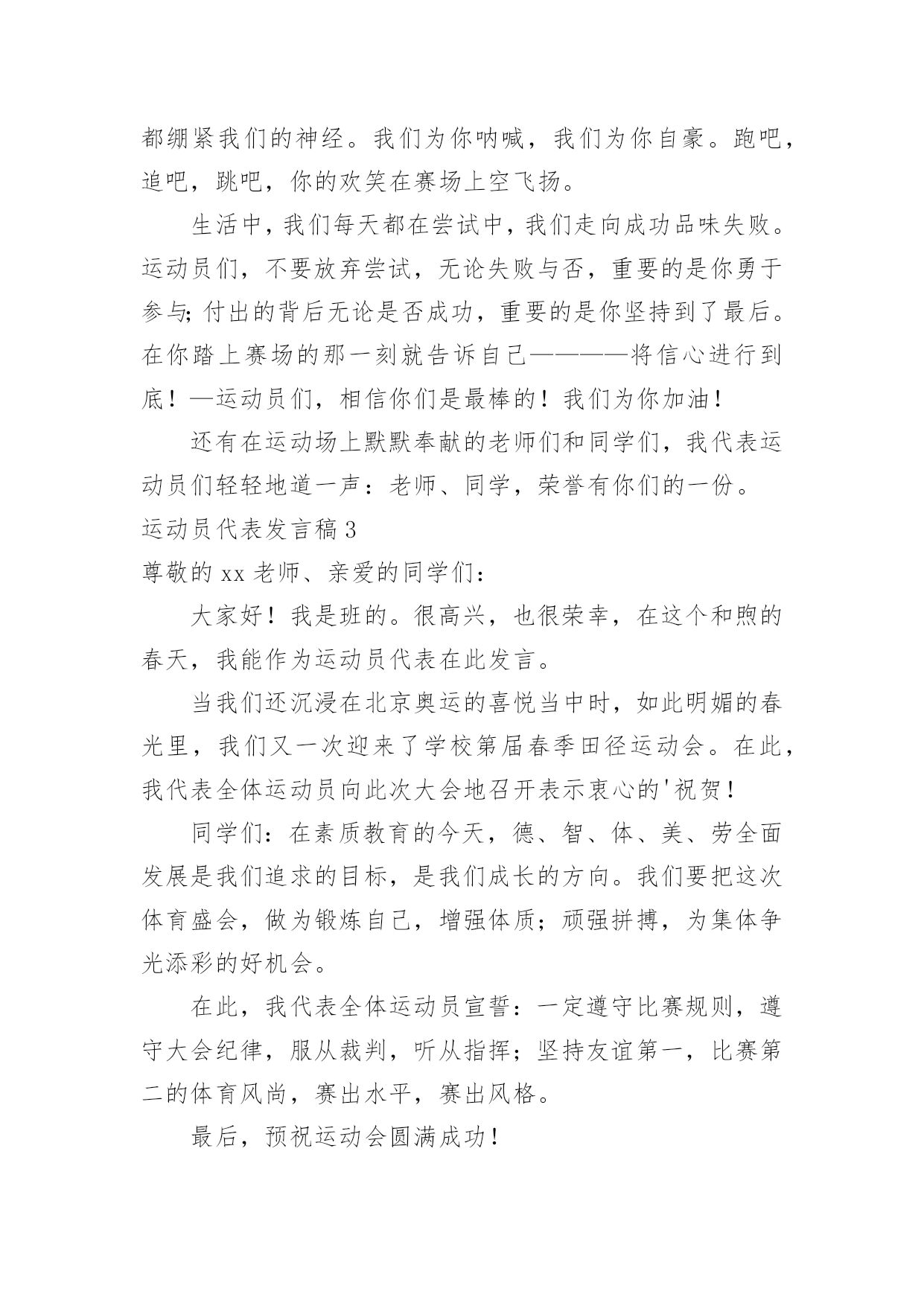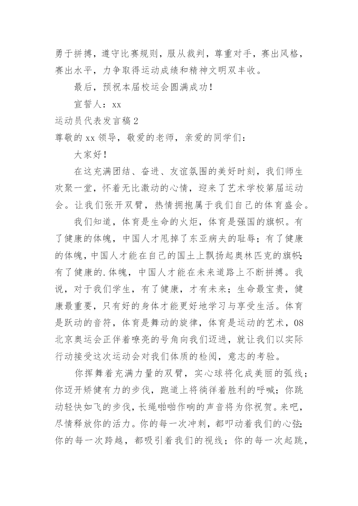 运动员代表发言稿运动员代表发言稿在日常生活和工作中,用到发言稿的地方越来越多,发言稿具有逻辑严密,态度明确,观点鲜明的特点。大家知道发言稿怎么写才正确吗?下面是小编收集整理的运动员代表发言稿,欢迎大家借鉴与参考,希望对大家有所帮助。运动员代表发言稿1尊敬的xx各位老师、各位同学:大家好!今天,我校第15届运动会在我们的热切期盼中,隆重开幕了。在此,我代表全体运动员向校运会的召开表示衷心的祝贺。我们知道,体育是生命的火炬,体育是强国的旗帜。有了健康的体魄,中国人才甩掉了东亚病夫的耻辱;有了健康的体魄,中国人才能在世界的舞台上尽展风采;有了健康的体魄,中国人才能在自己的国土上飘扬起奥林匹克的旗帜;有了健康的体魄,中国人才能在未来道路上不断拼搏。同学们:在素质教育的'今天,德、智、体、美、劳全面发展就是我们追求的目标,就是我们成长的方向。我们要把这次体育盛会,作为锻炼自己,增强体质,培养集体荣誉感的好机会。在此,我代表全体运动员庄严宣誓:努力弘扬奥林匹克更高、更快、更强的精神,不怕困难,团结协作,勇于拼搏,遵守比赛规则,服从裁判,尊重对手,赛出风格,赛出水平,力争取得运动成绩和精神文明双丰收。最后,预祝本届校运会圆满成功!宣誓人:xx运动员代表发言稿2尊敬的xx领导,敬爱的老师,亲爱的同学们:大家好!在这充满团结、奋进、友谊氛围的美好时刻,我们师生欢聚一堂,怀着无比激动的心情,迎来了艺术学校第届运动会。让我们张开双臂,热情拥抱属于我们自己的体育盛会。我们知道,体育是生命的火炬,体育是强国的旗帜。有了健康的体魄,中国人才甩掉了东亚病夫的耻辱;有了健康的体魄,中国人才能在自己的国土上飘扬起奥林匹克的旗帜;有了健康的.体魄,中国人才能在未来道路上不断拼搏。我说,对于我们学生,有了健康,才有未来;生命最宝贵,健康最重要,只有好的身体才能更好地学习与享受生活。体育是跃动的音符,体育是舞动的旋律,体育是运动的艺术,08北京奥运会正伴着嘹亮的号角向我们迈进,就让我们以实际行动接受这次运动会对我们体质的检阅,意志的考验。你挥舞着充满力量的双臂,实心球将化成美丽的弧线;你迈开矫健有力的步伐,跑道上将徜徉着胜利的呼喊;你跳动轻快如飞的步伐,长绳啪啪作响的声音将为你祝贺。来吧,尽情释放你的活力。你的每一次冲刺,都叩动着我们的心弦;你的每一次跨越,都吸引着我们的视线;你的每一次起跳,都绷紧我们的神经。我们为你呐喊,我们为你自豪。跑吧,追吧,跳吧,你的欢笑在赛场上空飞扬。生活中,我们每天都在尝试中,我们走向成功品味失败。运动员们,不要放弃尝试,无论失败与否,重要的是你勇于参与;付出的背后无论是否成功,重要的是你坚持到了最后。在你踏上赛场的那一刻就告诉自己————将信心进行到底!—运动员们,相信你们是最棒的!我们为你加油!还有在运动场上默默奉献的老师们和同学们,我代表运动员们轻轻地道一声:老师、同学,荣誉有你们的一份。运动员代表发言稿3尊敬的xx老师、亲爱的同学们:大家好!我是班的。很高兴,也很荣幸,在这个和煦的春天,我能作为运动员代表在此发言。当我们还沉浸在北京奥运的喜悦当中时,如此明媚的春光里,我们又一次迎来了学校第届春季田径运动会。在此,我代表全体运动员向此次大会地召开表示衷心的'祝贺!同学们:在素质教育的今天,德、智、体、美、劳全面发展是我们追求的目标,是我们成长的方向。我们要把这次体育盛会,做为锻炼自己,增强体质;顽强拼搏,为集体争光添彩的好机会。在此,我代表全体运动员宣誓:一定遵守比赛规则,遵守大会纪律,服从裁判,听从指挥;坚持友谊第一,比赛第二的体育风尚,赛出水平,赛出风格。最后,预祝运动会圆满成功!谢谢大家!