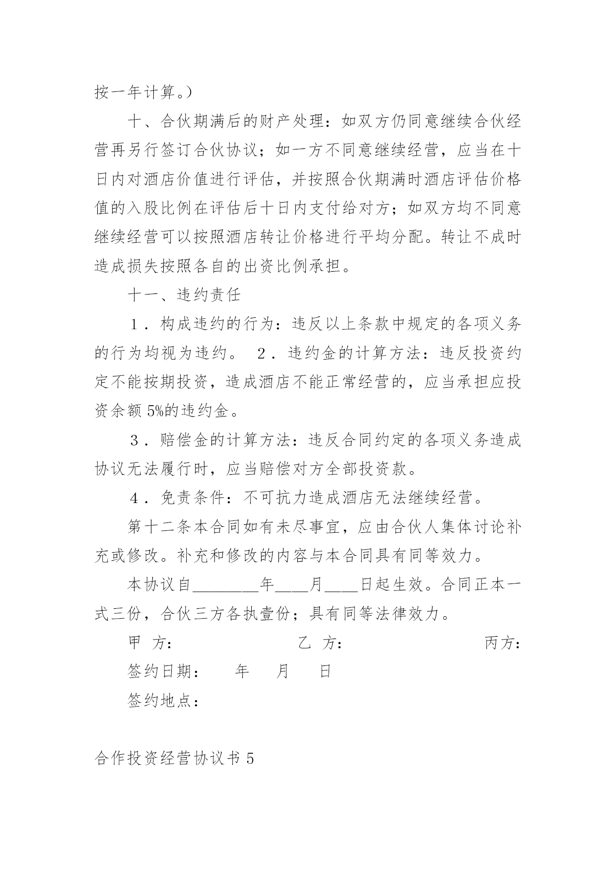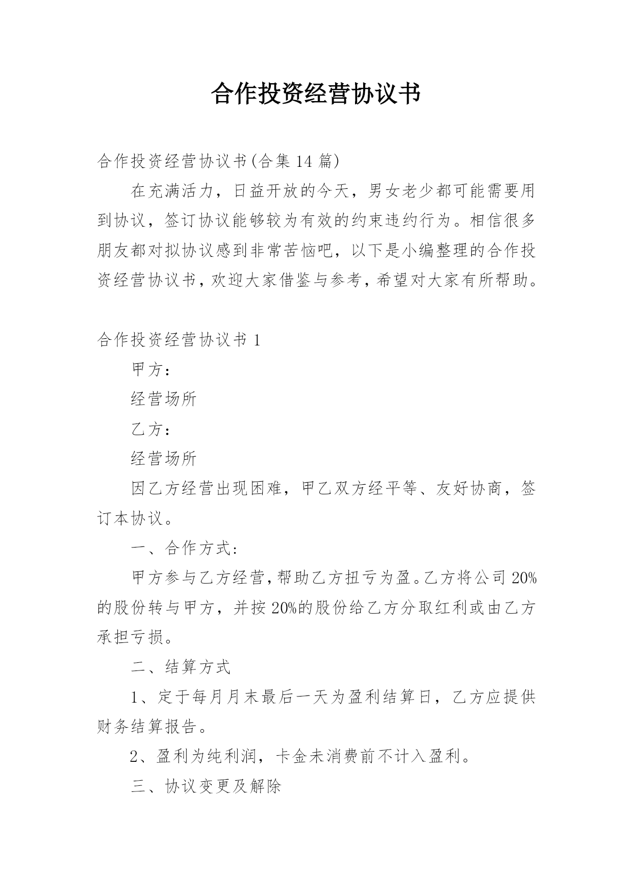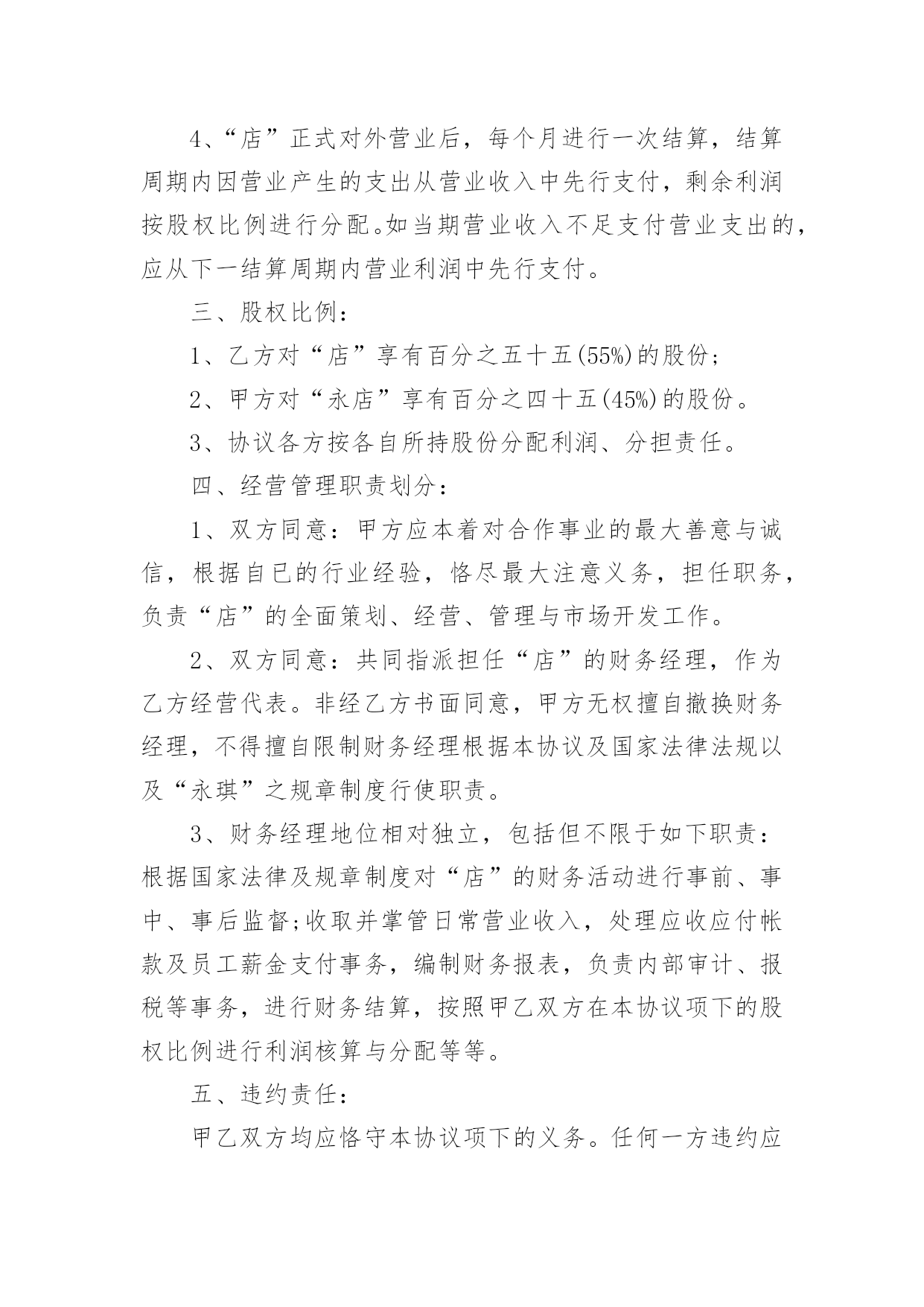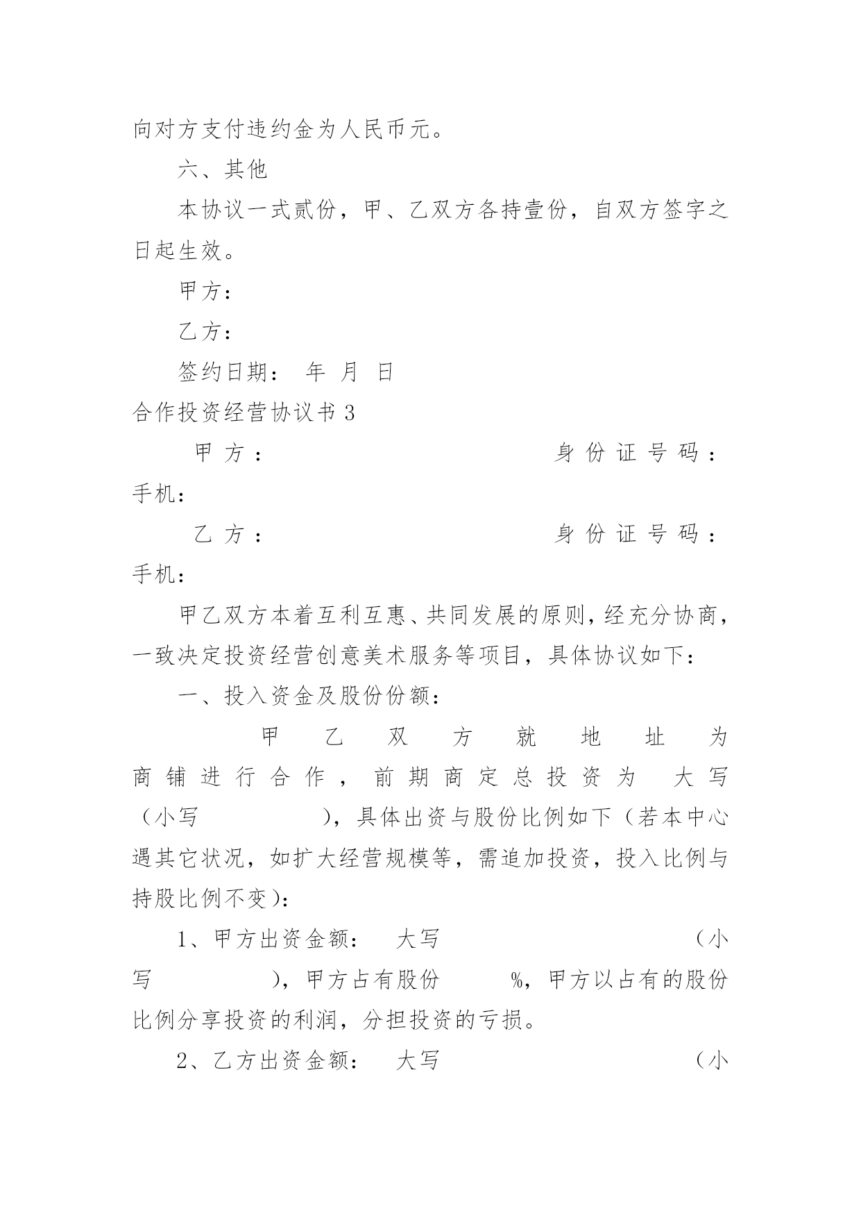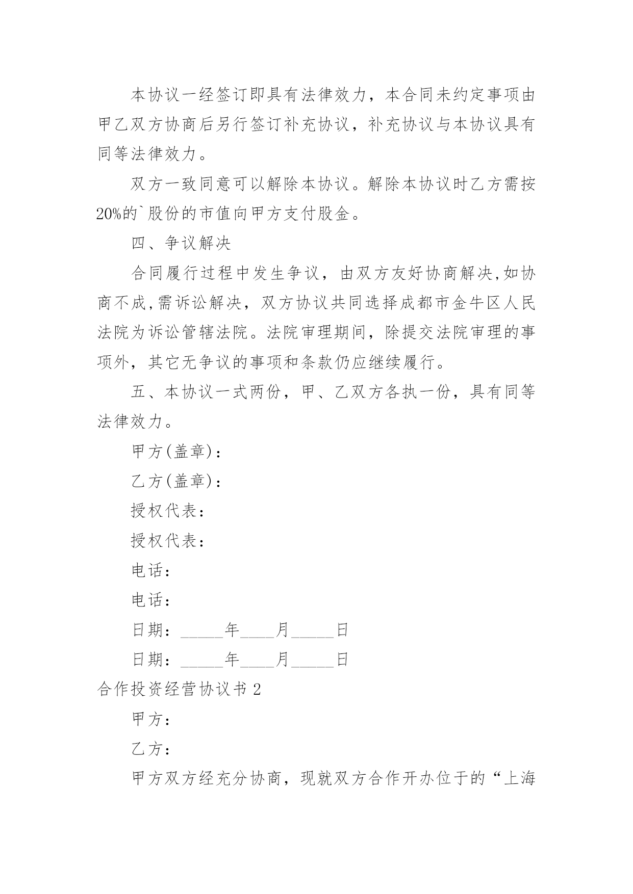 合作投资经营协议书合作投资经营协议书(合集14篇)在充满活力,日益开放的今天,男女老少都可能需要用到协议,签订协议能够较为有效的约束违约行为。相信很多朋友都对拟协议感到非常苦恼吧,以下是小编整理的合作投资经营协议书,欢迎大家借鉴与参考,希望对大家有所帮助。合作投资经营协议书1甲方:经营场所乙方:经营场所因乙方经营出现困难,甲乙双方经平等、友好协商,签订本协议。一、合作方式:甲方参与乙方经营,帮助乙方扭亏为盈。乙方将公司20%的股份转与甲方,并按20%的股份给乙方分取红利或由乙方承担亏损。二、结算方式1、定于每月月末最后一天为盈利结算日,乙方应提供财务结算报告。2、盈利为纯利润,卡金未消费前不计入盈利。三、协议变更及解除本协议一经签订即具有法律效力,本合同未约定事项由甲乙双方协商后另行签订补充协议,补充协议与本协议具有同等法律效力。双方一致同意可以解除本协议。解除本协议时乙方需按20%的`股份的市值向甲方支付股金。四、争议解决合同履行过程中发生争议,由双方友好协商解决,如协商不成,需诉讼解决,双方协议共同选择成都市金牛区人民法院为诉讼管辖法院。法院审理期间,除提交法院审理的事项外,其它无争议的事项和条款仍应继续履行。五、本协议一式两份,甲、乙双方各执一份,具有同等法律效力。甲方(盖章):乙方(盖章):授权代表:授权代表:电话:电话:日期:_____年____月_____日日期:_____年____月_____日合作投资经营协议书2甲方:乙方:甲方双方经充分协商,现就双方合作开办位于的“上海店”(以下简称“店”)的有关事宜达成如下协议,以资遵照履行:一、投资开办事项:1、名称:2、地址:3、经营范围:保健服务,形象设计,(涉及行政许可的,凭许可证经营)。4、合作期限:自年月日起至年月日止。期限届满时,如“店”经营状况正常或良好,任何一方均未书面提出停止合作意向,则视为双方同意继续合作,继续合作期间双方仍应接受本协议约束。二、投资结构及责任分担:1、“店”全部投资资金人民币万元(均由乙方实际投入,用于“店”之门店装修、门面受让、前期房屋租金、押金以及设备采购等。乙方根据“店”的开办进度及甲方通知将前述所需资金交给甲方,则视为乙方在本协议项下的.投资款已实际到位。2、甲方收到乙方投资款后,应出具相应收款凭证,并保证专款专用,不得将乙方投资资金滥用或挪用。3、甲方负责办妥“店”开业手续。包括但不限于如下事务:出面与上海有限公司进行磋商,取得上海有限公司关于“”的名称使用及其“连锁直营管理”的授权许可,进行有关工商、税务登记,进行门店装修,负责承租门面,采购设备,招聘员工等等。4、“店”正式对外营业后,每个月进行一次结算,结算周期内因营业产生的支出从营业收入中先行支付,剩余利润按股权比例进行分配。如当期营业收入不足支付营业支出的,应从下一结算周期内营业利润中先行支付。三、股权比例:1、乙方对“店”享有百分之五十五(55%)的股份;2、甲方对“永店”享有百分之四十五(45%)的股份。3、协议各方按各自所持股份分配利润、分担责任。四、经营管理职责划分:1、双方同意:甲方应本着对合作事业的最大善意与诚信,根据自已的行业经验,恪尽最大注意义务,担任职务,负责“店”的全面策划、经营、管理与市场开发工作。2、双方同意:共同指派担任“店”的财务经理,作为乙方经营代表。非经乙方书面同意,甲方无权擅自撤换财务经理,不得擅自限制财务经理根据本协议及国家法律法规以及“永琪”之规章制度行使职责。3、财务经理地位相对独立,包括但不限于如下职责:根据国家法律及规章制度对“店”的财务活动进行事前、事中、事后监督;收取并掌管日常营业收入,处理应收应付帐款及员工薪金支付事务,编制财务报表,负责内部审计、报税等事务,进行财务结算,按照甲乙双方在本协议项下的股权比例进行利润核算与分配等等。五、违约责任:甲乙双方均应恪守本协议项下的义务。任何一方违约应向对方支付违约金为人民币元。六、其他本协议一式贰份,甲、乙双方各持壹份,自双方签字之日起生效。甲方:乙方:签约日期:年月日合作投资经营协议书3甲方:身份证号码:手机:乙方:身份证号码:手机:甲乙双方本着互利互惠、共同发展的原则,经充分协商,一致决定投资经营创意美术服务等项目,具体协议如下:一、投入资金及股份份额:甲乙双方就地址为商铺进行合作,前期商定总投资为大写(小写),具体出资与股份比例如下(若本中心遇其它状况,如扩大经营规模等,需追加投资,投入比例与持股比例不变):1、甲方出资金额:大写(小写),甲方占有股份%,甲方以占有的股份比例分享投资的利润,分担投资的亏损。2、乙方出资金额:大写(小写),乙方占有股份%,乙方以占有的股份比例分享投资的利润,分担投资的亏损。二、经营管理:1、甲乙双方共同负责本协议中心的财务管理、协助处