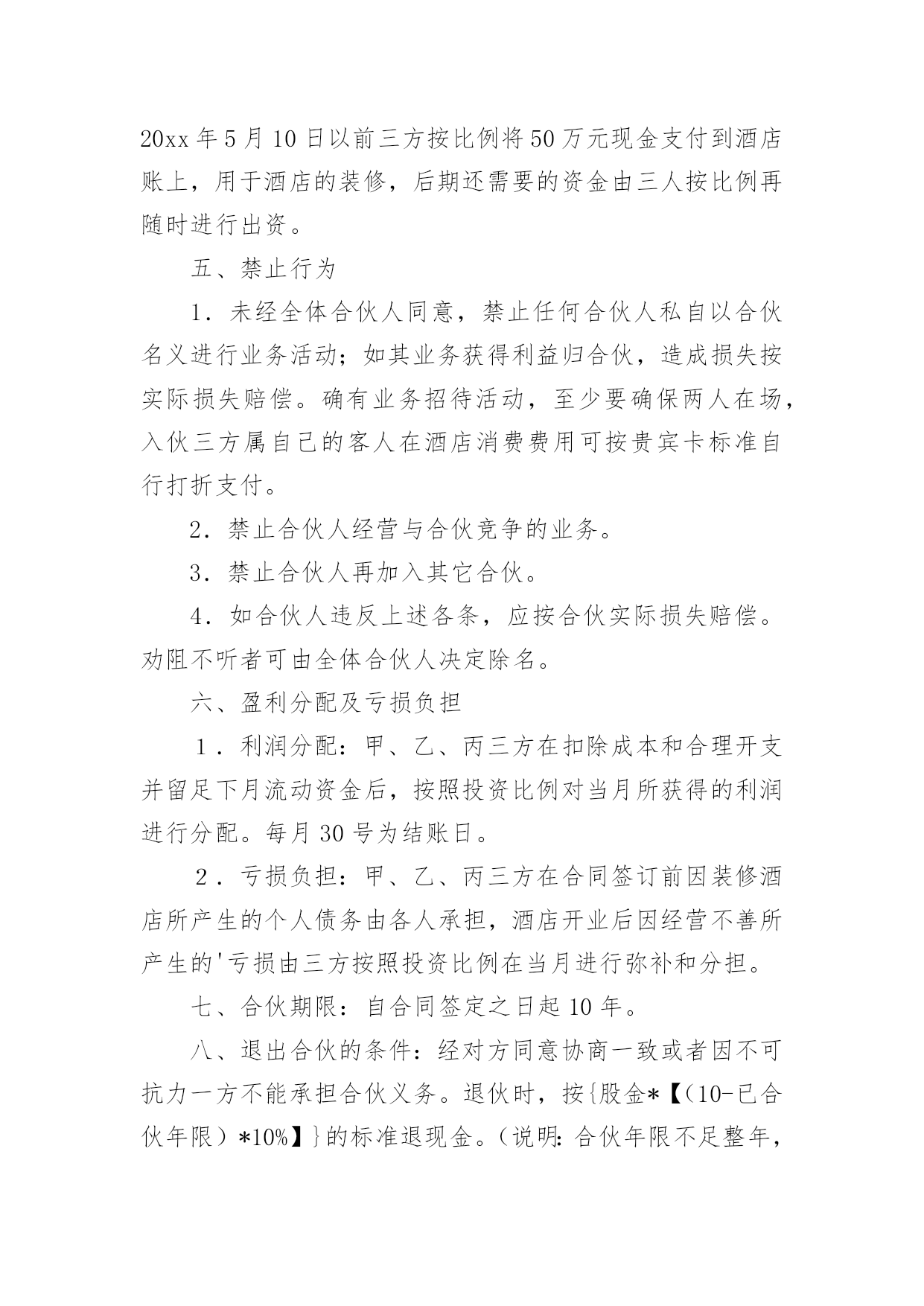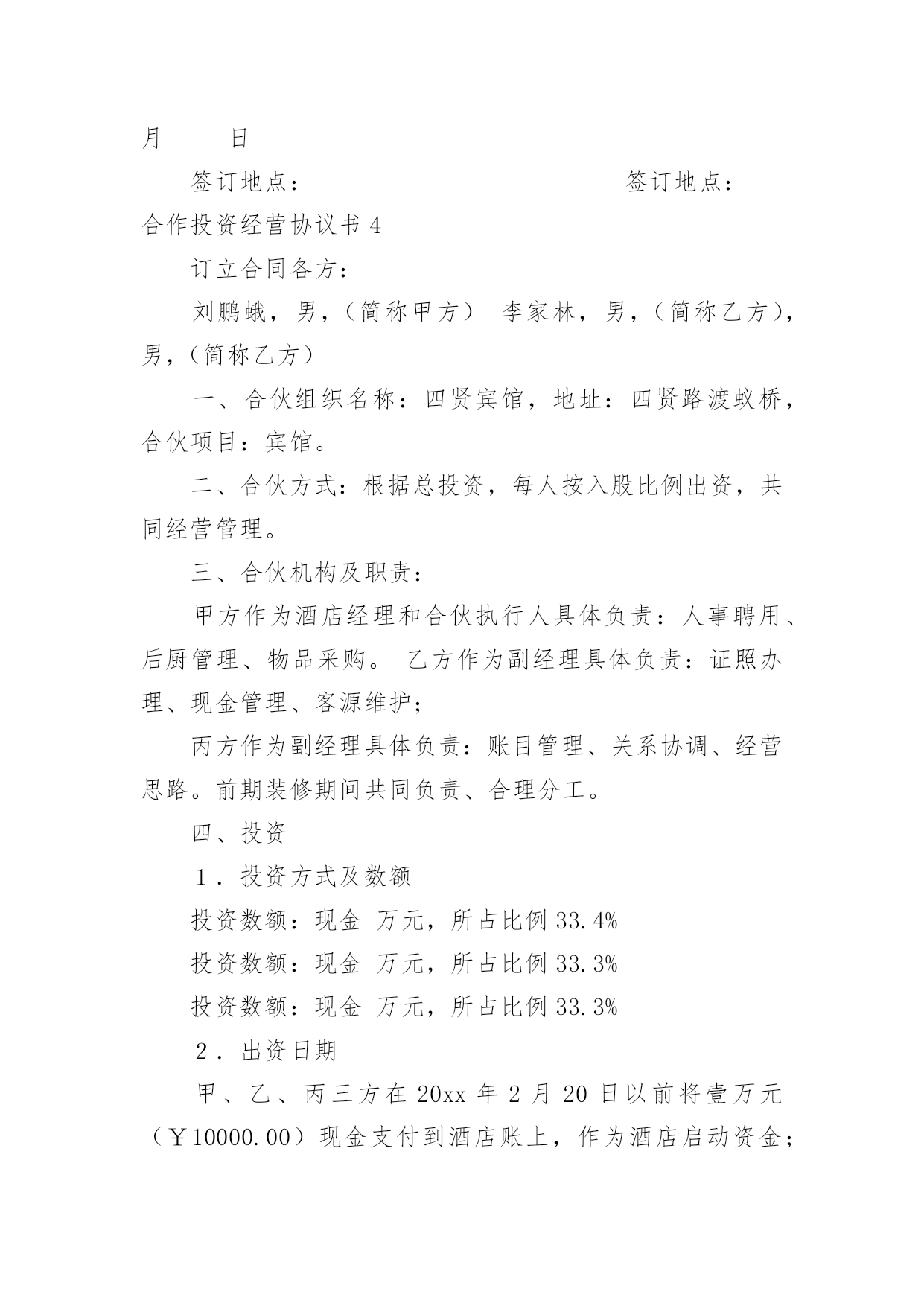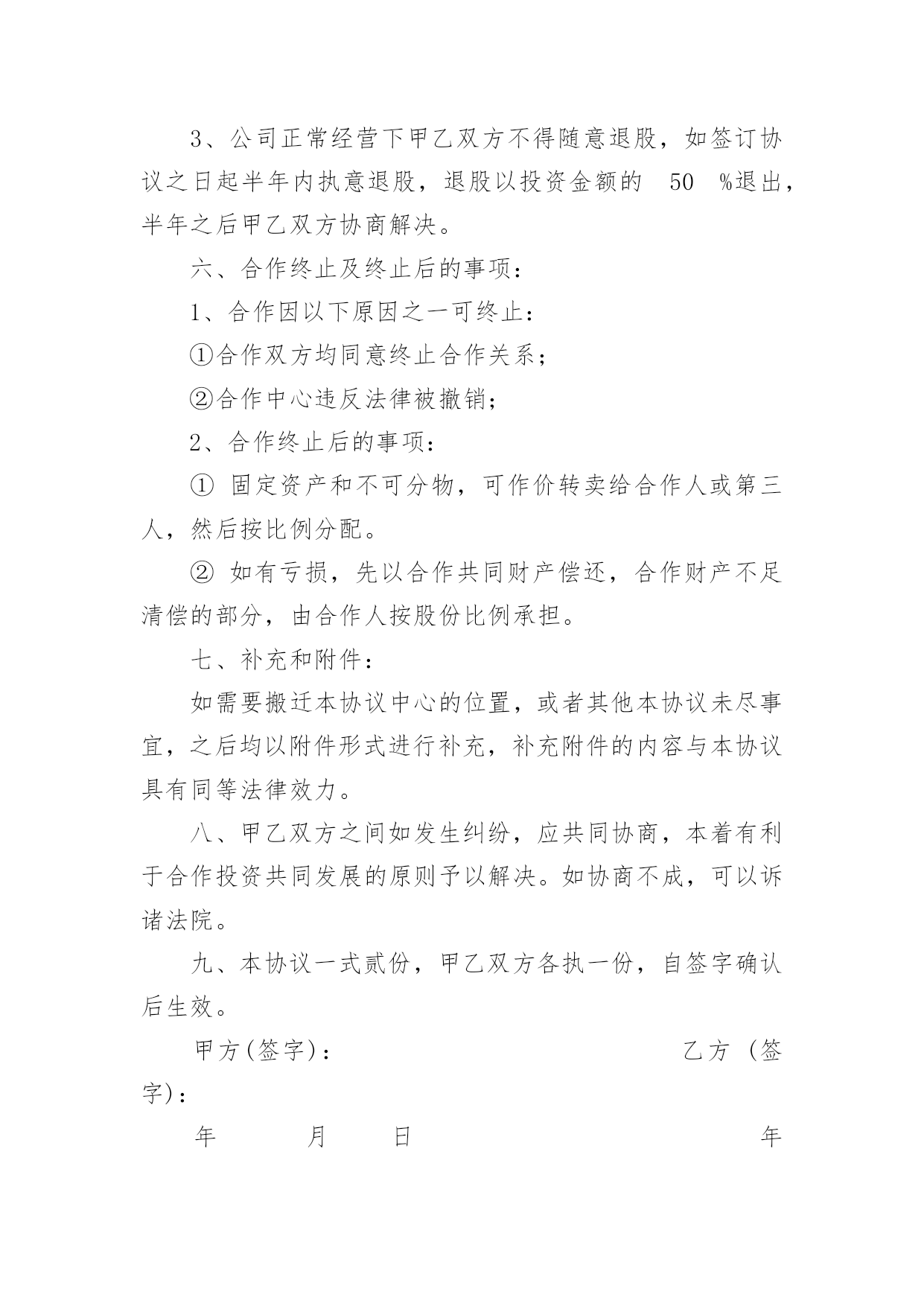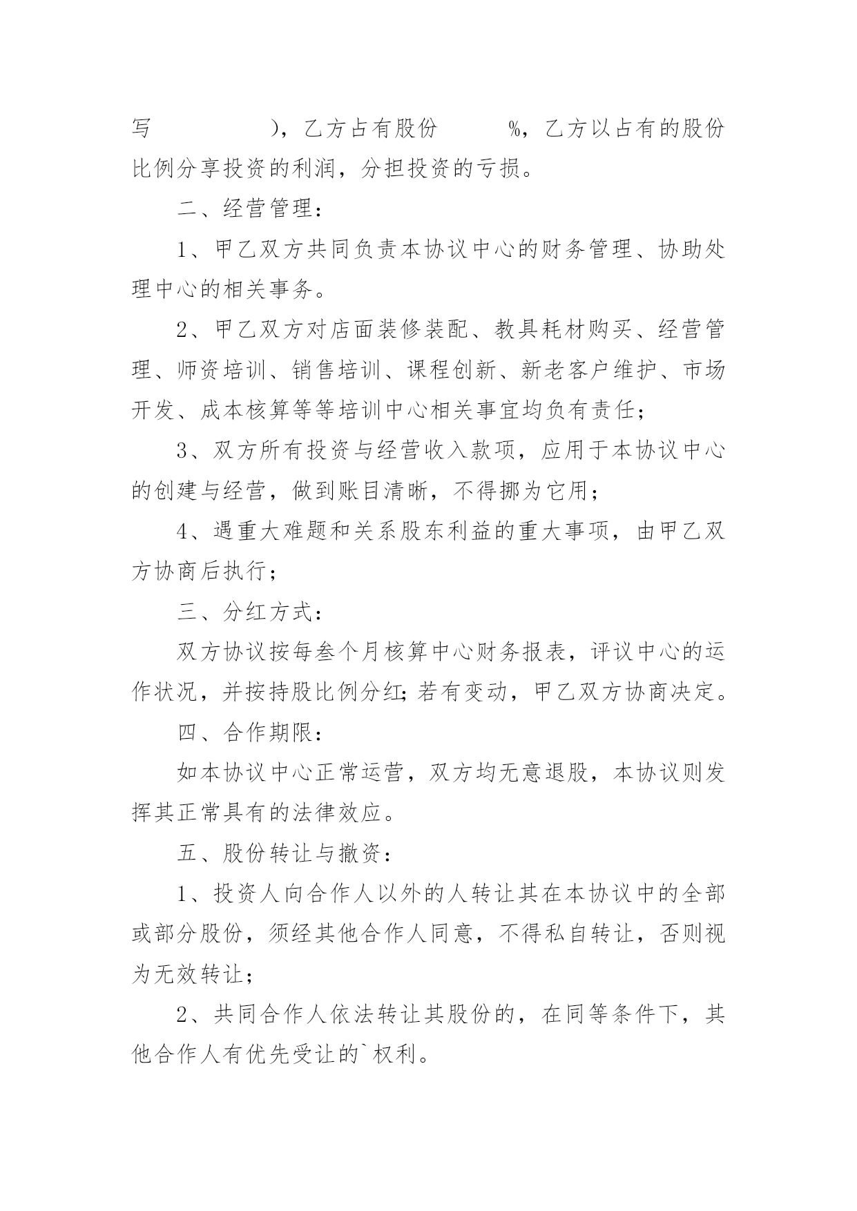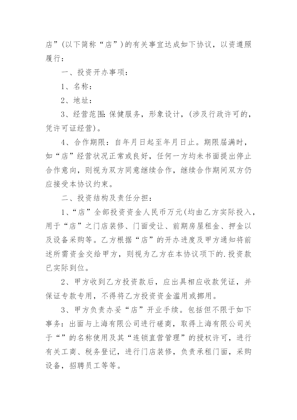 合作投资经营协议书合作投资经营协议书(合集14篇)在充满活力,日益开放的今天,男女老少都可能需要用到协议,签订协议能够较为有效的约束违约行为。相信很多朋友都对拟协议感到非常苦恼吧,以下是小编整理的合作投资经营协议书,欢迎大家借鉴与参考,希望对大家有所帮助。合作投资经营协议书1甲方:经营场所乙方:经营场所因乙方经营出现困难,甲乙双方经平等、友好协商,签订本协议。一、合作方式:甲方参与乙方经营,帮助乙方扭亏为盈。乙方将公司20%的股份转与甲方,并按20%的股份给乙方分取红利或由乙方承担亏损。二、结算方式1、定于每月月末最后一天为盈利结算日,乙方应提供财务结算报告。2、盈利为纯利润,卡金未消费前不计入盈利。三、协议变更及解除本协议一经签订即具有法律效力,本合同未约定事项由甲乙双方协商后另行签订补充协议,补充协议与本协议具有同等法律效力。双方一致同意可以解除本协议。解除本协议时乙方需按20%的`股份的市值向甲方支付股金。四、争议解决合同履行过程中发生争议,由双方友好协商解决,如协商不成,需诉讼解决,双方协议共同选择成都市金牛区人民法院为诉讼管辖法院。法院审理期间,除提交法院审理的事项外,其它无争议的事项和条款仍应继续履行。五、本协议一式两份,甲、乙双方各执一份,具有同等法律效力。甲方(盖章):乙方(盖章):授权代表:授权代表:电话:电话:日期:_____年____月_____日日期:_____年____月_____日合作投资经营协议书2甲方:乙方:甲方双方经充分协商,现就双方合作开办位于的“上海店”(以下简称“店”)的有关事宜达成如下协议,以资遵照履行:一、投资开办事项:1、名称:2、地址:3、经营范围:保健服务,形象设计,(涉及行政许可的,凭许可证经营)。4、合作期限:自年月日起至年月日止。期限届满时,如“店”经营状况正常或良好,任何一方均未书面提出停止合作意向,则视为双方同意继续合作,继续合作期间双方仍应接受本协议约束。二、投资结构及责任分担:1、“店”全部投资资金人民币万元(均由乙方实际投入,用于“店”之门店装修、门面受让、前期房屋租金、押金以及设备采购等。乙方根据“店”的开办进度及甲方通知将前述所需资金交给甲方,则视为乙方在本协议项下的.投资款已实际到位。2、甲方收到乙方投资款后,应出具相应收款凭证,并保证专款专用,不得将乙方投资资金滥用或挪用。3、甲方负责办妥“店”开业手续。包括但不限于如下事务:出面与上海有限公司进行磋商,取得上海有限公司关于“”的名称使用及其“连锁直营管理”的授权许可,进行有关工商、税务登记,进行门店装修,负责承租门面,采购设备,招聘员工等等。4、“店”正式对外营业后,每个月进行一次结算,结算周期内因营业产生的支出从营业收入中先行支付,剩余利润按股权比例进行分配。如当期营业收入不足支付营业支出的,应从下一结算周期内营业利润中先行支付。三、股权比例:1、乙方对“店”享有百分之五十五(55%)的股份;2、甲方对“永店”享有百分之四十五(45%)的股份。3、协议各方按各自所持股份分配利润、分担责任。四、经营管理职责划分:1、双方同意:甲方应本着对合作事业的最大善意与诚信,根据自已的行业经验,恪尽最大注意义务,担任职务,负责“店”的全面策划、经营、管理与市场开发工作。2、双方同意:共同指派担任“店”的财务经理,作为乙方经营代表。非经乙方书面同意,甲方无权擅自撤换财务经理,不得擅自限制财务经理根据本协议及国家法律法规以及“永琪”之规章制度行使职责。3、财务经理地位相对独立,包括但不限于如下职责:根据国家法律及规章制度对“店”的财务活动进行事前、事中、事后监督;收取并掌管日常营业收入,处理应收应付帐款及员工薪金支付事务,编制财务报表,负责内部审计、报税等事务,进行财务结算,按照甲乙双方在本协议项下的股权比例进行利润核算与分配等等。五、违约责任:甲乙双方均应恪守本协议项下的义务。任何一方违约应向对方支付违约金为人民币元。六、其他本协议一式贰份,甲、乙双方各持壹份,自双方签字之日起生效。甲方:乙方:签约日期:年月日合作投资经营协议书3甲方:身份证号码:手机:乙方:身份证号码:手机:甲乙双方本着互利互惠、共同发展的原则,经充分协商,一致决定投资经营创意美术服务等项目,具体协议如下:一、投入资金及股份份额:甲乙双方就地址为商铺进行合作,前期商定总投资为大写(小写),具体出资与股份比例如下(若本中心遇其它状况,如扩大经营规模等,需追加投资,投入比例与持股比例不变):1、甲方出资金额:大写(小写),甲方占有股份%,甲方以占有的股份比例分享投资的利润,分担投资的亏损。2、乙方出资金额:大写(小写),乙方占有股份%,乙方以占有的股份比例分享投资的利润,分担投资的亏损。二、经营管理:1、甲乙双方共同负责本协议中心的财务管理、协助处
