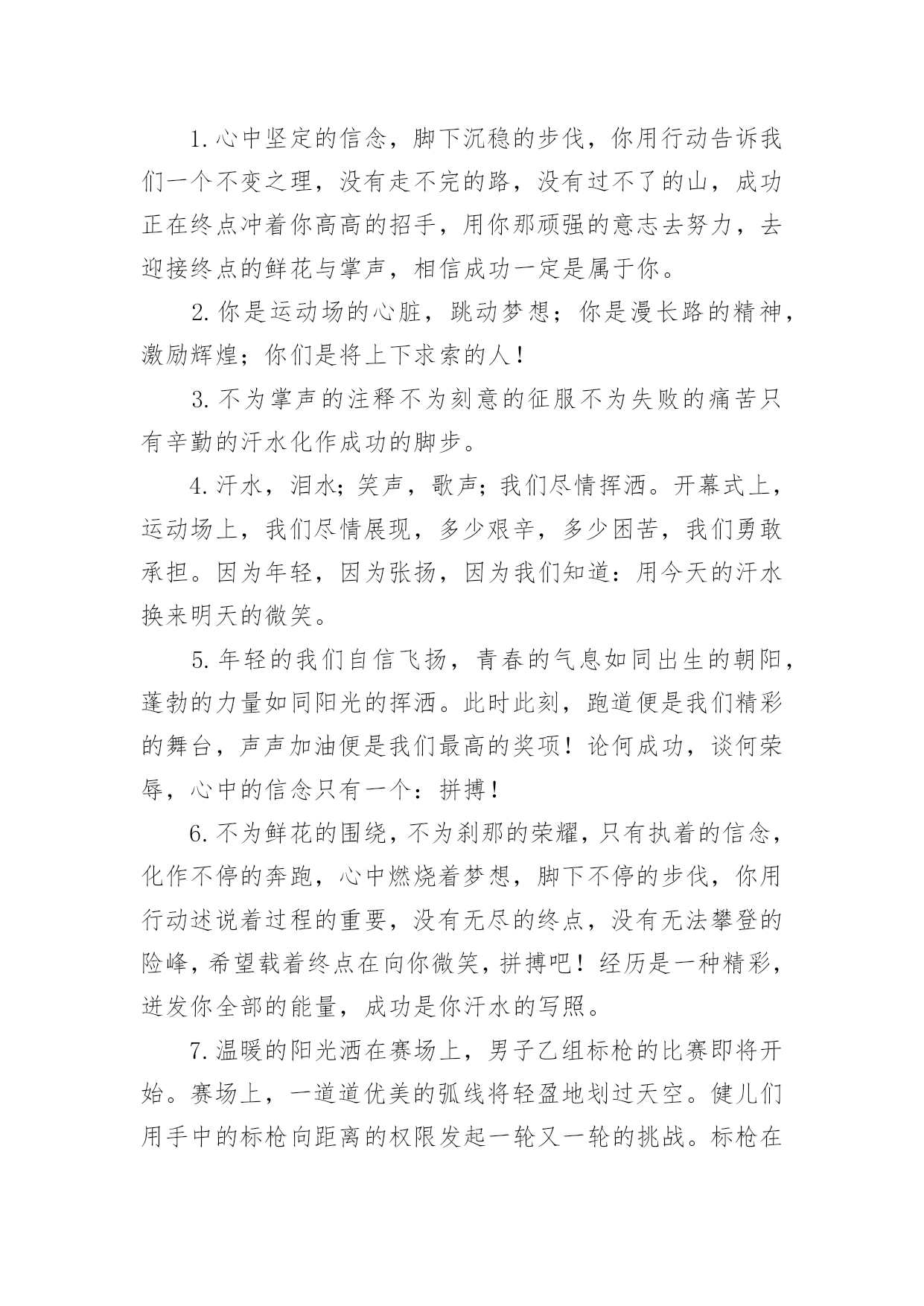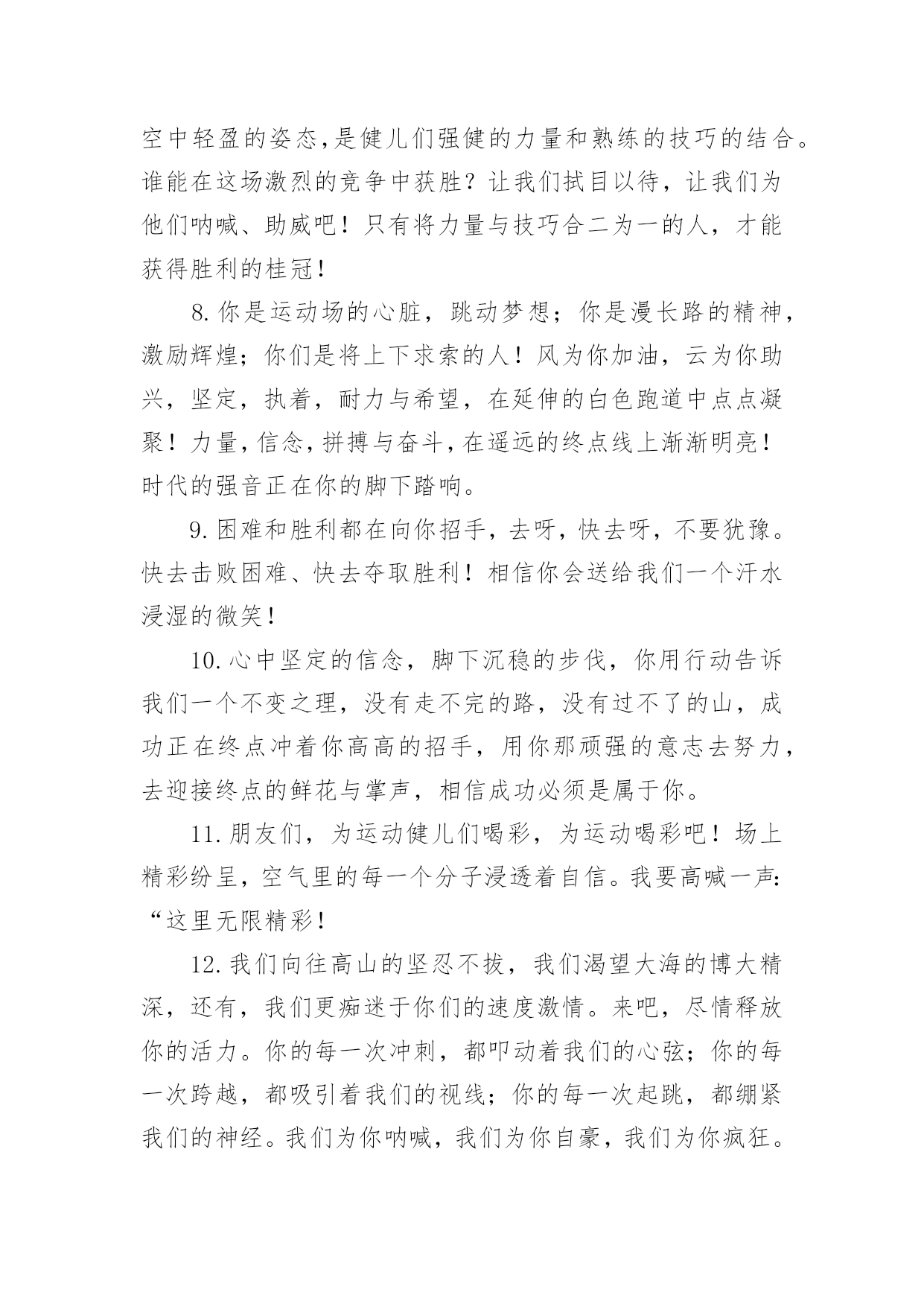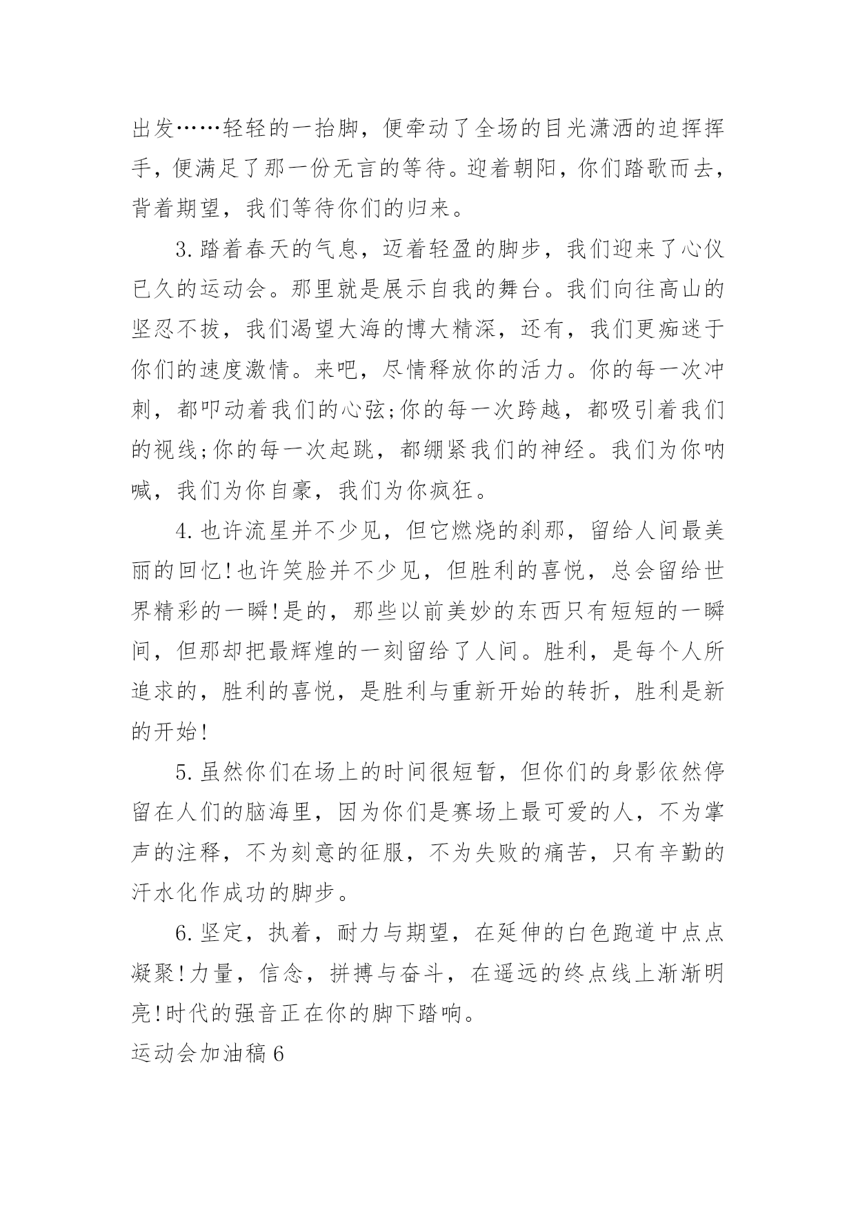 运动会加油稿运动会加油稿【热门】在日新月异的现代社会中,我们都跟加油稿有着直接或间接的联系,加油稿可以增添对方必胜的勇气和信心。相信写加油稿是一个让许多人都头痛的问题,下面是小编为大家收集的运动会加油稿,仅供参考,大家一起来看看吧。运动会加油稿11、漫漫长路,你愿一人独撑,忍受着孤独与寂寞,承受着体力与精神的压迫,只任汗水溶于泪水,可脚步却从不停歇。好样的,纵然得不了桂冠,可坚持的你,定会赢得最终的掌声。2、年轻的我们自信飞扬,青春的气息如同初升的朝阳,蓬勃的力量如同阳光的挥洒。此时此刻,跑道便是我们精彩的舞台,声声加油便是我们的奖项!论何成功,谈何荣辱,心中的信念仅有一个:拼搏!萧瑟的秋风,挡不住你们破竹的锐气。3、踏上跑道,是一种选择。离开起点,是一种勇气。驰骋赛场,是一种胜利。运动健将们,用你的实力,用你的精神,去开拓出,一片属于你的长跑天地!一百米是个风狂的世界!4、亲爱的班健儿们,你们要充满自信。比赛中没有挡风的墙,没有遮风的伞,也没有撑船的帆,更没有拉船的纤。事在人为,人定胜天。原你们养精蓄锐,对充满爱意的世界说:“我自信,我拼搏,我会赢。5、带给运动员的是信心,是勇气,是誓夺第一的决心和毅力。几句呐喊,几束鲜花,加油!6、阵阵锣鼓,片片掌声,带给运动员的是满足,是感激,是成功后的喜悦和快意。7、漫漫长路,你愿一人独撑,忍受着孤独与寂寞,承受着体力与精神的压迫,只任汗水溶于泪水,可脚步却从不停歇。好样的,纵然得不了桂冠,可坚持的你,定会赢得最后的掌声。8、场上英姿显自豪,脚下步伐在飞奔。你们是骄傲。你们是自豪,跑道因你幻彩,面对红色跑道,你们挥洒自如,不惧一切冲向终点。9、枪声响起,你们的征程开始在脚下,你们飞逝在跑道上的背景,将迎来只属于你们的掌声。10、不为鲜花的围绕,不为刹那的荣耀,仅有执着的信念,化作不停的奔跑,心中燃烧着梦想,脚下不停的步伐!11、你们挥舞着充满力量的双臂,看着实心球化成美丽的弧线,我着实在心里佩服你们,你们抛出了自我的水平。12、看!运动场上那一幕幕,无论是哭是笑,是喜是悲,其中都融入了他们的汗水辛劳。他们是真正的矫健者,是运动场上的骄儿,更是我们心中的英雄。加油吧!英雄们!每一份辛劳都有一份收获,每一次的痛苦都是快乐的开始,每一声呐喊都是力量的呼唤运动场上的健儿,掌声属于你们,鲜花属于你们,成功也是属于你们!13、踏着秋天的气息,迈着轻盈的脚步,我们迎来了心仪已久的运动会。那里就是展示自我的舞台。来吧,尽情释放你的活力。你的每一次冲刺,都叩动着我们的心弦;你的每一次跨越,都吸引着我们的视线;你的每一次起跳,都绷紧我们的神经。我们为你呐喊,我们为你自豪,我们为你疯狂。加油,班的你们永远是最棒的的!14、你和红色的地面有个约定,那上方,总有你奔跑的身影;你与绿色的草坪有个约定,那上方,浸着你辛劳的汗渍。你与我们有个约定,说你必须要赢,也必须会赢。你喊着跑着,迈开大步,跨过世纪。我们相信你,xx。15、赛场上,一道道优美的弧线将轻盈地划过天空。健儿们用手中的标枪向距离的权限发起一轮又一轮的挑战。标枪在空中轻盈的姿态,是健儿们强健的力量和熟练的技巧的结合。谁能在这场激烈的竞争中获胜?让我们拭目以待,让我们为他们呐喊助威吧!运动会加油稿21.你是运动场的心脏,跳动梦想;你是漫长路的精神,激励辉煌;你们是将上下求索的人!风为你加油,云为你助兴,坚定,执着,耐力与希望,在延伸的白色跑道中点点凝聚!力量,信念,拼搏与奋斗,在遥远的终点线上渐渐明亮!时代的强音正在你的脚下踏响。深深的呼吸,等待你的是艰难的xx。相信胜利会属于你们。但在这征途上,需要你用勇敢的心去面对。我们在为你加油,你是否听到了我们发自心中的呐喊?困难和胜利都在向你招手,去呀,快去呀,不要犹豫。快去击败困难、快去夺取胜利!相信你会送给我们一个汗水浸湿的微笑!x月的阳光,x月的朝霞,一个灿烂明媚的x月,一个丰收吉祥的x月,欢歌笑语,彩旗飘飘,运动会开幕了,内心的喜悦无法用语言来表达,千万个美丽的词汇也无法描述,昔日的努力要在今天得到考验,来吧!让今天的成功谱写新的未来。2.泰戈尔在诗中说,天空没有翅膀的影子,但我已飞过;艾青对朋友说,也许有人到达不了彼岸,但我们共同拥有大海。也许你们没有显赫的成绩,但运动场上留下了你们的足迹。也许你们没有奖品,但我们心中留下了你们拼搏的身影。所有的努力都是为了迎接这一刹那,所有的拼搏都是为了这一声令下。3.广阔的绿茵场,是为你们搭建的舞台。张扬吧,年轻的心,我们将为你永远喝彩!泰戈尔在诗中说,天空没有翅膀的影子,但我已飞过;艾青对朋友说,也许有人到达不了彼岸,但我们共同拥有大海。也许你们没有显赫的成绩,但运动场上留下了你们的足迹。也许你们没有奖品,但我们心中留下了你们拼搏的身影。所有的努力都是为了迎接
