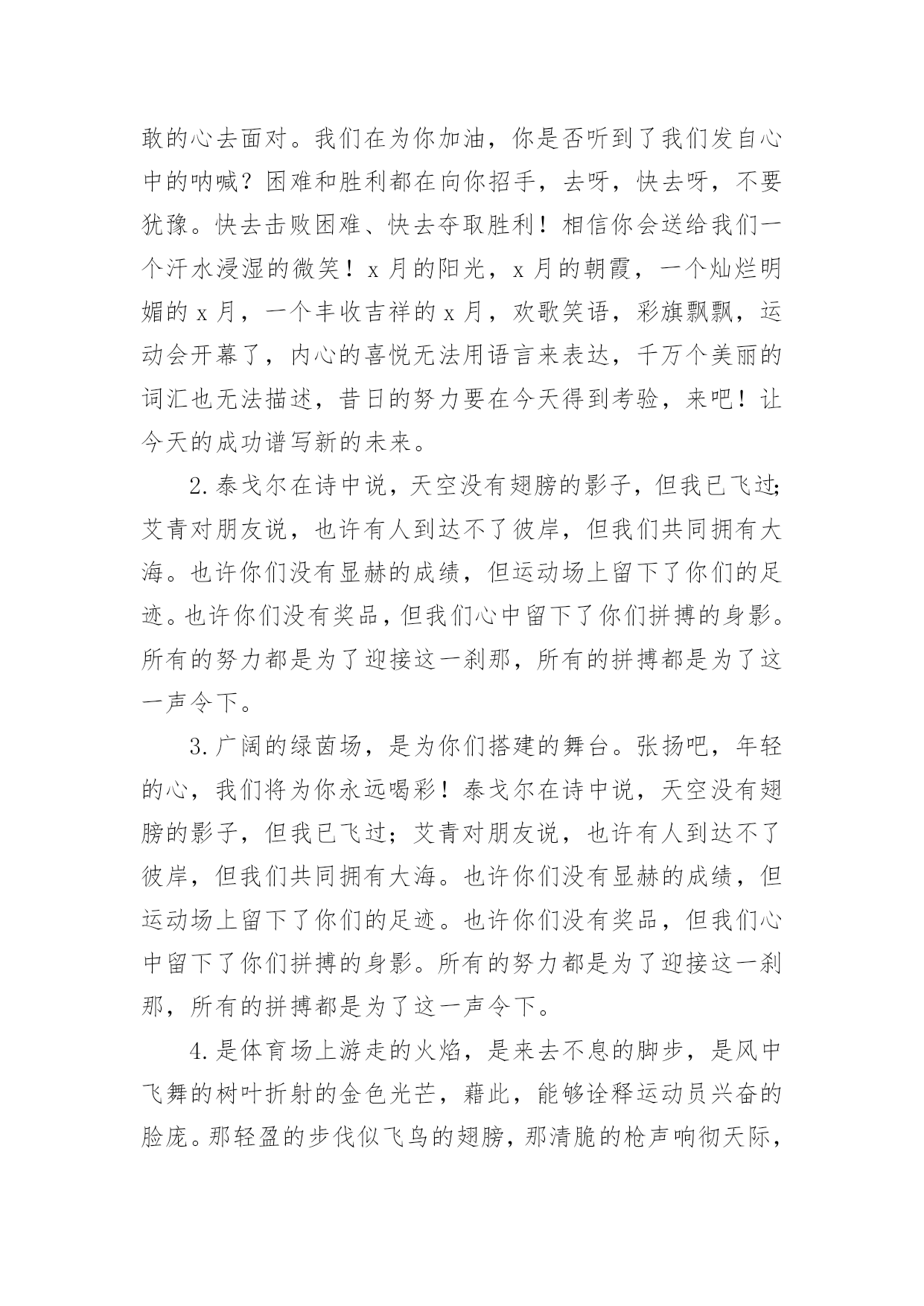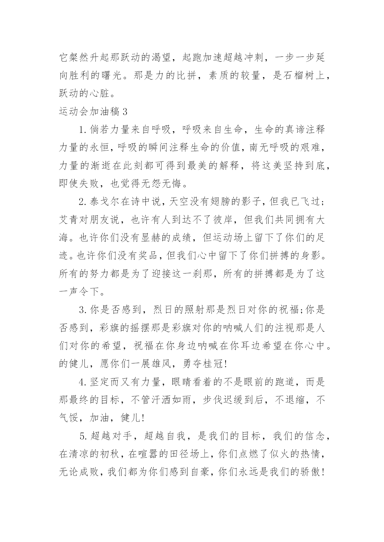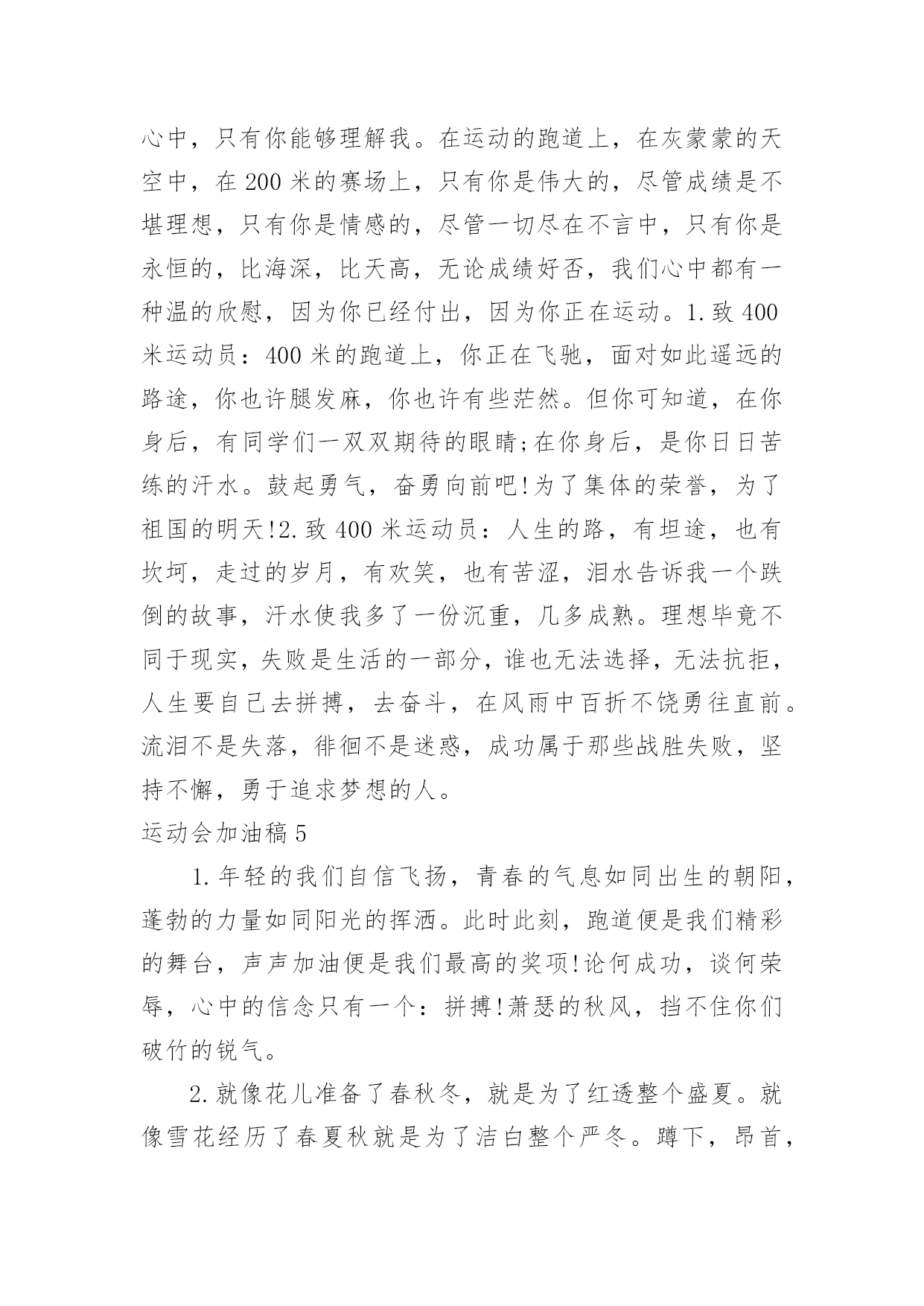 运动会加油稿运动会加油稿【热门】在日新月异的现代社会中,我们都跟加油稿有着直接或间接的联系,加油稿可以增添对方必胜的勇气和信心。相信写加油稿是一个让许多人都头痛的问题,下面是小编为大家收集的运动会加油稿,仅供参考,大家一起来看看吧。运动会加油稿11、漫漫长路,你愿一人独撑,忍受着孤独与寂寞,承受着体力与精神的压迫,只任汗水溶于泪水,可脚步却从不停歇。好样的,纵然得不了桂冠,可坚持的你,定会赢得最终的掌声。2、年轻的我们自信飞扬,青春的气息如同初升的朝阳,蓬勃的力量如同阳光的挥洒。此时此刻,跑道便是我们精彩的舞台,声声加油便是我们的奖项!论何成功,谈何荣辱,心中的信念仅有一个:拼搏!萧瑟的秋风,挡不住你们破竹的锐气。3、踏上跑道,是一种选择。离开起点,是一种勇气。驰骋赛场,是一种胜利。运动健将们,用你的实力,用你的精神,去开拓出,一片属于你的长跑天地!一百米是个风狂的世界!4、亲爱的班健儿们,你们要充满自信。比赛中没有挡风的墙,没有遮风的伞,也没有撑船的帆,更没有拉船的纤。事在人为,人定胜天。原你们养精蓄锐,对充满爱意的世界说:“我自信,我拼搏,我会赢。5、带给运动员的是信心,是勇气,是誓夺第一的决心和毅力。几句呐喊,几束鲜花,加油!6、阵阵锣鼓,片片掌声,带给运动员的是满足,是感激,是成功后的喜悦和快意。7、漫漫长路,你愿一人独撑,忍受着孤独与寂寞,承受着体力与精神的压迫,只任汗水溶于泪水,可脚步却从不停歇。好样的,纵然得不了桂冠,可坚持的你,定会赢得最后的掌声。8、场上英姿显自豪,脚下步伐在飞奔。你们是骄傲。你们是自豪,跑道因你幻彩,面对红色跑道,你们挥洒自如,不惧一切冲向终点。9、枪声响起,你们的征程开始在脚下,你们飞逝在跑道上的背景,将迎来只属于你们的掌声。10、不为鲜花的围绕,不为刹那的荣耀,仅有执着的信念,化作不停的奔跑,心中燃烧着梦想,脚下不停的步伐!11、你们挥舞着充满力量的双臂,看着实心球化成美丽的弧线,我着实在心里佩服你们,你们抛出了自我的水平。12、看!运动场上那一幕幕,无论是哭是笑,是喜是悲,其中都融入了他们的汗水辛劳。他们是真正的矫健者,是运动场上的骄儿,更是我们心中的英雄。加油吧!英雄们!每一份辛劳都有一份收获,每一次的痛苦都是快乐的开始,每一声呐喊都是力量的呼唤运动场上的健儿,掌声属于你们,鲜花属于你们,成功也是属于你们!13、踏着秋天的气息,迈着轻盈的脚步,我们迎来了心仪已久的运动会。那里就是展示自我的舞台。来吧,尽情释放你的活力。你的每一次冲刺,都叩动着我们的心弦;你的每一次跨越,都吸引着我们的视线;你的每一次起跳,都绷紧我们的神经。我们为你呐喊,我们为你自豪,我们为你疯狂。加油,班的你们永远是最棒的的!14、你和红色的地面有个约定,那上方,总有你奔跑的身影;你与绿色的草坪有个约定,那上方,浸着你辛劳的汗渍。你与我们有个约定,说你必须要赢,也必须会赢。你喊着跑着,迈开大步,跨过世纪。我们相信你,xx。15、赛场上,一道道优美的弧线将轻盈地划过天空。健儿们用手中的标枪向距离的权限发起一轮又一轮的挑战。标枪在空中轻盈的姿态,是健儿们强健的力量和熟练的技巧的结合。谁能在这场激烈的竞争中获胜?让我们拭目以待,让我们为他们呐喊助威吧!运动会加油稿21.你是运动场的心脏,跳动梦想;你是漫长路的精神,激励辉煌;你们是将上下求索的人!风为你加油,云为你助兴,坚定,执着,耐力与希望,在延伸的白色跑道中点点凝聚!力量,信念,拼搏与奋斗,在遥远的终点线上渐渐明亮!时代的强音正在你的脚下踏响。深深的呼吸,等待你的是艰难的xx。相信胜利会属于你们。但在这征途上,需要你用勇敢的心去面对。我们在为你加油,你是否听到了我们发自心中的呐喊?困难和胜利都在向你招手,去呀,快去呀,不要犹豫。快去击败困难、快去夺取胜利!相信你会送给我们一个汗水浸湿的微笑!x月的阳光,x月的朝霞,一个灿烂明媚的x月,一个丰收吉祥的x月,欢歌笑语,彩旗飘飘,运动会开幕了,内心的喜悦无法用语言来表达,千万个美丽的词汇也无法描述,昔日的努力要在今天得到考验,来吧!让今天的成功谱写新的未来。2.泰戈尔在诗中说,天空没有翅膀的影子,但我已飞过;艾青对朋友说,也许有人到达不了彼岸,但我们共同拥有大海。也许你们没有显赫的成绩,但运动场上留下了你们的足迹。也许你们没有奖品,但我们心中留下了你们拼搏的身影。所有的努力都是为了迎接这一刹那,所有的拼搏都是为了这一声令下。3.广阔的绿茵场,是为你们搭建的舞台。张扬吧,年轻的心,我们将为你永远喝彩!泰戈尔在诗中说,天空没有翅膀的影子,但我已飞过;艾青对朋友说,也许有人到达不了彼岸,但我们共同拥有大海。也许你们没有显赫的成绩,但运动场上留下了你们的足迹。也许你们没有奖品,但我们心中留下了你们拼搏的身影。所有的努力都是为了迎接