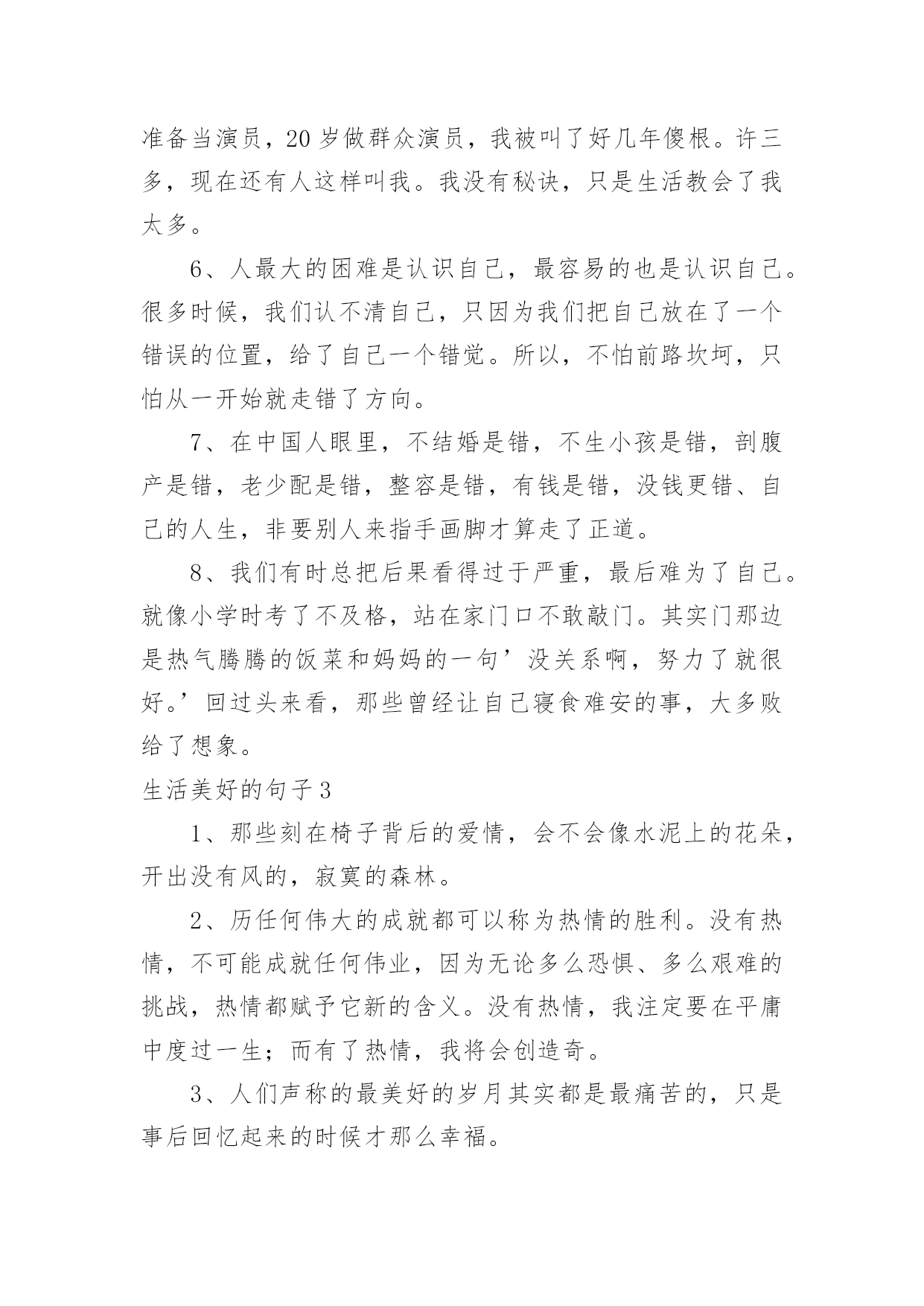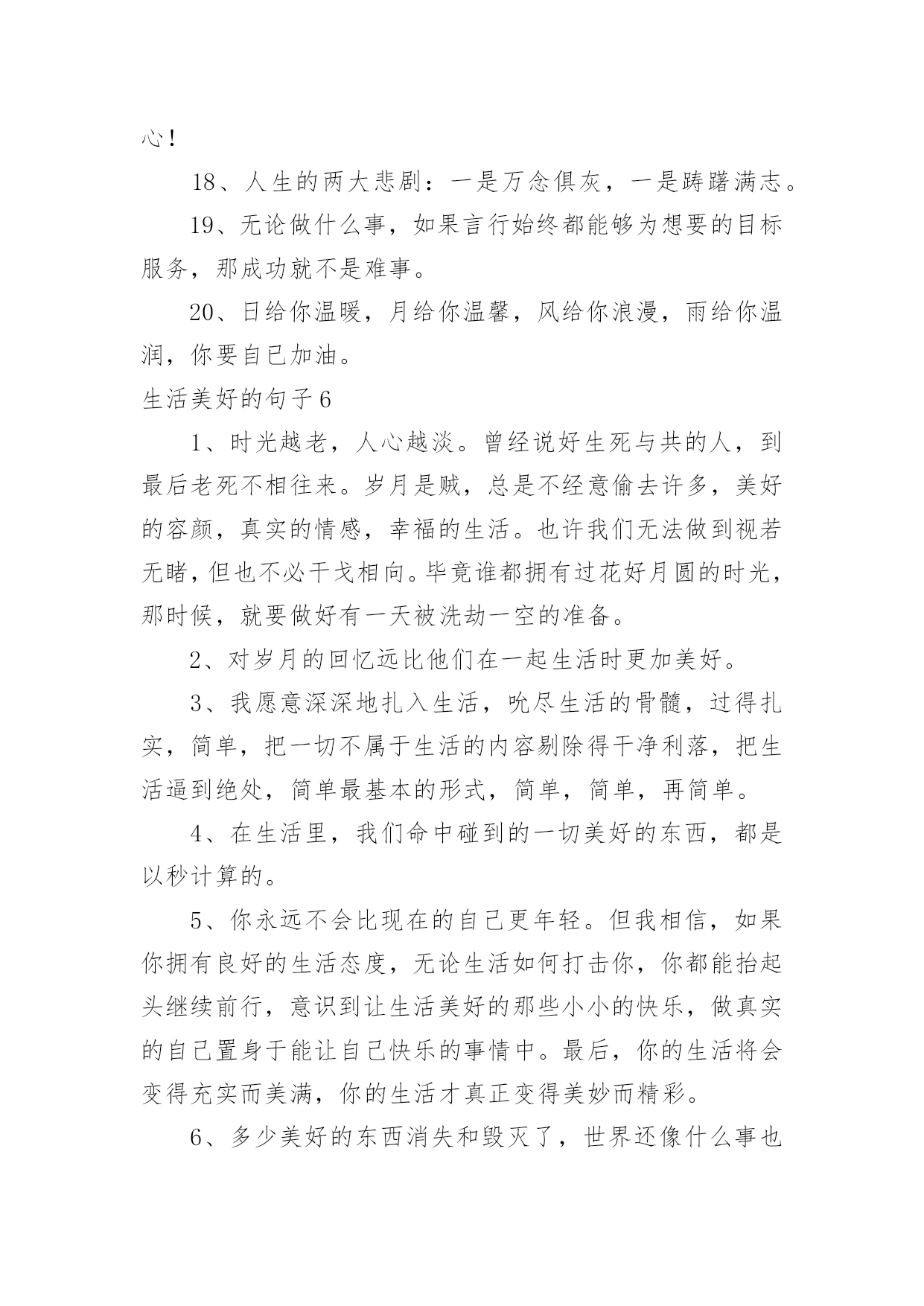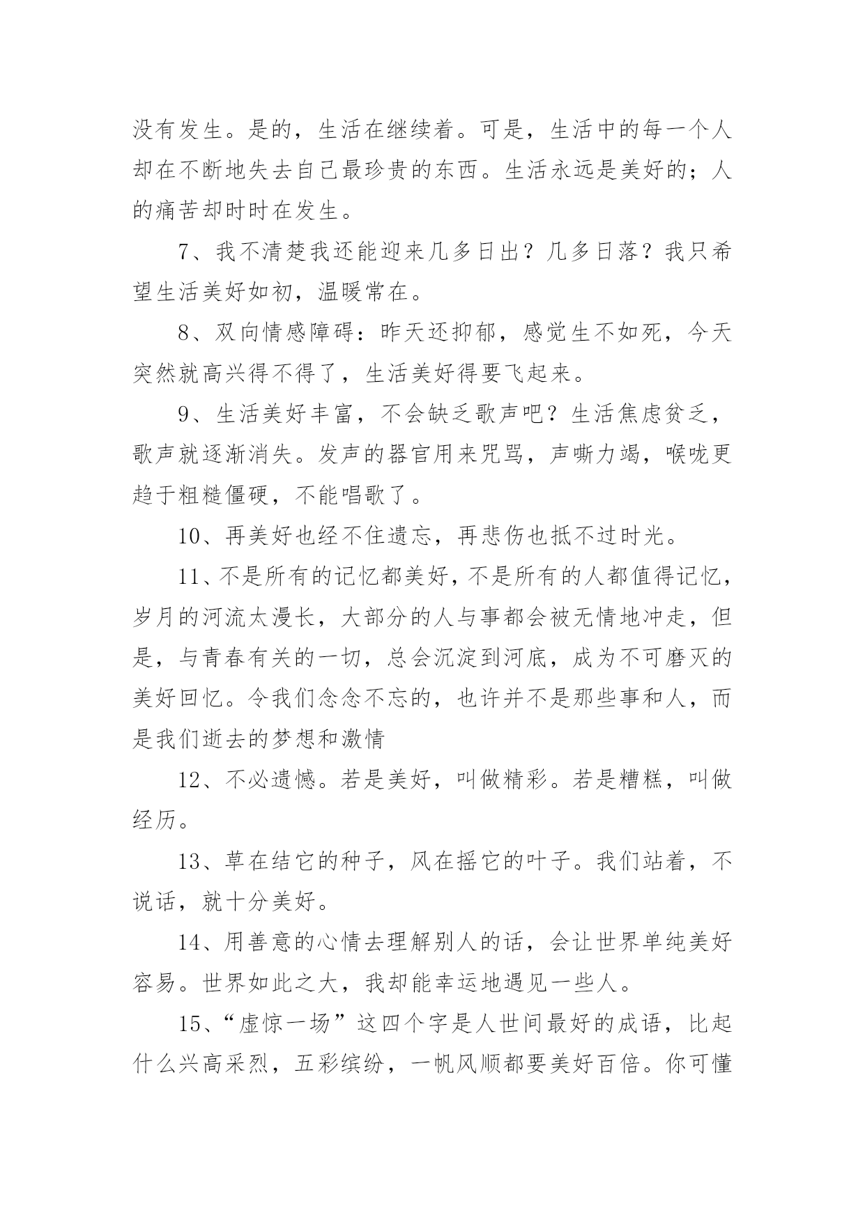 生活美好的句子生活美好的句子(通用15篇)无论在学习、工作或是生活中,大家都经常接触到句子吧,句子是由词或词组构成的,是具有一定语调并表达一个完整意思的语言运用单位。那么问题来了,到底什么样的句子才经典呢?以下是小编精心整理的生活美好的句子,仅供参考,欢迎大家阅读。生活美好的句子11.成功的人生一开始是观众,接着是演员,最后才是后台老板。失败的人生反其道而行之。——李敖谈“人生成败三部”2.孤单的你,孤单的我,孤单的灵魂,流离失所。3.很多人,很多事,原本是熟悉的,以为明天可以再继续的。于是转过身暂时放手,想的是明日又将重聚的希望。你来回应,我靠近天堂,你沉默,我成了经过。太阳落下去重新升起来以前,那些事,就不可能再经历;那些人,就从此与你永别了4.不要总把自己与别人比,人各有自己的特点,做不成大树,可以做小草,做不成船长,可以做水手,最重要的是认识自己,找到自己,做个最好的自己!5.曾经在某一个瞬间,我们以为自己长大了,有一天,我们终于发现,长大的含义除了欲望还有勇气和坚强,以及某种必须的牺牲。6.翻开早已发黄的页张,试着寻找过去所留下的点点滴滴的足迹。多年前的好友似乎现在看来已变得陌生,匆忙之间,让这维持了多年的友谊变淡,找不出什么亲切感,只是偶尔遇上,淡淡地微笑,如今也只能在这发黄的页张中找寻过去的那些让人难忘的,至少我可以握住这仅剩下一段的“丝线头”7.把生活当作一顿美餐,我品尝到了甜美;把生活当作长征,我体会到了艰辛;把生活当作课堂,我感谢为我传授知识的每位老师。8.大事小事好事坏事真事假事旧事新事,在生活看来,那都是快乐的。假若没有这么多的“事”,生活就会很枯燥,没有了意义。一个人的快乐是快乐,两个人的快乐是分享,三个人的快乐是攀比快乐,而好多人的快乐,是生活的快乐。生活的快乐,就是世界的祝福。9.多一些泪水,多一些艰辛,多一些磨难。我想,生活才不会像黑夜,只有几点星光的照耀。我们应该学习上一代人的生活,把艰辛的生活作为磨砺,把绊脚石当作辅助。有了这一切,你我都来感受这另一种生活,虽然有点苦涩,但你会从中发现更多生活的真谛与美。10.感谢生活,它让人学会淡然。远方秋水边的大哲庄子,缓缓饮下一掬生活的冽泉。生活不紧不慢的步伐带领他看破名与利,超越了生与死;是生活让他入乎心之内,又出乎物之外。由是他学会淡然,“衣带渐宽终不悔”,说的正是他这种彻悟。他不同于那位终没能参悟生活,在汩罗江边留下悲剧的屈子。生活美好的句子21、你要搞清楚自己人生的剧本,不是你父母的续集,不是你子女的前传,更不是你朋友的外篇。对待生命你不妨大胆冒险一点,因为好歹你要失去它。如果这世界上真有奇迹,那只是努力的另一个名字。生命中最难的阶段不是没有人懂你,而是你不懂你自己。2、爱情既是在异性的世界中探险,带来发现的惊喜,也是在某一异性身边的定居,带来家园的安宁。但探险不是猎奇,定居也不是占有。好的爱情是双方以自由为最高赠礼的洒脱,以及决不滥用这一份自由的珍惜。3、好运只是个副产品,只有当你不带任何私心杂念,单纯地去做事情时,它才会降临。4、没有女生乐意跟一个新的男生从头开始,从完全陌生开始熟悉,把自己的心思、身体和灵魂都托付给他,再经历一次从尴尬到坦然的过程,跟他分享秘密,说出自己的心情。这或许就是为什么很多时候明明自己很痛苦却还是不舍得离开的原因。一个女生肯放下自己的尊严,骄傲,向你低头。你是不是应该想想她鼓起了多大的勇气,做了多大的牺牲,她尽量答应你的要求不去打扰你,用她的眼泪换来你的快乐,习惯比深爱更可怕。5、让我说,世上哪有什么一夜成名?我6岁习武,8岁准备当演员,20岁做群众演员,我被叫了好几年傻根。许三多,现在还有人这样叫我。我没有秘诀,只是生活教会了我太多。6、人最大的困难是认识自己,最容易的也是认识自己。很多时候,我们认不清自己,只因为我们把自己放在了一个错误的位置,给了自己一个错觉。所以,不怕前路坎坷,只怕从一开始就走错了方向。7、在中国人眼里,不结婚是错,不生小孩是错,剖腹产是错,老少配是错,整容是错,有钱是错,没钱更错、自己的人生,非要别人来指手画脚才算走了正道。8、我们有时总把后果看得过于严重,最后难为了自己。就像小学时考了不及格,站在家门口不敢敲门。其实门那边是热气腾腾的饭菜和妈妈的一句’没关系啊,努力了就很好。’回过头来看,那些曾经让自己寝食难安的事,大多败给了想象。生活美好的句子31、那些刻在椅子背后的爱情,会不会像水泥上的花朵,开出没有风的,寂寞的森林。2、历任何伟大的成就都可以称为热情的胜利。没有热情,不可能成就任何伟业,因为无论多么恐惧、多么艰难的挑战,热情都赋予它新的含义。没有热情,我注定要在平庸中度过一生;而有了热情,我将会创造奇。3、人们声称的最美好的岁月其实都是最痛苦的,只是事后回忆起来的时候才那么幸福