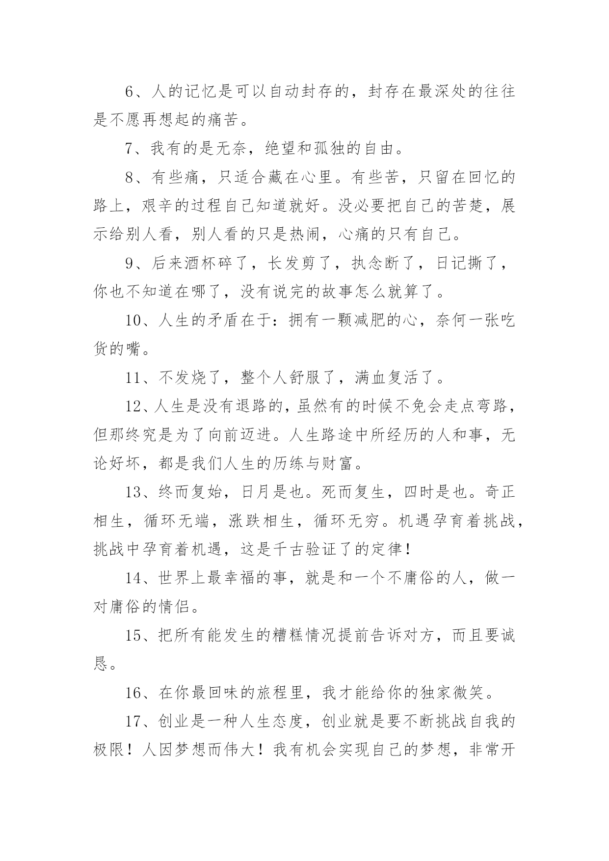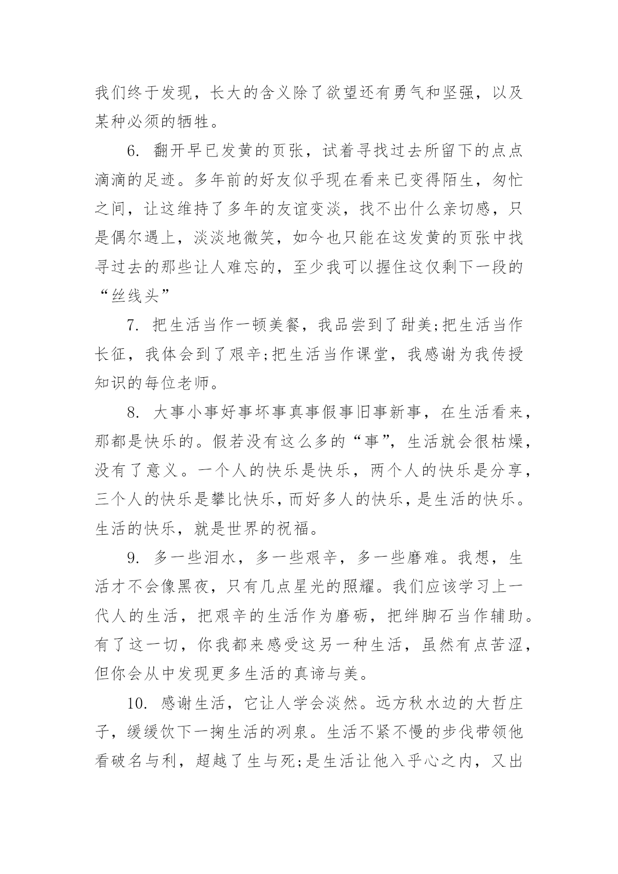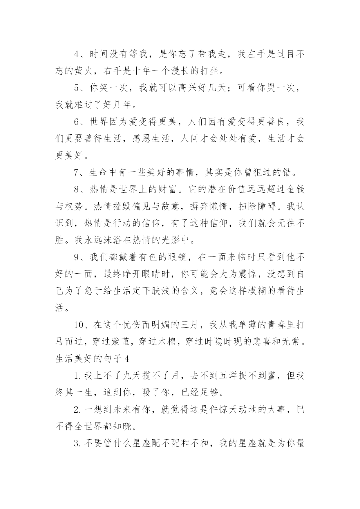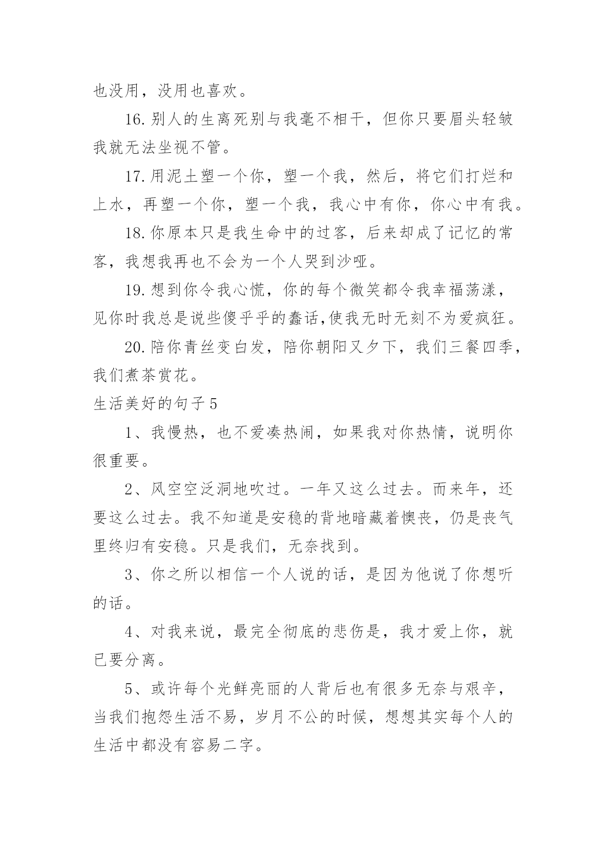 生活美好的句子生活美好的句子(通用15篇)无论在学习、工作或是生活中,大家都经常接触到句子吧,句子是由词或词组构成的,是具有一定语调并表达一个完整意思的语言运用单位。那么问题来了,到底什么样的句子才经典呢?以下是小编精心整理的生活美好的句子,仅供参考,欢迎大家阅读。生活美好的句子11.成功的人生一开始是观众,接着是演员,最后才是后台老板。失败的人生反其道而行之。——李敖谈“人生成败三部”2.孤单的你,孤单的我,孤单的灵魂,流离失所。3.很多人,很多事,原本是熟悉的,以为明天可以再继续的。于是转过身暂时放手,想的是明日又将重聚的希望。你来回应,我靠近天堂,你沉默,我成了经过。太阳落下去重新升起来以前,那些事,就不可能再经历;那些人,就从此与你永别了4.不要总把自己与别人比,人各有自己的特点,做不成大树,可以做小草,做不成船长,可以做水手,最重要的是认识自己,找到自己,做个最好的自己!5.曾经在某一个瞬间,我们以为自己长大了,有一天,我们终于发现,长大的含义除了欲望还有勇气和坚强,以及某种必须的牺牲。6.翻开早已发黄的页张,试着寻找过去所留下的点点滴滴的足迹。多年前的好友似乎现在看来已变得陌生,匆忙之间,让这维持了多年的友谊变淡,找不出什么亲切感,只是偶尔遇上,淡淡地微笑,如今也只能在这发黄的页张中找寻过去的那些让人难忘的,至少我可以握住这仅剩下一段的“丝线头”7.把生活当作一顿美餐,我品尝到了甜美;把生活当作长征,我体会到了艰辛;把生活当作课堂,我感谢为我传授知识的每位老师。8.大事小事好事坏事真事假事旧事新事,在生活看来,那都是快乐的。假若没有这么多的“事”,生活就会很枯燥,没有了意义。一个人的快乐是快乐,两个人的快乐是分享,三个人的快乐是攀比快乐,而好多人的快乐,是生活的快乐。生活的快乐,就是世界的祝福。9.多一些泪水,多一些艰辛,多一些磨难。我想,生活才不会像黑夜,只有几点星光的照耀。我们应该学习上一代人的生活,把艰辛的生活作为磨砺,把绊脚石当作辅助。有了这一切,你我都来感受这另一种生活,虽然有点苦涩,但你会从中发现更多生活的真谛与美。10.感谢生活,它让人学会淡然。远方秋水边的大哲庄子,缓缓饮下一掬生活的冽泉。生活不紧不慢的步伐带领他看破名与利,超越了生与死;是生活让他入乎心之内,又出乎物之外。由是他学会淡然,“衣带渐宽终不悔”,说的正是他这种彻悟。他不同于那位终没能参悟生活,在汩罗江边留下悲剧的屈子。生活美好的句子21、你要搞清楚自己人生的剧本,不是你父母的续集,不是你子女的前传,更不是你朋友的外篇。对待生命你不妨大胆冒险一点,因为好歹你要失去它。如果这世界上真有奇迹,那只是努力的另一个名字。生命中最难的阶段不是没有人懂你,而是你不懂你自己。2、爱情既是在异性的世界中探险,带来发现的惊喜,也是在某一异性身边的定居,带来家园的安宁。但探险不是猎奇,定居也不是占有。好的爱情是双方以自由为最高赠礼的洒脱,以及决不滥用这一份自由的珍惜。3、好运只是个副产品,只有当你不带任何私心杂念,单纯地去做事情时,它才会降临。4、没有女生乐意跟一个新的男生从头开始,从完全陌生开始熟悉,把自己的心思、身体和灵魂都托付给他,再经历一次从尴尬到坦然的过程,跟他分享秘密,说出自己的心情。这或许就是为什么很多时候明明自己很痛苦却还是不舍得离开的原因。一个女生肯放下自己的尊严,骄傲,向你低头。你是不是应该想想她鼓起了多大的勇气,做了多大的牺牲,她尽量答应你的要求不去打扰你,用她的眼泪换来你的快乐,习惯比深爱更可怕。5、让我说,世上哪有什么一夜成名?我6岁习武,8岁准备当演员,20岁做群众演员,我被叫了好几年傻根。许三多,现在还有人这样叫我。我没有秘诀,只是生活教会了我太多。6、人最大的困难是认识自己,最容易的也是认识自己。很多时候,我们认不清自己,只因为我们把自己放在了一个错误的位置,给了自己一个错觉。所以,不怕前路坎坷,只怕从一开始就走错了方向。7、在中国人眼里,不结婚是错,不生小孩是错,剖腹产是错,老少配是错,整容是错,有钱是错,没钱更错、自己的人生,非要别人来指手画脚才算走了正道。8、我们有时总把后果看得过于严重,最后难为了自己。就像小学时考了不及格,站在家门口不敢敲门。其实门那边是热气腾腾的饭菜和妈妈的一句’没关系啊,努力了就很好。’回过头来看,那些曾经让自己寝食难安的事,大多败给了想象。生活美好的句子31、那些刻在椅子背后的爱情,会不会像水泥上的花朵,开出没有风的,寂寞的森林。2、历任何伟大的成就都可以称为热情的胜利。没有热情,不可能成就任何伟业,因为无论多么恐惧、多么艰难的挑战,热情都赋予它新的含义。没有热情,我注定要在平庸中度过一生;而有了热情,我将会创造奇。3、人们声称的最美好的岁月其实都是最痛苦的,只是事后回忆起来的时候才那么幸福