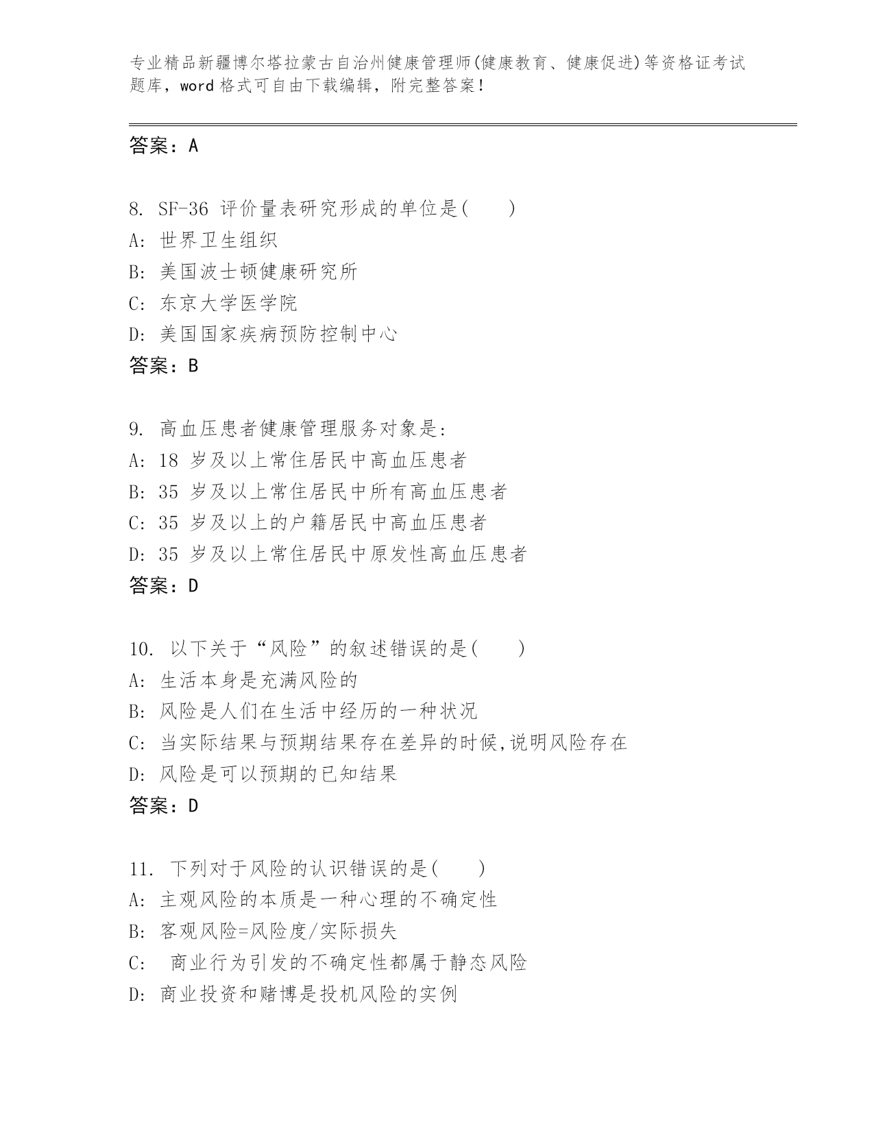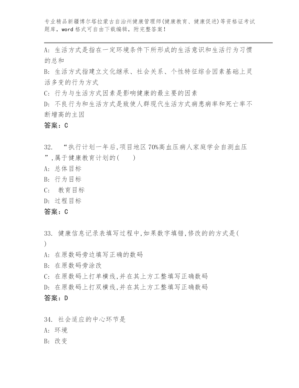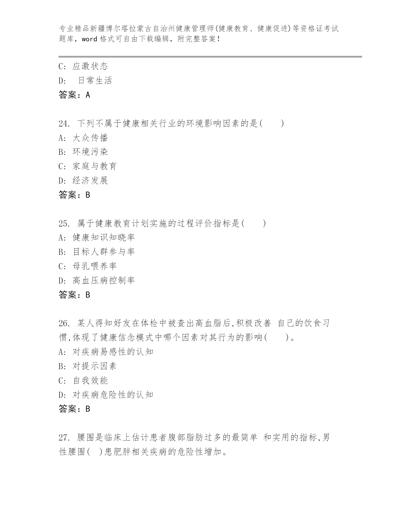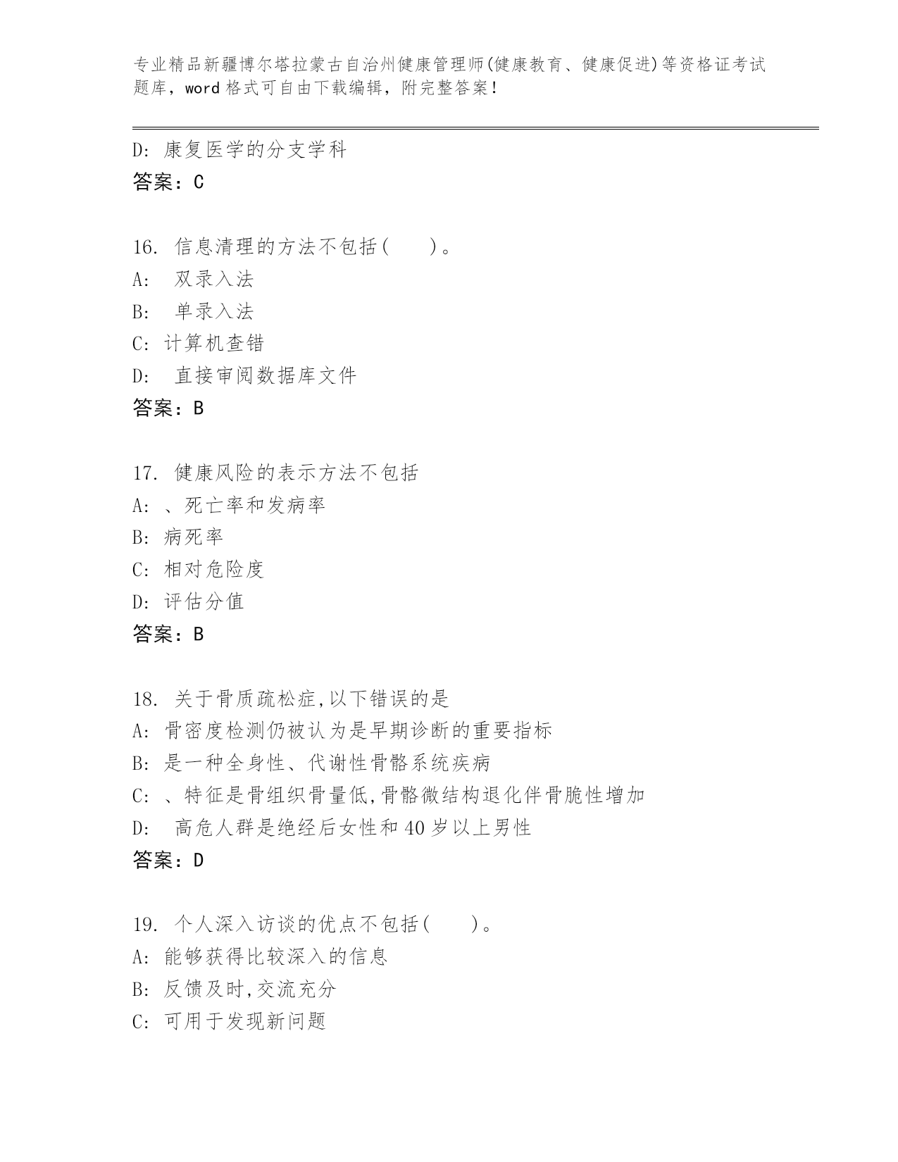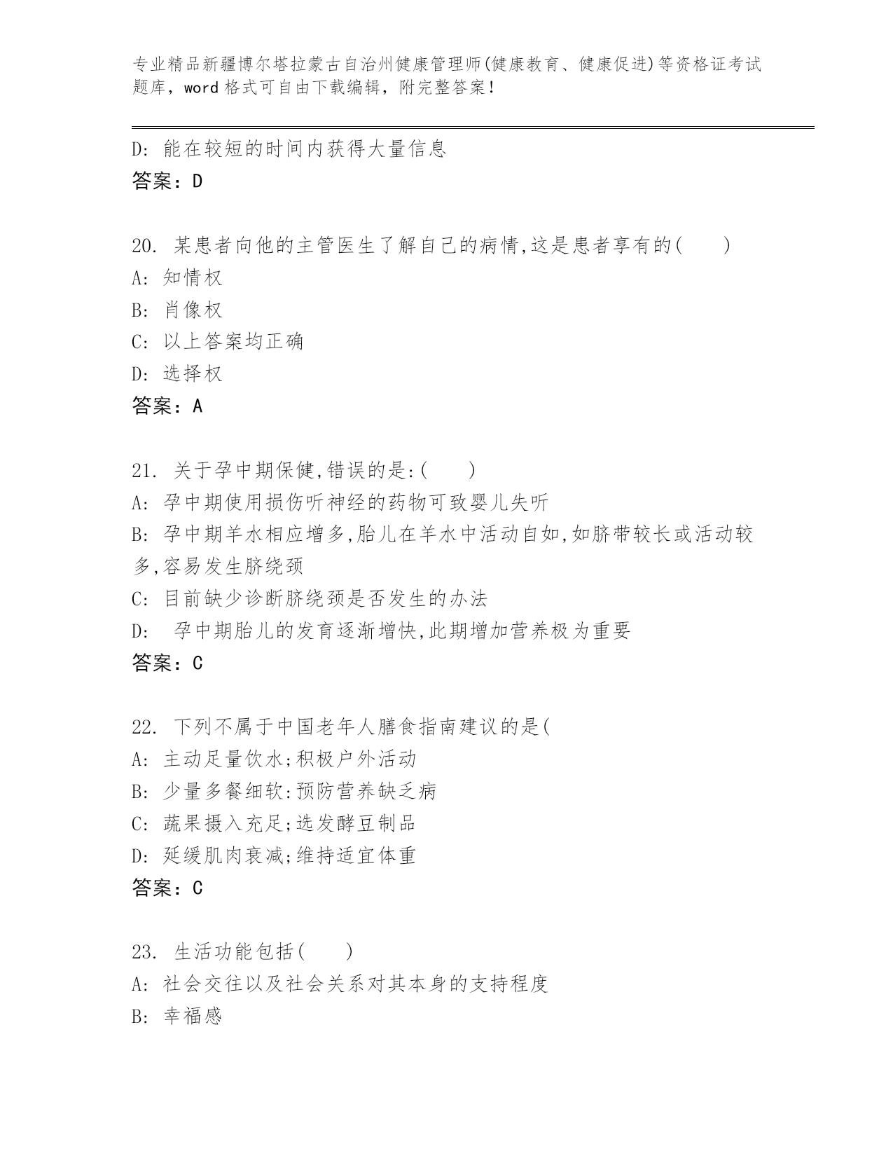 精品新疆博尔塔拉蒙古自治州健康管理师(健康教育、健康促进)等资格证考试真题及答案【真题汇编】