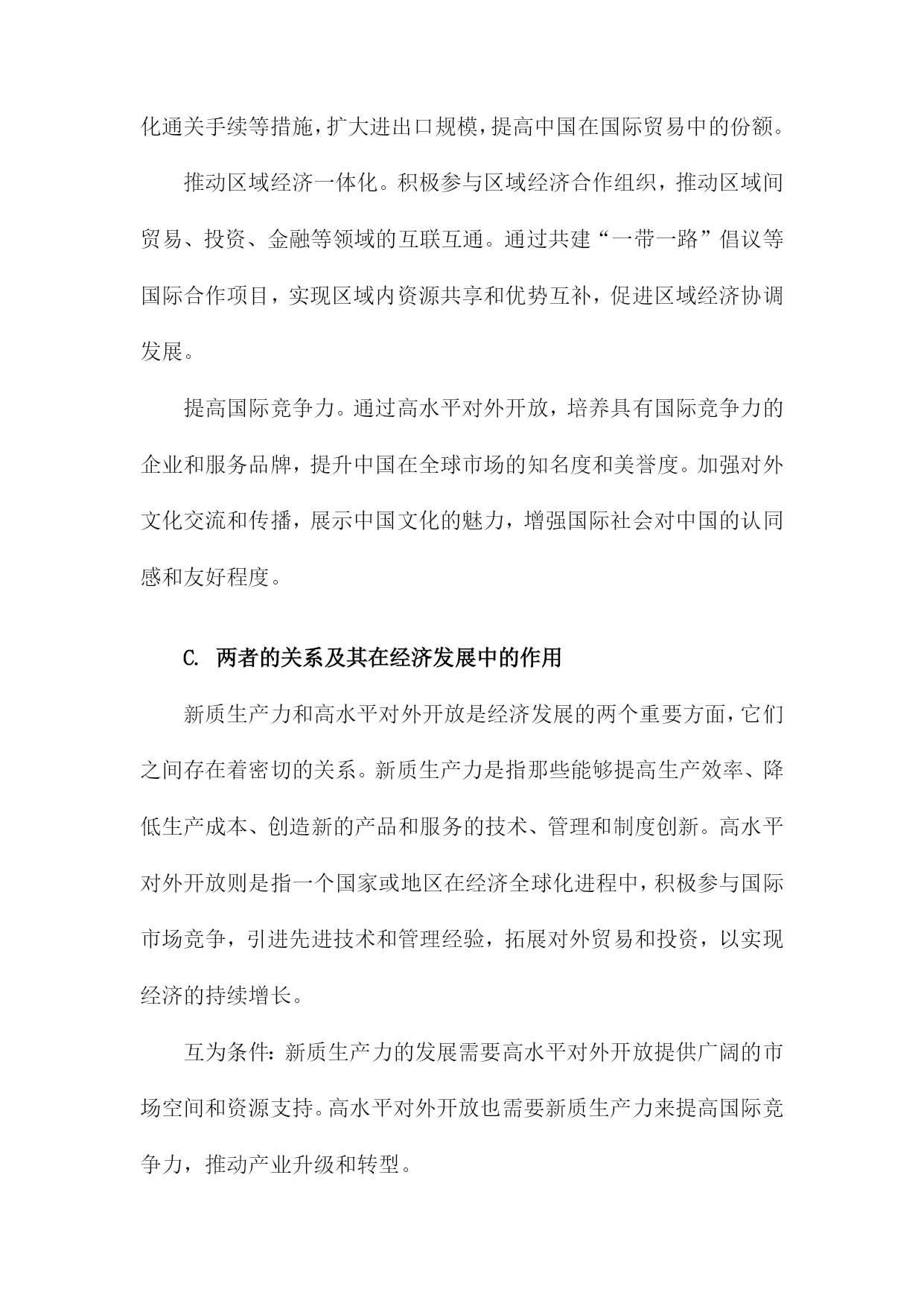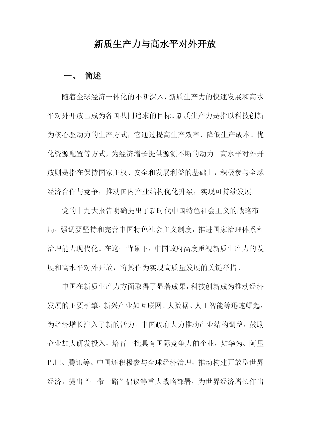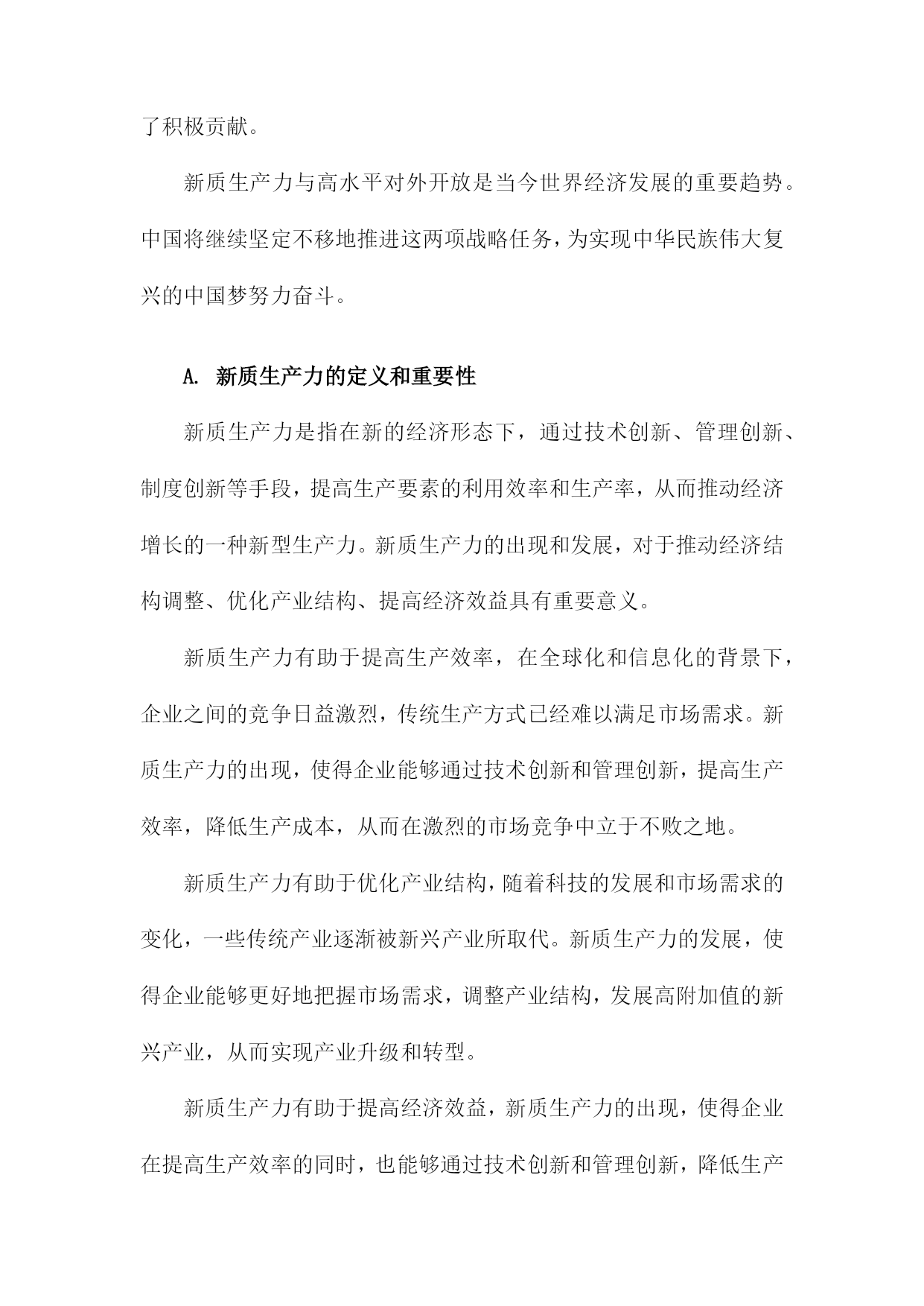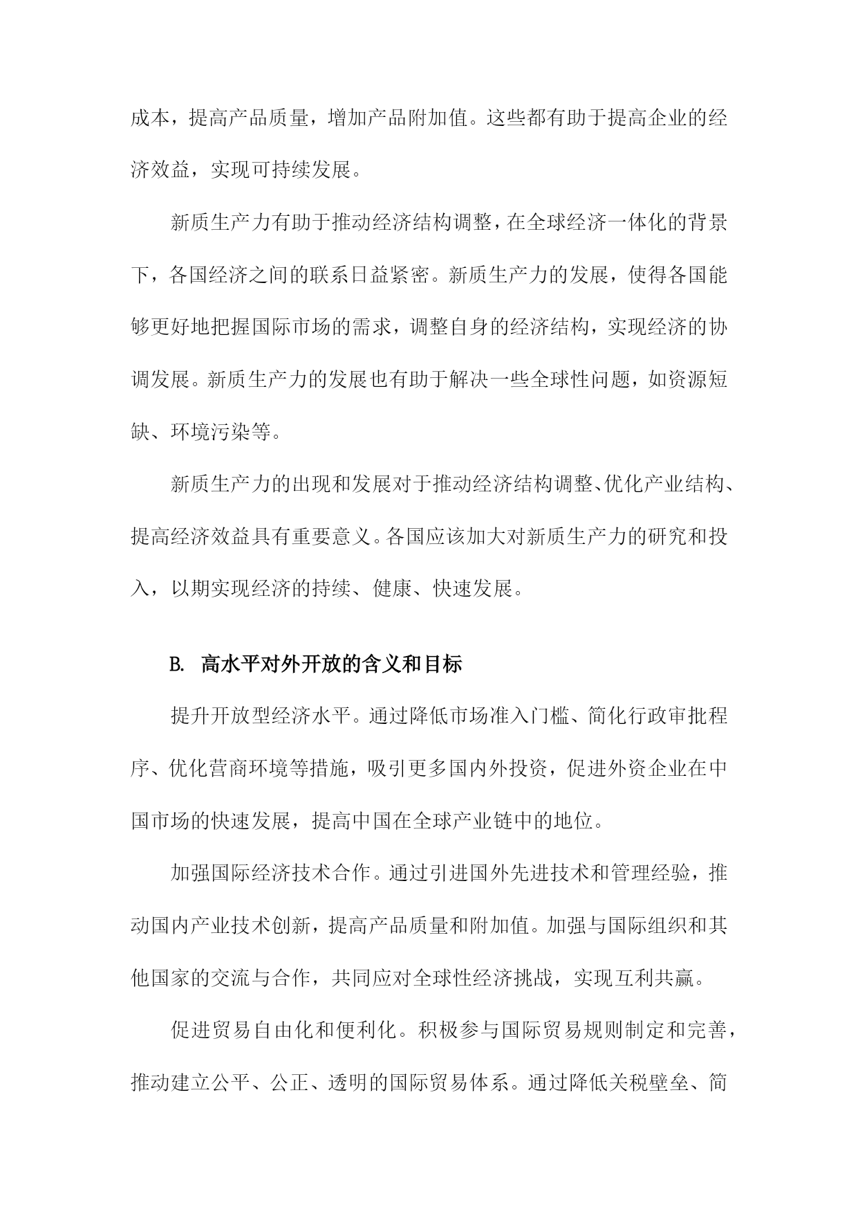 新质生产力与高水平对外开放一、简述随着全球经济一体化的不断深入,新质生产力的快速发展和高水平对外开放已成为各国共同追求的目标。新质生产力是指以科技创新为核心驱动力的生产方式,它通过提高生产效率、降低生产成本、优化资源配置等方式,为经济增长提供源源不断的动力。高水平对外开放则是指在保持国家主权、安全和发展利益的基础上,积极参与全球经济合作与竞争,推动国内产业结构优化升级,实现可持续发展。党的十九大报告明确提出了新时代中国特色社会主义的战略布局,强调要坚持和完善中国特色社会主义制度,推进国家治理体系和治理能力现代化。在这一背景下,中国政府高度重视新质生产力的发展和高水平对外开放,将其作为实现高质量发展的关键举措。中国在新质生产力方面取得了显著成果,科技创新成为推动经济发展的主要引擎,新兴产业如互联网、大数据、人工智能等迅速崛起,为经济增长注入了新的活力。中国政府大力推动产业结构调整,鼓励企业加大研发投入,培育一批具有国际竞争力的企业,如华为、阿里巴巴、腾讯等。中国还积极参与全球经济治理,推动构建开放型世界经济,提出“一带一路”倡议等重大战略部署,为世界经济增长作出了积极贡献。新质生产力与高水平对外开放是当今世界经济发展的重要趋势。中国将继续坚定不移地推进这两项战略任务,为实现中华民族伟大复兴的中国梦努力奋斗。A.新质生产力的定义和重要性新质生产力是指在新的经济形态下,通过技术创新、管理创新、制度创新等手段,提高生产要素的利用效率和生产率,从而推动经济增长的一种新型生产力。新质生产力的出现和发展,对于推动经济结构调整、优化产业结构、提高经济效益具有重要意义。新质生产力有助于提高生产效率,在全球化和信息化的背景下,企业之间的竞争日益激烈,传统生产方式已经难以满足市场需求。新质生产力的出现,使得企业能够通过技术创新和管理创新,提高生产效率,降低生产成本,从而在激烈的市场竞争中立于不败之地。新质生产力有助于优化产业结构,随着科技的发展和市场需求的变化,一些传统产业逐渐被新兴产业所取代。新质生产力的发展,使得企业能够更好地把握市场需求,调整产业结构,发展高附加值的新兴产业,从而实现产业升级和转型。新质生产力有助于提高经济效益,新质生产力的出现,使得企业在提高生产效率的同时,也能够通过技术创新和管理创新,降低生产成本,提高产品质量,增加产品附加值。这些都有助于提高企业的经济效益,实现可持续发展。新质生产力有助于推动经济结构调整,在全球经济一体化的背景下,各国经济之间的联系日益紧密。新质生产力的发展,使得各国能够更好地把握国际市场的需求,调整自身的经济结构,实现经济的协调发展。新质生产力的发展也有助于解决一些全球性问题,如资源短缺、环境污染等。新质生产力的出现和发展对于推动经济结构调整、优化产业结构、提高经济效益具有重要意义。各国应该加大对新质生产力的研究和投入,以期实现经济的持续、健康、快速发展。B.高水平对外开放的含义和目标提升开放型经济水平。通过降低市场准入门槛、简化行政审批程序、优化营商环境等措施,吸引更多国内外投资,促进外资企业在中国市场的快速发展,提高中国在全球产业链中的地位。加强国际经济技术合作。通过引进国外先进技术和管理经验,推动国内产业技术创新,提高产品质量和附加值。加强与国际组织和其他国家的交流与合作,共同应对全球性经济挑战,实现互利共赢。促进贸易自由化和便利化。积极参与国际贸易规则制定和完善,推动建立公平、公正、透明的国际贸易体系。通过降低关税壁垒、简化通关手续等措施,扩大进出口规模,提高中国在国际贸易中的份额。推动区域经济一体化。积极参与区域经济合作组织,推动区域间贸易、投资、金融等领域的互联互通。通过共建“一带一路”倡议等国际合作项目,实现区域内资源共享和优势互补,促进区域经济协调发展。提高国际竞争力。通过高水平对外开放,培养具有国际竞争力的企业和服务品牌,提升中国在全球市场的知名度和美誉度。加强对外文化交流和传播,展示中国文化的魅力,增强国际社会对中国的认同感和友好程度。C.两者的关系及其在经济发展中的作用新质生产力和高水平对外开放是经济发展的两个重要方面,它们之间存在着密切的关系。新质生产力是指那些能够提高生产效率、降低生产成本、创造新的产品和服务的技术、管理和制度创新。高水平对外开放则是指一个国家或地区在经济全球化进程中,积极参与国际市场竞争,引进先进技术和管理经验,拓展对外贸易和投资,以实现经济的持续增长。互为条件:新质生产力的发展需要高水平对外开放提供广阔的市场空间和资源支持。高水平对外开放也需要新质生产力来提高国际竞争力,推动产业升级和转型。相辅相成:新质生产力的发展有助于提高企业的创新能力和核心竞争力,从而更好地适应国际市场的变化,实现对外贸易和投资的可持续发展