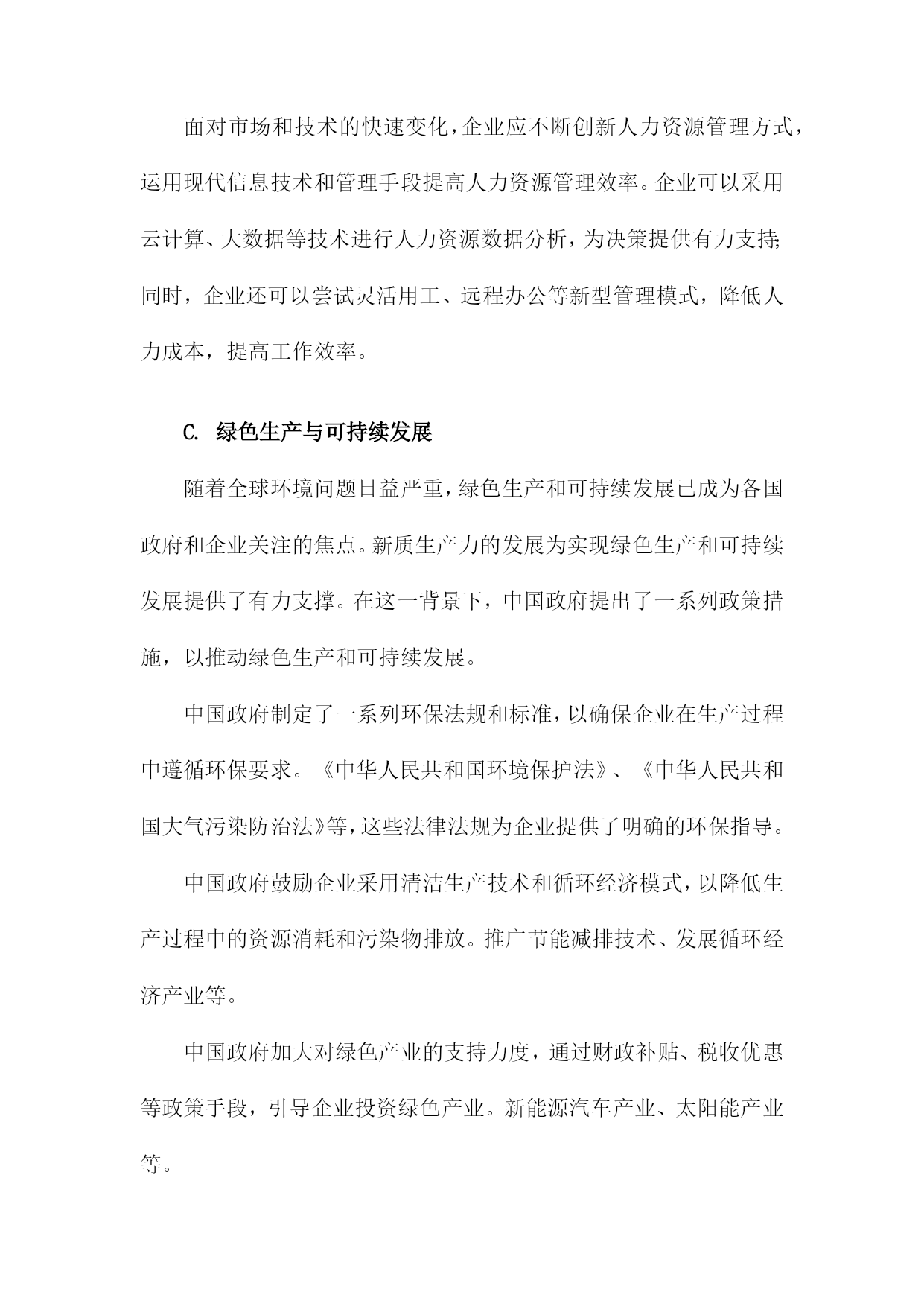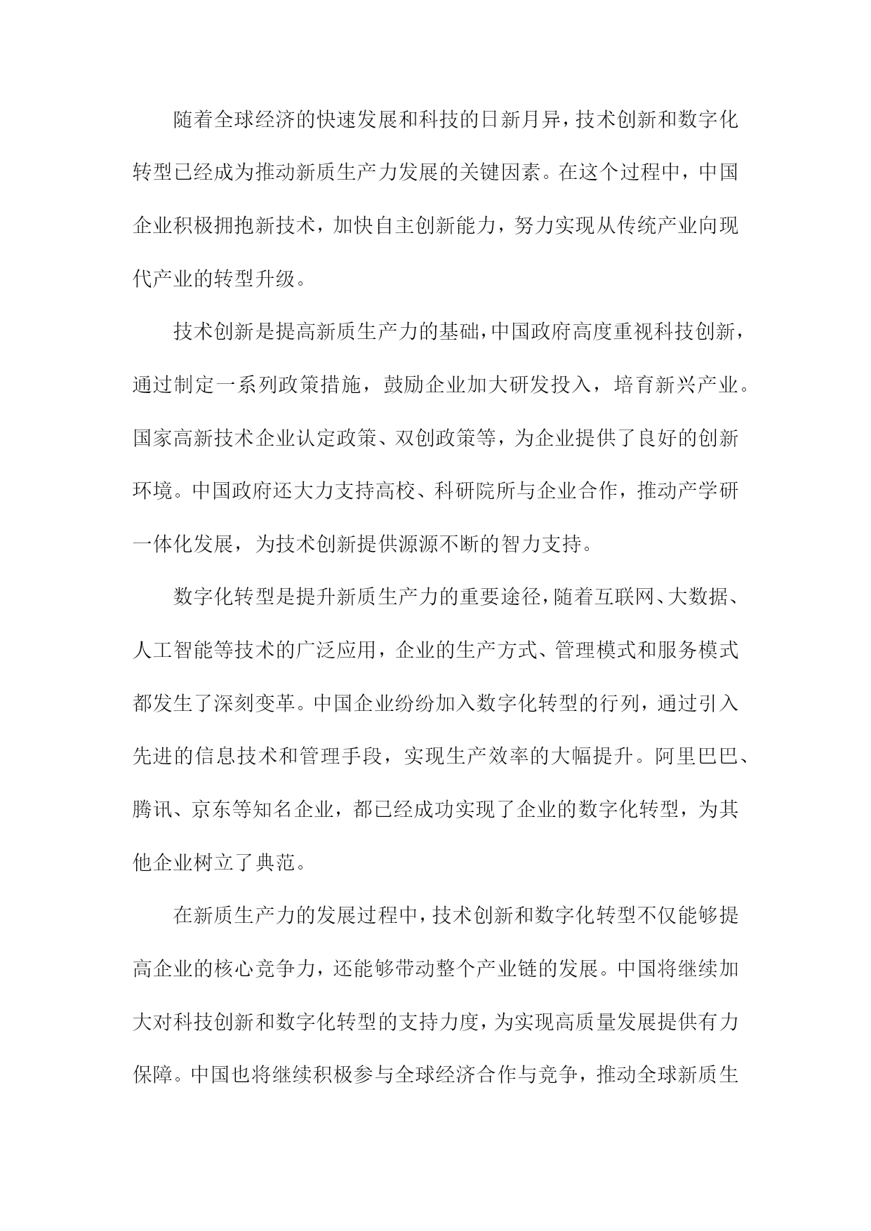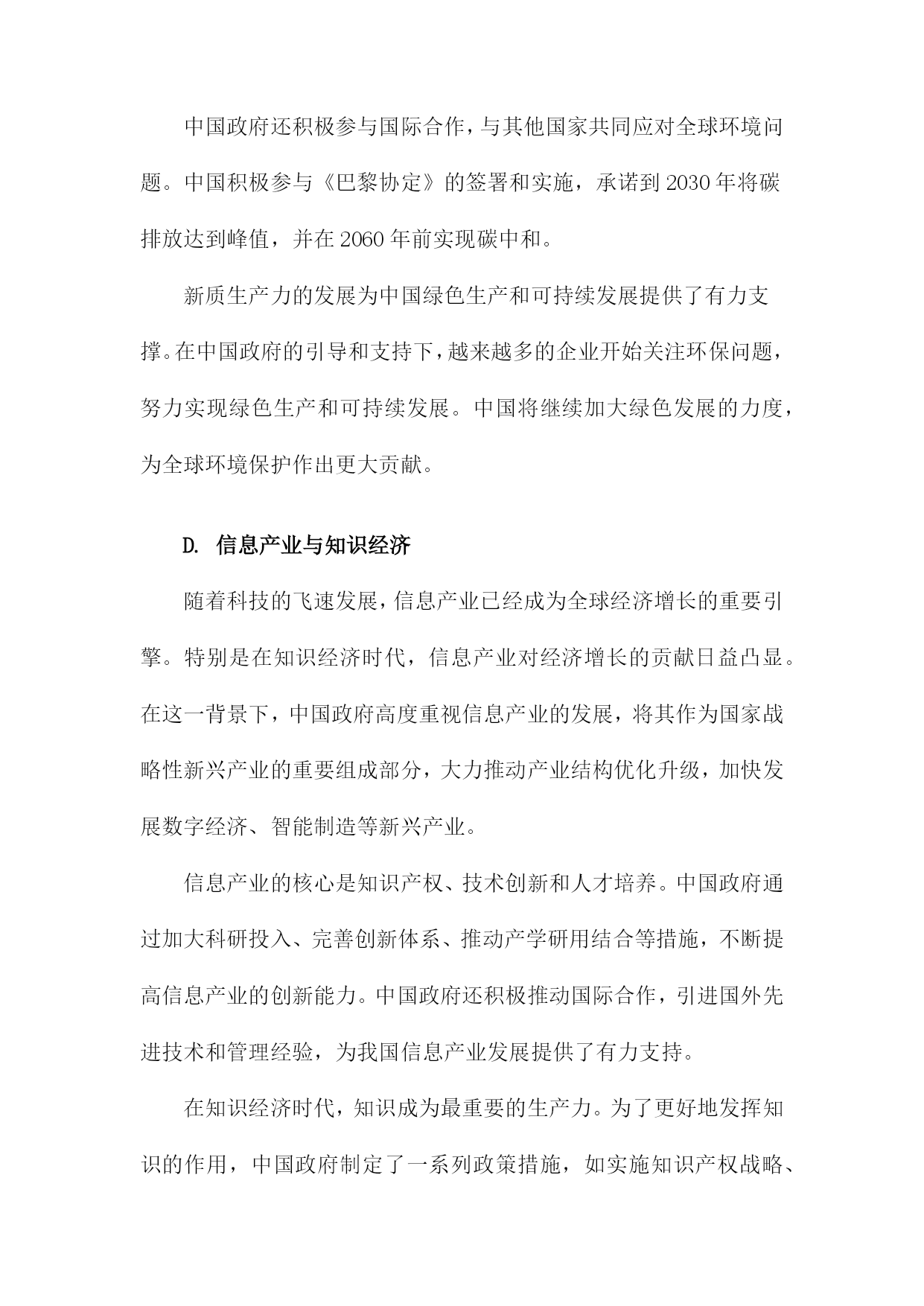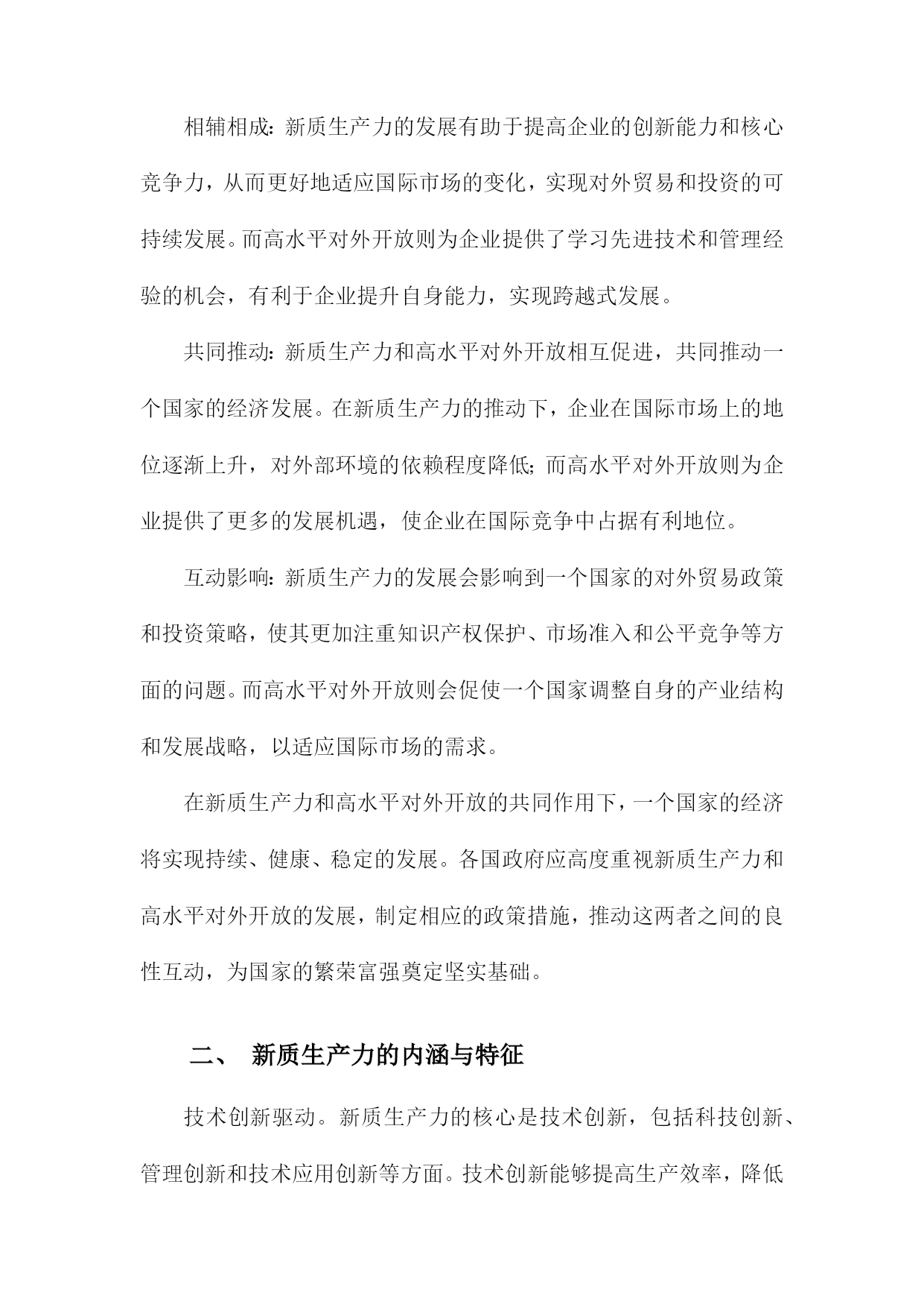 新质生产力与高水平对外开放一、简述随着全球经济一体化的不断深入,新质生产力的快速发展和高水平对外开放已成为各国共同追求的目标。新质生产力是指以科技创新为核心驱动力的生产方式,它通过提高生产效率、降低生产成本、优化资源配置等方式,为经济增长提供源源不断的动力。高水平对外开放则是指在保持国家主权、安全和发展利益的基础上,积极参与全球经济合作与竞争,推动国内产业结构优化升级,实现可持续发展。党的十九大报告明确提出了新时代中国特色社会主义的战略布局,强调要坚持和完善中国特色社会主义制度,推进国家治理体系和治理能力现代化。在这一背景下,中国政府高度重视新质生产力的发展和高水平对外开放,将其作为实现高质量发展的关键举措。中国在新质生产力方面取得了显著成果,科技创新成为推动经济发展的主要引擎,新兴产业如互联网、大数据、人工智能等迅速崛起,为经济增长注入了新的活力。中国政府大力推动产业结构调整,鼓励企业加大研发投入,培育一批具有国际竞争力的企业,如华为、阿里巴巴、腾讯等。中国还积极参与全球经济治理,推动构建开放型世界经济,提出“一带一路”倡议等重大战略部署,为世界经济增长作出了积极贡献。新质生产力与高水平对外开放是当今世界经济发展的重要趋势。中国将继续坚定不移地推进这两项战略任务,为实现中华民族伟大复兴的中国梦努力奋斗。A.新质生产力的定义和重要性新质生产力是指在新的经济形态下,通过技术创新、管理创新、制度创新等手段,提高生产要素的利用效率和生产率,从而推动经济增长的一种新型生产力。新质生产力的出现和发展,对于推动经济结构调整、优化产业结构、提高经济效益具有重要意义。新质生产力有助于提高生产效率,在全球化和信息化的背景下,企业之间的竞争日益激烈,传统生产方式已经难以满足市场需求。新质生产力的出现,使得企业能够通过技术创新和管理创新,提高生产效率,降低生产成本,从而在激烈的市场竞争中立于不败之地。新质生产力有助于优化产业结构,随着科技的发展和市场需求的变化,一些传统产业逐渐被新兴产业所取代。新质生产力的发展,使得企业能够更好地把握市场需求,调整产业结构,发展高附加值的新兴产业,从而实现产业升级和转型。新质生产力有助于提高经济效益,新质生产力的出现,使得企业在提高生产效率的同时,也能够通过技术创新和管理创新,降低生产成本,提高产品质量,增加产品附加值。这些都有助于提高企业的经济效益,实现可持续发展。新质生产力有助于推动经济结构调整,在全球经济一体化的背景下,各国经济之间的联系日益紧密。新质生产力的发展,使得各国能够更好地把握国际市场的需求,调整自身的经济结构,实现经济的协调发展。新质生产力的发展也有助于解决一些全球性问题,如资源短缺、环境污染等。新质生产力的出现和发展对于推动经济结构调整、优化产业结构、提高经济效益具有重要意义。各国应该加大对新质生产力的研究和投入,以期实现经济的持续、健康、快速发展。B.高水平对外开放的含义和目标提升开放型经济水平。通过降低市场准入门槛、简化行政审批程序、优化营商环境等措施,吸引更多国内外投资,促进外资企业在中国市场的快速发展,提高中国在全球产业链中的地位。加强国际经济技术合作。通过引进国外先进技术和管理经验,推动国内产业技术创新,提高产品质量和附加值。加强与国际组织和其他国家的交流与合作,共同应对全球性经济挑战,实现互利共赢。促进贸易自由化和便利化。积极参与国际贸易规则制定和完善,推动建立公平、公正、透明的国际贸易体系。通过降低关税壁垒、简化通关手续等措施,扩大进出口规模,提高中国在国际贸易中的份额。推动区域经济一体化。积极参与区域经济合作组织,推动区域间贸易、投资、金融等领域的互联互通。通过共建“一带一路”倡议等国际合作项目,实现区域内资源共享和优势互补,促进区域经济协调发展。提高国际竞争力。通过高水平对外开放,培养具有国际竞争力的企业和服务品牌,提升中国在全球市场的知名度和美誉度。加强对外文化交流和传播,展示中国文化的魅力,增强国际社会对中国的认同感和友好程度。C.两者的关系及其在经济发展中的作用新质生产力和高水平对外开放是经济发展的两个重要方面,它们之间存在着密切的关系。新质生产力是指那些能够提高生产效率、降低生产成本、创造新的产品和服务的技术、管理和制度创新。高水平对外开放则是指一个国家或地区在经济全球化进程中,积极参与国际市场竞争,引进先进技术和管理经验,拓展对外贸易和投资,以实现经济的持续增长。互为条件:新质生产力的发展需要高水平对外开放提供广阔的市场空间和资源支持。高水平对外开放也需要新质生产力来提高国际竞争力,推动产业升级和转型。相辅相成:新质生产力的发展有助于提高企业的创新能力和核心竞争力,从而更好地适应国际市场的变化,实现对外贸易和投资的可持续发展