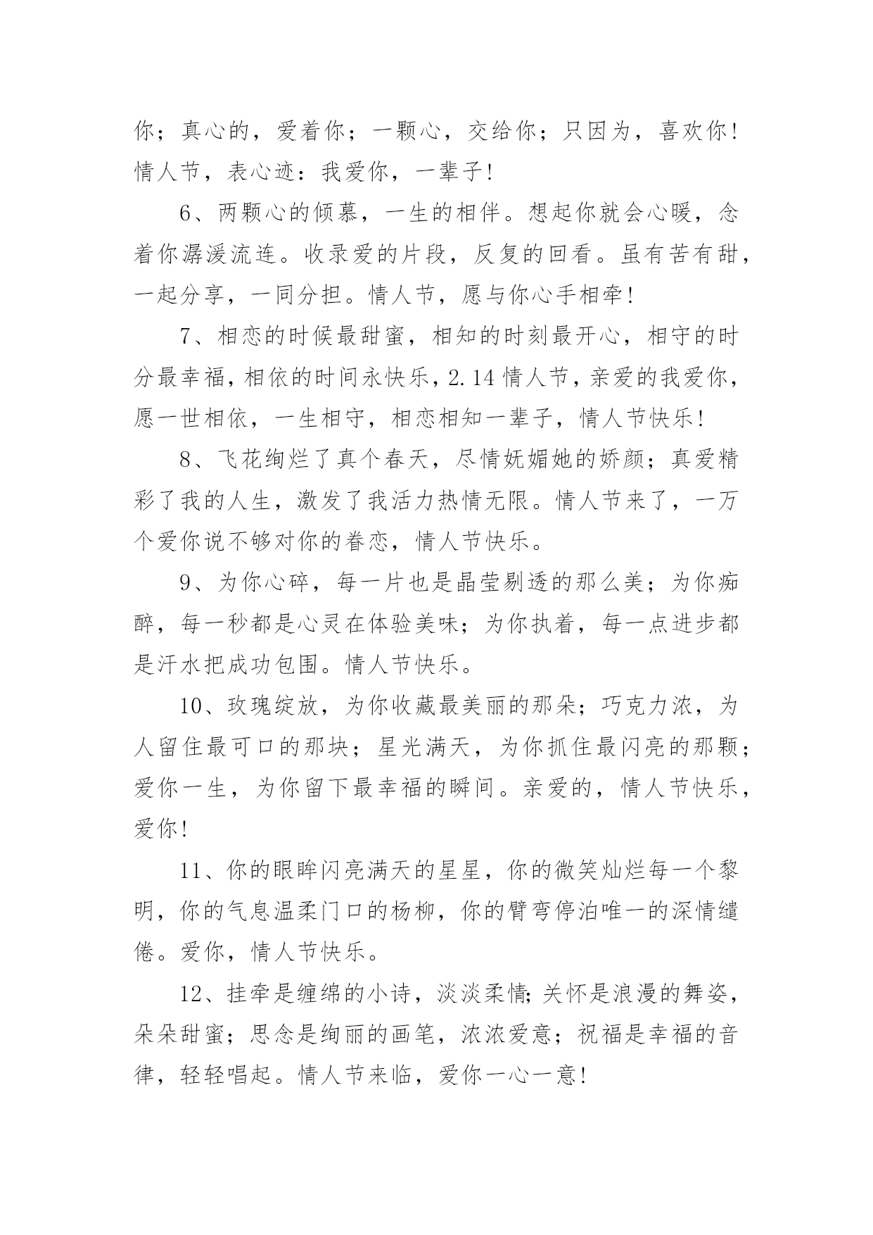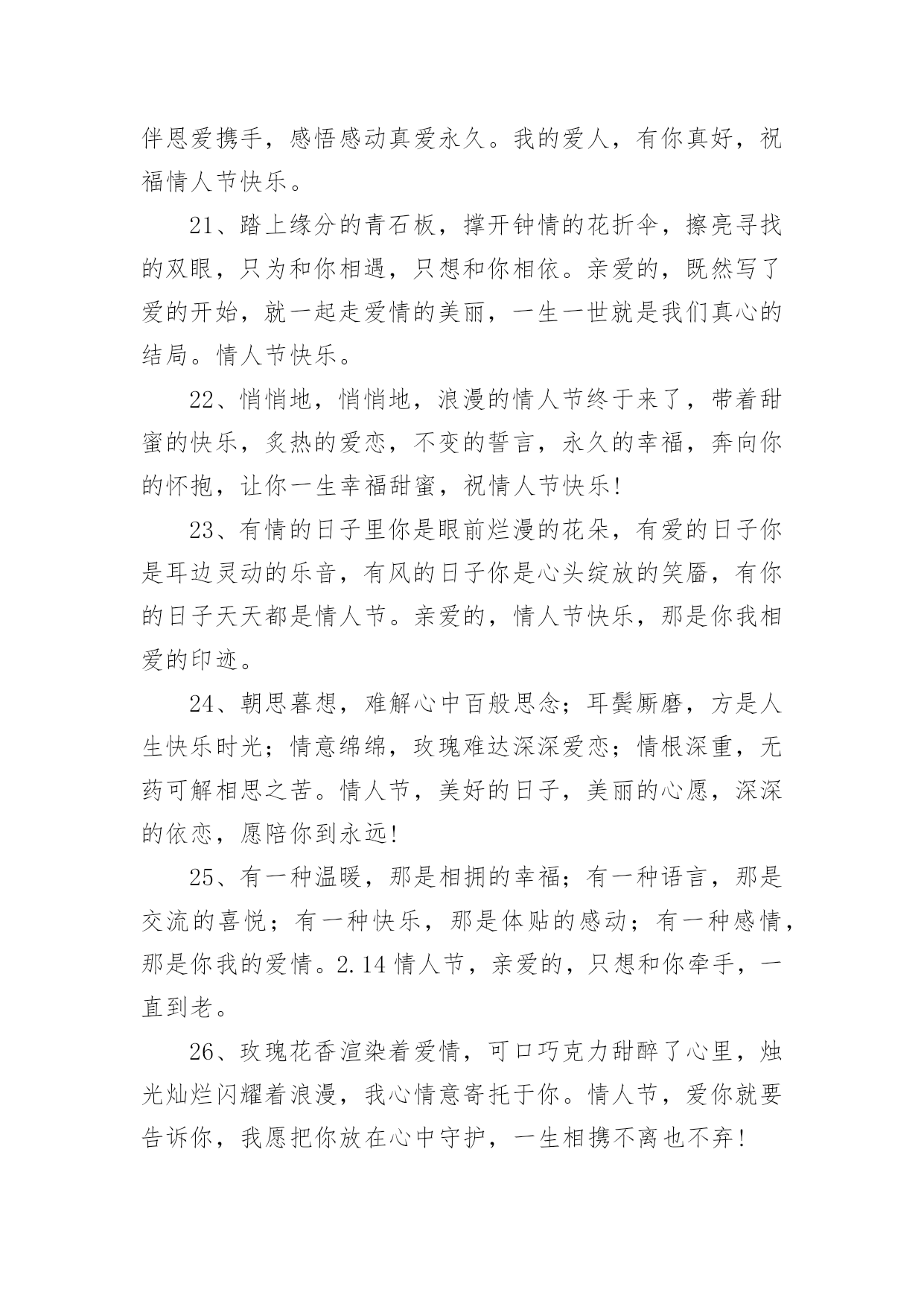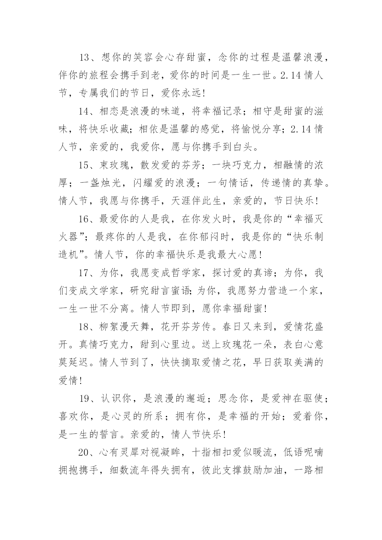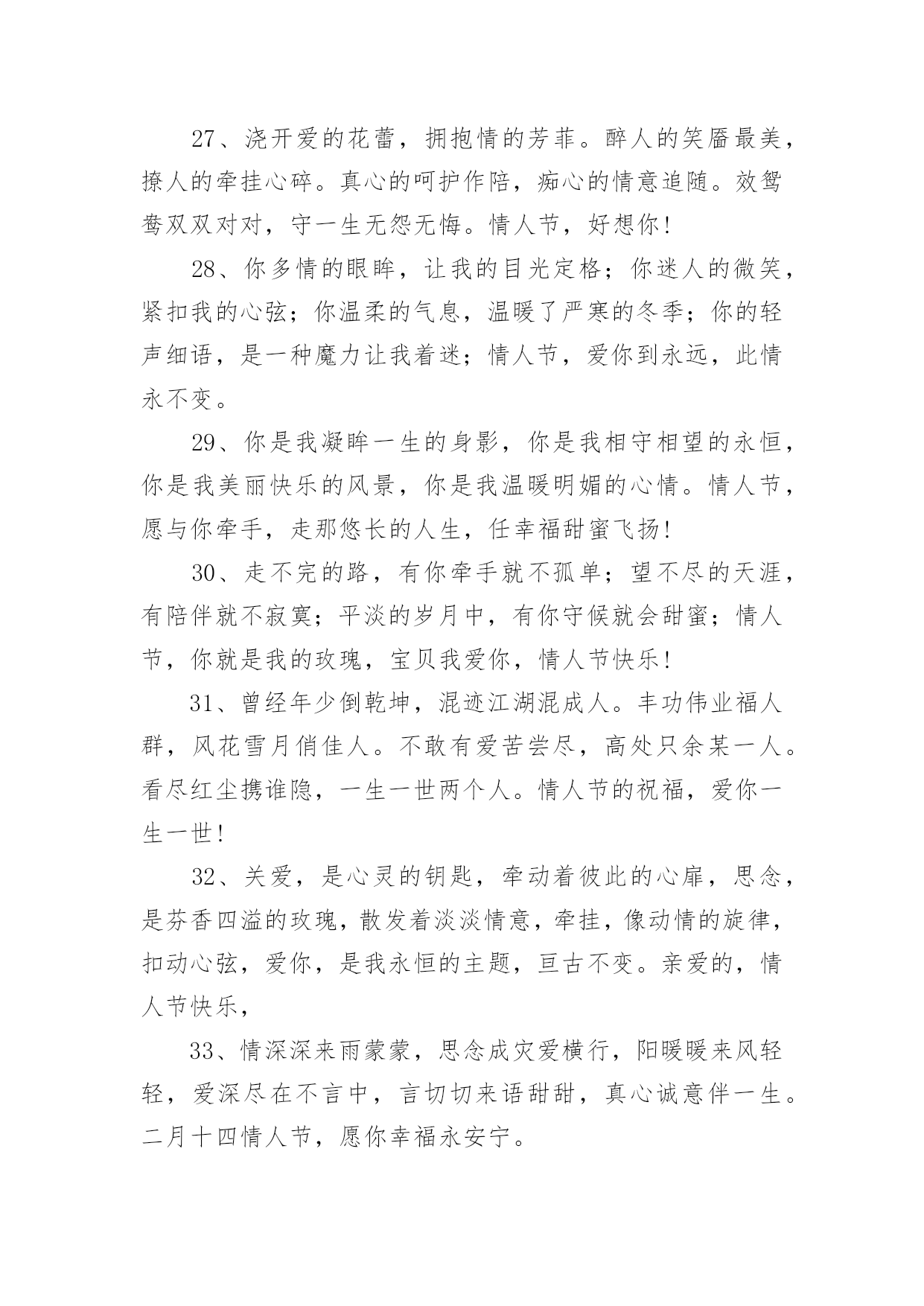 已结婚情人节高级文案已结婚情人节高级文案随着社交网络和信息技术的飞速发展,许多人对一些广为流传的文案都不陌生吧,文案用以分享自己对生活的思考,表达自己的喜怒哀乐。那么你有真正了解过文案吗?下面是小编整理的已结婚情人节高级文案(精选360句),希望能够帮助到大家。1、和你一起踏青溜公园嬉耍追逐非常惬意,有你陪伴漫步在柳岸溪畔特有情调,我们一起携手行进在大街有多少人回头青睐羡慕。亲爱的我真的很想你,我为你祈祷为你祝福,情人节快乐!2、双手捧上玫瑰,将浪漫演译到淋漓尽致;亲手送上巧克力,将甜蜜升华到酣畅淋漓;情人节到了,为我生命中的主角送去祝福,愿你情人节快乐,我爱你到永远!3、情人节,让目光变得清澈,让雪花变得浪漫,让世界变得温馨,让生活变得甜蜜,让真爱变得炽热,让真情变得火辣,让真心变得悸动,让表白变得有力:亲爱的,我爱你!4、玫瑰花的香味,芬芳你心底;情话的甜蜜,迷醉你心悸;浓浓的爱意,融入你的生命里;痴痴的真心,一生一世伴随你。情人节即到只想告诉你,爱你一生!5、不见你,真想你;我梦里,常有你;我心里,只有你;真心的,爱着你;一颗心,交给你;只因为,喜欢你!情人节,表心迹:我爱你,一辈子!6、两颗心的倾慕,一生的相伴。想起你就会心暖,念着你潺湲流连。收录爱的片段,反复的回看。虽有苦有甜,一起分享,一同分担。情人节,愿与你心手相牵!7、相恋的时候最甜蜜,相知的时刻最开心,相守的时分最幸福,相依的时间永快乐,2.14情人节,亲爱的我爱你,愿一世相依,一生相守,相恋相知一辈子,情人节快乐!8、飞花绚烂了真个春天,尽情妩媚她的娇颜;真爱精彩了我的人生,激发了我活力热情无限。情人节来了,一万个爱你说不够对你的眷恋,情人节快乐。9、为你心碎,每一片也是晶莹剔透的那么美;为你痴醉,每一秒都是心灵在体验美味;为你执着,每一点进步都是汗水把成功包围。情人节快乐。10、玫瑰绽放,为你收藏最美丽的那朵;巧克力浓,为人留住最可口的那块;星光满天,为你抓住最闪亮的那颗;爱你一生,为你留下最幸福的瞬间。亲爱的,情人节快乐,爱你!11、你的眼眸闪亮满天的星星,你的微笑灿烂每一个黎明,你的气息温柔门口的杨柳,你的臂弯停泊唯一的深情缱倦。爱你,情人节快乐。12、挂牵是缠绵的小诗,淡淡柔情;关怀是浪漫的舞姿,朵朵甜蜜;思念是绚丽的画笔,浓浓爱意;祝福是幸福的音律,轻轻唱起。情人节来临,爱你一心一意!13、想你的笑容会心存甜蜜,念你的过程是温馨浪漫,伴你的旅程会携手到老,爱你的时间是一生一世。2.14情人节,专属我们的节日,爱你永远!14、相恋是浪漫的味道,将幸福记录;相守是甜蜜的滋味,将快乐收藏;相依是温馨的感觉,将愉悦分享;2.14情人节,亲爱的,我爱你,愿与你携手到白头。15、束玫瑰,散发爱的芬芳;一块巧克力,相融情的浓厚;一盏烛光,闪耀爱的浪漫;一句情话,传递情的真挚。情人节,我愿与你携手,天涯伴此生,亲爱的,节日快乐!16、最爱你的人是我,在你发火时,我是你的“幸福灭火器”;最疼你的人是我,在你郁闷时,我是你的“快乐制造机”。情人节,你的幸福快乐是我最大心愿!17、为你,我愿变成哲学家,探讨爱的真谛;为你,我们变成文学家,研究甜言蜜语;为你,我愿努力营造一个家,一生一世不分离。情人节即到,愿你幸福甜蜜!18、柳絮漫天舞,花开芬芳传。春日又来到,爱情花盛开。真情巧克力,甜到心里边。送上玫瑰花一朵,表白心意莫延迟。情人节到了,快快摘取爱情之花,早日获取美满的爱情!19、认识你,是浪漫的邂逅;思念你,是爱神在驱使;喜欢你,是心灵的所系;拥有你,是幸福的开始;爱着你,是一生的誓言。亲爱的,情人节快乐!20、心有灵犀对视凝眸,十指相扣爱似暖流,低语呢喃拥抱携手,细数流年得失拥有,彼此支撑鼓励加油,一路相伴恩爱携手,感悟感动真爱永久。我的爱人,有你真好,祝福情人节快乐。21、踏上缘分的青石板,撑开钟情的花折伞,擦亮寻找的双眼,只为和你相遇,只想和你相依。亲爱的,既然写了爱的开始,就一起走爱情的美丽,一生一世就是我们真心的结局。情人节快乐。22、悄悄地,悄悄地,浪漫的情人节终于来了,带着甜蜜的快乐,炙热的爱恋,不变的誓言,永久的幸福,奔向你的怀抱,让你一生幸福甜蜜,祝情人节快乐!23、有情的日子里你是眼前烂漫的花朵,有爱的日子你是耳边灵动的乐音,有风的日子你是心头绽放的笑靥,有你的日子天天都是情人节。亲爱的,情人节快乐,那是你我相爱的印迹。24、朝思暮想,难解心中百般思念;耳鬓厮磨,方是人生快乐时光;情意绵绵,玫瑰难达深深爱恋;情根深重,无药可解相思之苦。情人节,美好的日子,美丽的心愿,深深的依恋,愿陪你到永远!25、有一种温暖,那是相拥的幸福;有一种语言,那是交流的喜悦;有一种快乐,那是体贴的感动;有一种感情,那是你我的爱情。2.14情人节,亲爱的,只想和你牵