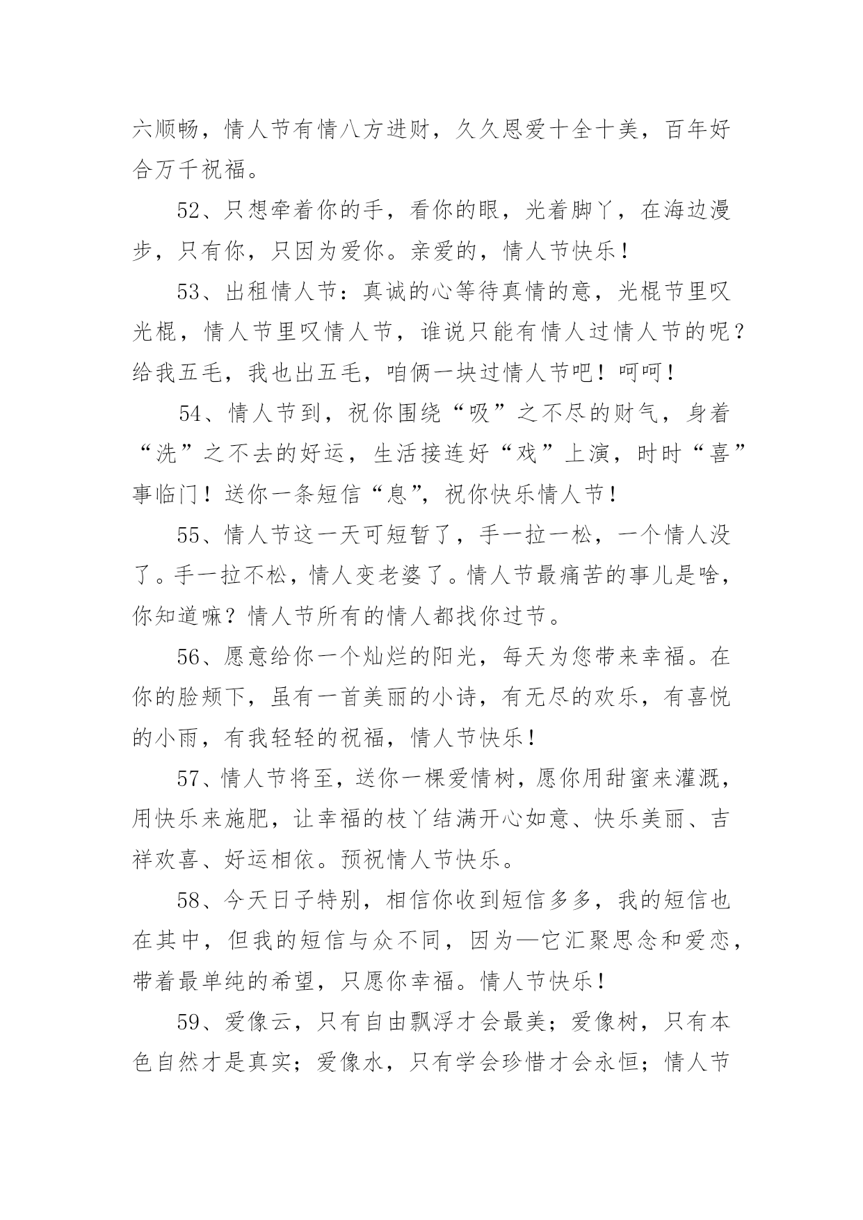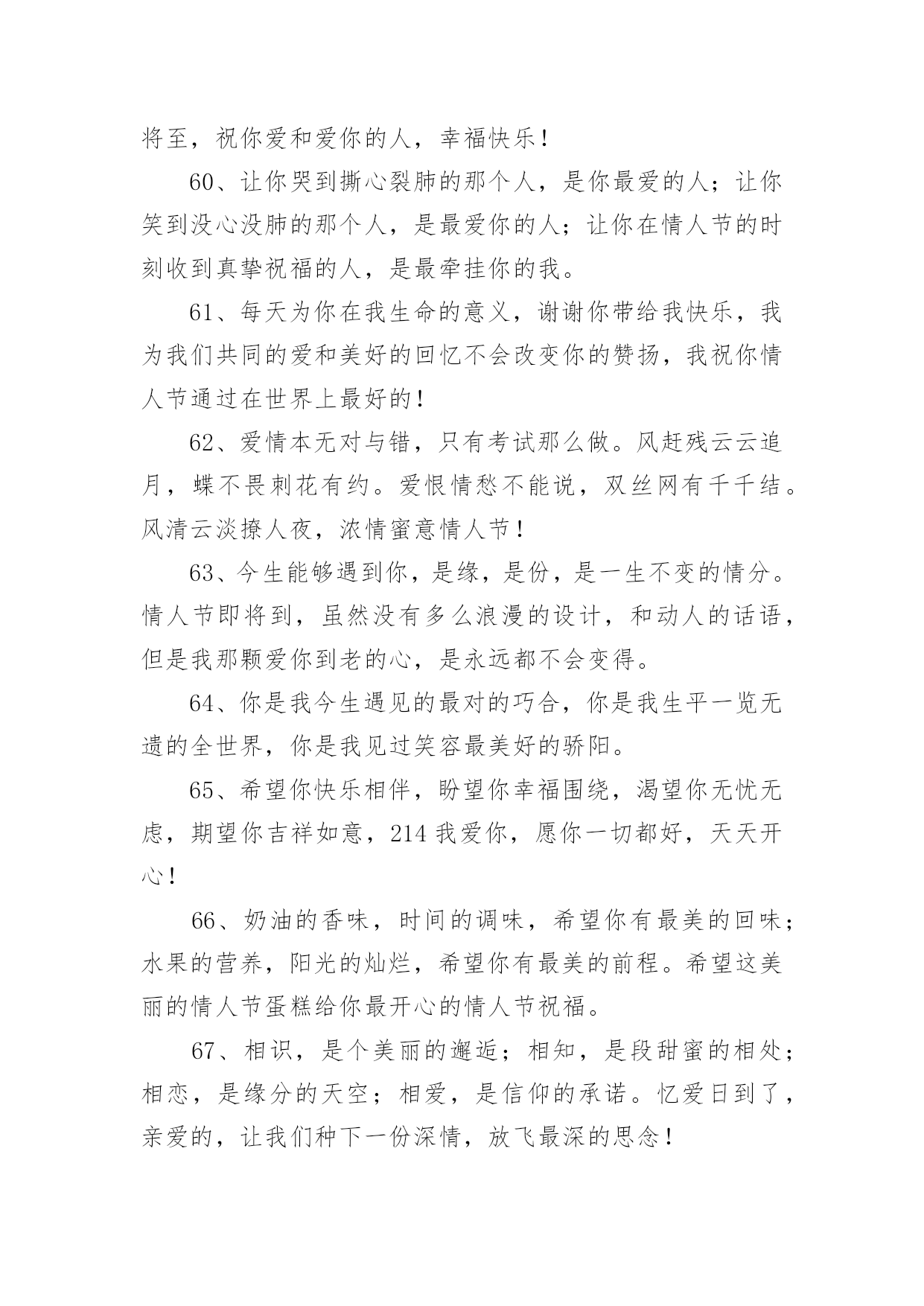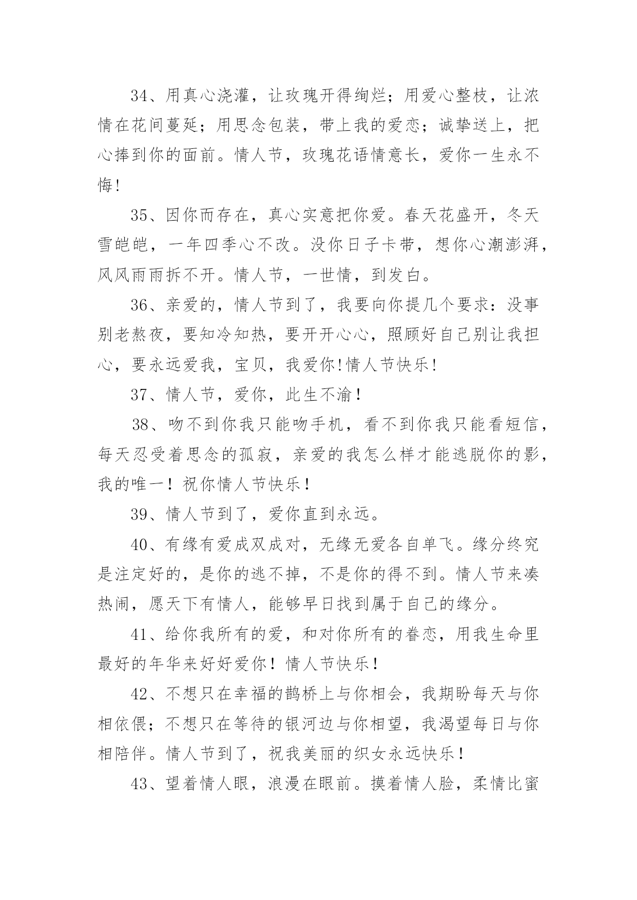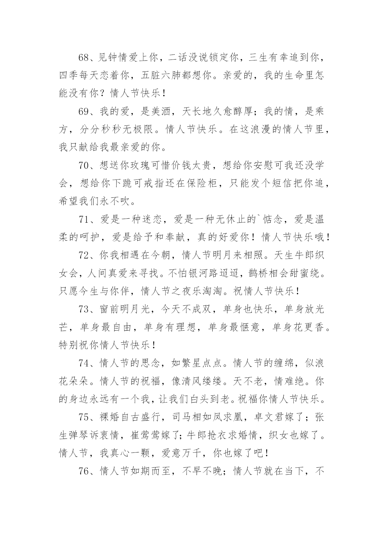 已结婚情人节高级文案已结婚情人节高级文案随着社交网络和信息技术的飞速发展,许多人对一些广为流传的文案都不陌生吧,文案用以分享自己对生活的思考,表达自己的喜怒哀乐。那么你有真正了解过文案吗?下面是小编整理的已结婚情人节高级文案(精选360句),希望能够帮助到大家。1、和你一起踏青溜公园嬉耍追逐非常惬意,有你陪伴漫步在柳岸溪畔特有情调,我们一起携手行进在大街有多少人回头青睐羡慕。亲爱的我真的很想你,我为你祈祷为你祝福,情人节快乐!2、双手捧上玫瑰,将浪漫演译到淋漓尽致;亲手送上巧克力,将甜蜜升华到酣畅淋漓;情人节到了,为我生命中的主角送去祝福,愿你情人节快乐,我爱你到永远!3、情人节,让目光变得清澈,让雪花变得浪漫,让世界变得温馨,让生活变得甜蜜,让真爱变得炽热,让真情变得火辣,让真心变得悸动,让表白变得有力:亲爱的,我爱你!4、玫瑰花的香味,芬芳你心底;情话的甜蜜,迷醉你心悸;浓浓的爱意,融入你的生命里;痴痴的真心,一生一世伴随你。情人节即到只想告诉你,爱你一生!5、不见你,真想你;我梦里,常有你;我心里,只有你;真心的,爱着你;一颗心,交给你;只因为,喜欢你!情人节,表心迹:我爱你,一辈子!6、两颗心的倾慕,一生的相伴。想起你就会心暖,念着你潺湲流连。收录爱的片段,反复的回看。虽有苦有甜,一起分享,一同分担。情人节,愿与你心手相牵!7、相恋的时候最甜蜜,相知的时刻最开心,相守的时分最幸福,相依的时间永快乐,2.14情人节,亲爱的我爱你,愿一世相依,一生相守,相恋相知一辈子,情人节快乐!8、飞花绚烂了真个春天,尽情妩媚她的娇颜;真爱精彩了我的人生,激发了我活力热情无限。情人节来了,一万个爱你说不够对你的眷恋,情人节快乐。9、为你心碎,每一片也是晶莹剔透的那么美;为你痴醉,每一秒都是心灵在体验美味;为你执着,每一点进步都是汗水把成功包围。情人节快乐。10、玫瑰绽放,为你收藏最美丽的那朵;巧克力浓,为人留住最可口的那块;星光满天,为你抓住最闪亮的那颗;爱你一生,为你留下最幸福的瞬间。亲爱的,情人节快乐,爱你!11、你的眼眸闪亮满天的星星,你的微笑灿烂每一个黎明,你的气息温柔门口的杨柳,你的臂弯停泊唯一的深情缱倦。爱你,情人节快乐。12、挂牵是缠绵的小诗,淡淡柔情;关怀是浪漫的舞姿,朵朵甜蜜;思念是绚丽的画笔,浓浓爱意;祝福是幸福的音律,轻轻唱起。情人节来临,爱你一心一意!13、想你的笑容会心存甜蜜,念你的过程是温馨浪漫,伴你的旅程会携手到老,爱你的时间是一生一世。2.14情人节,专属我们的节日,爱你永远!14、相恋是浪漫的味道,将幸福记录;相守是甜蜜的滋味,将快乐收藏;相依是温馨的感觉,将愉悦分享;2.14情人节,亲爱的,我爱你,愿与你携手到白头。15、束玫瑰,散发爱的芬芳;一块巧克力,相融情的浓厚;一盏烛光,闪耀爱的浪漫;一句情话,传递情的真挚。情人节,我愿与你携手,天涯伴此生,亲爱的,节日快乐!16、最爱你的人是我,在你发火时,我是你的“幸福灭火器”;最疼你的人是我,在你郁闷时,我是你的“快乐制造机”。情人节,你的幸福快乐是我最大心愿!17、为你,我愿变成哲学家,探讨爱的真谛;为你,我们变成文学家,研究甜言蜜语;为你,我愿努力营造一个家,一生一世不分离。情人节即到,愿你幸福甜蜜!18、柳絮漫天舞,花开芬芳传。春日又来到,爱情花盛开。真情巧克力,甜到心里边。送上玫瑰花一朵,表白心意莫延迟。情人节到了,快快摘取爱情之花,早日获取美满的爱情!19、认识你,是浪漫的邂逅;思念你,是爱神在驱使;喜欢你,是心灵的所系;拥有你,是幸福的开始;爱着你,是一生的誓言。亲爱的,情人节快乐!20、心有灵犀对视凝眸,十指相扣爱似暖流,低语呢喃拥抱携手,细数流年得失拥有,彼此支撑鼓励加油,一路相伴恩爱携手,感悟感动真爱永久。我的爱人,有你真好,祝福情人节快乐。21、踏上缘分的青石板,撑开钟情的花折伞,擦亮寻找的双眼,只为和你相遇,只想和你相依。亲爱的,既然写了爱的开始,就一起走爱情的美丽,一生一世就是我们真心的结局。情人节快乐。22、悄悄地,悄悄地,浪漫的情人节终于来了,带着甜蜜的快乐,炙热的爱恋,不变的誓言,永久的幸福,奔向你的怀抱,让你一生幸福甜蜜,祝情人节快乐!23、有情的日子里你是眼前烂漫的花朵,有爱的日子你是耳边灵动的乐音,有风的日子你是心头绽放的笑靥,有你的日子天天都是情人节。亲爱的,情人节快乐,那是你我相爱的印迹。24、朝思暮想,难解心中百般思念;耳鬓厮磨,方是人生快乐时光;情意绵绵,玫瑰难达深深爱恋;情根深重,无药可解相思之苦。情人节,美好的日子,美丽的心愿,深深的依恋,愿陪你到永远!25、有一种温暖,那是相拥的幸福;有一种语言,那是交流的喜悦;有一种快乐,那是体贴的感动;有一种感情,那是你我的爱情。2.14情人节,亲爱的,只想和你牵