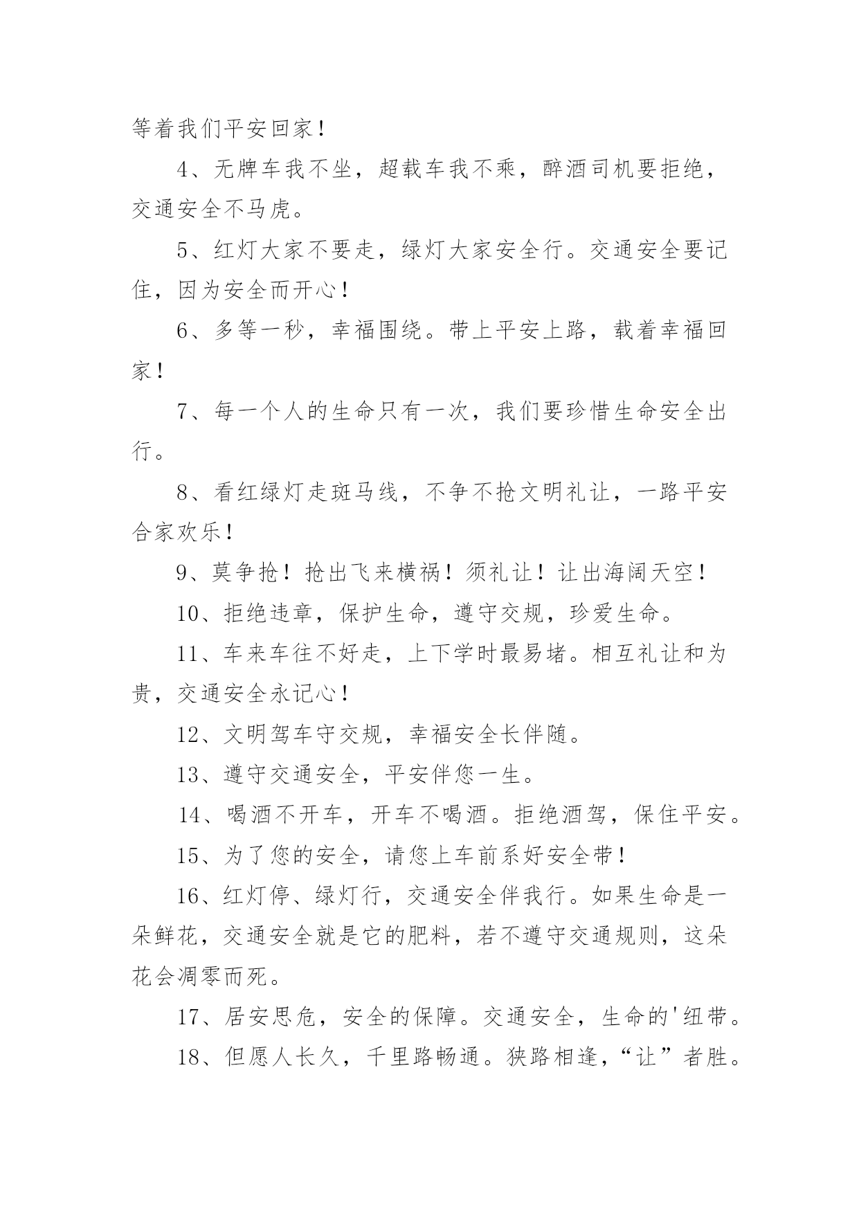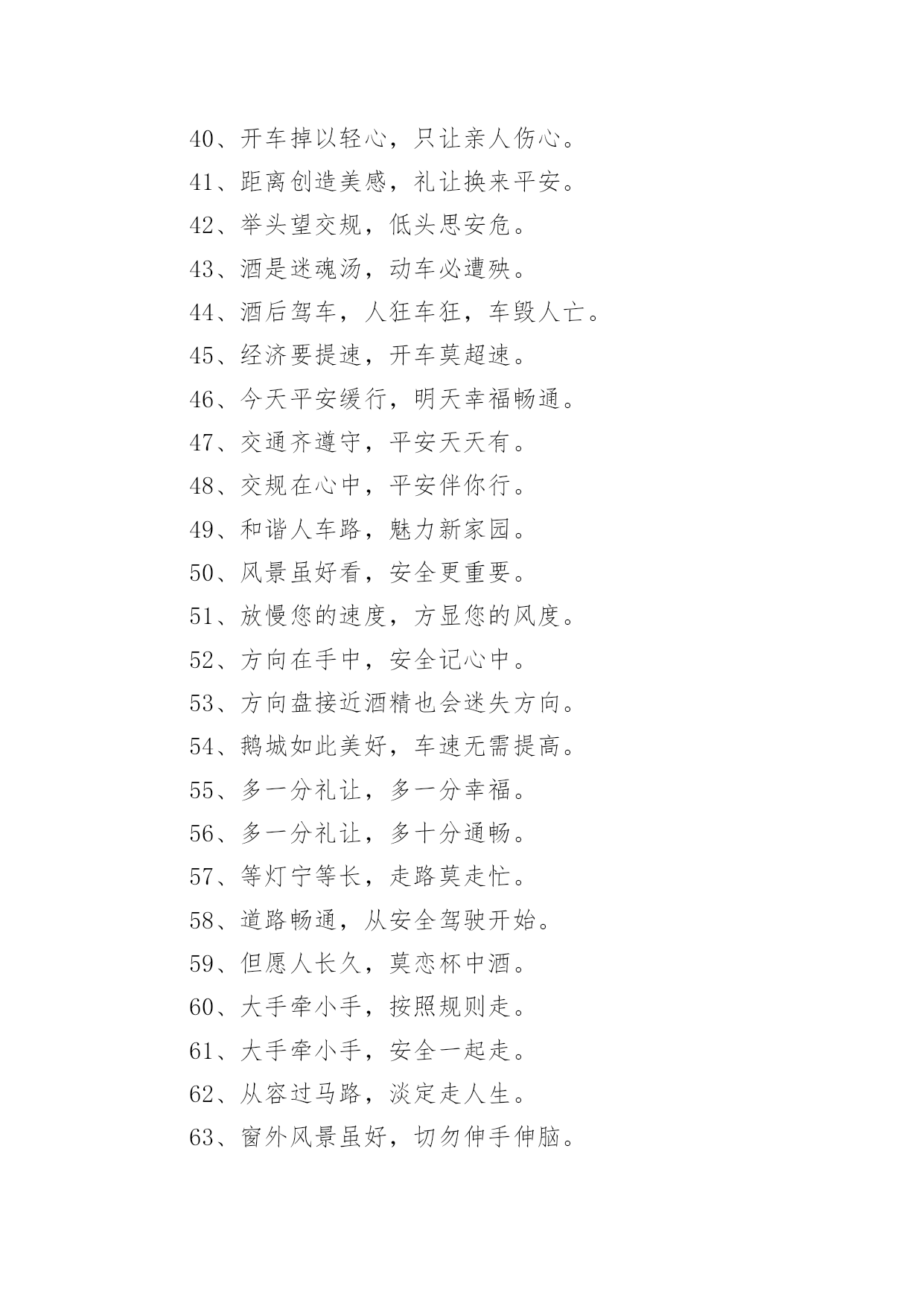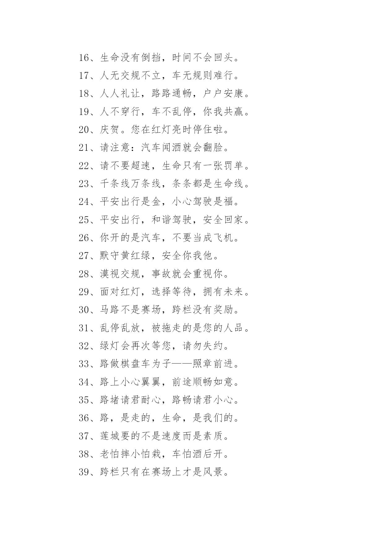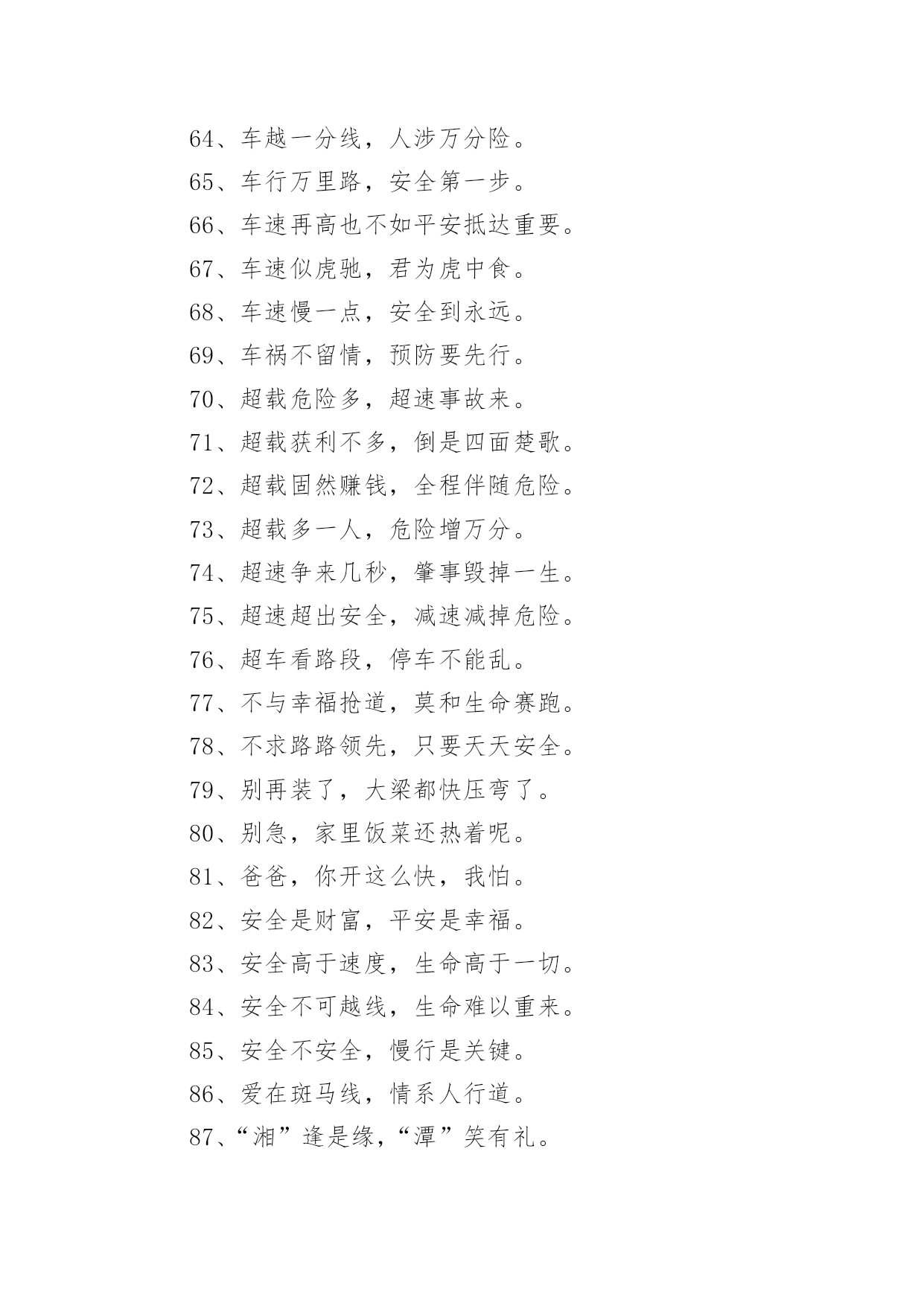 交通安全警示语交通安全警示语(实用15篇)在学习、工作或生活中,大家都接触过警示语吧,警示语就是对人物说话时的表现进行记叙描写,提示一下当前的情况。那么你有了解过警示语吗?下面是小编为大家整理的交通安全警示语,希望能够帮助到大家。交通安全警示语11、知否?知否?应是绿行红候。2、肇事多因粗率,和谐在于谦诚。3、一天的提醒,每一天的行动。4、行路平安为大,亲人盼你回家。5、行车你礼我让,一路街顺道畅。6、行车多点用心,家人少点担心。7、行车超载一人,危险增加万分。8、行车不闯红灯,生命不亮红灯。9、先行的.是礼让,后行的是车辆。10、勿与车辆赛跑,要与生命同步。11、停,红灯时短;行,生命时长。12、司机一杯(喝)酒,亲人眼泪流。13、司机开车用心,市民出行放心。14、司机喝多少酒,亲人流多少泪。15、事故源于违章,安全源于责任。16、生命没有倒挡,时间不会回头。17、人无交规不立,车无规则难行。18、人人礼让,路路通畅,户户安康。19、人不穿行,车不乱停,你我共赢。20、庆贺。您在红灯亮时停住啦。21、请注意:汽车闻酒就会翻脸。22、请不要超速,生命只有一张罚单。23、千条线万条线,条条都是生命线。24、平安出行是金,小心驾驶是福。25、平安出行,和谐驾驶,安全回家。26、你开的是汽车,不要当成飞机。27、默守黄红绿,安全你我他。28、漠视交规,事故就会重视你。29、面对红灯,选择等待,拥有未来。30、马路不是赛场,跨栏没有奖励。31、乱停乱放,被拖走的是您的人品。32、绿灯会再次等您,请勿失约。33、路做棋盘车为子——照章前进。34、路上小心翼翼,前途顺畅如意。35、路堵请君耐心,路畅请君小心。36、路,是走的,生命,是我们的。37、莲城要的不是速度而是素质。38、老怕摔小怕栽,车怕酒后开。39、跨栏只有在赛场上才是风景。40、开车掉以轻心,只让亲人伤心。41、距离创造美感,礼让换来平安。42、举头望交规,低头思安危。43、酒是迷魂汤,动车必遭殃。44、酒后驾车,人狂车狂,车毁人亡。45、经济要提速,开车莫超速。46、今天平安缓行,明天幸福畅通。47、交通齐遵守,平安天天有。48、交规在心中,平安伴你行。49、和谐人车路,魅力新家园。50、风景虽好看,安全更重要。51、放慢您的速度,方显您的风度。52、方向在手中,安全记心中。53、方向盘接近酒精也会迷失方向。54、鹅城如此美好,车速无需提高。55、多一分礼让,多一分幸福。56、多一分礼让,多十分通畅。57、等灯宁等长,走路莫走忙。58、道路畅通,从安全驾驶开始。59、但愿人长久,莫恋杯中酒。60、大手牵小手,按照规则走。61、大手牵小手,安全一起走。62、从容过马路,淡定走人生。63、窗外风景虽好,切勿伸手伸脑。64、车越一分线,人涉万分险。65、车行万里路,安全第一步。66、车速再高也不如平安抵达重要。67、车速似虎驰,君为虎中食。68、车速慢一点,安全到永远。69、车祸不留情,预防要先行。70、超载危险多,超速事故来。71、超载获利不多,倒是四面楚歌。72、超载固然赚钱,全程伴随危险。73、超载多一人,危险增万分。74、超速争来几秒,肇事毁掉一生。75、超速超出安全,减速减掉危险。76、超车看路段,停车不能乱。77、不与幸福抢道,莫和生命赛跑。78、不求路路领先,只要天天安全。79、别再装了,大梁都快压弯了。80、别急,家里饭菜还热着呢。81、爸爸,你开这么快,我怕。82、安全是财富,平安是幸福。83、安全高于速度,生命高于一切。84、安全不可越线,生命难以重来。85、安全不安全,慢行是关键。86、爱在斑马线,情系人行道。87、“湘”逢是缘,“潭”笑有礼。交通安全警示语21、遵守交通信号,安全文明出行。2、安全,幸福的守护神。3、提高全民安全意识,增强自我保护能力。4、春运安全连万家,平安全靠你我他。5、抵制不文明交通行为,共创和谐平安社会。6、警钟,生活的`惊叹号。7、一人出车全家念,一人平安全家福。8、亲人有交代,系好安全带,开车不比赛,平安时刻在。9、平安春运,我们同行。10、山川秀丽路漫漫,亲人盼归情切切。11、不乘违法车辆,确保乘车安全。12、争道抢行埋隐患,违法超车酿祸端。13、奋战春运四十天,家家平安人人乐。14、为了万家团圆,确保春运安全。15、超载超速,步步惊心。16、司机休息好,开车能聚宝。17、一车生命握在手,安全驾驶记心头。18、公司上下齐努力,坚决打赢春运工作第一仗。19、处罚违章不留情,看似无情最深情。20、爱家庭,无视交规等于零。21、安全是父母的寄托,安全是妻子的企盼。22、查隐患,堵漏洞,保安全。23、行路慎为本,开车礼当先,不逞一时勇,安全又畅顺。24、和谐春运,平安出行。25、谨慎驾驶勿大意,平安回家享团圆。26、爱妻爱子爱家庭