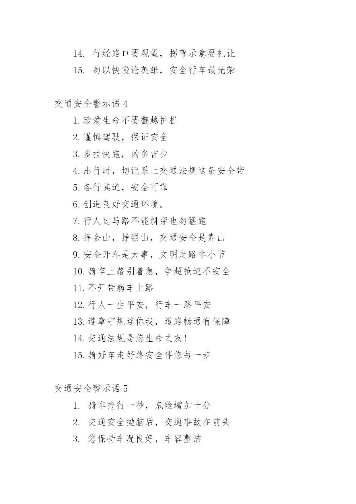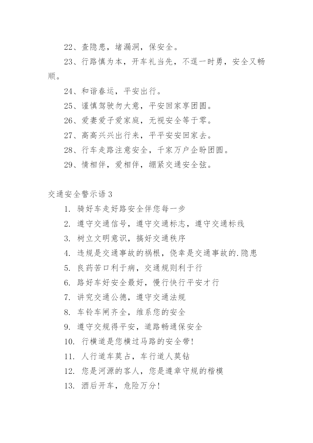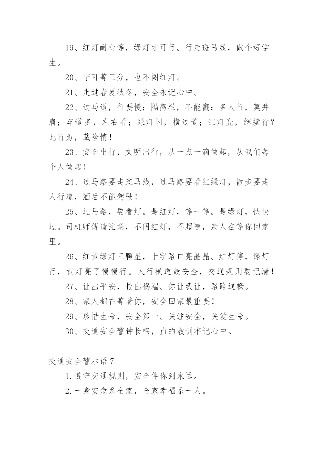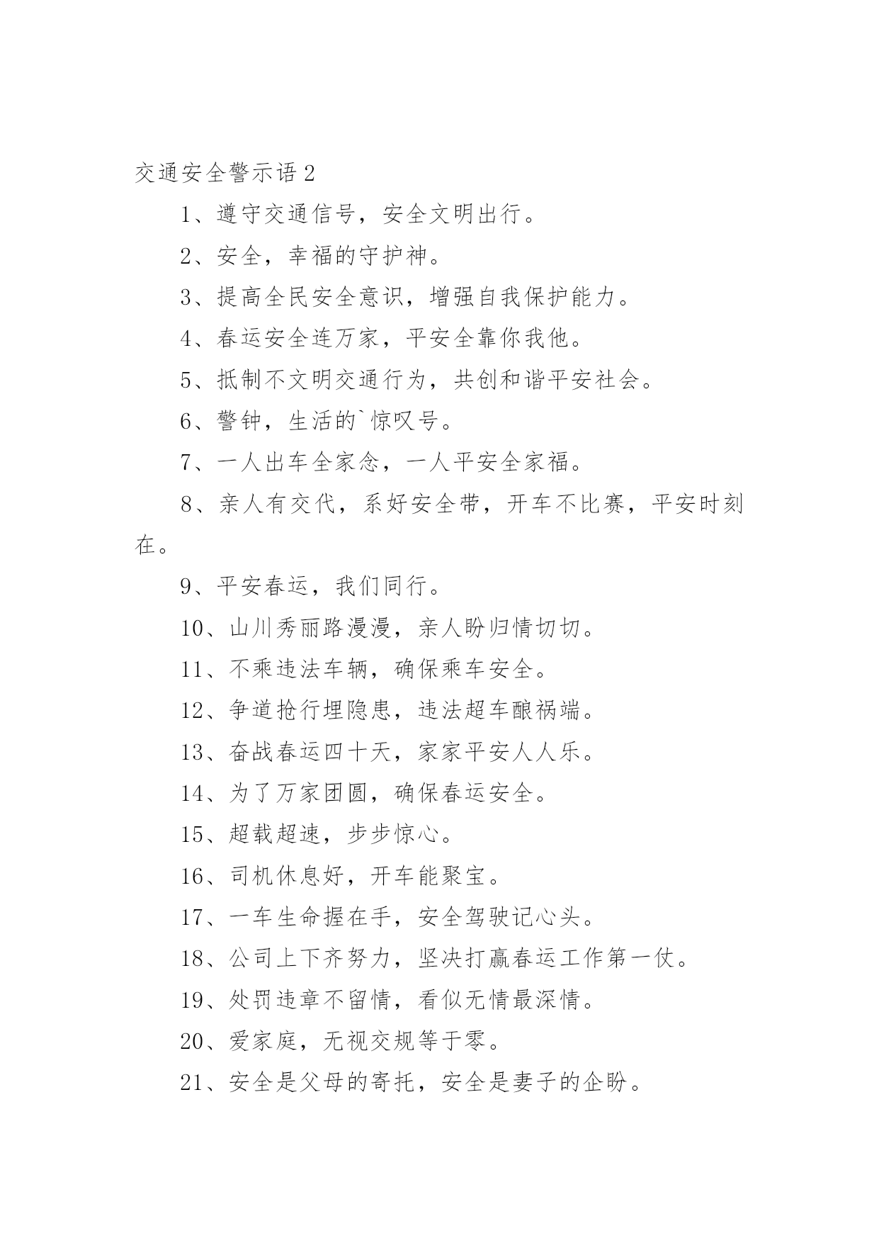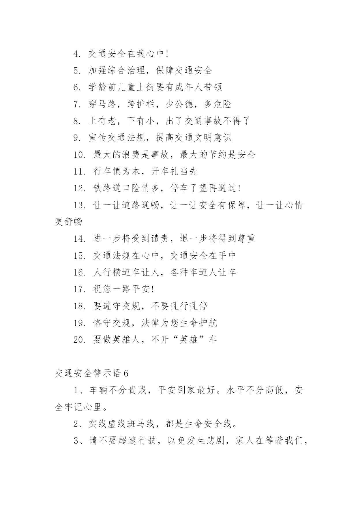 交通安全警示语交通安全警示语(实用15篇)在学习、工作或生活中,大家都接触过警示语吧,警示语就是对人物说话时的表现进行记叙描写,提示一下当前的情况。那么你有了解过警示语吗?下面是小编为大家整理的交通安全警示语,希望能够帮助到大家。交通安全警示语11、知否?知否?应是绿行红候。2、肇事多因粗率,和谐在于谦诚。3、一天的提醒,每一天的行动。4、行路平安为大,亲人盼你回家。5、行车你礼我让,一路街顺道畅。6、行车多点用心,家人少点担心。7、行车超载一人,危险增加万分。8、行车不闯红灯,生命不亮红灯。9、先行的.是礼让,后行的是车辆。10、勿与车辆赛跑,要与生命同步。11、停,红灯时短;行,生命时长。12、司机一杯(喝)酒,亲人眼泪流。13、司机开车用心,市民出行放心。14、司机喝多少酒,亲人流多少泪。15、事故源于违章,安全源于责任。16、生命没有倒挡,时间不会回头。17、人无交规不立,车无规则难行。18、人人礼让,路路通畅,户户安康。19、人不穿行,车不乱停,你我共赢。20、庆贺。您在红灯亮时停住啦。21、请注意:汽车闻酒就会翻脸。22、请不要超速,生命只有一张罚单。23、千条线万条线,条条都是生命线。24、平安出行是金,小心驾驶是福。25、平安出行,和谐驾驶,安全回家。26、你开的是汽车,不要当成飞机。27、默守黄红绿,安全你我他。28、漠视交规,事故就会重视你。29、面对红灯,选择等待,拥有未来。30、马路不是赛场,跨栏没有奖励。31、乱停乱放,被拖走的是您的人品。32、绿灯会再次等您,请勿失约。33、路做棋盘车为子——照章前进。34、路上小心翼翼,前途顺畅如意。35、路堵请君耐心,路畅请君小心。36、路,是走的,生命,是我们的。37、莲城要的不是速度而是素质。38、老怕摔小怕栽,车怕酒后开。39、跨栏只有在赛场上才是风景。40、开车掉以轻心,只让亲人伤心。41、距离创造美感,礼让换来平安。42、举头望交规,低头思安危。43、酒是迷魂汤,动车必遭殃。44、酒后驾车,人狂车狂,车毁人亡。45、经济要提速,开车莫超速。46、今天平安缓行,明天幸福畅通。47、交通齐遵守,平安天天有。48、交规在心中,平安伴你行。49、和谐人车路,魅力新家园。50、风景虽好看,安全更重要。51、放慢您的速度,方显您的风度。52、方向在手中,安全记心中。53、方向盘接近酒精也会迷失方向。54、鹅城如此美好,车速无需提高。55、多一分礼让,多一分幸福。56、多一分礼让,多十分通畅。57、等灯宁等长,走路莫走忙。58、道路畅通,从安全驾驶开始。59、但愿人长久,莫恋杯中酒。60、大手牵小手,按照规则走。61、大手牵小手,安全一起走。62、从容过马路,淡定走人生。63、窗外风景虽好,切勿伸手伸脑。64、车越一分线,人涉万分险。65、车行万里路,安全第一步。66、车速再高也不如平安抵达重要。67、车速似虎驰,君为虎中食。68、车速慢一点,安全到永远。69、车祸不留情,预防要先行。70、超载危险多,超速事故来。71、超载获利不多,倒是四面楚歌。72、超载固然赚钱,全程伴随危险。73、超载多一人,危险增万分。74、超速争来几秒,肇事毁掉一生。75、超速超出安全,减速减掉危险。76、超车看路段,停车不能乱。77、不与幸福抢道,莫和生命赛跑。78、不求路路领先,只要天天安全。79、别再装了,大梁都快压弯了。80、别急,家里饭菜还热着呢。81、爸爸,你开这么快,我怕。82、安全是财富,平安是幸福。83、安全高于速度,生命高于一切。84、安全不可越线,生命难以重来。85、安全不安全,慢行是关键。86、爱在斑马线,情系人行道。87、“湘”逢是缘,“潭”笑有礼。交通安全警示语21、遵守交通信号,安全文明出行。2、安全,幸福的守护神。3、提高全民安全意识,增强自我保护能力。4、春运安全连万家,平安全靠你我他。5、抵制不文明交通行为,共创和谐平安社会。6、警钟,生活的`惊叹号。7、一人出车全家念,一人平安全家福。8、亲人有交代,系好安全带,开车不比赛,平安时刻在。9、平安春运,我们同行。10、山川秀丽路漫漫,亲人盼归情切切。11、不乘违法车辆,确保乘车安全。12、争道抢行埋隐患,违法超车酿祸端。13、奋战春运四十天,家家平安人人乐。14、为了万家团圆,确保春运安全。15、超载超速,步步惊心。16、司机休息好,开车能聚宝。17、一车生命握在手,安全驾驶记心头。18、公司上下齐努力,坚决打赢春运工作第一仗。19、处罚违章不留情,看似无情最深情。20、爱家庭,无视交规等于零。21、安全是父母的寄托,安全是妻子的企盼。22、查隐患,堵漏洞,保安全。23、行路慎为本,开车礼当先,不逞一时勇,安全又畅顺。24、和谐春运,平安出行。25、谨慎驾驶勿大意,平安回家享团圆。26、爱妻爱子爱家庭