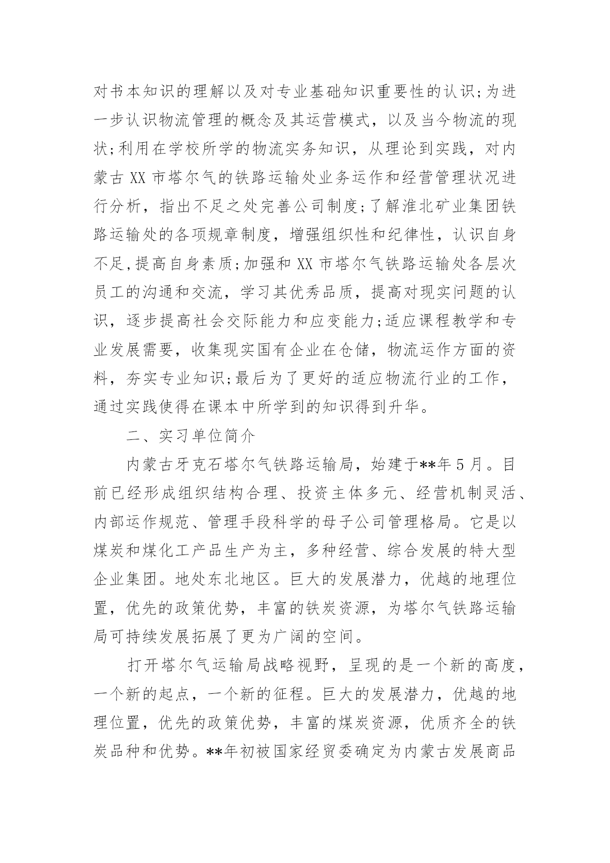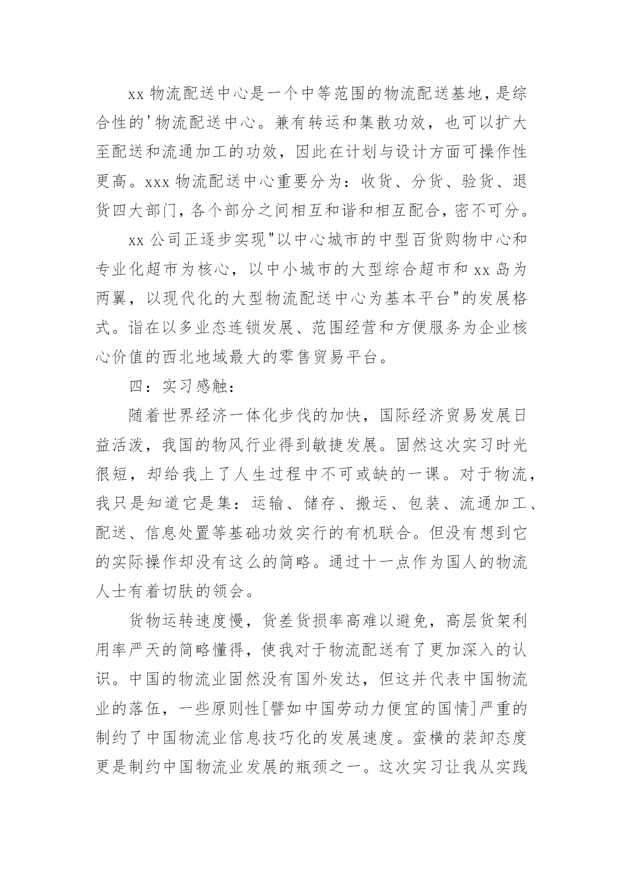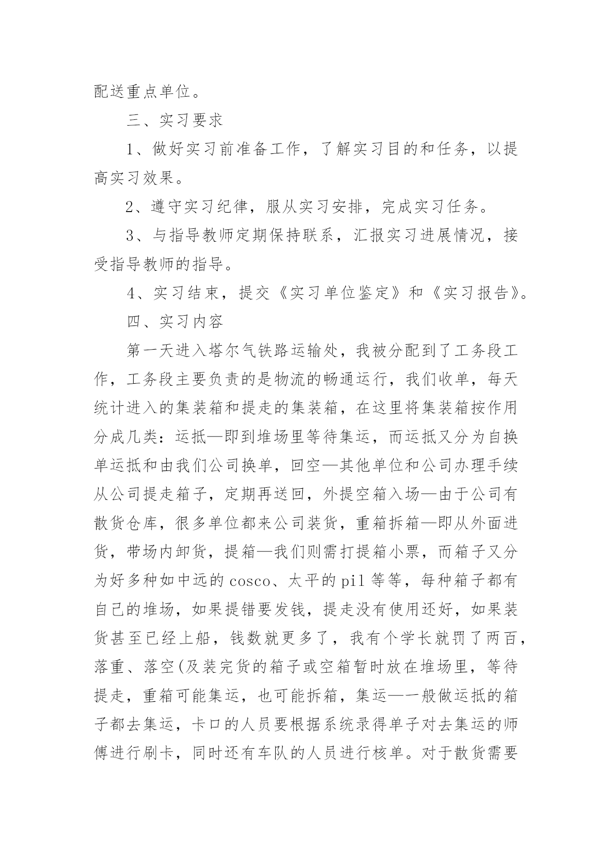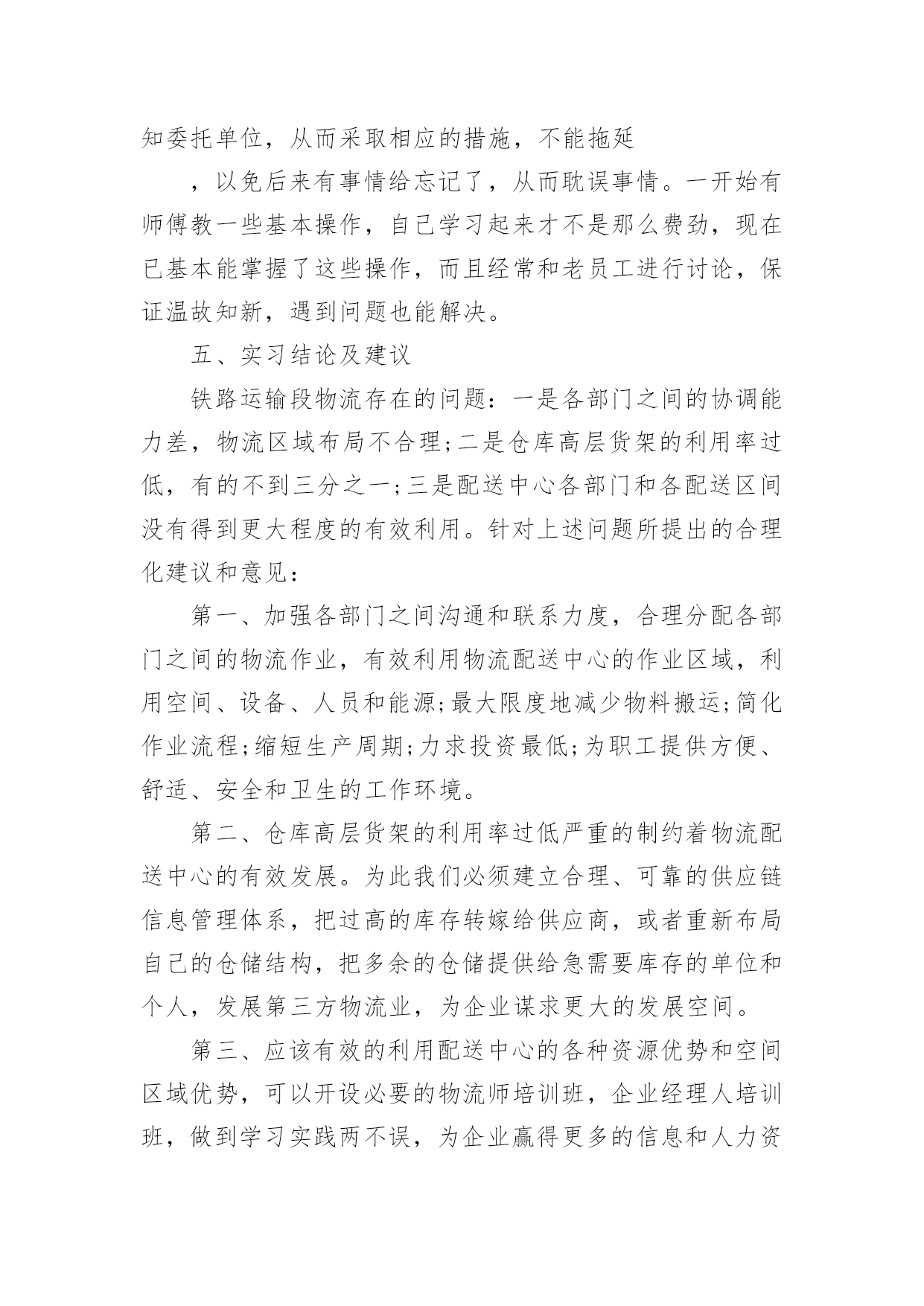 物流的实习报告【精华】物流的实习报告范文锦集九篇在人们素养不断提高的今天,报告的用途越来越大,多数报告都是在事情做完或发生后撰写的。其实写报告并没有想象中那么难,下面是小编为大家收集的物流的实习报告9篇,欢迎阅读与收藏。物流的实习报告篇1本人是物流专业的学生,这段时间来在物流公司实习,了解了很多也学习到了很多,下面是我实习时候的一些心得和报告!一:实习目标:为了以后能更好的适应工作和学习,学校组织到xx物流配送中心进行动期十天的实习。重要是为了懂得物流的作业流程,以便对我国的物流业能有更深的懂得。二:实习请求:了解物流的特色,佳吉货运,主要装备和作业流程,对其进行剖析。并根据学习的理论提出自己的看法。三:实习单位简介:配送中心是以组织配送性销售或供给,履行实物配送为重要职能的流通型结点。具有集货中心、分货中心的职能。xx公司是在xx连锁超市基本了发展起来的大型企业,拥有大型百货购物中心,社区连锁超市,中心城市xx岛为支柱的三大贸易,并以现代物流配送中心为支撑平台。xx物流配送中心是一个中等范围的物流配送基地,是综合性的'物流配送中心。兼有转运和集散功效,也可以扩大至配送和流通加工的功效,因此在计划与设计方面可操作性更高。xxx物流配送中心重要分为:收货、分货、验货、退货四大部门,各个部分之间相互和谐和相互配合,密不可分。xx公司正逐步实现"以中心城市的中型百货购物中心和专业化超市为核心,以中小城市的大型综合超市和xx岛为两翼,以现代化的大型物流配送中心为基本平台"的发展格式。诣在以多业态连锁发展、范围经营和方便服务为企业核心价值的西北地域最大的零售贸易平台。四:实习感触:随着世界经济一体化步伐的加快,国际经济贸易发展日益活泼,我国的物风行业得到敏捷发展。固然这次实习时光很短,却给我上了人生过程中不可或缺的一课。对于物流,我只是知道它是集:运输、储存、搬运、包装、流通加工、配送、信息处置等基础功效实行的有机联合。但没有想到它的实际操作却没有这么的简略。通过十一点作为国人的物流人士有着切肤的领会。货物运转速度慢,货差货损率高难以避免,高层货架利用率严天的简略懂得,使我对于物流配送有了更加深入的认识。中国的物流业固然没有国外发达,但这并代表中国物流业的落伍,一些原则性[譬如中国劳动力便宜的国情]严重的制约了中国物流业信息技巧化的发展速度。蛮横的装卸态度更是制约中国物流业发展的瓶颈之一。这次实习让我从实践中了解到了物流,使实践与理论更好的联合。在这里我深入的领悟到了一个观点:推进你的事业,搬场公司,不要让你的事业来推进你。五:实习结论及建议:1、进货堆放货物时不能只顾着一时的便利,应当斟酌到出货时的便利,不能延误客户的时光,因此要依照尺度把货物堆起,堆放要整洁公道,以免倒塌。2、要严厉依照仓储治理的请求,对于过期的货物要及时与厂家接洽,并得到应允后及时烧毁,佳吉快运,不要堆积在仓库中,挥霍仓库容积,更不要和正常的商品同放一起,带给人一种混乱无章的感到。应当另外筹备一间仓库,使那些一时无法烧毁的商品有处所储存。3、目前物流中心正面临很多问题,批次越来越多而批量却越来越小,造成物流治理上的一个难点。产前物流,企业内部物流,销售物流,在供给链的治理上如何把握住这三块之间的关系。国内的物流畅润太低,仅占5%,如何把利润搞上往。面临一系列的困难,物流中心还得多借鉴国外的物流策略,进步自己企业的效益。物流的实习报告篇2一、实习目的想通过亲身体验实习,找出自己的不足和差距所在,让自己更进一步了解社会,在实习中增长见识,锻炼自己的才干,培养自己的韧性,更为重要的是检验一下自己所学的东西能否被社会所用,自己的能力能否被社会所承认。为加强对书本知识的理解以及对专业基础知识重要性的认识;为进一步认识物流管理的概念及其运营模式,以及当今物流的现状;利用在学校所学的物流实务知识,从理论到实践,对内蒙古XX市塔尔气的铁路运输处业务运作和经营管理状况进行分析,指出不足之处完善公司制度;了解淮北矿业集团铁路运输处的各项规章制度,增强组织性和纪律性,认识自身不足,提高自身素质;加强和XX市塔尔气铁路运输处各层次员工的沟通和交流,学习其优秀品质,提高对现实问题的认识,逐步提高社会交际能力和应变能力;适应课程教学和专业发展需要,收集现实国有企业在仓储,物流运作方面的资料,夯实专业知识;最后为了更好的适应物流行业的工作,通过实践使得在课本中所学到的知识得到升华。二、实习单位简介内蒙古牙克石塔尔气铁路运输局,始建于**年5月。目前已经形成组织结构合理、投资主体多元、经营机制灵活、内部运作规范、管理手段科学的母子公司管理格局。它是以煤炭和煤化工产品生产为主,多种经营、综合发展的特大型企业集团。地处东北地区。巨大的发展潜力,优越的地理位置,优先的政策优势,丰富的铁炭资源,为塔