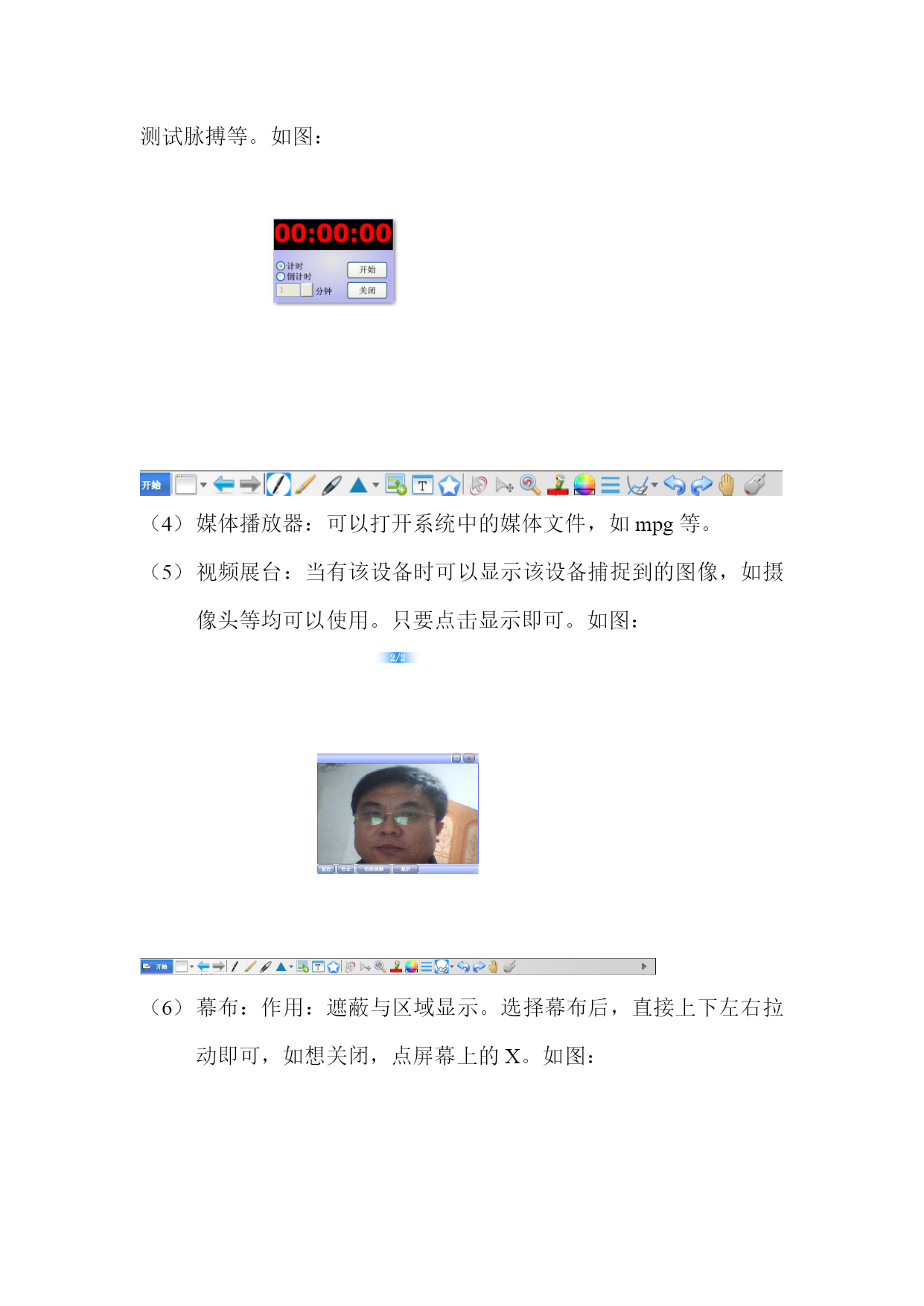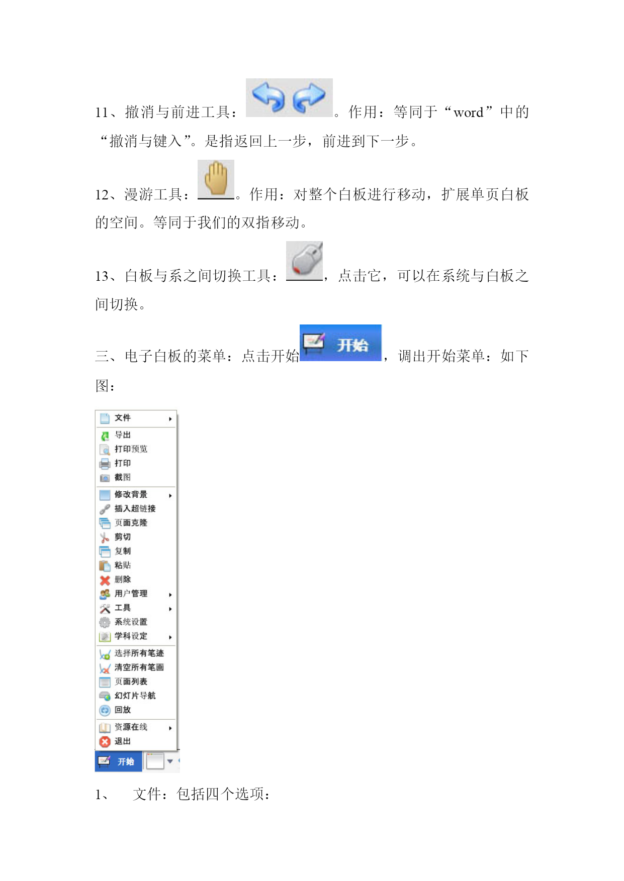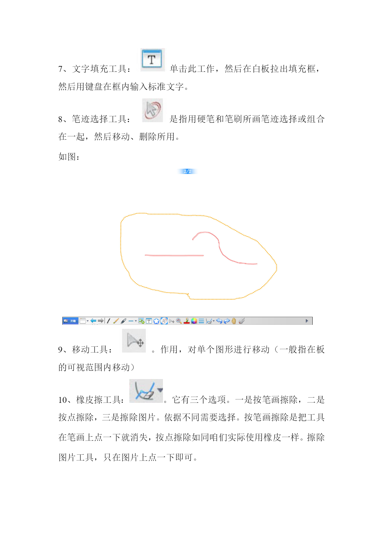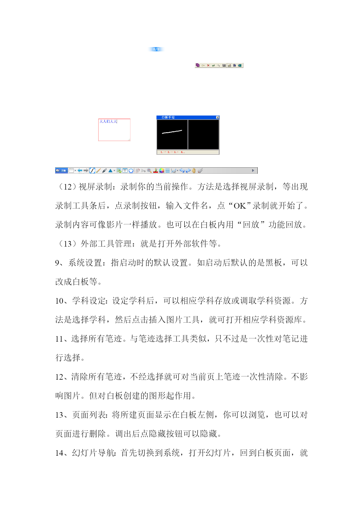 市六中电子白板使用简明教程一、在桌面上找到启动图标,双击启动。进入电子白板的初始界面。二、认识电子白板的工具:1、新建页面工具:。新建页面工具的功能点击新建页面工具右侧下拉三解。如图(1)默认的是新建黑板,还包括新建白板,新建图片背景面,新建批注面。这里面新建黑板、新建白板,其实就是相当于咱们的黑板,也就是咱们的工作界面。我们将在上面进行绘图、写字、批注、演示等各种操作。但它的优点是,黑板(或白板的空间可以无限拓展,当我们用完一块后,再建一块,依次类推,我们就有了无数个黑板,这些黑板(或白板)可以重复调用。(2)新建图片背景页面:是选择一个图片作为黑板的工作界面,也可以理解成图板或采板,我们在这个上面当作黑板用。如下图(3)新建批注页面:是指将当前桌面打开的文件添加批注,(或调入后进行交互)方法是在系统模式下打开要交互或需批注的文件,返回到白板,文件将自动调入白板,这时我们就可以加批注了。如下图:3、翻页工具:如图。作用,当你建了多块黑板时,可以点击左右箭头,向前或向后翻。如果呈灰色,说明只有当前页。如果左前头呈灰色,说明已是第一页,如果右箭头呈灰色,说明已是最后一页。4、硬笔、排笔、智能笔工具:。方法是使用哪一个,单击哪一个。三笔工具要配合“画笔颜色”,和“线宽工具”使用。(1)硬笔与排笔的特点比较:如果(2)智能笔的特点:能自动平滑划线。5、几何图形工具如图:。点击右面的下拉三角,选择需要画的图形,在白板上画即可,如画三角形,选择工具后,先点一个顶点,再在另两个顶点分别点一下即可。但,要配合“填充几何图形工具”和“填充几何图形颜色工具”来使用。使用方法是,首先用几何图形工具画图,再使用“填充几何图形颜色工具”选择颜色。最后选择“几何图形填充工具”,然后在图形上点一下就行了。6、插入图片工具:将系统中的图片插入白板中使用,一般结合旋转与缩放工具使用。将白板上的图片旋转或缩放。7、文字填充工具:单击此工作,然后在白板拉出填充框,然后用键盘在框内输入标准文字。8、笔迹选择工具:是指用硬笔和笔刷所画笔迹选择或组合在一起,然后移动、删除所用。如图:9、移动工具:。作用,对单个图形进行移动(一般指在板的可视范围内移动)10、橡皮擦工具:。它有三个选项。一是按笔画擦除,二是按点擦除,三是擦除图片。依据不同需要选择。按笔画擦除是把工具在笔画上点一下就消失,按点擦除如同咱们实际使用橡皮一样。擦除图片工具,只在图片上点一下即可。11、撤消与前进工具:。作用:等同于“word”中的“撤消与键入”。是指返回上一步,前进到下一步。12、漫游工具:。作用:对整个白板进行移动,扩展单页白板的空间。等同于我们的双指移动。13、白板与系之间切换工具:,点击它,可以在系统与白板之间切换。三、电子白板的菜单:点击开始,调出开始菜单:如下图:文件:包括四个选项:新建文件:相当于我们关掉白板又重新打开。打开文件:作用,可以调入我们常用的文件,如word,ppt等。但最重要的是,我们可以将一节课所讲内容存起来,然后打开,就可以重放上节内容。保存和另存为是指对本次电子白板所使用的全部内容进行存储。导出:是指导出当前页内容。截图:截取系统桌面或文件图片。相当于QQ中的,截图。修改背景:是指修改白板背景,便于保护学生视力,或教学用。插入超链接:是指调用系统文件,或白板页。页面克隆:是指原样复制当前白板页。用户管理:是指每个教师建立自已不同的用户,白板会自动建立资源文件夹,便于自己上课时进行资料查找与使用。工具:里面含有我们大量常用工具,如图:(1)量角器使用:测量所画图形角度。如图要配合旋转与缩放使用。(2)三角板与直尺的使用与量角器类似。(3)计时器:计时器一般在做实验或学生答题时计时用。如科学课测试脉搏等。如图:媒体播放器:可以打开系统中的媒体文件,如mpg等。视频展台:当有该设备时可以显示该设备捕捉到的图像,如摄像头等均可以使用。只要点击显示即可。如图:幕布:作用:遮蔽与区域显示。选择幕布后,直接上下左右拉动即可,如想关闭,点屏幕上的X。如图:放大镜:显示图形细节所用,如想关闭,点屏幕上的X。探照灯:高亮突出显示重要区域。如想关闭,点屏幕上的X。软键盘:等同于系统软键盘,也只可在系统桌面下使用。作用不大。计算器:大家都熟悉,就不再赘述。手写识别:点击启动手写识别软件,在工具条件选择手写工具,打开书写窗口,再插入文本框,在书写窗口中手写,就可有标准字体出现文本框中。如图:(12)视屏录制:录制你的当前操作。方法是选择视屏录制,等出现录制工具条后,点录制按钮,输入文件名,点“OK”录制就开始了。录制内容可像影片一样播放。也可以在白板内用“回放”功能