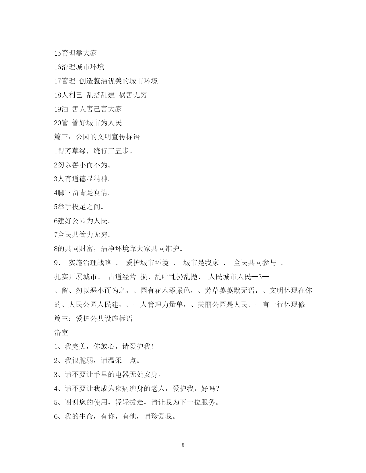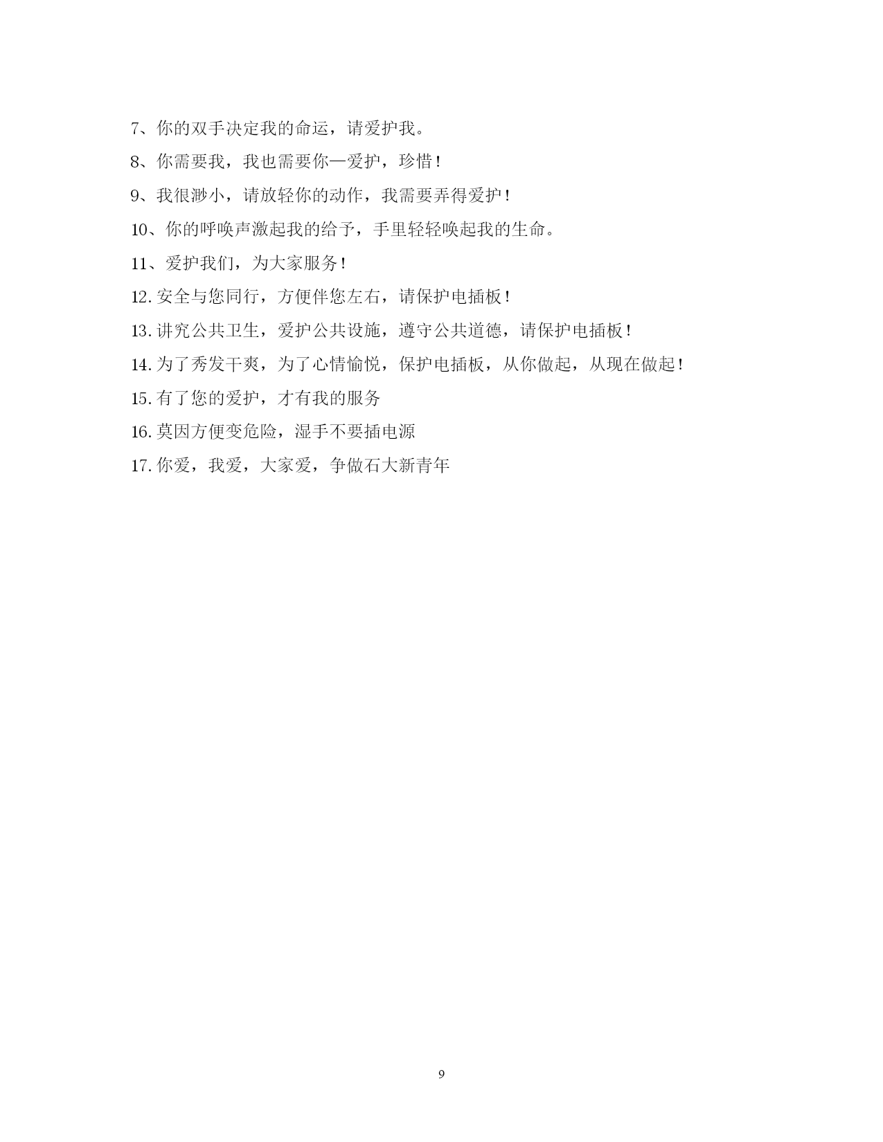 此资料由网络收集而来,如有侵权请告知上传者立即删除。资料共分享,我们负责传递知识。PAGEPAGE9爱护公共设施标语篇一:爱护公共设施的标语篇一:爱护公共设施标语浴室1、我完美,你放心,请爱护我!4、请不要让我成为疾病缠身的老人,爱护我,好吗?8、你需要我,我也需要你—爱护,珍惜!9、我很渺小,请放轻你的动作,我需要弄得爱护!11、爱护我们,为大家服务!12.安全与您同行,方便伴您左右,请保护电插板!13.讲究公共卫生,爱护公共设施,遵守公共道德,请保护电插板!14.为了秀发干爽,为了心情愉悦,保护电插板,从你做起,从现在做起!15.有了您的爱护,才有我的服务16.莫因方便变危险,湿手不要插电源17.你爱,我爱,大家爱,争做石大新青年篇二:爱护公共设施宣传标语爱护公共设施宣传标语开展“爱家乡、爱环境、我行动”主题教育实践活动方案一、指导思想二、组织领导建立由学校行政、德育组、少先队和班主任组成的组织领导机构,行政总协调,少先队具体负责,各班级抓落实,分工负责领导小组:组长:翟平副组长:郑志强严登云陈中山组员:杨宗成郭宝林邓文东各班班主任三、主要内容以教育引导学生践行社会公德、树立文明形象为重点,开展以下五项专题教育活动:四、实施步骤活动分三个阶段进行:第一阶段,宣传发动(6月1日——6月15日)。红领巾广播站将每天以“青春焕活力、文明构和谐”为主题进行播音,各中队组织出版黑板报、校刊等形式进行宣传。第二阶段,组织实施6月16日——6月30日)。(1)以“遵守交通规章,文明礼让出行”为主题,开展增强交通安全意识、自觉维护交通秩序,及不践踏草坪,爱护新区的一草一木等教育实践活动。(2)以“维护公共秩序,塑造公众形象”为主题,开展遵纪守法维护公众利益的道德教育实践。开展维护公共秩序的宣传教育活动,教育引导学生自觉遵守公众场所的有关规定、要求,在需要保持肃静的场合不大声喧哗,在公众场合不聚众起哄、闹事,在乘坐公交车、观看节目、游览景区等公众场所有秩序的排队乘车、购票、游览,做到行为得体,文明礼让。(3)以“爱护市容环境,共建美好家园”为主题,开展美化城市环境,爱护大自然和生态资源的教育实践活动。(5)以“推广礼貌用语,当好文明观众”为主题,大力开展文明礼仪教育实践活动。结合《小学生守则》、《小学生日常行为规范》的措施和规章,把重点放在对学生文明行为习惯的养成上,重视文明行为的反复训练,大力推广使用文明礼貌用语,认真纠正学生在学习、生活方面存在的不良习惯用语,使人人自觉做到不讲粗话脏话,不恶语相向,将文明礼貌用语从学校带到社区、家庭,带到公共场所,带到人际交往中,在全社会起示范带动作用。笫三阶段,检查考核(7月1日——7月15日)。①评选(校园、学校周边)文明之星②评选文明班级③评选“德育学科渗透”优秀案例④评选学雷锋积极分子⑤评选主题教育实践活动的优秀学生干部⑥主题教育实践活动表彰大会五、具体要求(一)抓教育引导。地、主课堂作用,将基本道德规范、文明公约、公德守则的宣传教育贯穿于各学科的教(二)抓规范管理。要结合学校的实际,认真制订与完善践行《小学生守则》和《小学生日常行为规范》的措施和规章,把重点放在对学生文明行为习惯的养成上,重视文明行为的反复训练,通过严格的训练和管理,养成在不同场合应具备的行为习惯。(四)抓典型示范。(五)抓贯彻落实。要把开展“青春焕活力、文明构和谐”主题教育实践活动作为加强学校德育工作的重要任务来抓,结合《中小学德育工作整体化意见》要求,制订各班的活动方案,明确落实要求,充分发挥学校各有关职能部门的组织协调作用,共同推进这一教育活动的广泛深入开展。篇二:爱护公共设施宣传标语爱护公共设施宣传标语篇三:爱护公共设施标语浴室1、我完美,你放心,请爱护我!4、请不要让我成为疾病缠身的老人,爱护我,好吗?8、你需要我,我也需要你—爱护,珍惜!9、我很渺小,请放轻你的动作,我需要弄得爱护!篇二:公用设施的宣传标语篇一:爱护公共设施宣传标语爱护公共设施宣传标语1、爱护路灯,争做文明市民。2、爱护公共设施,尽你我应有责任。3、路灯伤不起,你也伤不起。4爱护公共设施。56爱护公物人人赞。7伴您平安万里行。8争做文明标兵。9爱护公物齐关怀。10光明多一点。11你也累累伤痕。12爱惜自己;破坏公物就是践踏自己。13提高自我修养。14人有责,不可破坏,你我做到。15人人有责。16眼睛,请您爱护每一双眼睛。17宝如珍,公共设施,同享同乐。18有责。19走黑暗。20荣,以损坏公物为耻。21爱护公共设施。、提高自我修养,、请爱护公物。、人人有颗公德心,、路灯明,道