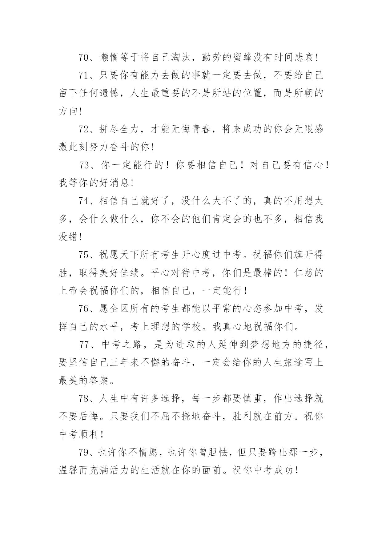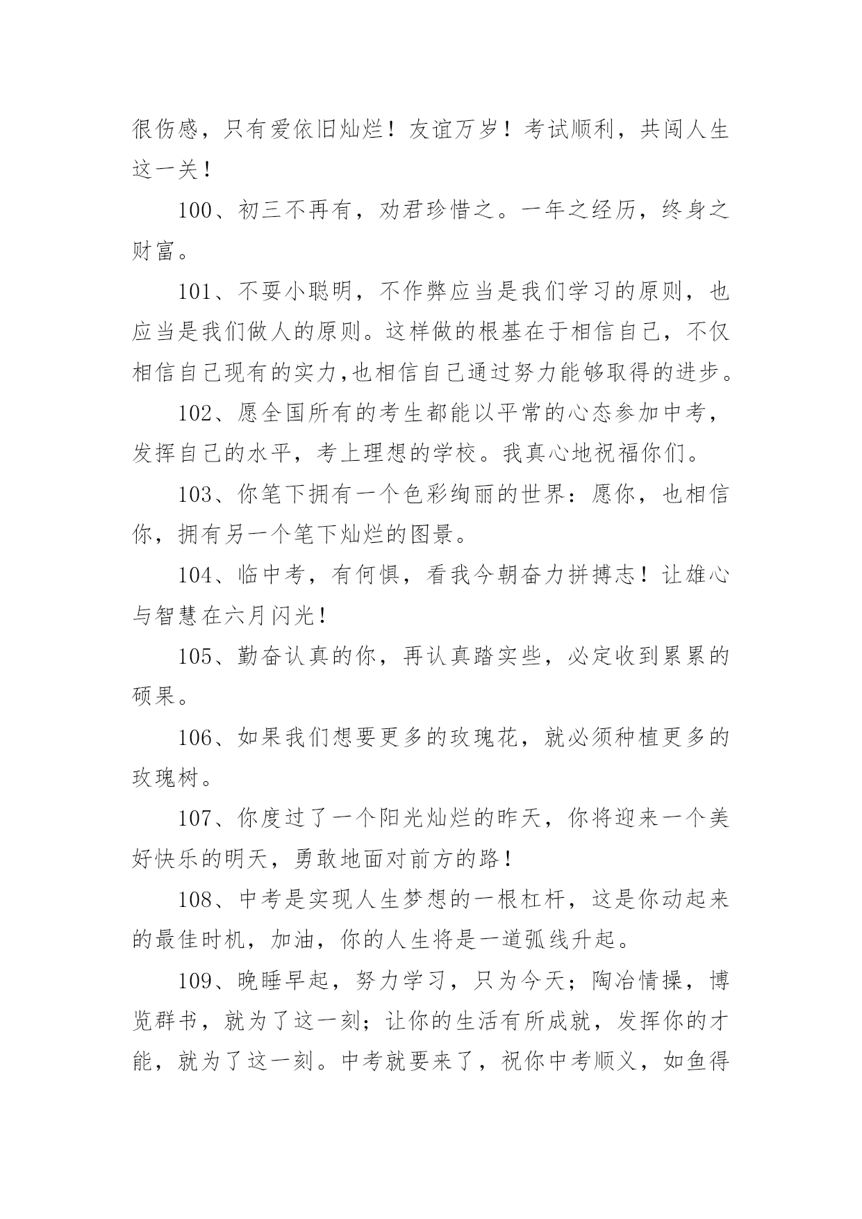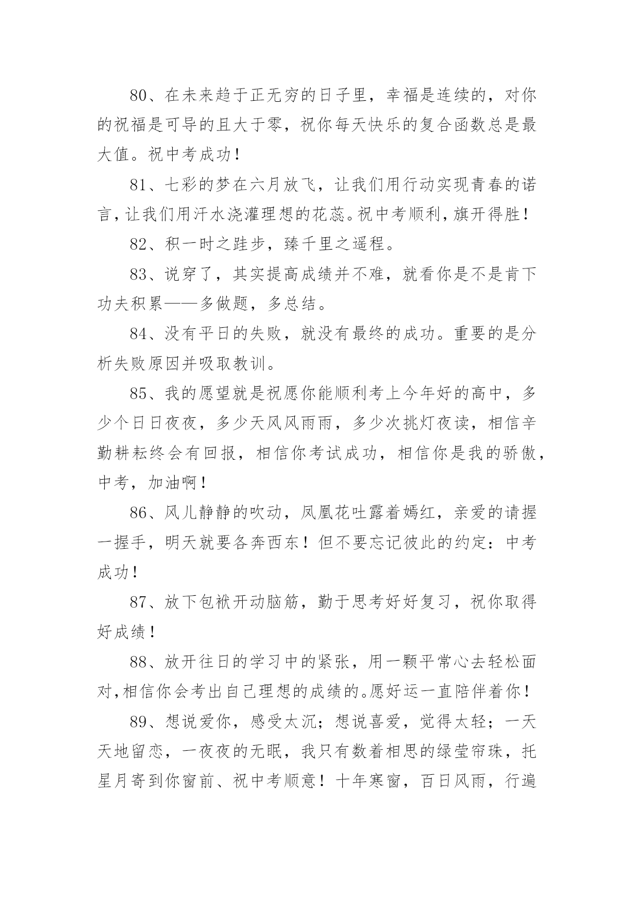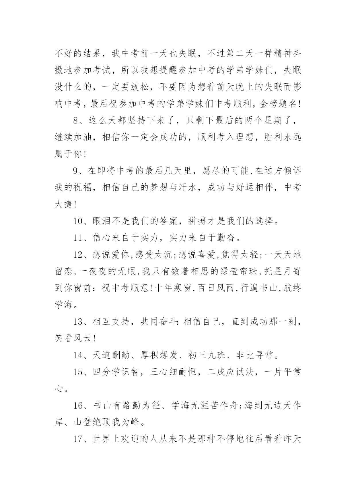 父母给中考孩子的祝福语父母给中考孩子的祝福语170句在我们平凡的日常里,大家一定都接触过祝福语吧,祝福语的种类很多,可分为吉日喜庆祝福语、寿诞祝福语、事业祝福语、祝酒词等。你所见过的祝福语是什么样的呢?下面是小编精心整理的父母给中考孩子的祝福语,欢迎阅读,希望大家能够喜欢。1、昨夜临阵磨枪,本想不快也光。如今面对试卷一张,谁知如此迷惘。过往所学皆忘,回忆往事沧桑。昔时心高气旺,幻想提名金榜。2、自信,是无尽智慧的凝聚。平淡,是成功路上的驿站。3、祝中考一切顺利成功!美梦成真!!4、祝愿天下所有考生开心度过中考。祝福你们旗开得胜,取得美好佳绩。平心对待中考,你们是最棒的!仁慈的上帝会祝福你们的,相信自己,一定能行!5、周星驰:曾经有一份认真的复习放在我面前,我没有珍惜,等我失去的时候才后悔莫及,人世间最痛苦的事莫过于此。假如教委能够给我一个再来一次的机会,我会对自己说三个字:学彻底。假如非要在这份学习加上一个期限,我希望是……就半年!6、终有一天,相约巅峰欢呼起舞!祝考试顺利!7、中考的前一天晚上肯定有人失眠,这都是自己心态不好的结果,我中考前一天也失眠,不过第二天一样精神抖擞地参加考试,所以我想提醒参加中考的学弟学妹们,失眠没什么的,一定要放松,不要因为想着前天晚上的失眠而影响中考,最后祝参加中考的学弟学妹们中考顺利,金榜题名!8、这么天都坚持下来了,只剩下最后的两个星期了,继续加油,相信你一定会成功的,顺利考入理想,胜利永远属于你!9、在即将中考的最后几天里,愿尽的可能,在远方倾诉我的祝福,相信自己的梦想与汗水,成功与好运相伴,中考大捷!10、眼泪不是我们的答案,拼搏才是我们的选择。11、信心来自于实力,实力来自于勤奋。12、想说爱你,感受太沉;想说喜爱,觉得太轻;一天天地留恋,一夜夜的无眠,我只有数着相思的绿莹帘珠,托星月寄到你窗前:祝中考顺意!十年寒窗,百日风雨,行遍书山,航终学海。13、相互支持,共同奋斗:相信自己,直到成功那一刻,笑看风云!14、天道酬勤、厚积薄发、初三九班、非比寻常。15、四分学识智,三心细耐恒,二成应试法,一片平常心。16、书山有路勤为径、学海无涯苦作舟;海到无边天作岸、山登绝顶我为峰。17、世界上欢迎的人从来不是那种不停地往后看着昨天的困苦、悲伤、失败和惨痛挫折的人,而是那种怀着信心、希望、勇气和愉快的求知欲而放眼未来的人。18、风采来自球场的只是微小,它更大的意义上,只来自一个男儿对未来的真正坚守!19、当离别拉开窗帘,当回忆睡在胸前,要说再见真的很伤感,只有爱依旧灿烂!友谊万岁!考试顺利,共闯人生这一关!20、不思,故有惑;不求,故无得;不问,故不知!21、时间自有公道,付出总有回报。说到不如做到,要做就做最好!22、人若无志,与禽兽同类!进步,意味着目标不断前移,阶段不断更新,视野不断开阔!23、一路风雨前程磨砺意志,半载苦乐同享铸就辉煌!24、初三中考高目标,苦学善学上好学!25、小喜鹊造新房,小蜜蜂采蜜忙,幸福的绩点从哪里来,要靠勤奋来创造!26、彩虹总在风雨后,阳光总在乌云后,成功总在失败后!27、用勤奋弥补先天不足,让拼搏开辟后天之路!28、淡薄功利,轻装前进;不计付出,坚韧不拔;不达目的,誓不罢休!29、再苦再难,也要坚强,只为那些期待的眼神!30、别想一下造出大海,必须先由小河川开始!31、放开往日的学习中的紧张,用一颗平常心去轻松面对,相信期末大考你会考出自己理想的成绩。愿好运一直陪伴着你!32、明天的希望,让我们忘了今天的痛苦!33、机不可失,锱铢必较谱写人生!知识是取之不尽的矿山,你越往深处挖掘,你就越会得到更加丰富的宝藏!34、做一题会一题,一题决定命运!抓住今天吧!紧紧地把它抓住吧!今天的分分秒秒,都要有所作为,有所进步,有所登攀!35、如果你不努力争取你想要的,那你永远都不会拥有它!36、不管追求什么目标,都应坚持不懈!37、环境不会改变,解决之道在于改变自己!38、愿你像颗种子,勇敢地冲破泥沙,将嫩绿的幼芽伸出地面,指向天空!39、即使是不成熟的尝试,也胜于胎死腹中的策略!40、非学无以广才,非志无以成学!不积硅步,无以至千里;不积小流,无以成江海!41、奋斗改变命运,拼搏成就辉煌!自信,是智慧的凝聚;能力,是平日的努力,心态,是取胜的关键;祝福,是友谊的歌。考试已至,愿你旗开得胜,取得好成绩!42、期末考试顺利,身体健康,一切都好!相信自己,你们一定是最棒的!又到年末了,马上就要迎来期末考试了,让我鼓励你,祝福你,祝你考出好的成绩!43、今天多一份拼搏,明天多几份欢笑!44、再长的路,一步步也能走完,再短的路,不迈开双脚也无法到达!45、作业考试化,考试中考化,将平时考试当中考,中考考试当平时!46、废铁之所以能成为有用的钢材,是因为它经得起痛苦的磨练!47