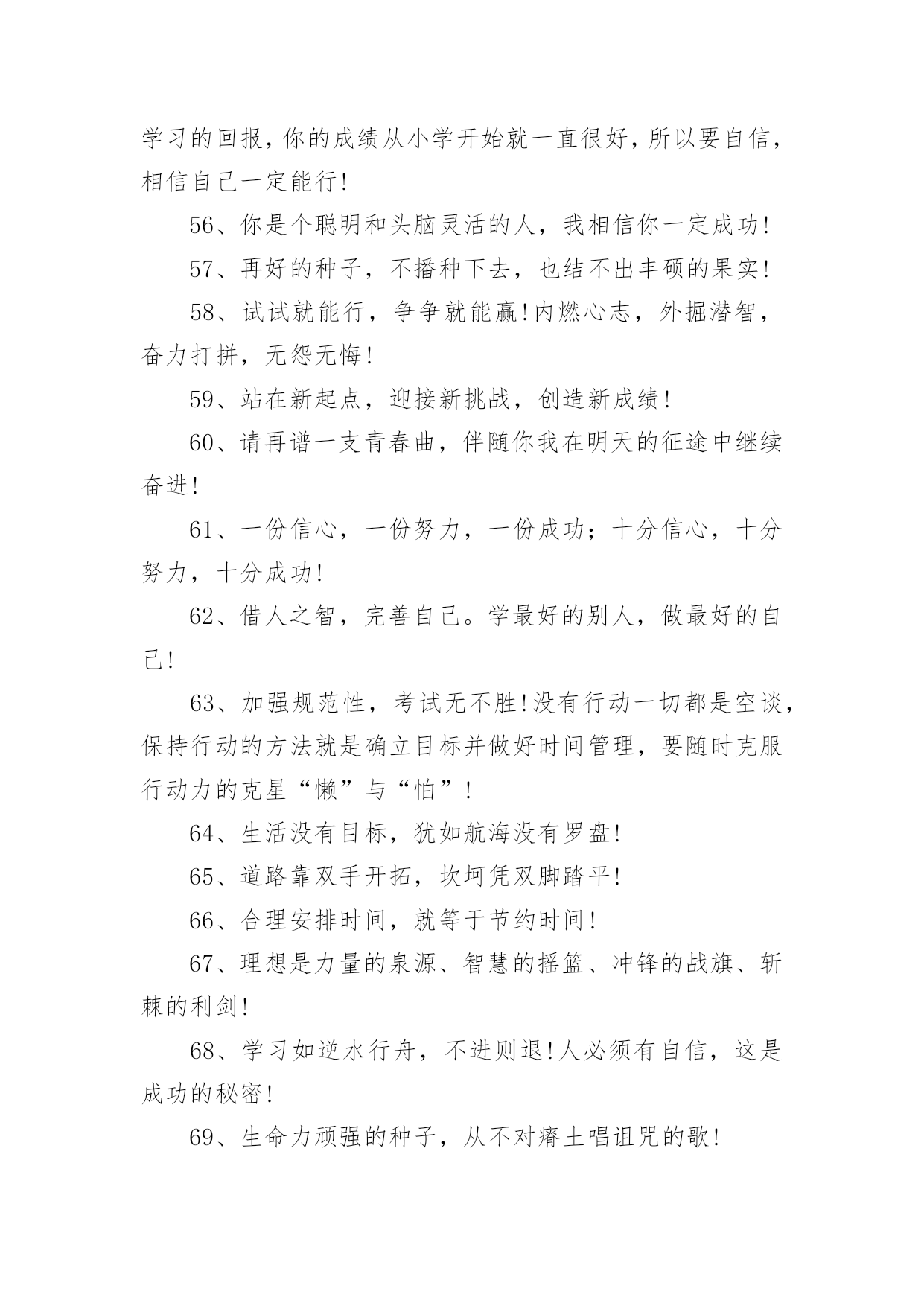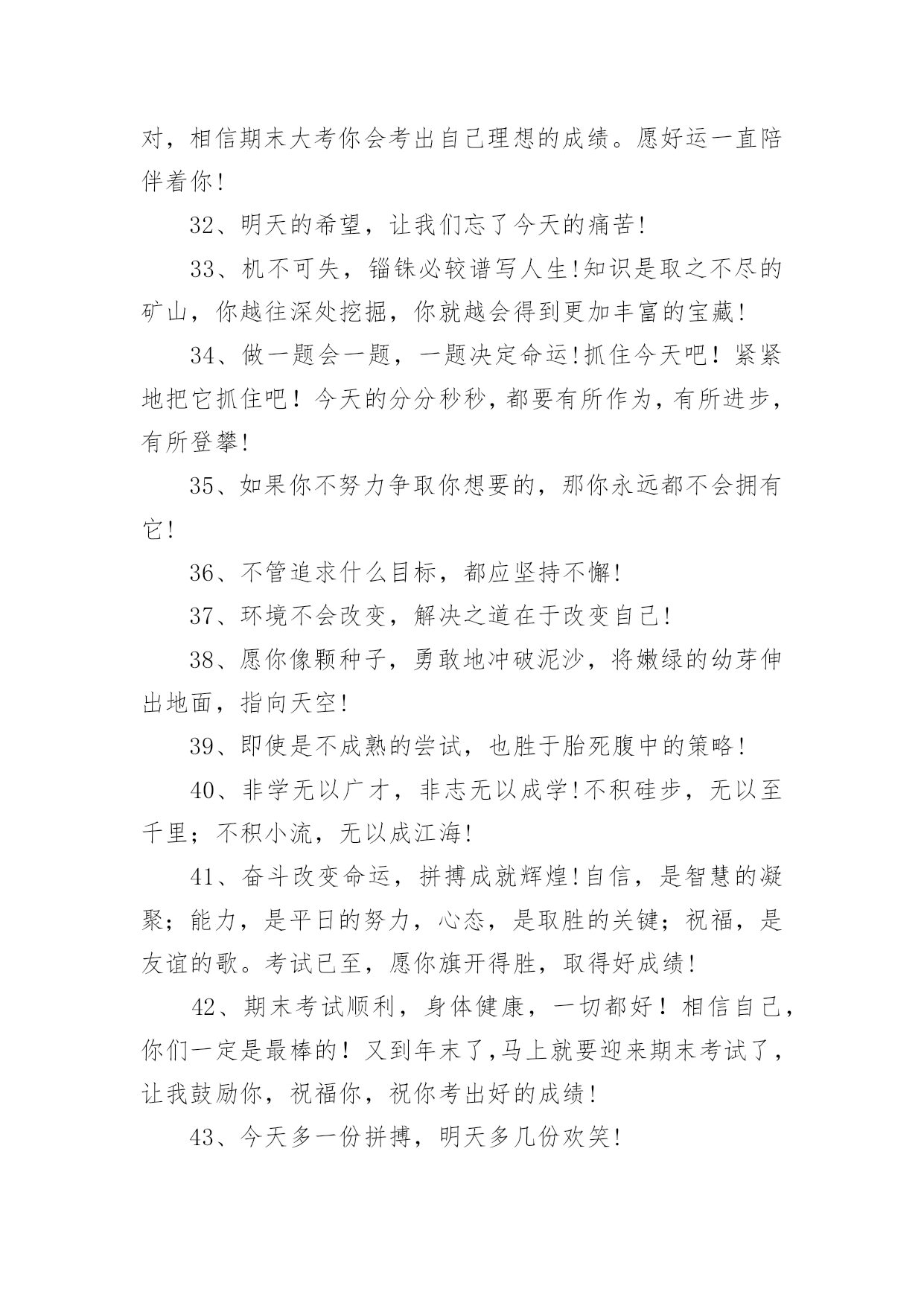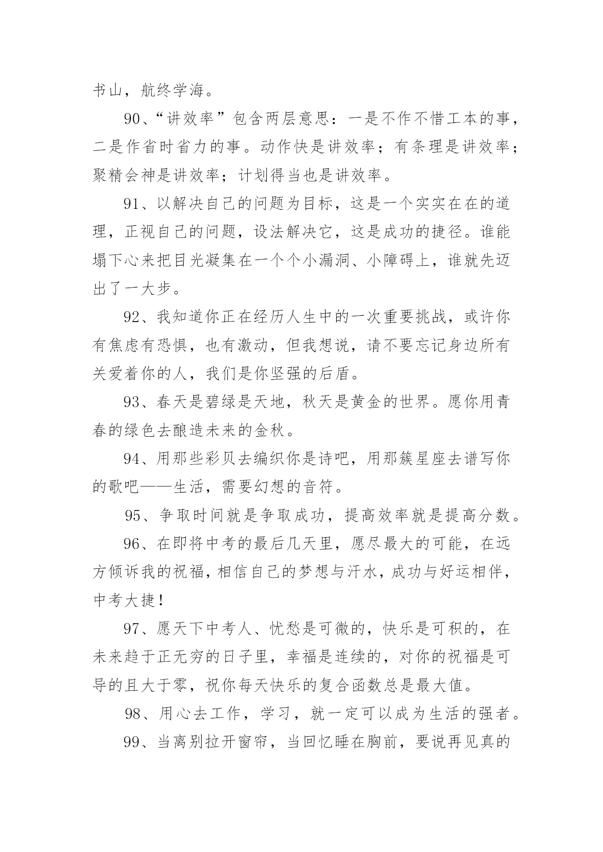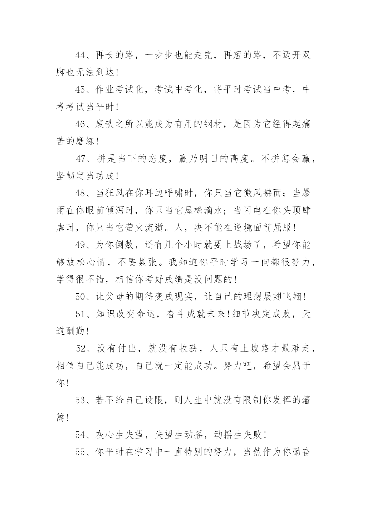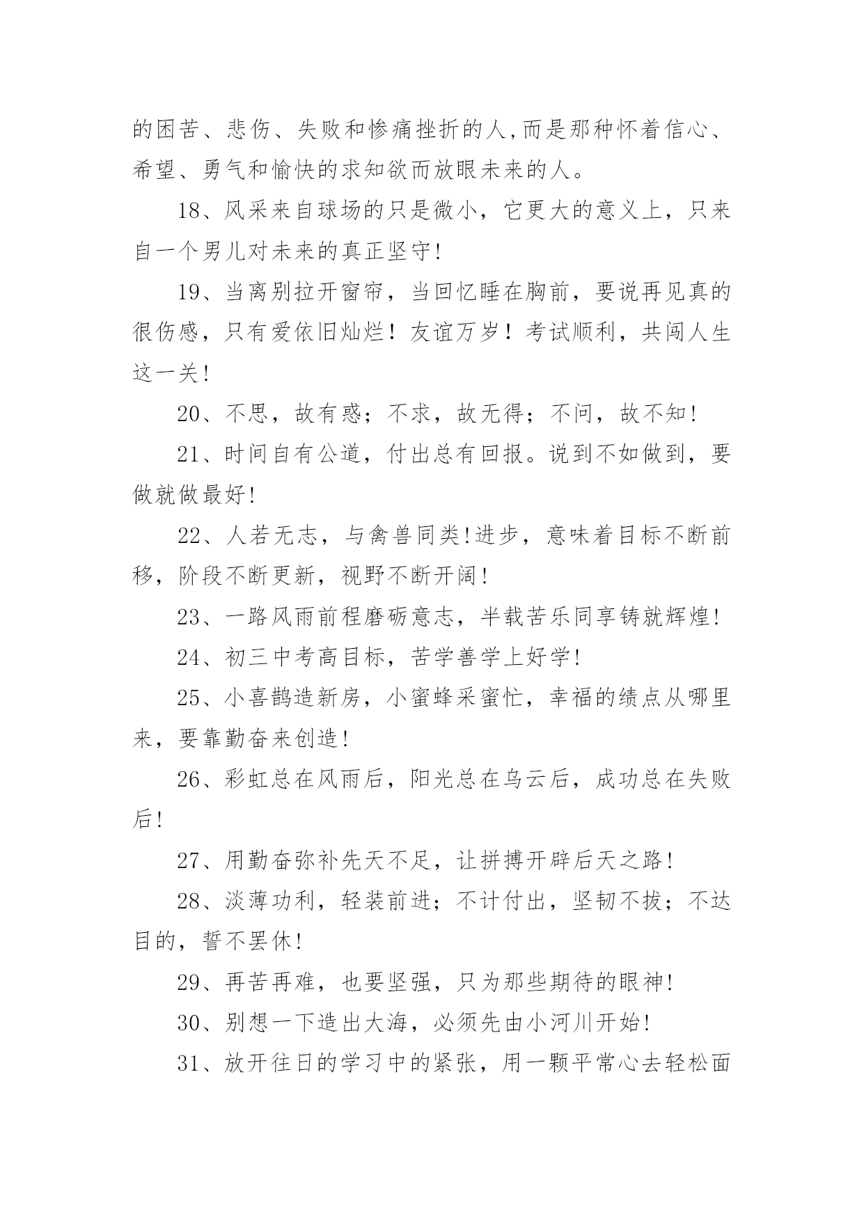 父母给中考孩子的祝福语父母给中考孩子的祝福语170句在我们平凡的日常里,大家一定都接触过祝福语吧,祝福语的种类很多,可分为吉日喜庆祝福语、寿诞祝福语、事业祝福语、祝酒词等。你所见过的祝福语是什么样的呢?下面是小编精心整理的父母给中考孩子的祝福语,欢迎阅读,希望大家能够喜欢。1、昨夜临阵磨枪,本想不快也光。如今面对试卷一张,谁知如此迷惘。过往所学皆忘,回忆往事沧桑。昔时心高气旺,幻想提名金榜。2、自信,是无尽智慧的凝聚。平淡,是成功路上的驿站。3、祝中考一切顺利成功!美梦成真!!4、祝愿天下所有考生开心度过中考。祝福你们旗开得胜,取得美好佳绩。平心对待中考,你们是最棒的!仁慈的上帝会祝福你们的,相信自己,一定能行!5、周星驰:曾经有一份认真的复习放在我面前,我没有珍惜,等我失去的时候才后悔莫及,人世间最痛苦的事莫过于此。假如教委能够给我一个再来一次的机会,我会对自己说三个字:学彻底。假如非要在这份学习加上一个期限,我希望是……就半年!6、终有一天,相约巅峰欢呼起舞!祝考试顺利!7、中考的前一天晚上肯定有人失眠,这都是自己心态不好的结果,我中考前一天也失眠,不过第二天一样精神抖擞地参加考试,所以我想提醒参加中考的学弟学妹们,失眠没什么的,一定要放松,不要因为想着前天晚上的失眠而影响中考,最后祝参加中考的学弟学妹们中考顺利,金榜题名!8、这么天都坚持下来了,只剩下最后的两个星期了,继续加油,相信你一定会成功的,顺利考入理想,胜利永远属于你!9、在即将中考的最后几天里,愿尽的可能,在远方倾诉我的祝福,相信自己的梦想与汗水,成功与好运相伴,中考大捷!10、眼泪不是我们的答案,拼搏才是我们的选择。11、信心来自于实力,实力来自于勤奋。12、想说爱你,感受太沉;想说喜爱,觉得太轻;一天天地留恋,一夜夜的无眠,我只有数着相思的绿莹帘珠,托星月寄到你窗前:祝中考顺意!十年寒窗,百日风雨,行遍书山,航终学海。13、相互支持,共同奋斗:相信自己,直到成功那一刻,笑看风云!14、天道酬勤、厚积薄发、初三九班、非比寻常。15、四分学识智,三心细耐恒,二成应试法,一片平常心。16、书山有路勤为径、学海无涯苦作舟;海到无边天作岸、山登绝顶我为峰。17、世界上欢迎的人从来不是那种不停地往后看着昨天的困苦、悲伤、失败和惨痛挫折的人,而是那种怀着信心、希望、勇气和愉快的求知欲而放眼未来的人。18、风采来自球场的只是微小,它更大的意义上,只来自一个男儿对未来的真正坚守!19、当离别拉开窗帘,当回忆睡在胸前,要说再见真的很伤感,只有爱依旧灿烂!友谊万岁!考试顺利,共闯人生这一关!20、不思,故有惑;不求,故无得;不问,故不知!21、时间自有公道,付出总有回报。说到不如做到,要做就做最好!22、人若无志,与禽兽同类!进步,意味着目标不断前移,阶段不断更新,视野不断开阔!23、一路风雨前程磨砺意志,半载苦乐同享铸就辉煌!24、初三中考高目标,苦学善学上好学!25、小喜鹊造新房,小蜜蜂采蜜忙,幸福的绩点从哪里来,要靠勤奋来创造!26、彩虹总在风雨后,阳光总在乌云后,成功总在失败后!27、用勤奋弥补先天不足,让拼搏开辟后天之路!28、淡薄功利,轻装前进;不计付出,坚韧不拔;不达目的,誓不罢休!29、再苦再难,也要坚强,只为那些期待的眼神!30、别想一下造出大海,必须先由小河川开始!31、放开往日的学习中的紧张,用一颗平常心去轻松面对,相信期末大考你会考出自己理想的成绩。愿好运一直陪伴着你!32、明天的希望,让我们忘了今天的痛苦!33、机不可失,锱铢必较谱写人生!知识是取之不尽的矿山,你越往深处挖掘,你就越会得到更加丰富的宝藏!34、做一题会一题,一题决定命运!抓住今天吧!紧紧地把它抓住吧!今天的分分秒秒,都要有所作为,有所进步,有所登攀!35、如果你不努力争取你想要的,那你永远都不会拥有它!36、不管追求什么目标,都应坚持不懈!37、环境不会改变,解决之道在于改变自己!38、愿你像颗种子,勇敢地冲破泥沙,将嫩绿的幼芽伸出地面,指向天空!39、即使是不成熟的尝试,也胜于胎死腹中的策略!40、非学无以广才,非志无以成学!不积硅步,无以至千里;不积小流,无以成江海!41、奋斗改变命运,拼搏成就辉煌!自信,是智慧的凝聚;能力,是平日的努力,心态,是取胜的关键;祝福,是友谊的歌。考试已至,愿你旗开得胜,取得好成绩!42、期末考试顺利,身体健康,一切都好!相信自己,你们一定是最棒的!又到年末了,马上就要迎来期末考试了,让我鼓励你,祝福你,祝你考出好的成绩!43、今天多一份拼搏,明天多几份欢笑!44、再长的路,一步步也能走完,再短的路,不迈开双脚也无法到达!45、作业考试化,考试中考化,将平时考试当中考,中考考试当平时!46、废铁之所以能成为有用的钢材,是因为它经得起痛苦的磨练!47