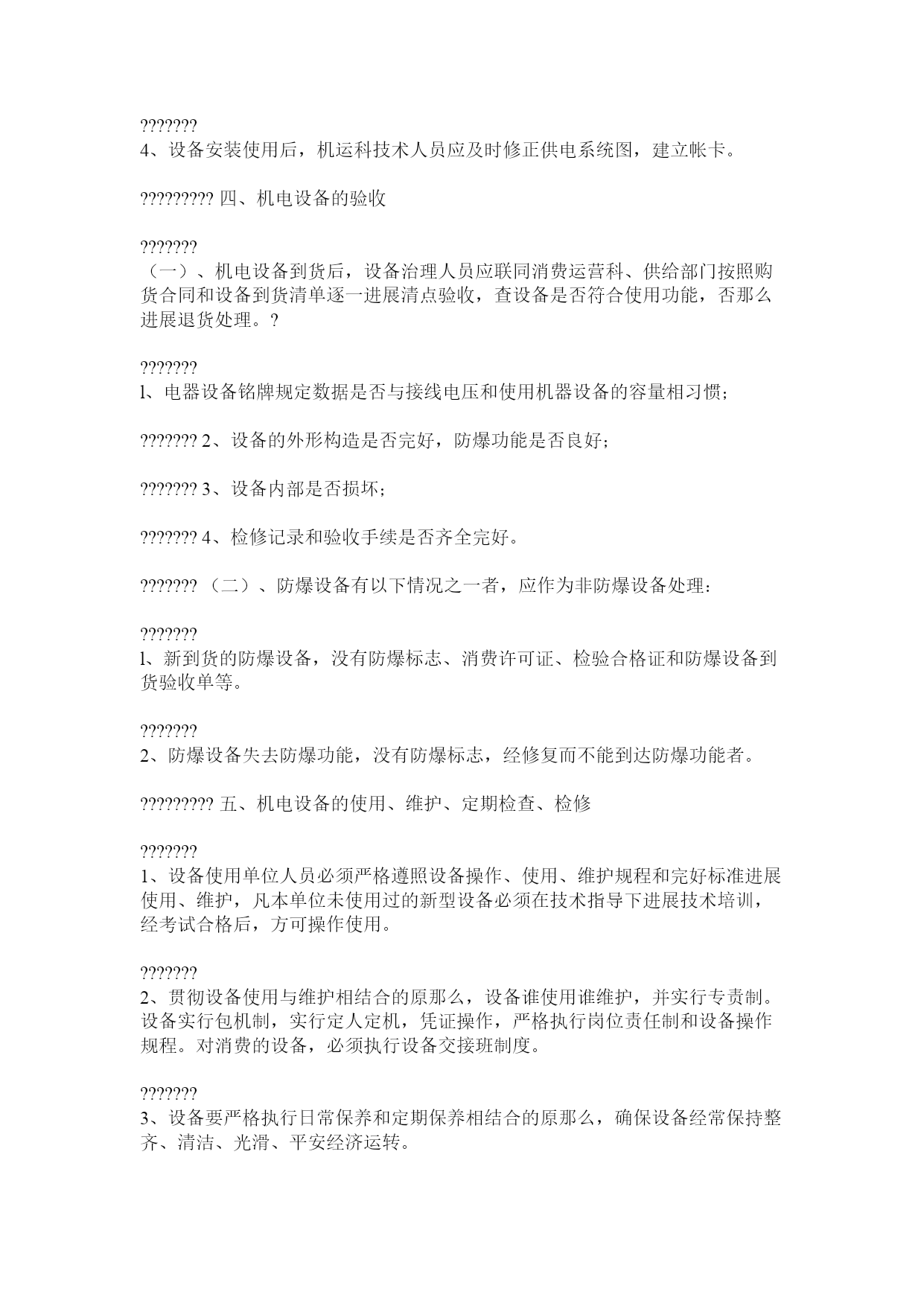 机电设备治理规定矿属各单位:???????为进一步加强我矿机电设备治理,实现机电设备治理制度化、标准化,提高设备完好率,降低待修率、事故率,科学地治理好、用好设备,提高经济效益,按照我矿机电设备治理的现状特制定本规定:???????????一、组织机构?????????????为了使机电设备治理工作的顺利进展,矿成立机电运输科,负责全矿机电设备的日常治理工作。由机电副矿长负责全矿的机电设备治理,并装备电器设备治理副科长一名,机械设备治理副科长一名,机电设备治理技术员一名。???????????二、机电设备的选型与购置???????????1、一般机电设备的选型要充分利用网络信息系统,结合实际使用要求,做好设备签报打算上报公司竞标采购,努力做到技术先进、质量优良、证件齐全、经济合理,大型固定设备及采掘设备(含主要配件)要优先选择原厂订购。???????????2、机电设备购置打算确定后,任何人不得擅自更改。否那么验收人员不签字验收,并给予责任人200元罚款,情节严峻的提交矿处理。?????????三、机电设备的领用???????1、各队需要增用的机电设备应按照工作打算提早申请,注明设备使用地点及负荷情况送报机运科给予批复,由机运科发放设备。???????2、电气设备在下井前应经全面检查、检修并通过试运检查、验收,开出入井合格证,方可入库、发放下井。???????3、但凡进矿新设备及库存超过半年以上的设备下井前必须重新检查、通电试运后方可下井。???????4、设备安装使用后,机运科技术人员应及时修正供电系统图,建立帐卡。?????????四、机电设备的验收???????(一)、机电设备到货后,设备治理人员应联同消费运营科、供给部门按照购货合同和设备到货清单逐一进展清点验收,查设备是否符合使用功能,否那么进展退货处理。????????l、电器设备铭牌规定数据是否与接线电压和使用机器设备的容量相习惯;???????2、设备的外形构造是否完好,防爆功能是否良好;???????3、设备内部是否损坏;???????4、检修记录和验收手续是否齐全完好。???????(二)、防爆设备有以下情况之一者,应作为非防爆设备处理:???????l、新到货的防爆设备,没有防爆标志、消费许可证、检验合格证和防爆设备到货验收单等。???????2、防爆设备失去防爆功能,没有防爆标志,经修复而不能到达防爆功能者。?????????五、机电设备的使用、维护、定期检查、检修???????1、设备使用单位人员必须严格遵照设备操作、使用、维护规程和完好标准进展使用、维护,凡本单位未使用过的新型设备必须在技术指导下进展技术培训,经考试合格后,方可操作使用。???????2、贯彻设备使用与维护相结合的原那么,设备谁使用谁维护,并实行专责制。设备实行包机制,实行定人定机,凭证操作,严格执行岗位责任制和设备操作规程。对消费的设备,必须执行设备交接班制度。???????3、设备要严格执行日常保养和定期保养相结合的原那么,确保设备经常保持整齐、清洁、光滑、平安经济运转。???????4、主要设备应分别制定合理的运转标准和工作定额,定期进展精度、功能测定,觉察功能较低和精度超限时,要进展调整或检修。???????5、维修工作要实行区域维修负责制,对负责管辖内的设备要做好巡回检查、打算检修和缺点维修,对重点设备关键部位要进展日常点检和定期检查,并做好记录。???????6、机运科按照设备运转情况和检修周期,认真编制年、季、月固定设备检修打算报矿批准,并纳入矿消费打算,验收工作由分管矿长组织进展。???????7、按照“设备治理规程”的规定,每年应有12~15天停产检修日编制,由机电科编制检修打算报公司、矿领导批准后由机运科组织施行。???????8、每天夜班00:30时-8:30时为全矿停产检修时间,对运输系统、供电系统全面检查检修。???????9、各种设备按规定的日检、周检工程进展,由包机责任者逐一检查修复,并做好检修记录。日、周检中觉察无法处理的缺点、隐患要及时汇报,并安排停产处理。???????10、检修完毕应由运转人员及检修者对设备全面检查,撤除检修辅助设备并试车运转良好后,方可投入使用。?????????六、机电设备的移交??????????1、新安装的机电设备由消费运营科、机运科、安装单位、使用单位负责人进展交接。在交接单上注明设备的台数、五小及电缆数量等现场交接人员共同签字,机运科备案。