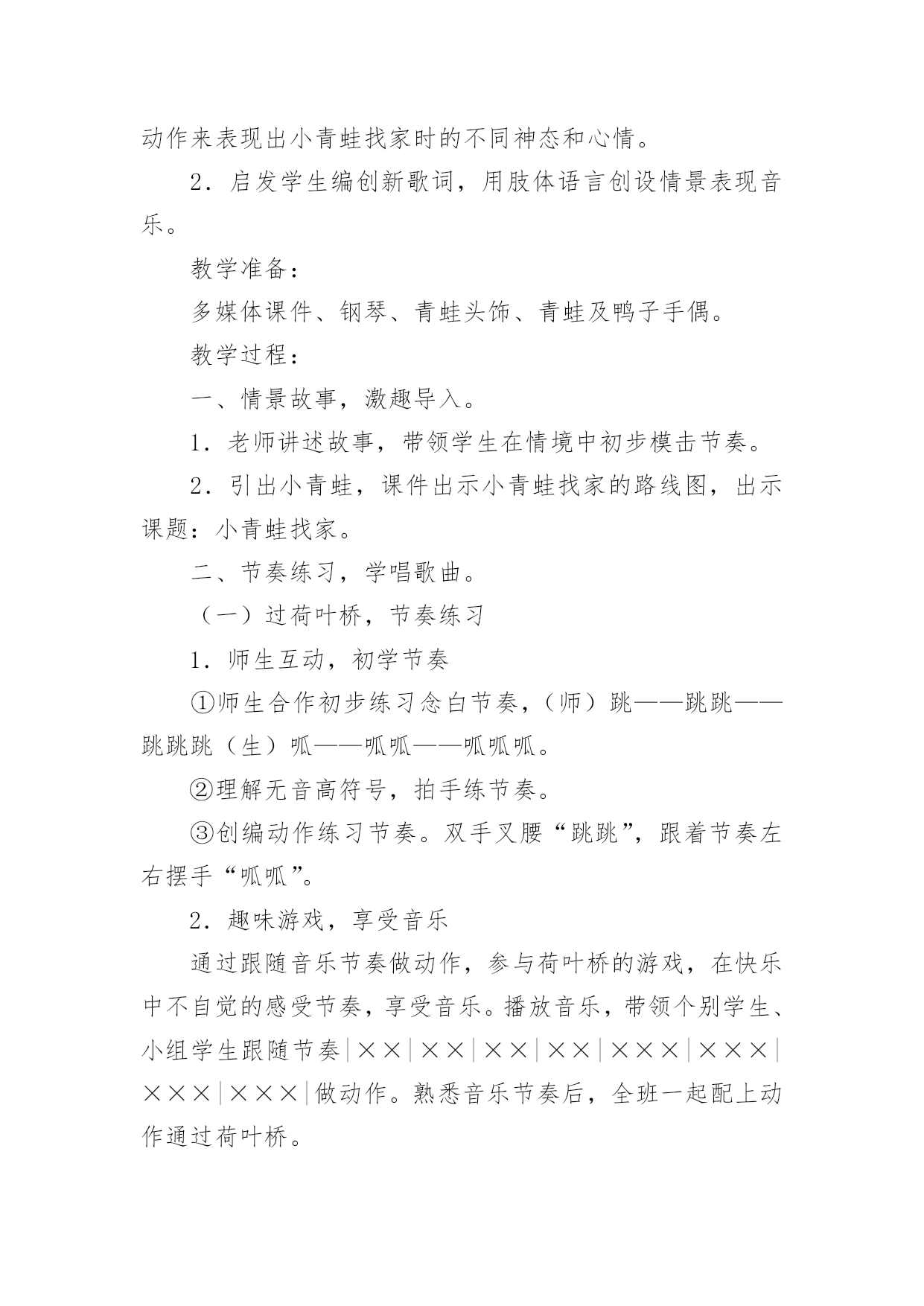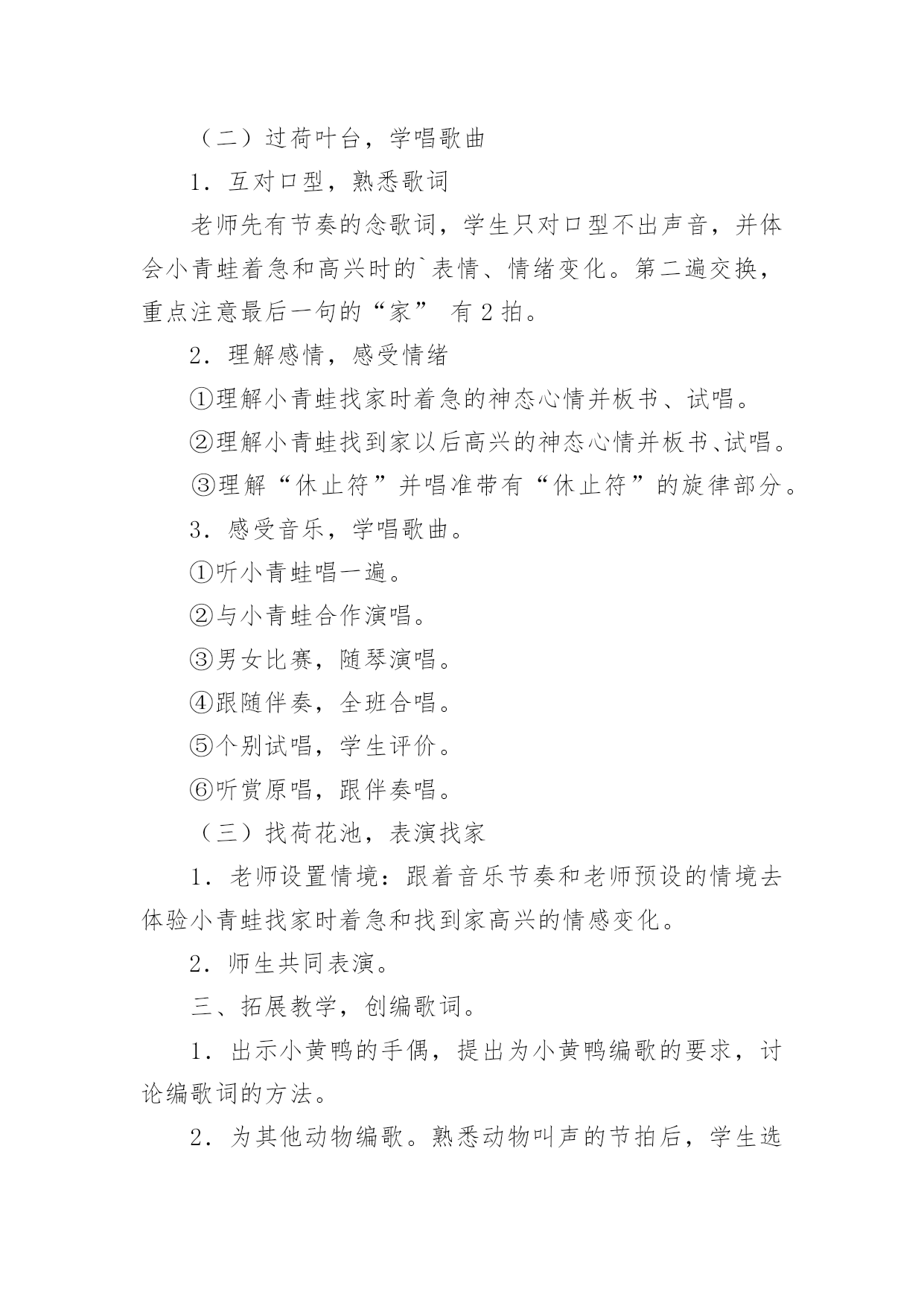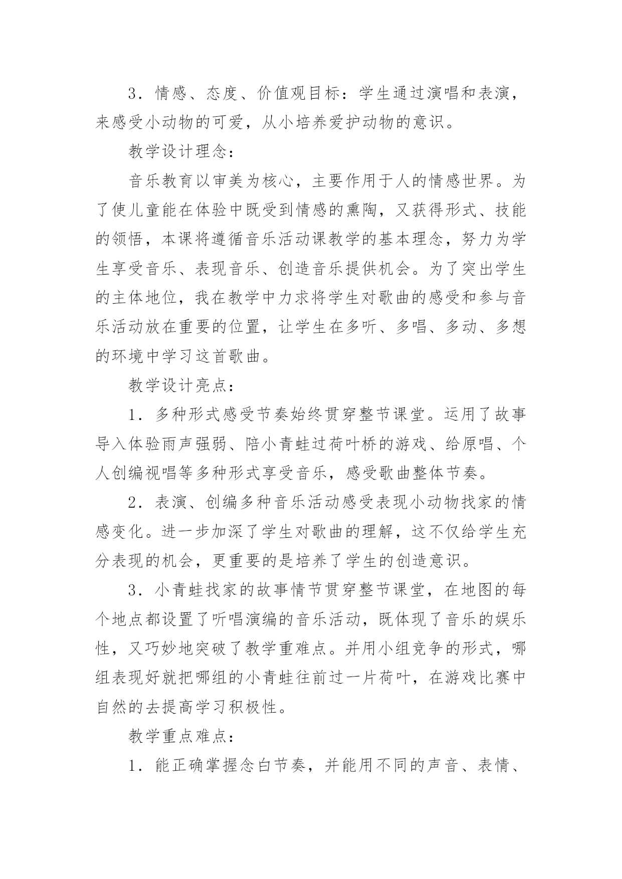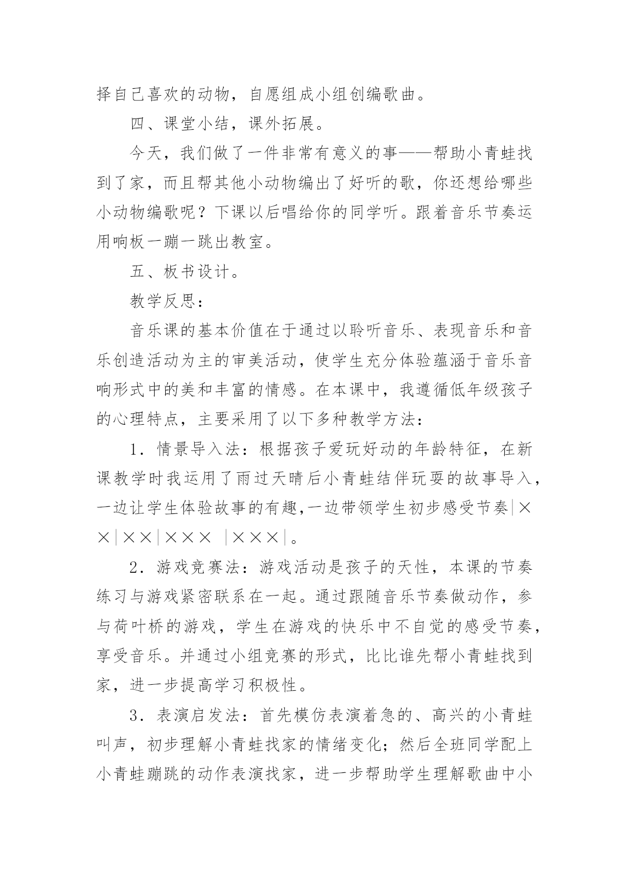 《小青蛙》教学设计《小青蛙》教学设计(合集15篇)作为一名为他人授业解惑的教育工作者,就难以避免地要准备教学设计,借助教学设计可以让教学工作更加有效地进行。那么教学设计应该怎么写才合适呢?下面是小编整理的《小青蛙》教学设计,欢迎大家分享。《小青蛙》教学设计1教材分析:《小青蛙找家》是一首通俗简练、富于儿童情趣的歌曲,由四个乐句构成,一段体,2/4拍。歌曲以明快活泼的旋律作为前奏,描写了小青蛙在东奔西跑地寻找自己的家,也为歌曲主题出现做出了铺垫。歌曲中“跳跳,呱呱”分别以四分音符、八分音符组成,模仿小青蛙的鸣叫,刻画了小青蛙跳一跳,叫一叫的焦急神态。最后一句旋律平稳流畅,表现了小青蛙历尽艰险,终于回到家时愉快、喜悦的心情。教学目标:1.知识与技能目标:能用轻快而有弹性的声音配合表情演唱《小青蛙找家》,并能模仿小青蛙的动作准确与音乐一起律动。2.过程与方法目标:通过听赏、演唱、表演、创编等活动体会小青蛙着急、快乐的不同情绪,感受音乐的美好,理解音乐情绪,表达音乐内容。3.情感、态度、价值观目标:学生通过演唱和表演,来感受小动物的可爱,从小培养爱护动物的意识。教学设计理念:音乐教育以审美为核心,主要作用于人的情感世界。为了使儿童能在体验中既受到情感的熏陶,又获得形式、技能的领悟,本课将遵循音乐活动课教学的基本理念,努力为学生享受音乐、表现音乐、创造音乐提供机会。为了突出学生的主体地位,我在教学中力求将学生对歌曲的感受和参与音乐活动放在重要的位置,让学生在多听、多唱、多动、多想的环境中学习这首歌曲。教学设计亮点:1.多种形式感受节奏始终贯穿整节课堂。运用了故事导入体验雨声强弱、陪小青蛙过荷叶桥的游戏、给原唱、个人创编视唱等多种形式享受音乐,感受歌曲整体节奏。2.表演、创编多种音乐活动感受表现小动物找家的情感变化。进一步加深了学生对歌曲的理解,这不仅给学生充分表现的机会,更重要的是培养了学生的创造意识。3.小青蛙找家的故事情节贯穿整节课堂,在地图的每个地点都设置了听唱演编的音乐活动,既体现了音乐的娱乐性,又巧妙地突破了教学重难点。并用小组竞争的形式,哪组表现好就把哪组的小青蛙往前过一片荷叶,在游戏比赛中自然的去提高学习积极性。教学重点难点:1.能正确掌握念白节奏,并能用不同的声音、表情、动作来表现出小青蛙找家时的不同神态和心情。2.启发学生编创新歌词,用肢体语言创设情景表现音乐。教学准备:多媒体课件、钢琴、青蛙头饰、青蛙及鸭子手偶。教学过程:一、情景故事,激趣导入。1.老师讲述故事,带领学生在情境中初步模击节奏。2.引出小青蛙,课件出示小青蛙找家的路线图,出示课题:小青蛙找家。二、节奏练习,学唱歌曲。(一)过荷叶桥,节奏练习1.师生互动,初学节奏①师生合作初步练习念白节奏,(师)跳——跳跳——跳跳跳(生)呱——呱呱——呱呱呱。②理解无音高符号,拍手练节奏。③创编动作练习节奏。双手叉腰“跳跳”,跟着节奏左右摆手“呱呱”。2.趣味游戏,享受音乐通过跟随音乐节奏做动作,参与荷叶桥的游戏,在快乐中不自觉的感受节奏,享受音乐。播放音乐,带领个别学生、小组学生跟随节奏|××|××|××|××|×××|×××|×××|×××|做动作。熟悉音乐节奏后,全班一起配上动作通过荷叶桥。(二)过荷叶台,学唱歌曲1.互对口型,熟悉歌词老师先有节奏的念歌词,学生只对口型不出声音,并体会小青蛙着急和高兴时的`表情、情绪变化。第二遍交换,重点注意最后一句的“家”有2拍。2.理解感情,感受情绪①理解小青蛙找家时着急的神态心情并板书、试唱。②理解小青蛙找到家以后高兴的神态心情并板书、试唱。③理解“休止符”并唱准带有“休止符”的旋律部分。3.感受音乐,学唱歌曲。①听小青蛙唱一遍。②与小青蛙合作演唱。③男女比赛,随琴演唱。④跟随伴奏,全班合唱。⑤个别试唱,学生评价。⑥听赏原唱,跟伴奏唱。(三)找荷花池,表演找家1.老师设置情境:跟着音乐节奏和老师预设的情境去体验小青蛙找家时着急和找到家高兴的情感变化。2.师生共同表演。三、拓展教学,创编歌词。1.出示小黄鸭的手偶,提出为小黄鸭编歌的要求,讨论编歌词的方法。2.为其他动物编歌。熟悉动物叫声的节拍后,学生选择自己喜欢的动物,自愿组成小组创编歌曲。四、课堂小结,课外拓展。今天,我们做了一件非常有意义的事——帮助小青蛙找到了家,而且帮其他小动物编出了好听的歌,你还想给哪些小动物编歌呢?下课以后唱给你的同学听。跟着音乐节奏运用响板一蹦一跳出教室。五、板书设计。教学反思:音乐课的基本价值在于通过以聆听音乐、表现音乐和音乐创造活动为主的审美活动,使学生充分体验蕴涵于音乐音响形式中的美和丰富的情感。在本课中,我遵循低年级孩子的心理特点,主要采用了以下多种教学方法:1.情景导入法:根据孩子爱玩好动的年龄特征,在新课教学时我运用了雨过天晴后小
