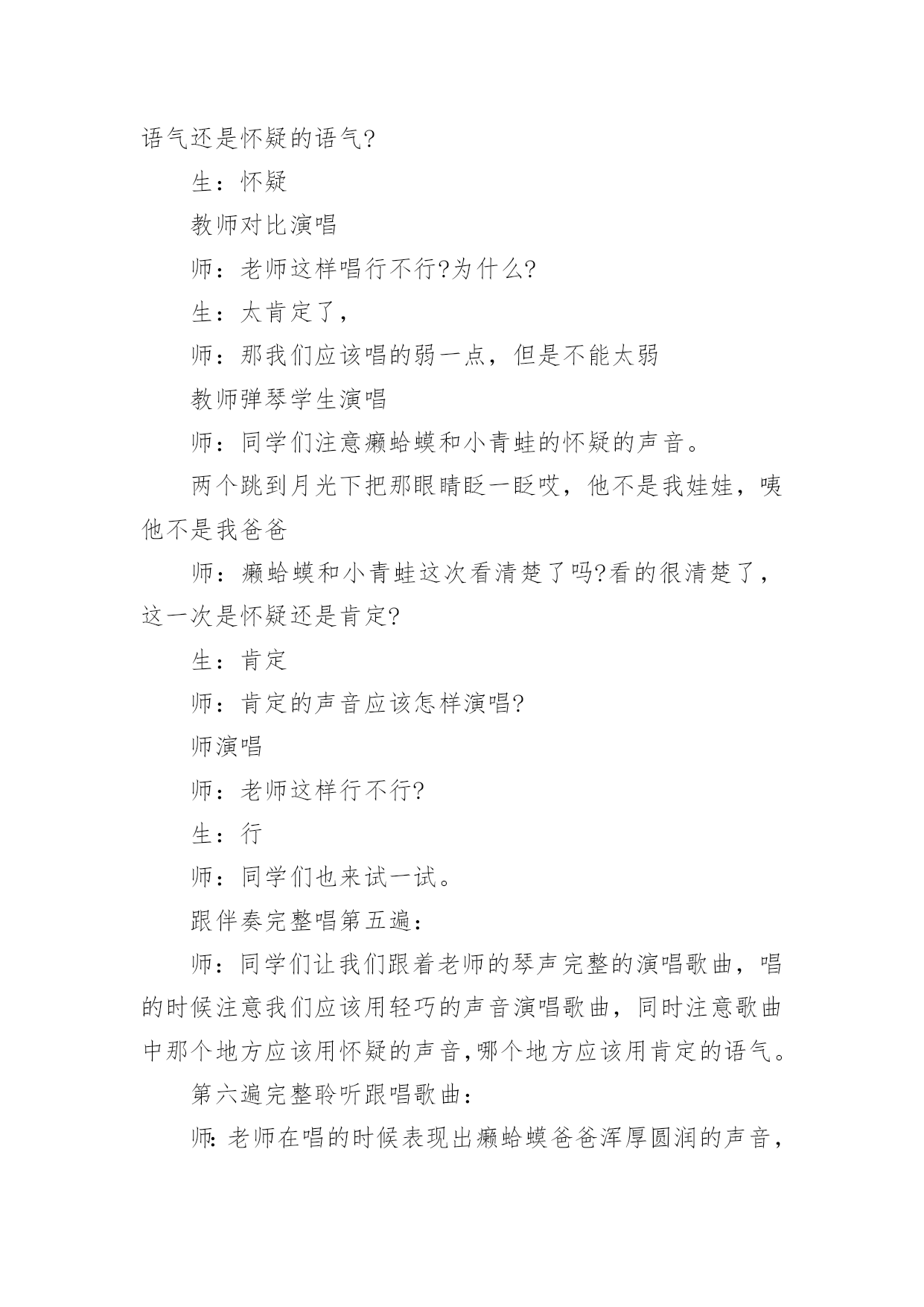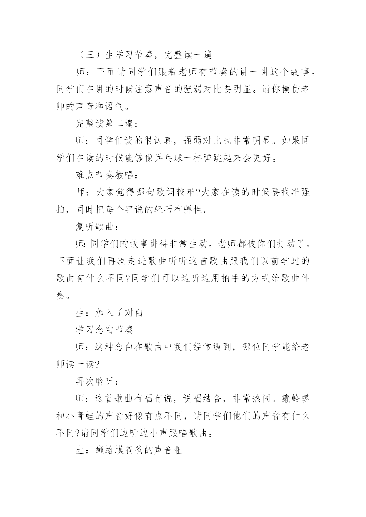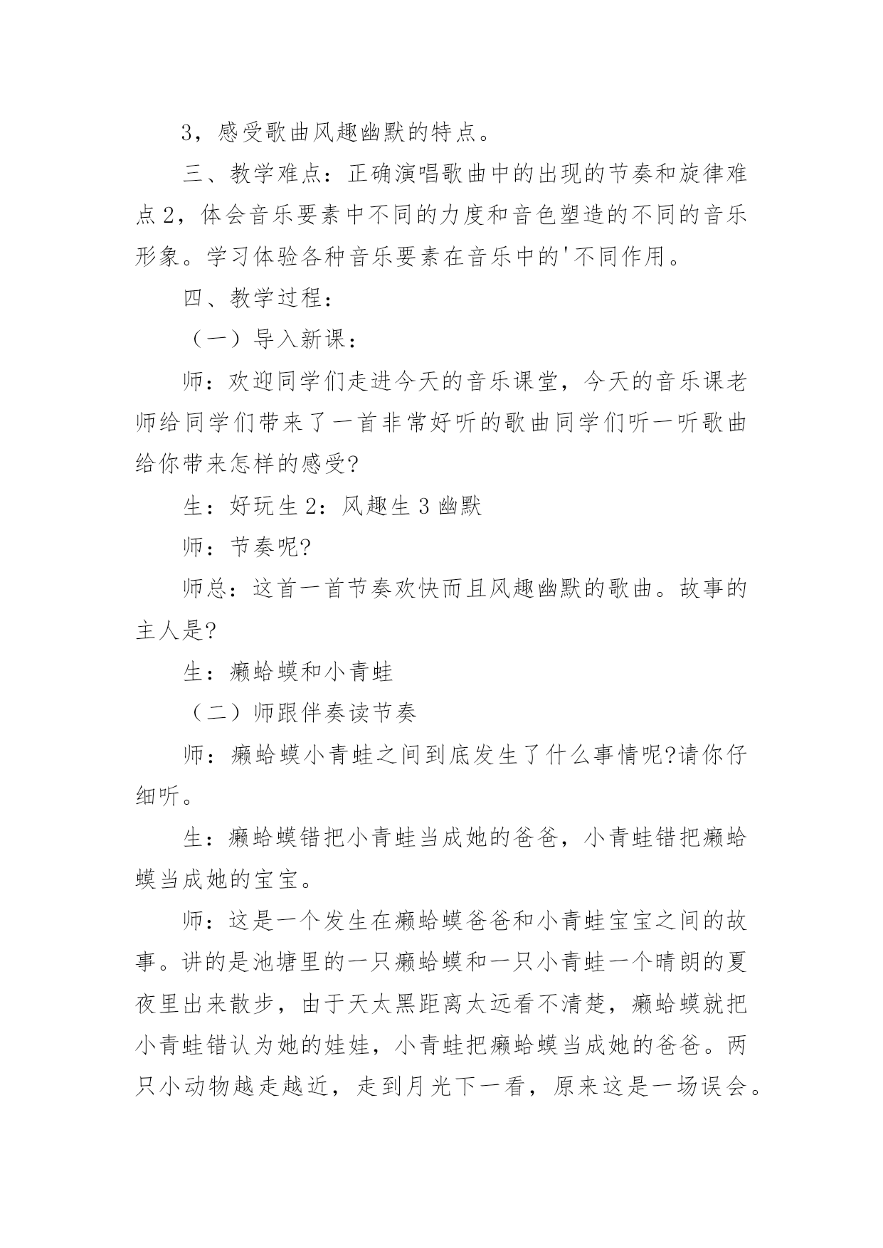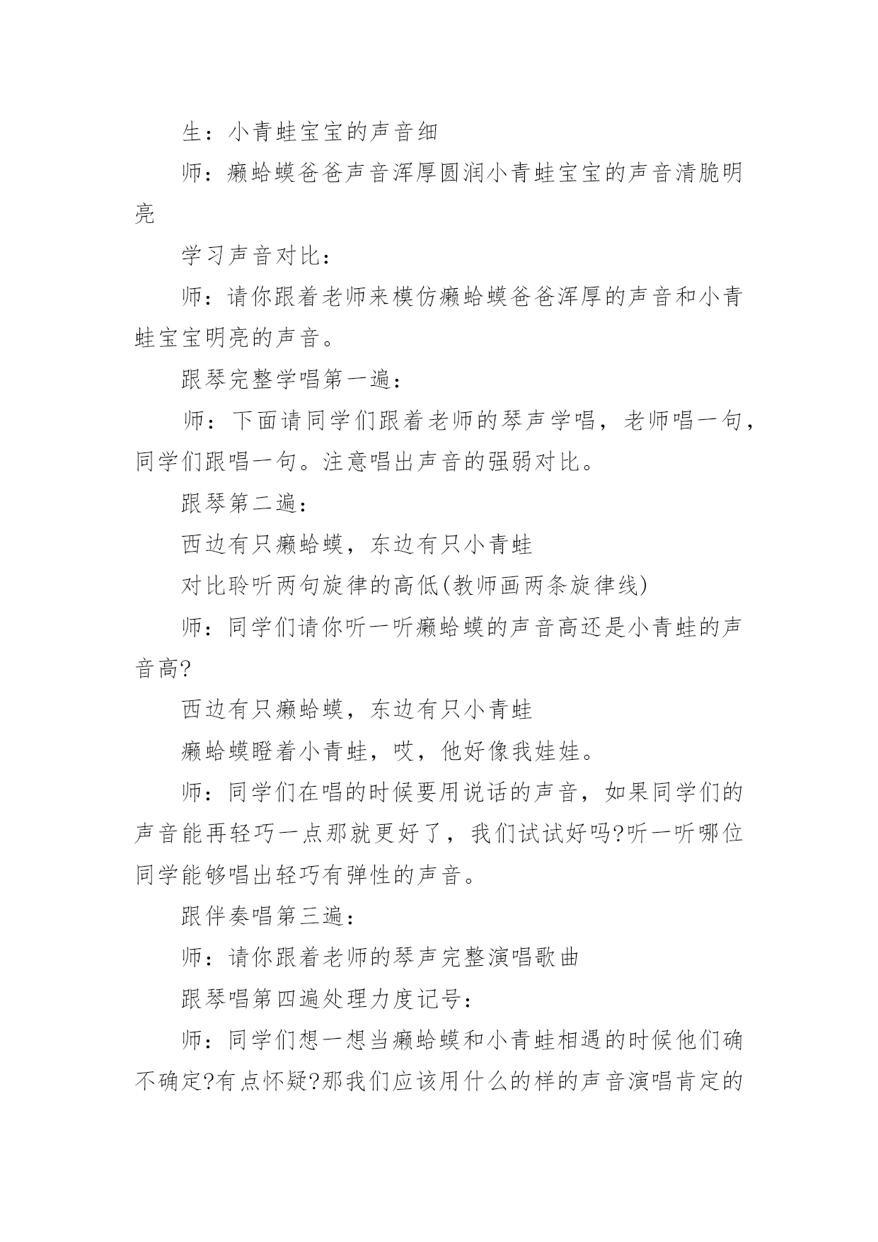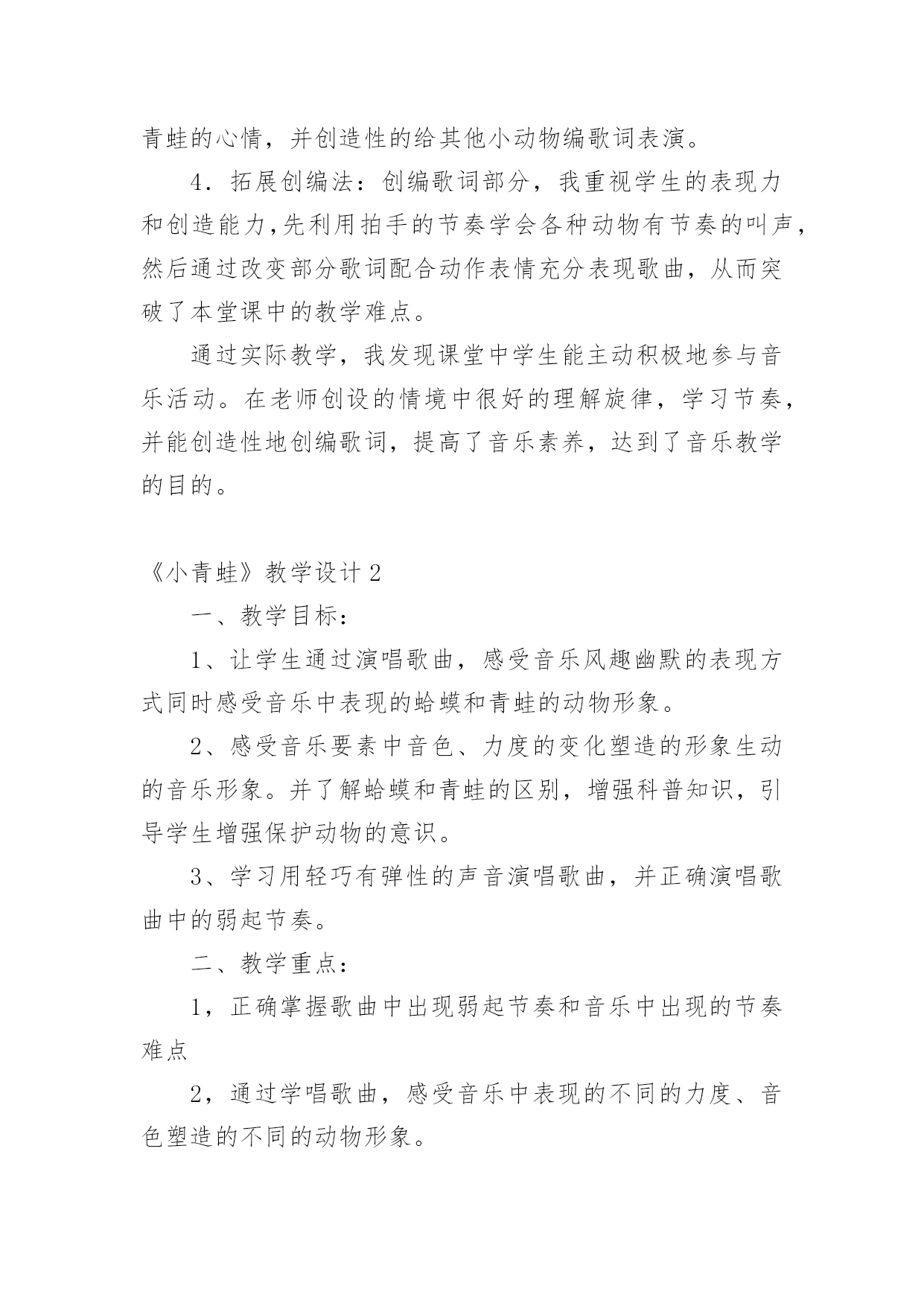 《小青蛙》教学设计《小青蛙》教学设计(合集15篇)作为一名为他人授业解惑的教育工作者,就难以避免地要准备教学设计,借助教学设计可以让教学工作更加有效地进行。那么教学设计应该怎么写才合适呢?下面是小编整理的《小青蛙》教学设计,欢迎大家分享。《小青蛙》教学设计1教材分析:《小青蛙找家》是一首通俗简练、富于儿童情趣的歌曲,由四个乐句构成,一段体,2/4拍。歌曲以明快活泼的旋律作为前奏,描写了小青蛙在东奔西跑地寻找自己的家,也为歌曲主题出现做出了铺垫。歌曲中“跳跳,呱呱”分别以四分音符、八分音符组成,模仿小青蛙的鸣叫,刻画了小青蛙跳一跳,叫一叫的焦急神态。最后一句旋律平稳流畅,表现了小青蛙历尽艰险,终于回到家时愉快、喜悦的心情。教学目标:1.知识与技能目标:能用轻快而有弹性的声音配合表情演唱《小青蛙找家》,并能模仿小青蛙的动作准确与音乐一起律动。2.过程与方法目标:通过听赏、演唱、表演、创编等活动体会小青蛙着急、快乐的不同情绪,感受音乐的美好,理解音乐情绪,表达音乐内容。3.情感、态度、价值观目标:学生通过演唱和表演,来感受小动物的可爱,从小培养爱护动物的意识。教学设计理念:音乐教育以审美为核心,主要作用于人的情感世界。为了使儿童能在体验中既受到情感的熏陶,又获得形式、技能的领悟,本课将遵循音乐活动课教学的基本理念,努力为学生享受音乐、表现音乐、创造音乐提供机会。为了突出学生的主体地位,我在教学中力求将学生对歌曲的感受和参与音乐活动放在重要的位置,让学生在多听、多唱、多动、多想的环境中学习这首歌曲。教学设计亮点:1.多种形式感受节奏始终贯穿整节课堂。运用了故事导入体验雨声强弱、陪小青蛙过荷叶桥的游戏、给原唱、个人创编视唱等多种形式享受音乐,感受歌曲整体节奏。2.表演、创编多种音乐活动感受表现小动物找家的情感变化。进一步加深了学生对歌曲的理解,这不仅给学生充分表现的机会,更重要的是培养了学生的创造意识。3.小青蛙找家的故事情节贯穿整节课堂,在地图的每个地点都设置了听唱演编的音乐活动,既体现了音乐的娱乐性,又巧妙地突破了教学重难点。并用小组竞争的形式,哪组表现好就把哪组的小青蛙往前过一片荷叶,在游戏比赛中自然的去提高学习积极性。教学重点难点:1.能正确掌握念白节奏,并能用不同的声音、表情、动作来表现出小青蛙找家时的不同神态和心情。2.启发学生编创新歌词,用肢体语言创设情景表现音乐。教学准备:多媒体课件、钢琴、青蛙头饰、青蛙及鸭子手偶。教学过程:一、情景故事,激趣导入。1.老师讲述故事,带领学生在情境中初步模击节奏。2.引出小青蛙,课件出示小青蛙找家的路线图,出示课题:小青蛙找家。二、节奏练习,学唱歌曲。(一)过荷叶桥,节奏练习1.师生互动,初学节奏①师生合作初步练习念白节奏,(师)跳——跳跳——跳跳跳(生)呱——呱呱——呱呱呱。②理解无音高符号,拍手练节奏。③创编动作练习节奏。双手叉腰“跳跳”,跟着节奏左右摆手“呱呱”。2.趣味游戏,享受音乐通过跟随音乐节奏做动作,参与荷叶桥的游戏,在快乐中不自觉的感受节奏,享受音乐。播放音乐,带领个别学生、小组学生跟随节奏|××|××|××|××|×××|×××|×××|×××|做动作。熟悉音乐节奏后,全班一起配上动作通过荷叶桥。(二)过荷叶台,学唱歌曲1.互对口型,熟悉歌词老师先有节奏的念歌词,学生只对口型不出声音,并体会小青蛙着急和高兴时的`表情、情绪变化。第二遍交换,重点注意最后一句的“家”有2拍。2.理解感情,感受情绪①理解小青蛙找家时着急的神态心情并板书、试唱。②理解小青蛙找到家以后高兴的神态心情并板书、试唱。③理解“休止符”并唱准带有“休止符”的旋律部分。3.感受音乐,学唱歌曲。①听小青蛙唱一遍。②与小青蛙合作演唱。③男女比赛,随琴演唱。④跟随伴奏,全班合唱。⑤个别试唱,学生评价。⑥听赏原唱,跟伴奏唱。(三)找荷花池,表演找家1.老师设置情境:跟着音乐节奏和老师预设的情境去体验小青蛙找家时着急和找到家高兴的情感变化。2.师生共同表演。三、拓展教学,创编歌词。1.出示小黄鸭的手偶,提出为小黄鸭编歌的要求,讨论编歌词的方法。2.为其他动物编歌。熟悉动物叫声的节拍后,学生选择自己喜欢的动物,自愿组成小组创编歌曲。四、课堂小结,课外拓展。今天,我们做了一件非常有意义的事——帮助小青蛙找到了家,而且帮其他小动物编出了好听的歌,你还想给哪些小动物编歌呢?下课以后唱给你的同学听。跟着音乐节奏运用响板一蹦一跳出教室。五、板书设计。教学反思:音乐课的基本价值在于通过以聆听音乐、表现音乐和音乐创造活动为主的审美活动,使学生充分体验蕴涵于音乐音响形式中的美和丰富的情感。在本课中,我遵循低年级孩子的心理特点,主要采用了以下多种教学方法:1.情景导入法:根据孩子爱玩好动的年龄特征,在新课教学时我运用了雨过天晴后小
