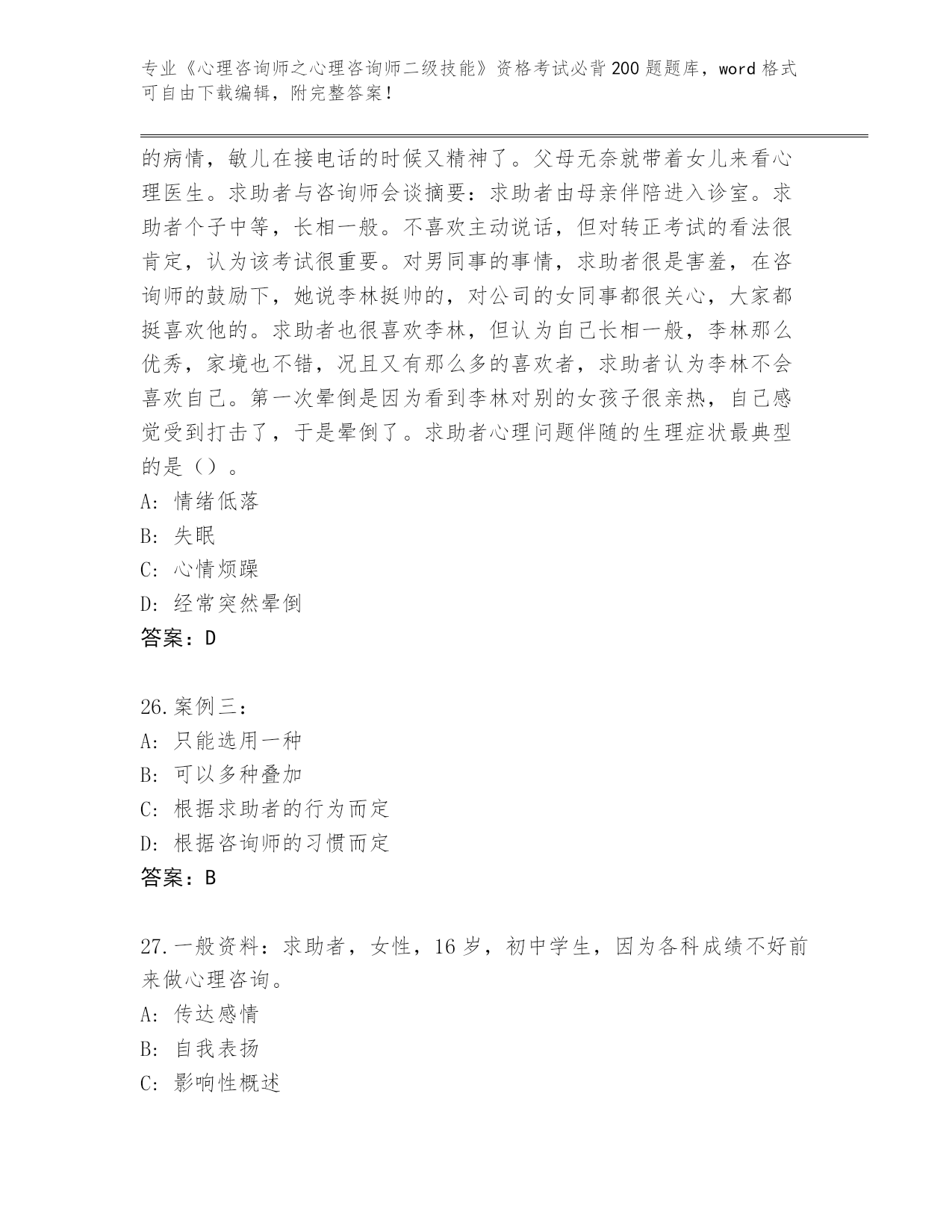 山西省壶关县内部使用《心理咨询师之心理咨询师二级技能》资格考试必背200题题库完美版