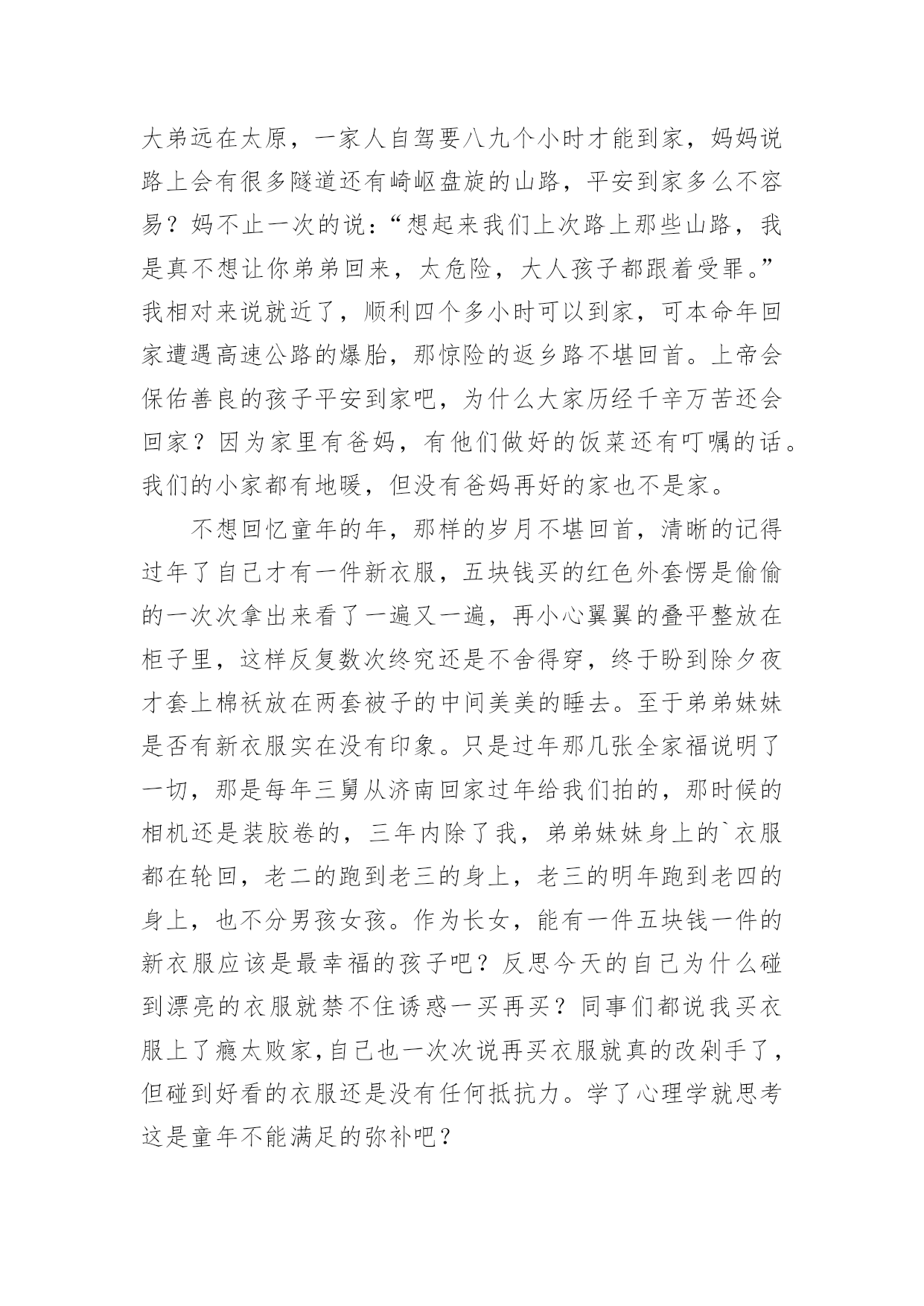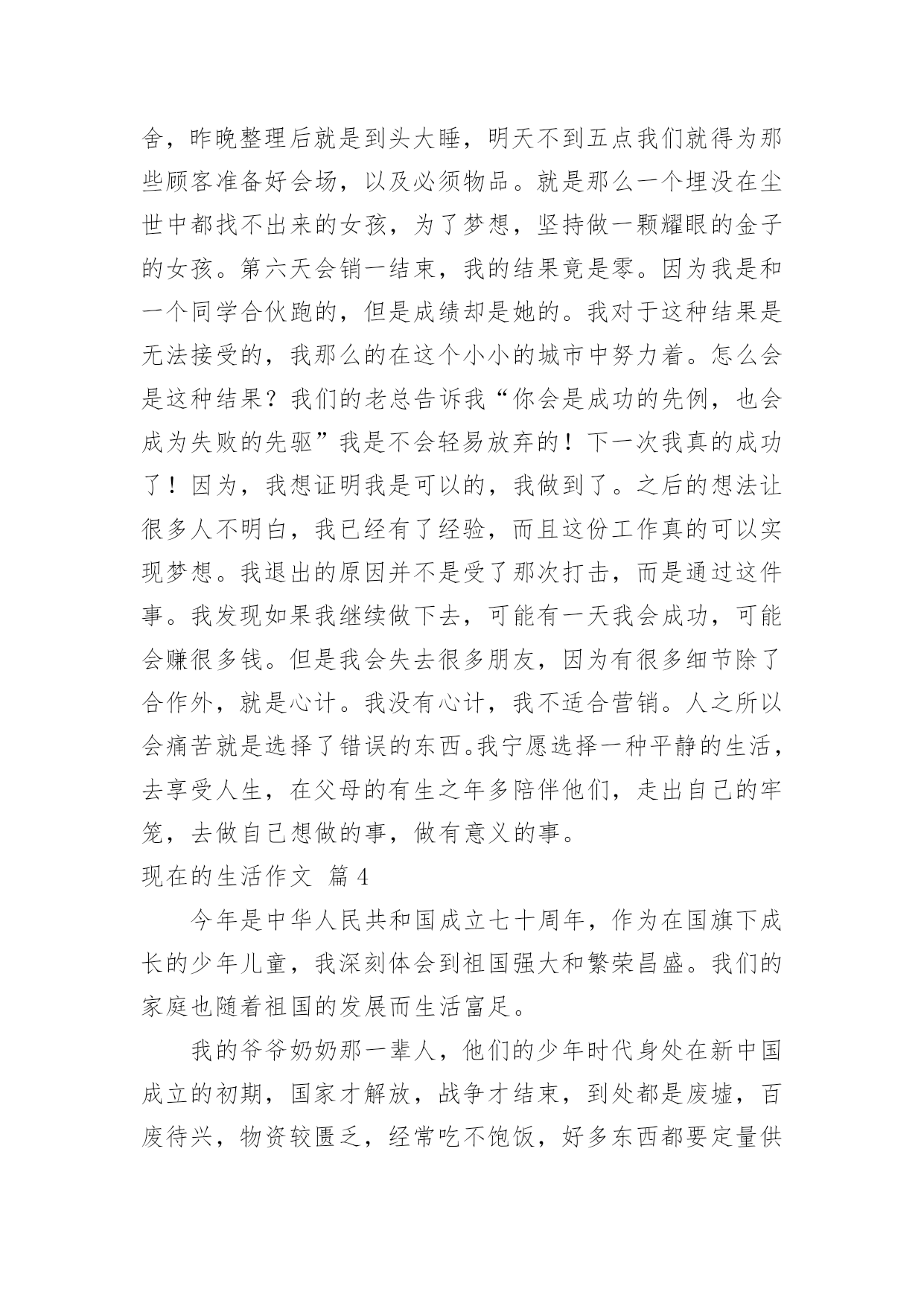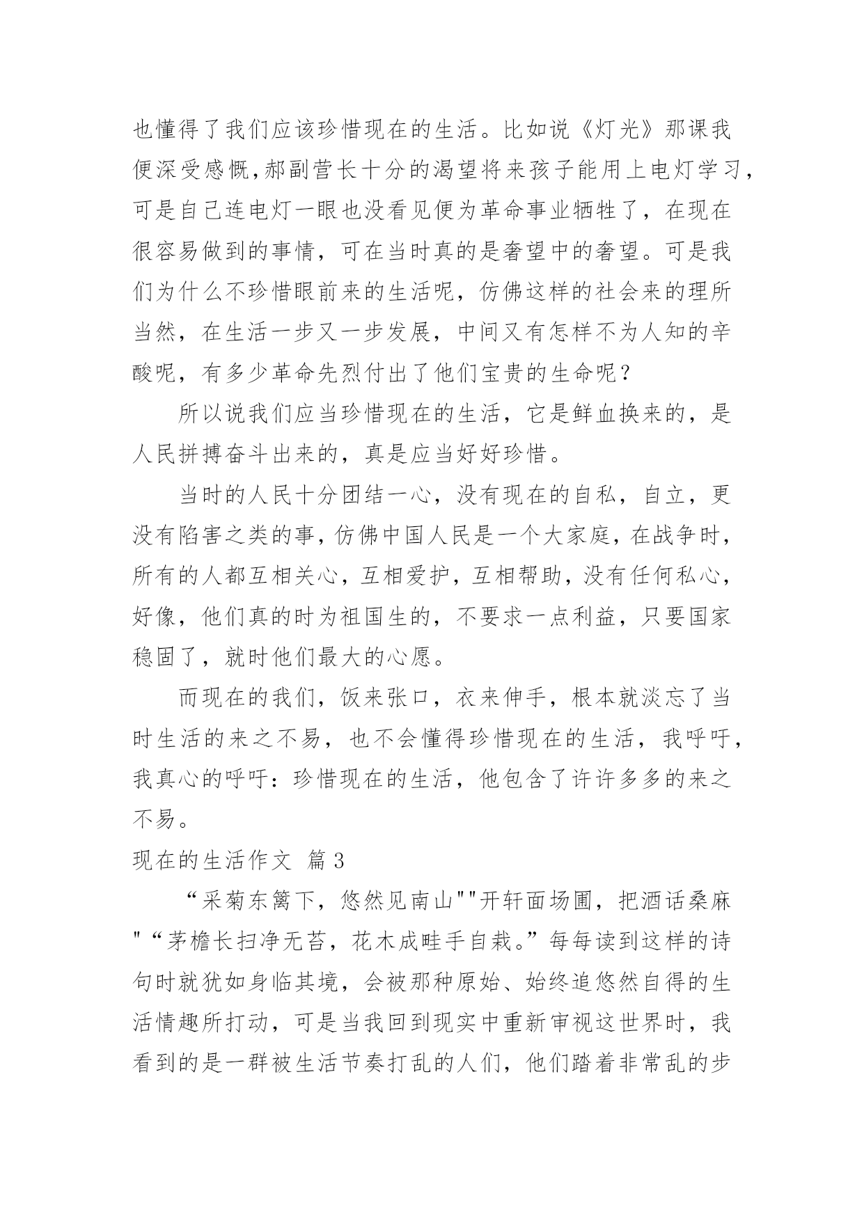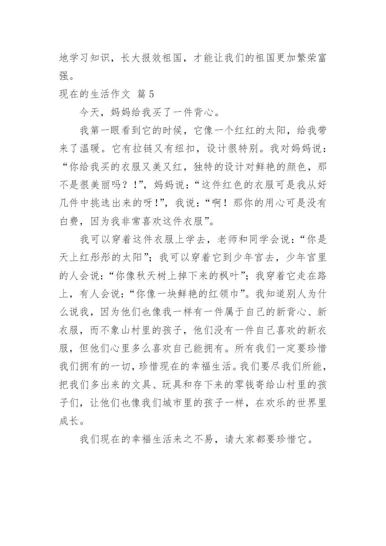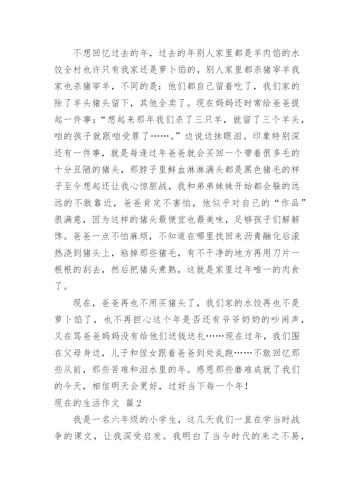 现在的生活作文现在的生活作文5篇在日常学习、工作或生活中,大家都经常看到作文的身影吧,作文是一种言语活动,具有高度的综合性和创造性。怎么写作文才能避免踩雷呢?以下是小编帮大家整理的现在的生活作文5篇,仅供参考,希望能够帮助到大家。现在的生活作文篇1过了腊八,年越来越近了,周围的同事也在不停的感叹:“现在越来越感觉没有年味了。”是的,尝尽了天下美食,穿遍了人间华服,我们一年年老去慢慢走向了中年,年到底还有多少吸引力?还有多少期盼?这几天的文章里也很多这样的字眼“怀念过去的年”,包括刚在微信里看到莫言的文章《过去的年》,没有细看,可我真的还是喜欢现在的年。觉得当下才是最好的状态,过去如一场梦魇,不堪回首。微信群里弟弟们在讨论订的哪天的票?开始询问我何时回家,因为他们就期盼我和妹妹早点到家给他们收拾的干干净净,突然感觉过年真的太美好了!对于漂泊异乡的游子而言过年才是真正的团聚,骨肉亲情也只有过年才见一面,平日里太多的思念言语里也不敢提及。爸爸妈妈也天天盼着我们回家,有时候到了家才知道,邻居们早已知道了我们的归期,因为妈妈天天念叨我们何时到。对于远离家乡的人,过年回家是最幸福的事情。小弟远在深圳,机票或者火车票要提前数天想尽各种办法方可买到,大弟远在太原,一家人自驾要八九个小时才能到家,妈妈说路上会有很多隧道还有崎岖盘旋的山路,平安到家多么不容易?妈不止一次的说:“想起来我们上次路上那些山路,我是真不想让你弟弟回来,太危险,大人孩子都跟着受罪。”我相对来说就近了,顺利四个多小时可以到家,可本命年回家遭遇高速公路的爆胎,那惊险的返乡路不堪回首。上帝会保佑善良的孩子平安到家吧,为什么大家历经千辛万苦还会回家?因为家里有爸妈,有他们做好的饭菜还有叮嘱的话。我们的小家都有地暖,但没有爸妈再好的家也不是家。不想回忆童年的年,那样的岁月不堪回首,清晰的记得过年了自己才有一件新衣服,五块钱买的红色外套愣是偷偷的一次次拿出来看了一遍又一遍,再小心翼翼的叠平整放在柜子里,这样反复数次终究还是不舍得穿,终于盼到除夕夜才套上棉袄放在两套被子的中间美美的睡去。至于弟弟妹妹是否有新衣服实在没有印象。只是过年那几张全家福说明了一切,那是每年三舅从济南回家过年给我们拍的,那时候的相机还是装胶卷的,三年内除了我,弟弟妹妹身上的`衣服都在轮回,老二的跑到老三的身上,老三的明年跑到老四的身上,也不分男孩女孩。作为长女,能有一件五块钱一件的新衣服应该是最幸福的孩子吧?反思今天的自己为什么碰到漂亮的衣服就禁不住诱惑一买再买?同事们都说我买衣服上了瘾太败家,自己也一次次说再买衣服就真的改剁手了,但碰到好看的衣服还是没有任何抵抗力。学了心理学就思考这是童年不能满足的弥补吧?不想回忆过去的年,过去的年别人家里都是羊肉馅的水饺全村也许只有我家还是萝卜馅的,别人家里都杀猪宰羊我家也杀猪宰羊,不同的是:他们都自己留着吃了,我们家的除了羊头猪头留下,其他全卖了。现在妈妈还时常给爸爸提起一件事:“想起来那年我们杀了三只羊,就留了三个羊头,咱的孩子就跟咱受罪了……。”边说边抹眼泪。印象特别深还有一件事,就是每逢过年爸爸就会买回一个带着很多毛的十分丑陋的猪头,那脖子里鲜血淋淋满头都是黑色猪毛的样子至今想起还让我心惊胆战,我和弟弟妹妹开始都会躲的远远的不敢靠近,爸爸肯定不害怕,他似乎对自己的“作品”很满意,因为这样的猪头最便宜也最美味,足够孩子们解解馋。爸爸一点不怕麻烦,不知道在哪里找回来沥青融化后滚热浇到猪头上,粘掉那些猪毛,有不干净的地方再用刀片一根根的刮去,然后把猪头煮熟,这就是家里过年唯一的肉食了。现在,爸爸再也不用买猪头了,我们家的水饺再也不是萝卜馅了,也不再担心这个年是否还有爷爷奶奶的吵闹声,又在骂爸爸妈妈没有给他们送钱送礼……现在过年,我们围在父母身边,儿子和侄女跟着爸爸到处乱跑……不敢回忆那些从前,那些苦难和泪水里的年。感恩那些磨难成就了我们的今天,相信明天会更好,过好当下每一个年!现在的生活作文篇2我是一名六年级的小学生,这几天我们一直在学当时战争的课文,让我深受启发。我明白了当今时代的来之不易,也懂得了我们应该珍惜现在的生活。比如说《灯光》那课我便深受感慨,郝副营长十分的渴望将来孩子能用上电灯学习,可是自己连电灯一眼也没看见便为革命事业牺牲了,在现在很容易做到的事情,可在当时真的是奢望中的奢望。可是我们为什么不珍惜眼前来的生活呢,仿佛这样的社会来的理所当然,在生活一步又一步发展,中间又有怎样不为人知的辛酸呢,有多少革命先烈付出了他们宝贵的生命呢?所以说我们应当珍惜现在的生活,它是鲜血换来的,是人民拼搏奋斗出来的,真是应当好好珍惜。当时的人民十分团结一心,没有现在的自私,自立,更没有陷害之类的事,仿佛中国人民是一个大家庭,在战争时,所有的人都互相关心,互相爱护,互相帮助,没