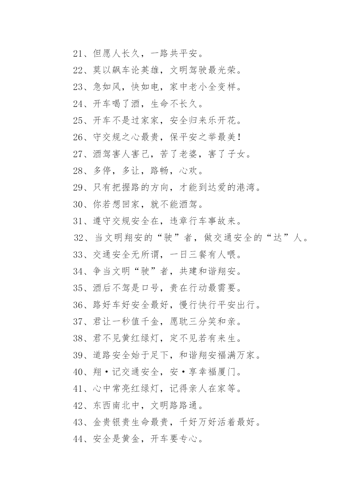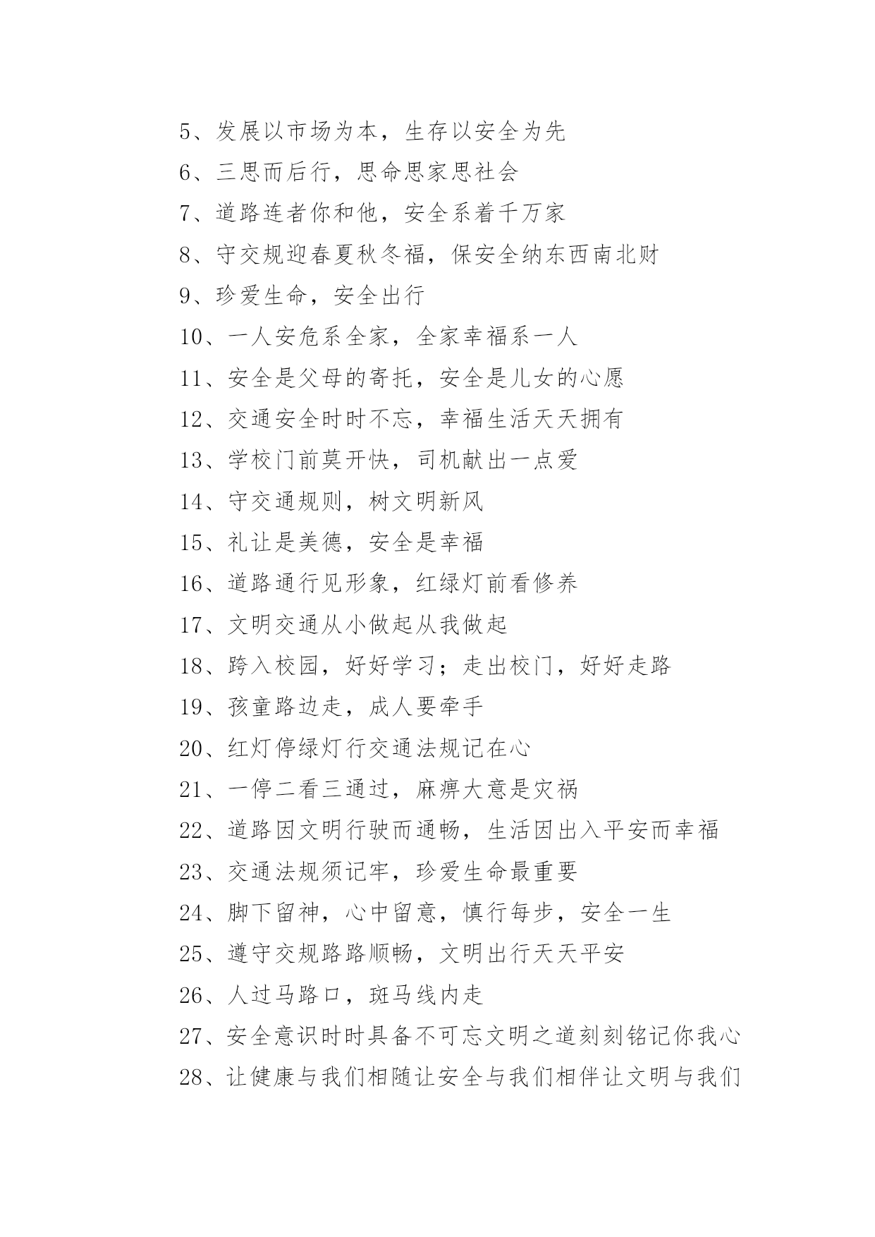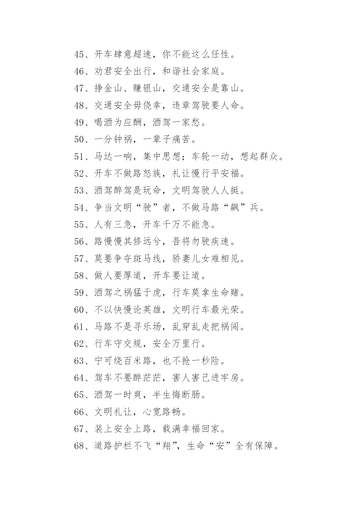 道路交通安全宣传的标语口号在现实生活或工作学习中,大家总免不了要接触或使用口号吧,口号的作用是便于“造势”,形成一种氛围。口号的类型有很多,你都知道吗?以下是小编帮大家整理的道路交通安全宣传的标语口号,希望能够帮助到大家。道路交通安全宣传的标语口号11、安全伴我在校园,我把安全带回家。2、小小黄帽每天戴,出行安全总常在。3、交通法规记心中,人身安全在手中。4、路无规不畅,国无法不宁。5、遵守交通法规,关隘生命旅程。6、金玉有值,生命无价,遵守交法,平安一生。7、乘文明车,走文明路,做文明人。8、走遍东西南北中,安全二字记心中。9、生命只有一次,安全伴君一生。10、行路慎为本,开车礼当先。道路交通安全宣传的标语口号21、行路慎为本,开车礼当先2、彼此让一让,路宽心舒畅3、交通安全进万家,出入平安你我他4、维护交通安全,关爱生命久远5、发展以市场为本,生存以安全为先6、三思而后行,思命思家思社会7、道路连者你和他,安全系着千万家8、守交规迎春夏秋冬福,保安全纳东西南北财9、珍爱生命,安全出行10、一人安危系全家,全家幸福系一人11、安全是父母的寄托,安全是儿女的心愿12、交通安全时时不忘,幸福生活天天拥有13、学校门前莫开快,司机献出一点爱14、守交通规则,树文明新风15、礼让是美德,安全是幸福16、道路通行见形象,红绿灯前看修养17、文明交通从小做起从我做起18、跨入校园,好好学习;走出校门,好好走路19、孩童路边走,成人要牵手20、红灯停绿灯行交通法规记在心21、一停二看三通过,麻痹大意是灾祸22、道路因文明行驶而通畅,生活因出入平安而幸福23、交通法规须记牢,珍爱生命最重要24、脚下留神,心中留意,慎行每步,安全一生25、遵守交规路路顺畅,文明出行天天平安26、人过马路口,斑马线内走27、安全意识时时具备不可忘文明之道刻刻铭记你我心28、让健康与我们相随让安全与我们相伴让文明与我们相拥29、安全——唱响生命之歌文明——点燃心灵之窗30、安全是人类共同的向往安全是快乐生活的根本。31、人生美好步步小心32、一秒钟车祸一辈子痛苦33、关爱生命创建和谐校园珍爱生命创建平安校园34、关注安全关爱生命35、把握安全,拥有明天。36、一切为了孩子一切想着孩子37、学校安全,要用显微镜查找隐患,用放大镜看待问题。38、安全伴我在校园,人人事事保平安。39、高高兴兴上学平平安安回家40、教室走廊不奔跑,安全第一真是好。41、爱我,追我,千万别吻我。42、司机一杯酒,亲人两行泪;43、手握方向盘,时刻想安全!44、带上平安上路,载着幸福回家;45、喝进去几滴美酒,流出来无数血泪;46、高高兴兴出门去,平平安安回家来;47、戴上安全帽,安全身旁绕;系上安全带,安全随时在48、酒后驾车罚款重;肇事丧命亲人痛49、遵守交通规则,享受美好人生50、一时快,一世毁礼让行驶,交通顺畅道路交通安全宣传的标语口号31、火灾无情,防火先行。2、消除火灾隐患,共创美好家园!3、贯彻消防法规,落实消防责任。4、用火安全大如天,防火知识记心田。5、消防安全天天抓,安全保障进万家。6、师生有情大火无情,校园防火警钟长鸣。7、消防事关你我他,安全系着千万家。8、普及消防知识,增强防火观念9、消防常识进万家,平安相伴你我他。10、消防意识强,生命得保障。11、人人防火,处处安全。道路交通安全宣传的标语口号41、今日注意安全,节日合家团圆。2、防微杜渐,警钟长鸣。3、安全你我共同的责任,平安你我共同的心愿。4、安全管理扣扣相连,生产效益节节攀高。5、质量是大厦的生命,安全是员工的生命。6、千忙万忙出了事故白忙,千苦万苦受伤害者最苦。7、事故猛于虎,安全贵如金。8、留一生安全给自己,送一份平安给家人。9、安全一万天,事故一瞬间。10、常在车间走,安全记心头。道路交通安全宣传的标语口号51、骑摩托车者不急不慌,开车者不怏不耍威风。2、你今要敢酒驾,明到天堂度假。3、勿以快慢论英雄,安全行车最光荣。4、同谱交通安全曲,共筑幸福翔安梦。5、开车心内毋通赶,免得吃快弄破碗。6、失去生命等于零,天大的`事请慢行。7、带叮咛上路,携平安归家。8、龙凤呈(乘)翔,道安前方。9、不分左右边,出(吃)事(亏)在眼前。10、文明礼让满面春风,翔安道安一路顺风。11、司机一杯酒,亲人两行泪。12、手握方向盘,电话勿接打。13、交通安全心头记,家中还有儿要育。14、文明同心,道安同行,翔安同梦。15、礼让自然路宽,向您道声平安。16、红灯面前等一等,幸福生活长又长。17、文明驾车是朵花,飙车违驾必定垮。18、从文明开“驶”,到安全为止。19、开车不斗气,安全要牢记。20、忽视交规吃苦头,盲视安全栽跟头。21、但愿人长久,一路共平安。22、莫以飙车论英雄,文明驾驶最光荣。23、急如风,快如电,家中