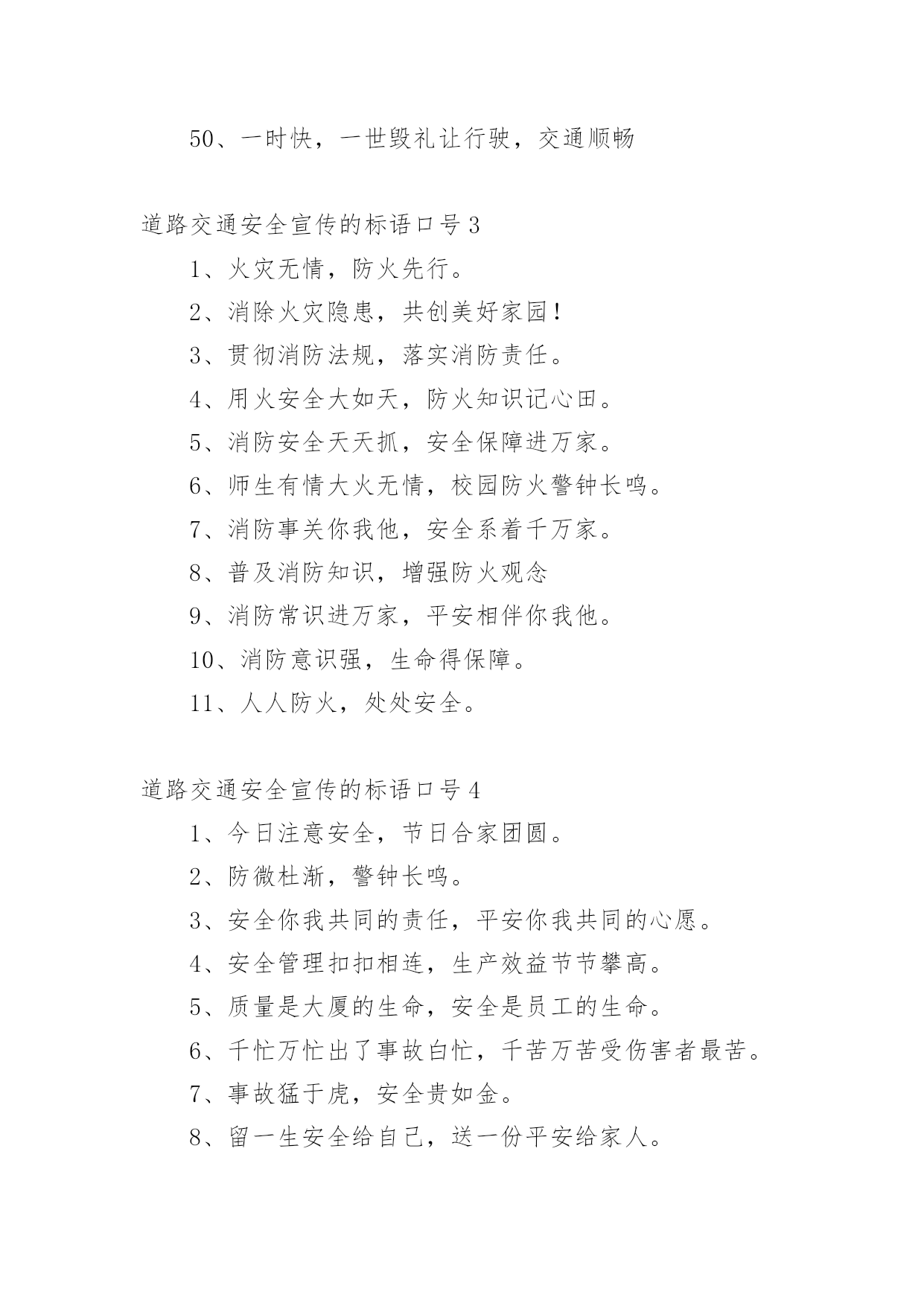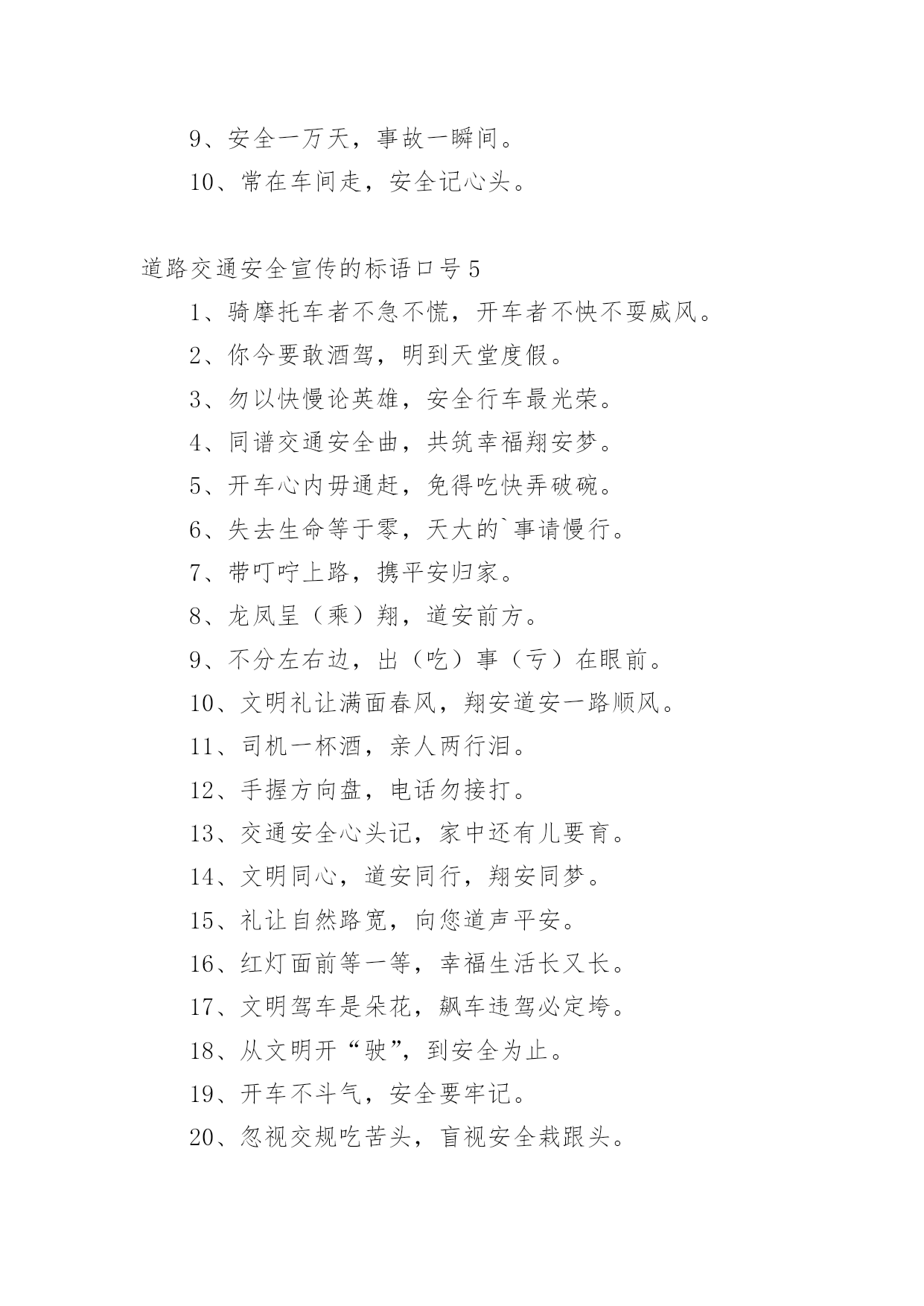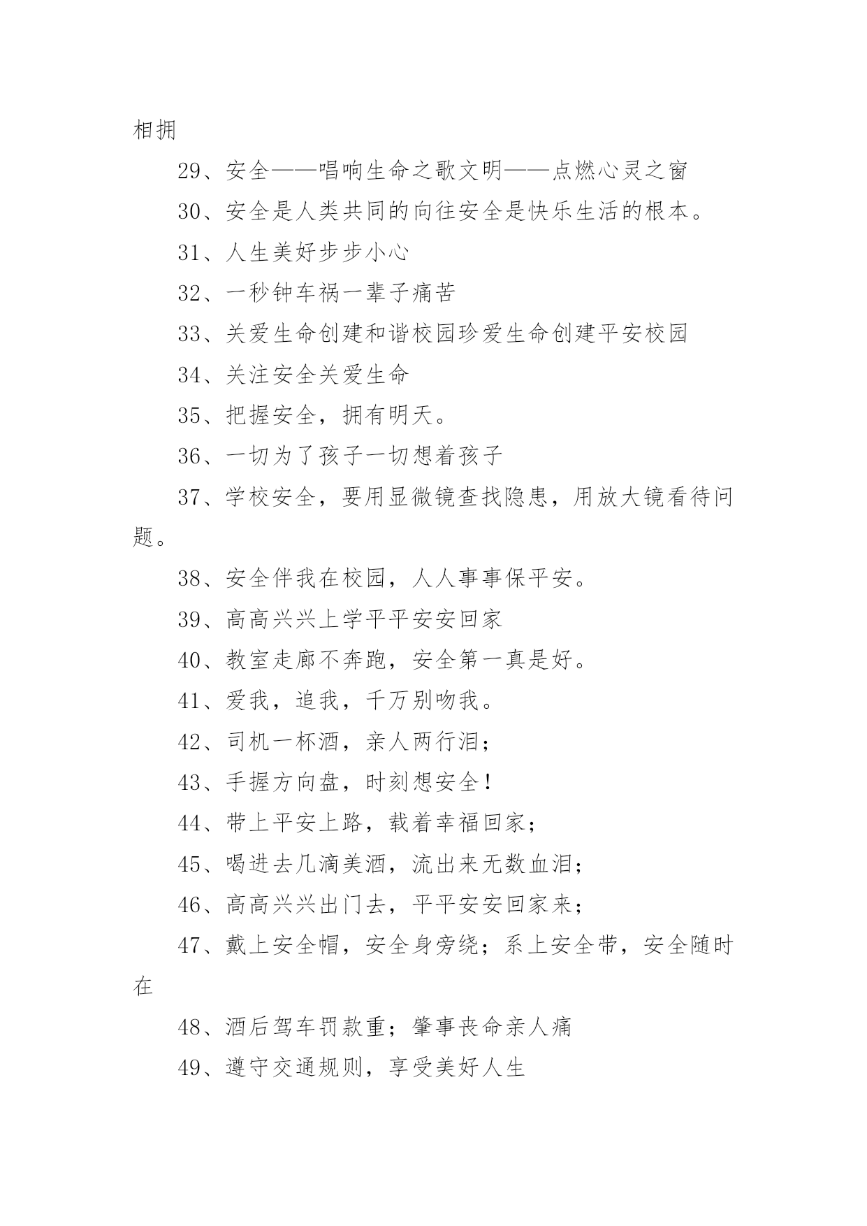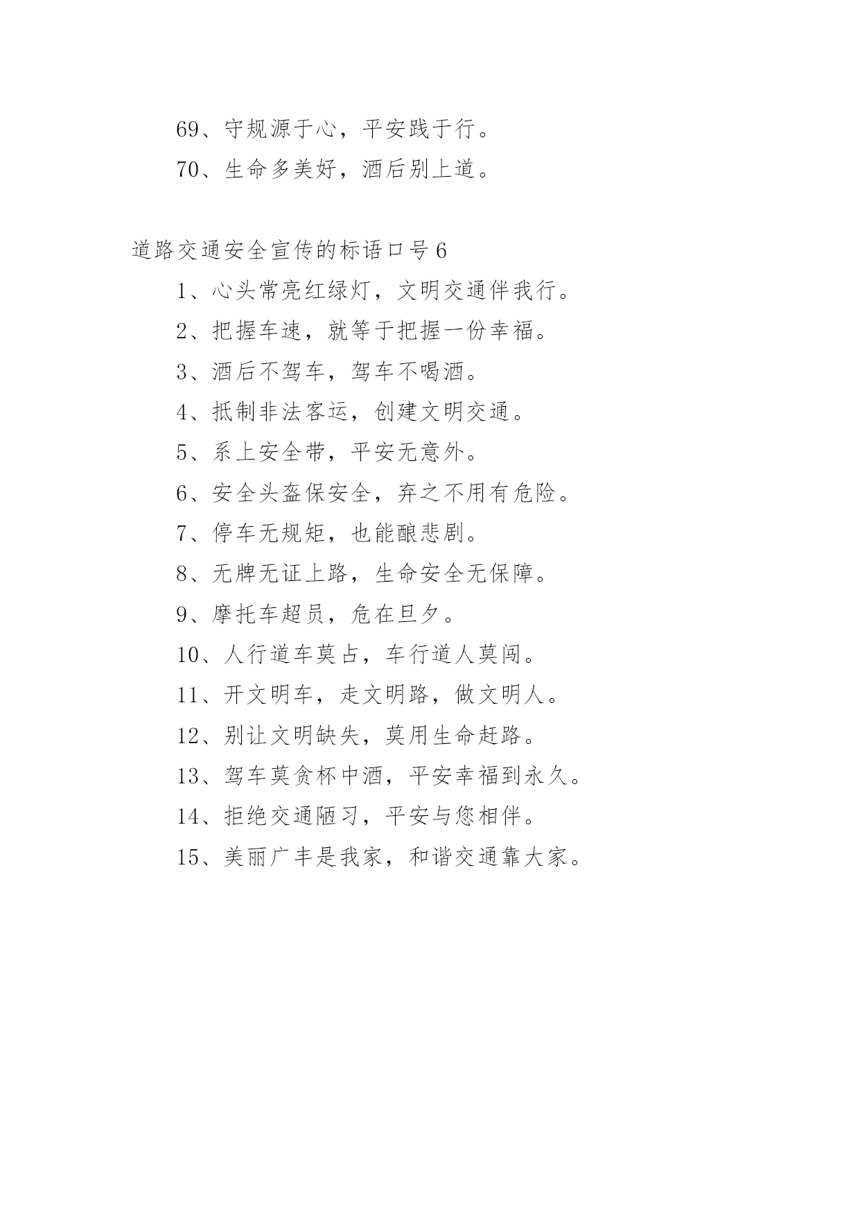 道路交通安全宣传的标语口号在现实生活或工作学习中,大家总免不了要接触或使用口号吧,口号的作用是便于“造势”,形成一种氛围。口号的类型有很多,你都知道吗?以下是小编帮大家整理的道路交通安全宣传的标语口号,希望能够帮助到大家。道路交通安全宣传的标语口号11、安全伴我在校园,我把安全带回家。2、小小黄帽每天戴,出行安全总常在。3、交通法规记心中,人身安全在手中。4、路无规不畅,国无法不宁。5、遵守交通法规,关隘生命旅程。6、金玉有值,生命无价,遵守交法,平安一生。7、乘文明车,走文明路,做文明人。8、走遍东西南北中,安全二字记心中。9、生命只有一次,安全伴君一生。10、行路慎为本,开车礼当先。道路交通安全宣传的标语口号21、行路慎为本,开车礼当先2、彼此让一让,路宽心舒畅3、交通安全进万家,出入平安你我他4、维护交通安全,关爱生命久远5、发展以市场为本,生存以安全为先6、三思而后行,思命思家思社会7、道路连者你和他,安全系着千万家8、守交规迎春夏秋冬福,保安全纳东西南北财9、珍爱生命,安全出行10、一人安危系全家,全家幸福系一人11、安全是父母的寄托,安全是儿女的心愿12、交通安全时时不忘,幸福生活天天拥有13、学校门前莫开快,司机献出一点爱14、守交通规则,树文明新风15、礼让是美德,安全是幸福16、道路通行见形象,红绿灯前看修养17、文明交通从小做起从我做起18、跨入校园,好好学习;走出校门,好好走路19、孩童路边走,成人要牵手20、红灯停绿灯行交通法规记在心21、一停二看三通过,麻痹大意是灾祸22、道路因文明行驶而通畅,生活因出入平安而幸福23、交通法规须记牢,珍爱生命最重要24、脚下留神,心中留意,慎行每步,安全一生25、遵守交规路路顺畅,文明出行天天平安26、人过马路口,斑马线内走27、安全意识时时具备不可忘文明之道刻刻铭记你我心28、让健康与我们相随让安全与我们相伴让文明与我们相拥29、安全——唱响生命之歌文明——点燃心灵之窗30、安全是人类共同的向往安全是快乐生活的根本。31、人生美好步步小心32、一秒钟车祸一辈子痛苦33、关爱生命创建和谐校园珍爱生命创建平安校园34、关注安全关爱生命35、把握安全,拥有明天。36、一切为了孩子一切想着孩子37、学校安全,要用显微镜查找隐患,用放大镜看待问题。38、安全伴我在校园,人人事事保平安。39、高高兴兴上学平平安安回家40、教室走廊不奔跑,安全第一真是好。41、爱我,追我,千万别吻我。42、司机一杯酒,亲人两行泪;43、手握方向盘,时刻想安全!44、带上平安上路,载着幸福回家;45、喝进去几滴美酒,流出来无数血泪;46、高高兴兴出门去,平平安安回家来;47、戴上安全帽,安全身旁绕;系上安全带,安全随时在48、酒后驾车罚款重;肇事丧命亲人痛49、遵守交通规则,享受美好人生50、一时快,一世毁礼让行驶,交通顺畅道路交通安全宣传的标语口号31、火灾无情,防火先行。2、消除火灾隐患,共创美好家园!3、贯彻消防法规,落实消防责任。4、用火安全大如天,防火知识记心田。5、消防安全天天抓,安全保障进万家。6、师生有情大火无情,校园防火警钟长鸣。7、消防事关你我他,安全系着千万家。8、普及消防知识,增强防火观念9、消防常识进万家,平安相伴你我他。10、消防意识强,生命得保障。11、人人防火,处处安全。道路交通安全宣传的标语口号41、今日注意安全,节日合家团圆。2、防微杜渐,警钟长鸣。3、安全你我共同的责任,平安你我共同的心愿。4、安全管理扣扣相连,生产效益节节攀高。5、质量是大厦的生命,安全是员工的生命。6、千忙万忙出了事故白忙,千苦万苦受伤害者最苦。7、事故猛于虎,安全贵如金。8、留一生安全给自己,送一份平安给家人。9、安全一万天,事故一瞬间。10、常在车间走,安全记心头。道路交通安全宣传的标语口号51、骑摩托车者不急不慌,开车者不怏不耍威风。2、你今要敢酒驾,明到天堂度假。3、勿以快慢论英雄,安全行车最光荣。4、同谱交通安全曲,共筑幸福翔安梦。5、开车心内毋通赶,免得吃快弄破碗。6、失去生命等于零,天大的`事请慢行。7、带叮咛上路,携平安归家。8、龙凤呈(乘)翔,道安前方。9、不分左右边,出(吃)事(亏)在眼前。10、文明礼让满面春风,翔安道安一路顺风。11、司机一杯酒,亲人两行泪。12、手握方向盘,电话勿接打。13、交通安全心头记,家中还有儿要育。14、文明同心,道安同行,翔安同梦。15、礼让自然路宽,向您道声平安。16、红灯面前等一等,幸福生活长又长。17、文明驾车是朵花,飙车违驾必定垮。18、从文明开“驶”,到安全为止。19、开车不斗气,安全要牢记。20、忽视交规吃苦头,盲视安全栽跟头。21、但愿人长久,一路共平安。22、莫以飙车论英雄,文明驾驶最光荣。23、急如风,快如电,家中
