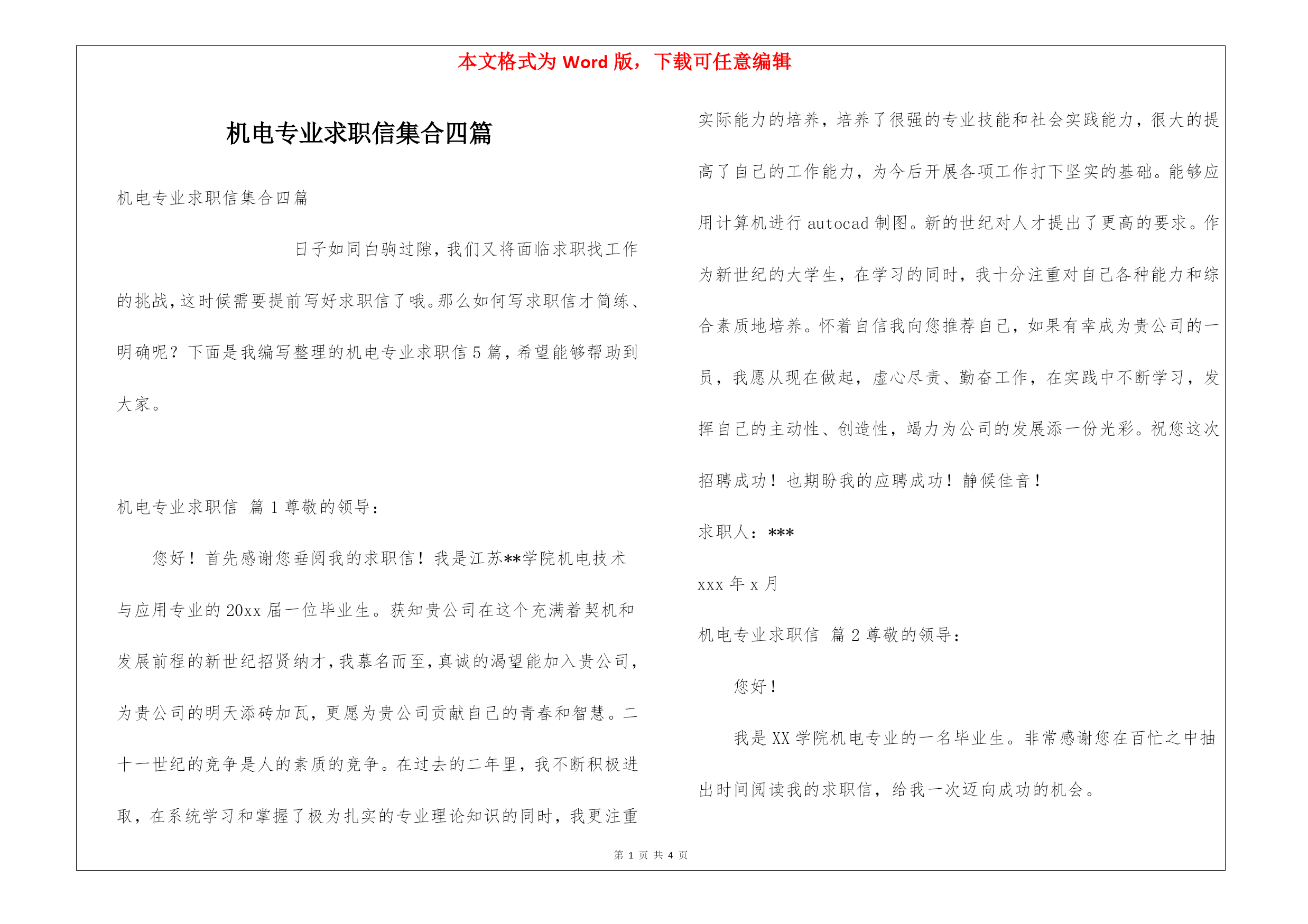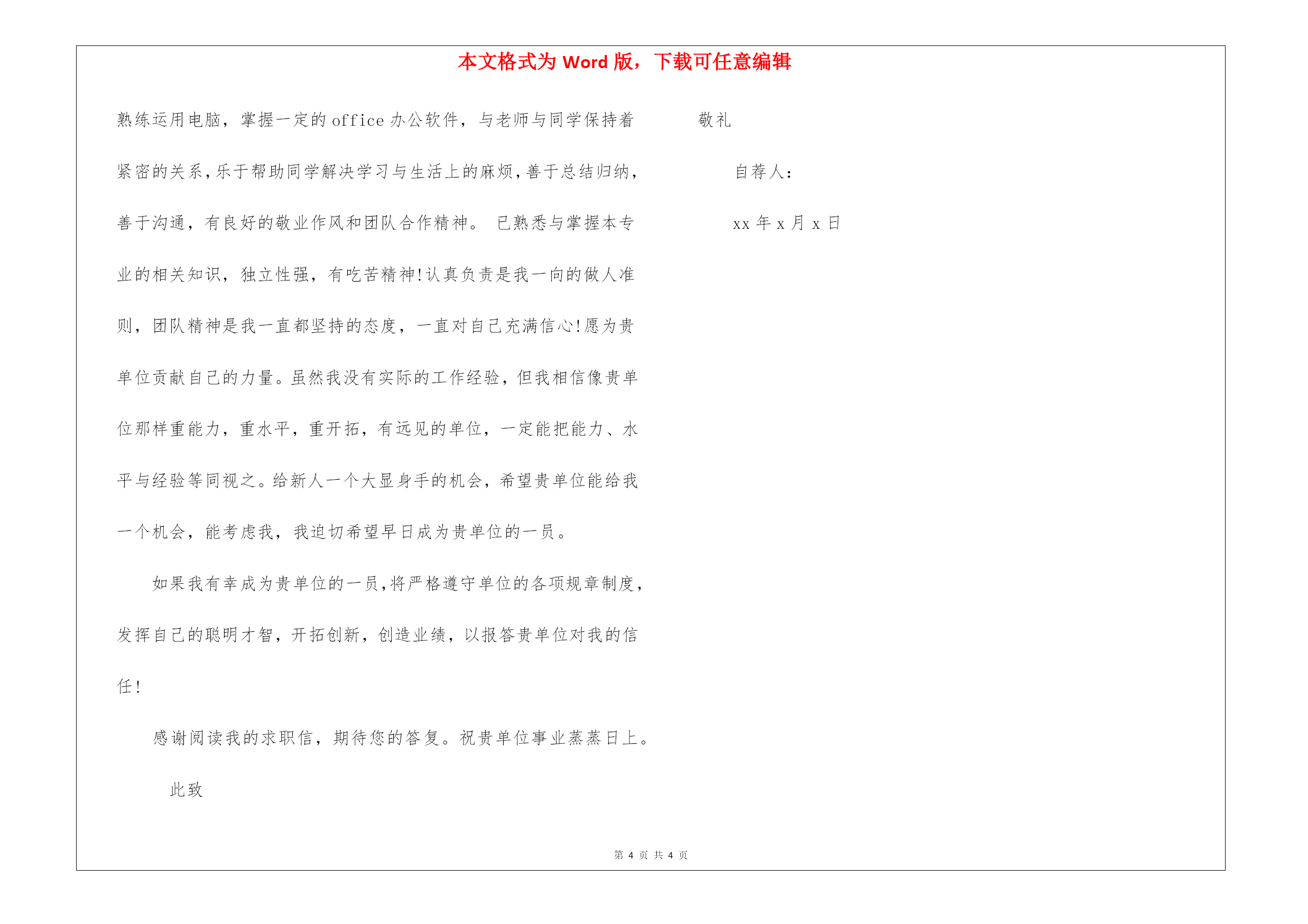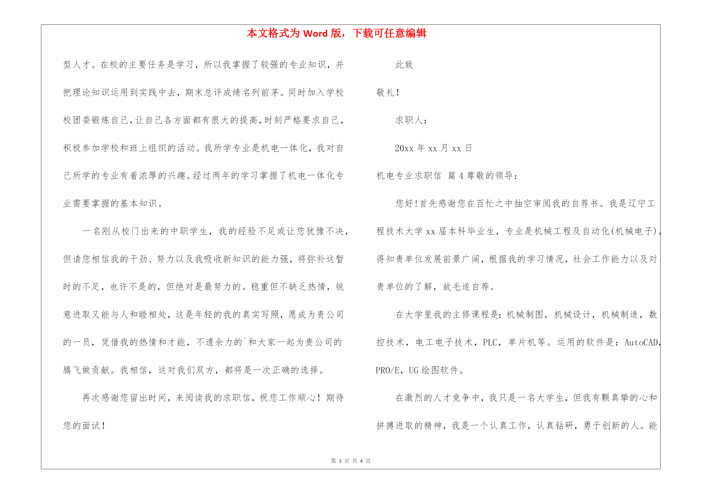 本文格式为Word版,下载可任意编辑第PAGE\*MERGEFORMAT4页共NUMPAGES\*MERGEFORMAT4页机电专业求职信集合四篇机电专业求职信集合四篇日子如同白驹过隙,我们又将面临求职找工作的挑战,这时候需要提前写好求职信了哦。那么如何写求职信才简练、明确呢?下面是我编写整理的机电专业求职信5篇,希望能够帮助到大家。机电专业求职信篇1尊敬的领导:您好!首先感谢您垂阅我的求职信!我是江苏**学院机电技术与应用专业的20xx届一位毕业生。获知贵公司在这个充满着契机和发展前程的新世纪招贤纳才,我慕名而至,真诚的渴望能加入贵公司,为贵公司的明天添砖加瓦,更愿为贵公司贡献自己的青春和智慧。二十一世纪的竞争是人的素质的竞争。在过去的二年里,我不断积极进取,在系统学习和掌握了极为扎实的专业理论知识的同时,我更注重实际能力的培养,培养了很强的专业技能和社会实践能力,很大的提高了自己的工作能力,为今后开展各项工作打下坚实的基础。能够应用计算机进行autocad制图。新的世纪对人才提出了更高的要求。作为新世纪的大学生,在学习的同时,我十分注重对自己各种能力和综合素质地培养。怀着自信我向您推荐自己,如果有幸成为贵公司的一员,我愿从现在做起,虚心尽责、勤奋工作,在实践中不断学习,发挥自己的主动性、创造性,竭力为公司的发展添一份光彩。祝您这次招聘成功!也期盼我的应聘成功!静候佳音!求职人:***xxx年x月机电专业求职信篇2尊敬的领导:您好!我是XX学院机电专业的一名毕业生。非常感谢您在百忙之中抽出时间阅读我的求职信,给我一次迈向成功的机会。大学四年转眼即过,我满怀希望地走进社会这个更加博大的课堂。当今世界充满着竞争、充满着挑战,也充满了机遇。我希望能从贵公司得到一个机会、一个舞台,用我所学去服务公司,服务社会。大学期间,本着严谨求学的态度,在学习中我注重实际能力的培养,把专业知识与实践相结合,积极主动地参加各种社会活动,将我所学用于实践,不断增强自己的工作能力,为今后开展各项工作打下坚实的基础。在校期间主要学习电工原理、电子技术、电机学、自动控制原理、CAD制图、供矿山供电、PLC与电气控制、单片机、微机原理、采矿技术、矿山固定机械与提升等。在计算机方面,我广泛地学习计算机软、硬件方面的知识,能熟练地运用Window、Office、VF等软件,同时对Internet有一定的了解,能够有效地利用互联网资源。怀着自信我向您介绍自己,如果有幸成为贵公司的一员,我愿从小事情做起,虚心尽责、勤奋工作,在实践中不断学习,发挥自己的主动性、创造性,竭力为公司的发展添一份光彩。最后,衷心的感谢您在百忙之中阅读我的求职信,祝愿贵单位事业蒸蒸日上!此致敬礼!求职人:XXXXXXX年XX月XX日机电专业求职信篇3尊敬的贵公司领导:你好!我的名字叫xxx,我是XX中心20xx级机电一体化专业。毕业将至,我满怀期待的为自己的第一份工作准备着,等待着我继续努力奋斗、迎接挑战。时光飞梭,转眼两年过去了。怀着理想即将离开学校,走上工作岗位。职校两年是我思想、知识结构及心理、生长成熟的两年。在xx职教中心浓厚的学习、创新氛围中,熔融其中两年使我成为一名复合型人才。在校的主要任务是学习,所以我掌握了较强的专业知识,并把理论知识运用到实践中去,期末总评成绩名列前茅。同时加入学校校团委锻炼自己,让自己各方面都有很大的提高,时刻严格要求自己,积极参加学校和班上组织的活动。我所学专业是机电一体化,我对自己所学的专业有着浓厚的兴趣。经过两年的学习掌握了机电一体化专业需要掌握的基本知识。一名刚从校门出来的中职学生,我的经验不足或让您犹豫不决,但请您相信我的干劲、努力以及我吸收新知识的能力强,将弥补这暂时的不足,也许不是的,但绝对是最努力的。稳重但不缺乏热情,锐意进取又能与人和睦相处,这是年轻的我的真实写照,愿成为贵公司的一员,凭借我的热情和才能,不遗余力的`和大家一起为贵公司的腾飞做贡献。我相信,这对我们双方,都将是一次正确的选择。再次感谢您留出时间,来阅读我的求职信,祝您工作顺心!期待您的面试!此致敬礼!求职人:20xx年xx月xx日机电专业求职信篇4尊敬的领导:您好!首先感谢您在百忙之中抽空审阅我的自荐书。我是辽宁工程技术大学xx届本科毕业生,专业是机械工程及自动化(机械电子)。得知贵单位发展前景广阔,根据我的学习情况,社会工作能力以及对贵单位的了解,故毛遂自荐。在大学里我的主修课程是:机械制图,机械设计,机械制造,数控技术,电工电子技术,PLC,单片机等。运用的软件是:AutoCAD,PRO/E,UG绘图软件。在激烈的人才竞争中,我只是一名大学生,但我有颗真挚的心和拼搏进取的精神,我是一个认真工作,认真钻研,勇于创新的人。能熟练运用电脑,掌握一定的off