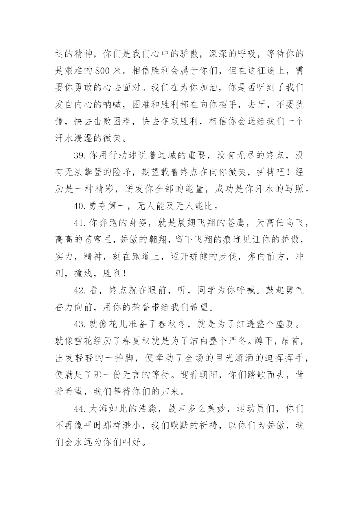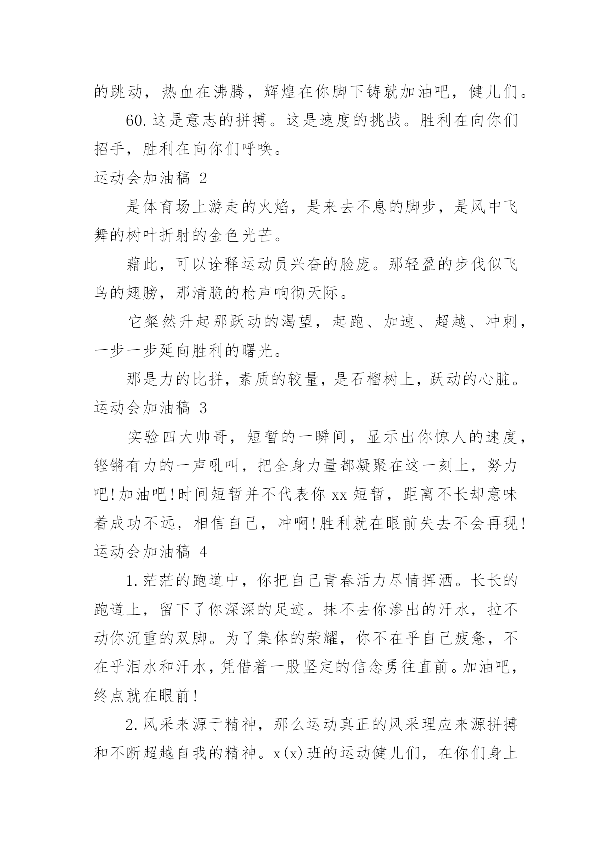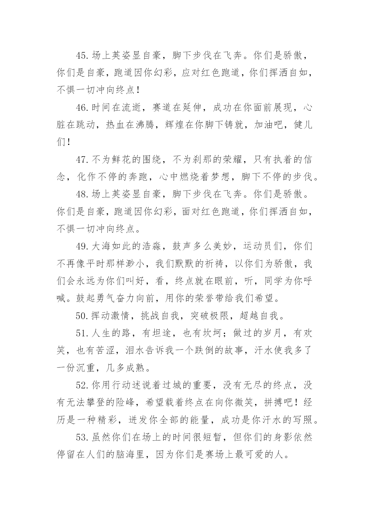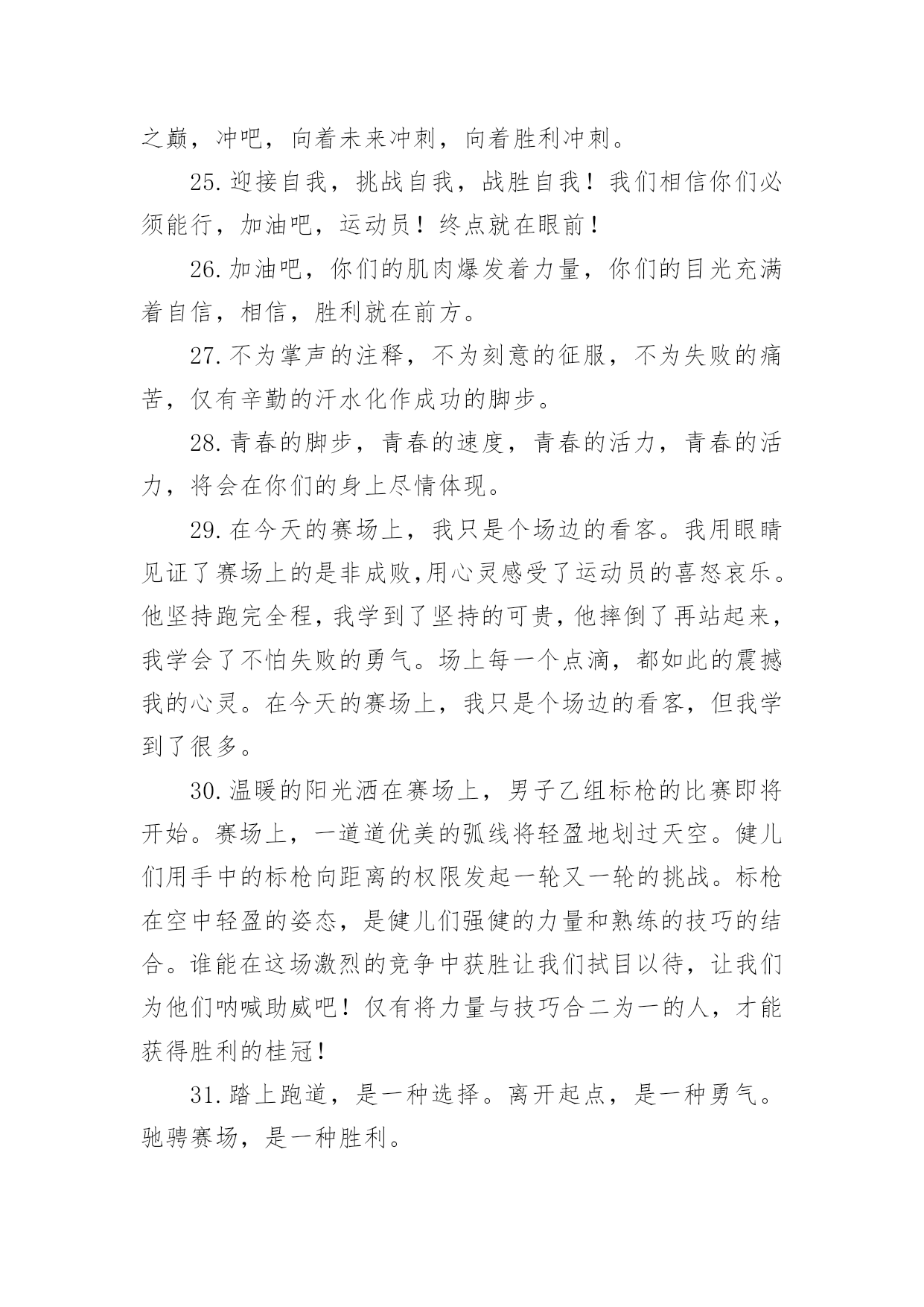 运动会加油稿运动会加油稿(集合15篇)在生活中,能够利用到加油稿的场合越来越多,加油稿是鼓励激励对方的文稿。写加油稿的注意事项有许多,你确定会写吗?以下是小编帮大家整理的运动会加油稿,欢迎大家分享。运动会加油稿11.理想毕竟不同于现实,失败是生活的一部分,谁也无法选择,无法拒绝。人生要自己去拼搏,去奋斗,在风雨中百折不挠勇往前进,在集资的每个驿站上都留下一段不悔的回忆。流泪不是失落,徘徊不是迷惑,成功属于那些战胜失败,坚持不懈、勇于追求梦想的人。加油吧,运动健儿们!2.真心祝愿机会是什么?是不可错过的刹那间。呐喊是什么?是为那刹那间的真心祝愿。加油加油你肯定听到了那一声声呐喊你肯定看到了那双双期待的眼睛你肯定感受到了那发自内心的祝愿。3.不为掌声的诠释,不为刻意的征服,只有辛勤的汗水化作追求的脚步,心中坚定的信念,脚下你的汗水洒在跑道,浇灌着成功的花朵开放。你的欢笑飞扬在赛场,为班争光数你最棒。跑吧,追吧在这广阔的赛场上,你似骏马似离铉的箭。跑吧,追吧你比虎猛比豹强。4.你们挥舞着充满力量的双臂看着实心球化成美丽的弧线我着实在心里佩服你们你们抛出了自己的水平。5.一根小小的木棒,连接的是团结和友爱一根小小的木棒,传递的是勇气和力量一根小小的木棒,演绎的是奋斗和拼搏加油吧!让这激动人心的时刻,一直回荡在我们心中!6.只是一道过场,几秒钟转瞬即逝,可是这背后承载的是多少成败,加油吧,少年。7.我运动,我健康,此时我欢乐。8.一根小小的木棒,连接的是团结和友爱一根小小的木棒,传递的是勇气和力量,一根小小的木棒,演绎的是奋斗和拼搏,加油吧!让这激动人心的时刻,一直回荡在我们心中!9.有多少次挥汗如雨,伤痛曾添满记忆,只因为始终相信,去拼搏才能胜利。总在鼓舞自己,要成功就得努力。热血在赛场沸腾,巨人在赛场升起。相信自己,你将赢得胜利,创造奇迹;相信自己,梦想在你手中,这是你的天地。当一切过去,你们将是第一。相信自己,你们将超越极限,超越自己!相信自己,加油吧,健儿们,相信你自己。10.年轻的我们自信飞扬,青春的气息如同出生的朝阳,蓬勃的力量如同阳光的挥洒。此时此刻,跑道便是我们精彩的舞台,声声加油便是我们的奖项!论何成功,谈何荣辱,心中的信念只有一个:拼搏!萧瑟的秋风,挡不住你们破竹的锐气。11.广阔的绿茵场,是为你们搭建的舞台。张扬吧,年轻的心,我们将为你永远喝彩!12.泰戈尔在诗中说,天空没有翅膀的影子,但我已飞过;艾青对朋友说,也许有人到达不了彼岸,但我们共同拥有大海。也许你们没有显赫的成绩,但运动场上留下了你们的足迹。也许你们没有奖品,但我们心中留下了你们拼搏的身影。所有的努力都是为了迎接这一刹那,所有的拼搏都是为了这一声令下。13.枪声响起,你们的征程开始在脚下,你们飞逝在跑道上的背景,将迎来只属于你们的掌声。14.运动场上彩旗飘,运动健儿显英豪,加油!15.看!那一面面迎风飘舞的彩旗,是一朵朵盛开的鲜花;听!那一阵阵惊天动地的欢呼,是回响在耳边胜利的风声。运动场上的你们,是胜利的标志,运动场上的你们,是青春的赞叹。去吧!去迎接那伟大的挑战,去吧!去做一名追风的少年。16.你是运动场的心脏,跳动梦想;你是漫长路的精神,激励辉煌;你们是将上下求索的人!风为你加油,云为你助兴,坚定,执着,耐力与希望,在延伸的白色跑道中点点凝聚!力量,信念,拼搏与奋斗,在遥远的终点线上渐渐明亮!时代的强音正在你的脚下踏响。17.你的风姿,你的呼吸还有你呼啸而过的飓风,今日注定是属于你的日子,今日你注定将要创造辉煌。18.每一份辛劳都有一份收获,每一次的痛苦都是快乐的开始,每一声呐喊都是力量的呼唤。我们有着大浪拍岸的豪迈,所以你不必在乎小荷初露的恬静,我们有着春日的阳光明媚,所以不用去羡慕冬日乱玉碎琼,我们是雨天的一把伞,是寒冷冬日里的一盆碳火,温暖的不只是你我,而是大家的心。运动场上的健儿,掌声属于你们,鲜花属于你们,成功也是属于你们!19.生活中,我们每天都在尝试;我们走向成功,品味失败,走过心灵的阴雨晴空。运动员们,不要放弃尝试,无论失败与否,重要的是你勇于参与的精神,付出的背后是胜利;无论是否成功,我们永远赞美你,你们永远是我们的骄傲。20.起跑线上,你们一字排开。健美的肌肉蕴含着爆发力量,坚定的目光中充满了自信。枪响了,你们开始了并不长的征程。笔直的跑道上,有你们稳健的足迹。不远的终点,将留下你们冲刺时矫捷的背影。加油吧,掌声将为你响起;加油吧,胜利和鲜花终将属于你。21.不长不短的距离,需要的是全身心全程投入,自始至终你们都在拼全力此时此刻,你们处在最风光的一刻,无论第几坚持胜利的信心,只要跑下来,你们就是英雄。22.大海如此的浩淼,鼓声多么美妙,运动员们,你们不再像平时那样渺小,我们默默的祈祷,以你们为骄傲,我们会永远为你们叫好!2