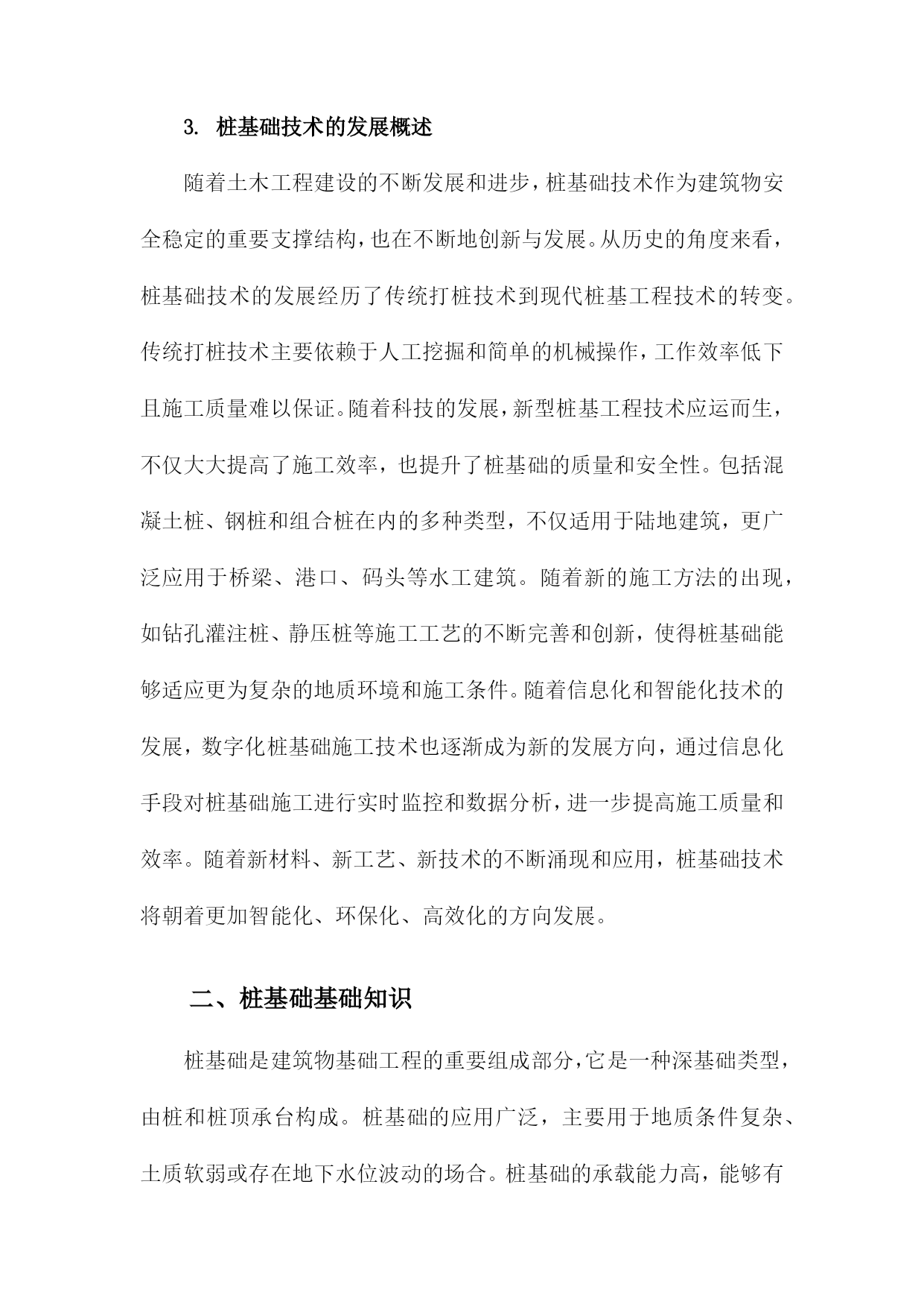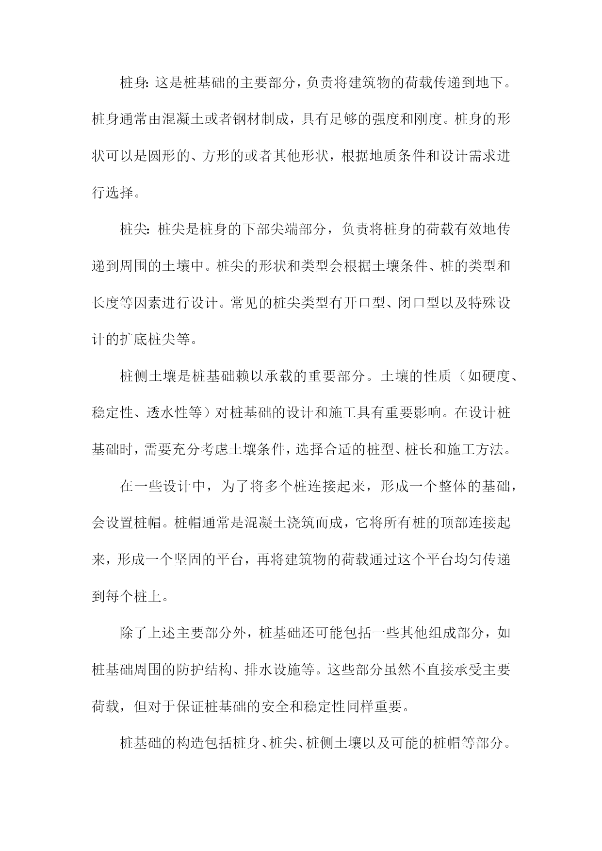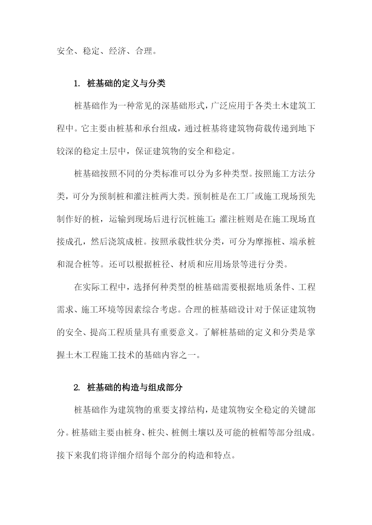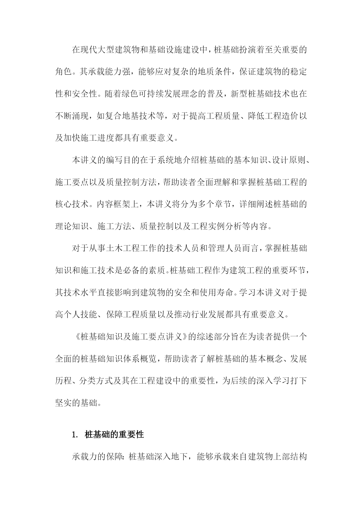 桩基础知识及施工要点讲义一、综述随着现代建筑技术的不断发展,桩基础作为建筑物的重要支撑结构,其设计、施工及控制质量显得尤为关键。本章节作为《桩基础知识及施工要点讲义》的综述部分,旨在全面概述桩基础的基本概念、发展历程、分类方式及其在工程建设中的重要作用。本部分还将介绍本次讲义的编写目的、内容框架以及学习本章节对于掌握桩基础知识和施工技术的必要性。桩基础作为建筑物的基础类型之一,是指由多根桩体组成的桩基所支撑的结构。桩基础的应用历史悠久,随着土木工程技术的进步,其设计理念、施工工艺及材料选择均得到了不断的优化与创新。从早期的简单木桩、石桩到现代的高强度预应力混凝土桩、钢桩,桩基础的形式和材料都在不断发展和完善。根据不同的分类标准,桩基础可分为多种类型。按照材料划分,可分为混凝土桩、钢桩等;按照施工方法划分,则可分为钻孔灌注桩、人工挖孔桩、预制桩等。每一种类型的桩基础都有其特定的适用场景和工程特性,在实际工程中需要根据地质条件、工程需求以及经济因素进行综合考虑和选择。在现代大型建筑物和基础设施建设中,桩基础扮演着至关重要的角色。其承载能力强,能够应对复杂的地质条件,保证建筑物的稳定性和安全性。随着绿色可持续发展理念的普及,新型桩基础技术也在不断涌现,如复合地基技术等,对于提高工程质量、降低工程造价以及加快施工进度都具有重要意义。本讲义的编写目的在于系统地介绍桩基础的基本知识、设计原则、施工要点以及质量控制方法,帮助读者全面理解和掌握桩基础工程的核心技术。内容框架上,本讲义将分为多个章节,详细阐述桩基础的理论知识、施工方法、质量控制以及工程实例分析等内容。对于从事土木工程工作的技术人员和管理人员而言,掌握桩基础知识和施工技术是必备的素质。桩基础工程作为建筑工程的重要环节,其技术水平直接影响到建筑物的安全和使用寿命。学习本讲义对于提高个人技能、保障工程质量以及推动行业发展都具有重要意义。《桩基础知识及施工要点讲义》的综述部分旨在为读者提供一个全面的桩基础知识体系概览,帮助读者了解桩基础的基本概念、发展历程、分类方式及其在工程建设中的重要性,为后续的深入学习打下坚实的基础。1.桩基础的重要性承载力的保障:桩基础深入地下,能够承载来自建筑物上部结构的重量和其他附加荷载,确保建筑物的稳定性和安全性。特别是在地质条件复杂的地区,桩基础能够提供可靠的承载力,防止建筑物因地质问题而发生失稳。抗震性能的提升:桩基础通过深入地下,能够有效抵抗地震力的作用,提高建筑物的抗震性能。在地震发生时,桩基础能够将地震力分散到周围土壤中,减少建筑物受到的伤害。适应不同地质条件:由于地质条件的多样性,桩基础可以根据不同的地质条件进行设计。在软弱地基、岩石地层、地下水位变化较大的地区,桩基础能够提供良好的支撑,确保建筑物的正常运营。提高土地利用率:桩基础能够使得建筑物建造在地下较深的位置,有效节省地面空间,提高土地利用率。在城市建设中,桩基础的应用对于实现土地的集约化利用具有重要意义。桩基础作为建筑物的重要组成部分,其重要性不容忽视。在土木工程建设中,应充分了解桩基础的原理和施工技术,确保桩基础的质量和安全,以保障建筑物的稳定和安全。2.桩基础工程的应用领域桩基础工程以其独特的优势,在建筑行业中占据了举足轻重的地位。其应用领域十分广泛,几乎涵盖了所有类型的建筑工程。高层建筑:随着城市化进程的加快,高层建筑如雨后春笋般涌现。这些建筑对地基的要求极高,为确保建筑的安全稳定,桩基础工程得到了广泛应用。通过打入地下深处的桩,能有效承载上部结构的重量,提供稳定的地基支撑。桥梁工程:桥梁特别是大型桥梁建设对地基的要求十分严格。桩基础工程通过深入地下的桩体,能够很好地承受桥梁带来的巨大压力,确保桥梁的安全使用。高速公路与铁路:在交通建设中,高速公路和铁路的建设同样需要稳定的桩基础来支撑。特别是在地质条件复杂的地区,桩基础工程能够提供良好的承载力,保证交通线路的平稳运行。水利工程:水利工程如大坝、水库等建设在地基处理上具有极高的要求。桩基础工程能够提供强大的支撑力,确保水利工程的稳定与安全。港口与码头建设:港口码头需要承受大型船舶的停靠和装卸作业带来的巨大压力。桩基础工程能够深入地下,提供稳固的支撑,确保港口码头的正常使用。桩基础工程在市政工程、防灾工程、环境保护工程等领域也有广泛的应用。桩基础工程因其特有的优越性,几乎涵盖了所有的土木工程建设领域。在实际工程中,根据不同的地质条件、工程要求和施工环境,选择合适的桩型及施工方法,确保工程的安全性和稳定性。3.桩基础技术的发展概述随着土木工程建设的不断发展和进步,桩基础技术作为建筑物安全稳定的重要支撑结构,也在不断地创新与发展。从历史的角度来看,桩基础技术的发展经历了传统打桩技术到现代桩