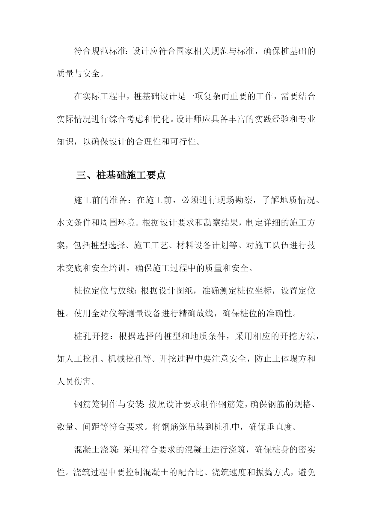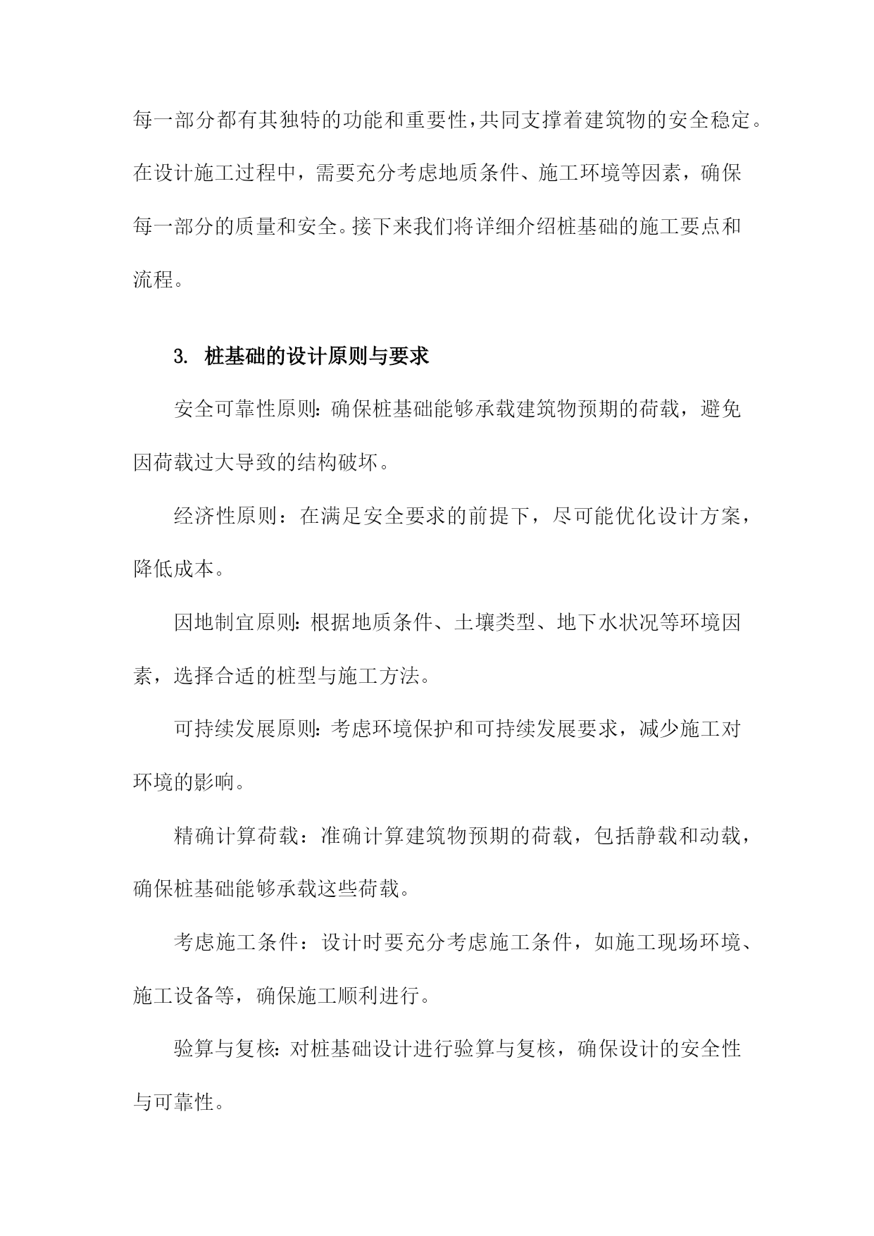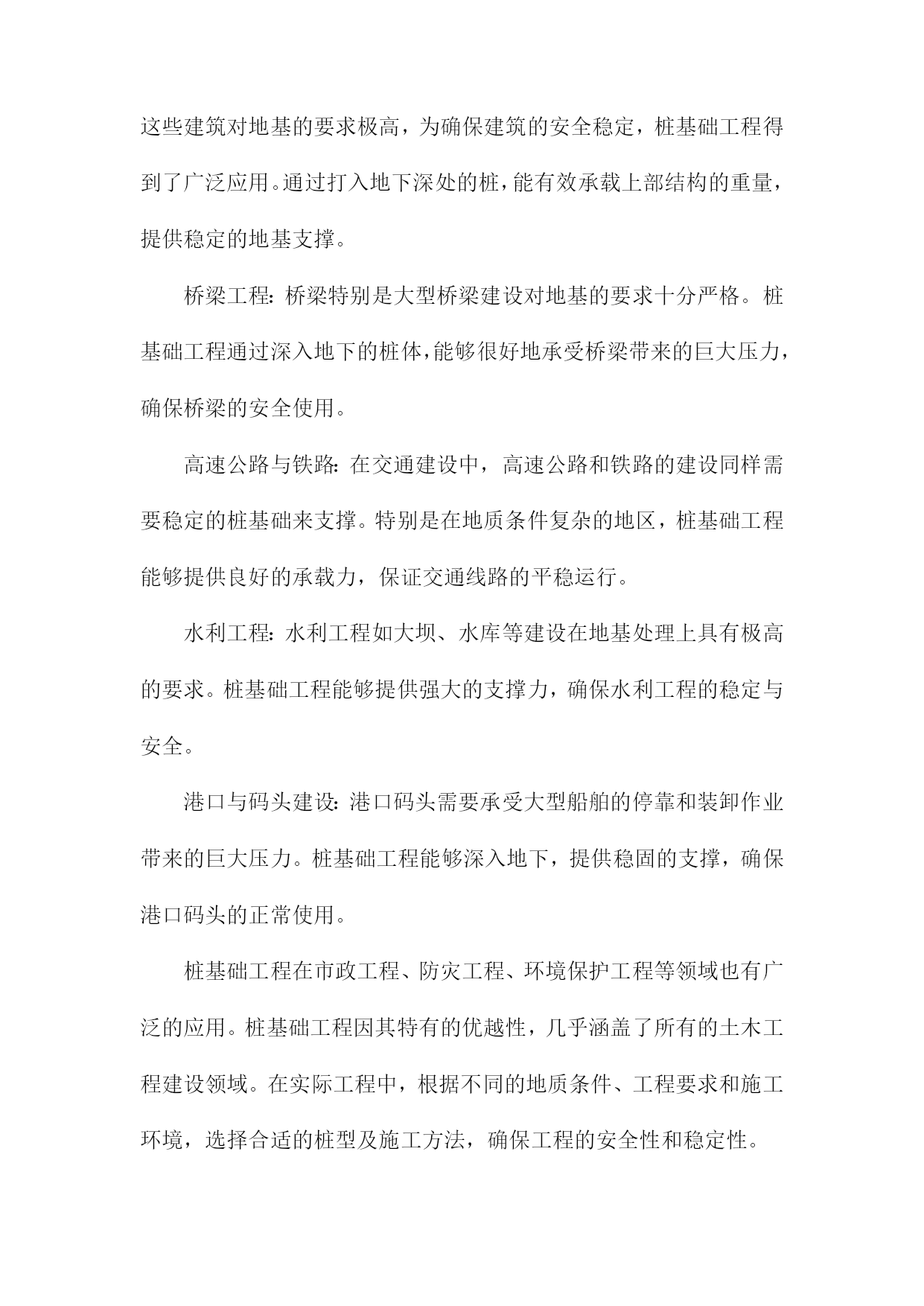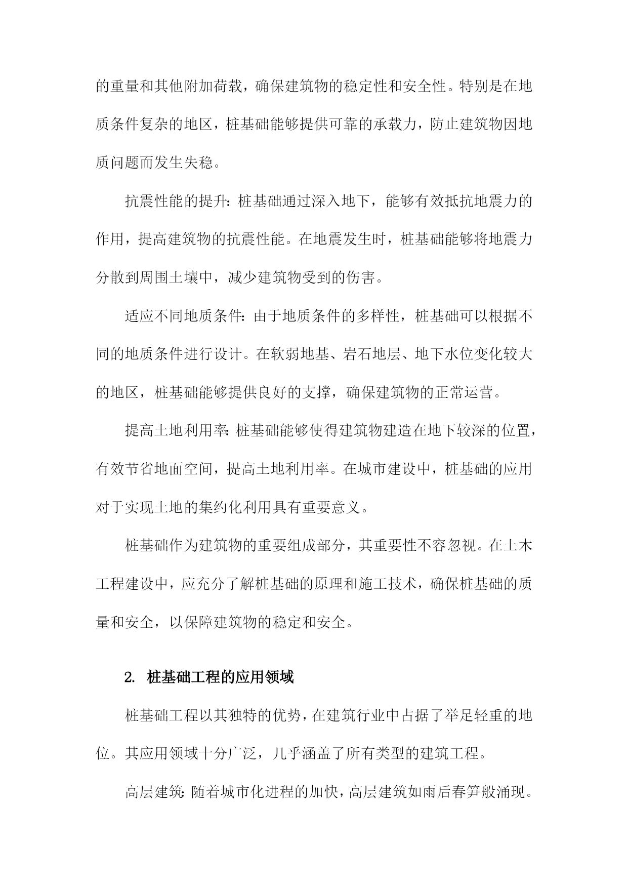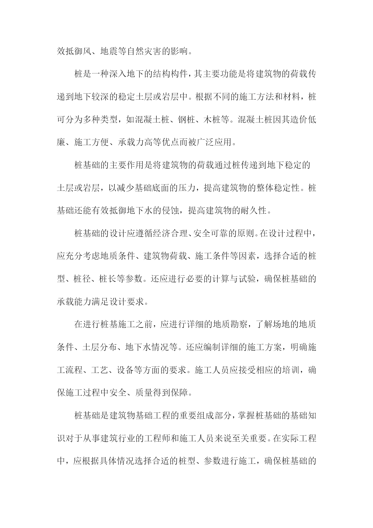 桩基础知识及施工要点讲义一、综述随着现代建筑技术的不断发展,桩基础作为建筑物的重要支撑结构,其设计、施工及控制质量显得尤为关键。本章节作为《桩基础知识及施工要点讲义》的综述部分,旨在全面概述桩基础的基本概念、发展历程、分类方式及其在工程建设中的重要作用。本部分还将介绍本次讲义的编写目的、内容框架以及学习本章节对于掌握桩基础知识和施工技术的必要性。桩基础作为建筑物的基础类型之一,是指由多根桩体组成的桩基所支撑的结构。桩基础的应用历史悠久,随着土木工程技术的进步,其设计理念、施工工艺及材料选择均得到了不断的优化与创新。从早期的简单木桩、石桩到现代的高强度预应力混凝土桩、钢桩,桩基础的形式和材料都在不断发展和完善。根据不同的分类标准,桩基础可分为多种类型。按照材料划分,可分为混凝土桩、钢桩等;按照施工方法划分,则可分为钻孔灌注桩、人工挖孔桩、预制桩等。每一种类型的桩基础都有其特定的适用场景和工程特性,在实际工程中需要根据地质条件、工程需求以及经济因素进行综合考虑和选择。在现代大型建筑物和基础设施建设中,桩基础扮演着至关重要的角色。其承载能力强,能够应对复杂的地质条件,保证建筑物的稳定性和安全性。随着绿色可持续发展理念的普及,新型桩基础技术也在不断涌现,如复合地基技术等,对于提高工程质量、降低工程造价以及加快施工进度都具有重要意义。本讲义的编写目的在于系统地介绍桩基础的基本知识、设计原则、施工要点以及质量控制方法,帮助读者全面理解和掌握桩基础工程的核心技术。内容框架上,本讲义将分为多个章节,详细阐述桩基础的理论知识、施工方法、质量控制以及工程实例分析等内容。对于从事土木工程工作的技术人员和管理人员而言,掌握桩基础知识和施工技术是必备的素质。桩基础工程作为建筑工程的重要环节,其技术水平直接影响到建筑物的安全和使用寿命。学习本讲义对于提高个人技能、保障工程质量以及推动行业发展都具有重要意义。《桩基础知识及施工要点讲义》的综述部分旨在为读者提供一个全面的桩基础知识体系概览,帮助读者了解桩基础的基本概念、发展历程、分类方式及其在工程建设中的重要性,为后续的深入学习打下坚实的基础。1.桩基础的重要性承载力的保障:桩基础深入地下,能够承载来自建筑物上部结构的重量和其他附加荷载,确保建筑物的稳定性和安全性。特别是在地质条件复杂的地区,桩基础能够提供可靠的承载力,防止建筑物因地质问题而发生失稳。抗震性能的提升:桩基础通过深入地下,能够有效抵抗地震力的作用,提高建筑物的抗震性能。在地震发生时,桩基础能够将地震力分散到周围土壤中,减少建筑物受到的伤害。适应不同地质条件:由于地质条件的多样性,桩基础可以根据不同的地质条件进行设计。在软弱地基、岩石地层、地下水位变化较大的地区,桩基础能够提供良好的支撑,确保建筑物的正常运营。提高土地利用率:桩基础能够使得建筑物建造在地下较深的位置,有效节省地面空间,提高土地利用率。在城市建设中,桩基础的应用对于实现土地的集约化利用具有重要意义。桩基础作为建筑物的重要组成部分,其重要性不容忽视。在土木工程建设中,应充分了解桩基础的原理和施工技术,确保桩基础的质量和安全,以保障建筑物的稳定和安全。2.桩基础工程的应用领域桩基础工程以其独特的优势,在建筑行业中占据了举足轻重的地位。其应用领域十分广泛,几乎涵盖了所有类型的建筑工程。高层建筑:随着城市化进程的加快,高层建筑如雨后春笋般涌现。这些建筑对地基的要求极高,为确保建筑的安全稳定,桩基础工程得到了广泛应用。通过打入地下深处的桩,能有效承载上部结构的重量,提供稳定的地基支撑。桥梁工程:桥梁特别是大型桥梁建设对地基的要求十分严格。桩基础工程通过深入地下的桩体,能够很好地承受桥梁带来的巨大压力,确保桥梁的安全使用。高速公路与铁路:在交通建设中,高速公路和铁路的建设同样需要稳定的桩基础来支撑。特别是在地质条件复杂的地区,桩基础工程能够提供良好的承载力,保证交通线路的平稳运行。水利工程:水利工程如大坝、水库等建设在地基处理上具有极高的要求。桩基础工程能够提供强大的支撑力,确保水利工程的稳定与安全。港口与码头建设:港口码头需要承受大型船舶的停靠和装卸作业带来的巨大压力。桩基础工程能够深入地下,提供稳固的支撑,确保港口码头的正常使用。桩基础工程在市政工程、防灾工程、环境保护工程等领域也有广泛的应用。桩基础工程因其特有的优越性,几乎涵盖了所有的土木工程建设领域。在实际工程中,根据不同的地质条件、工程要求和施工环境,选择合适的桩型及施工方法,确保工程的安全性和稳定性。3.桩基础技术的发展概述随着土木工程建设的不断发展和进步,桩基础技术作为建筑物安全稳定的重要支撑结构,也在不断地创新与发展。从历史的角度来看,桩基础技术的发展经历了传统打桩技术到现代桩