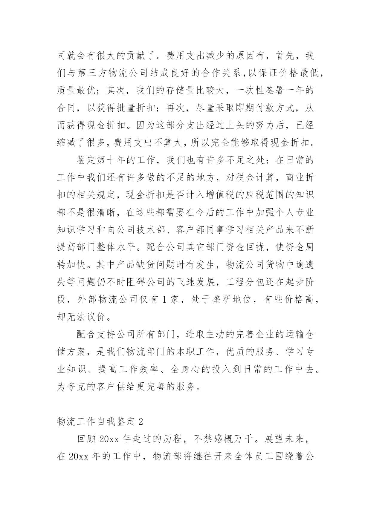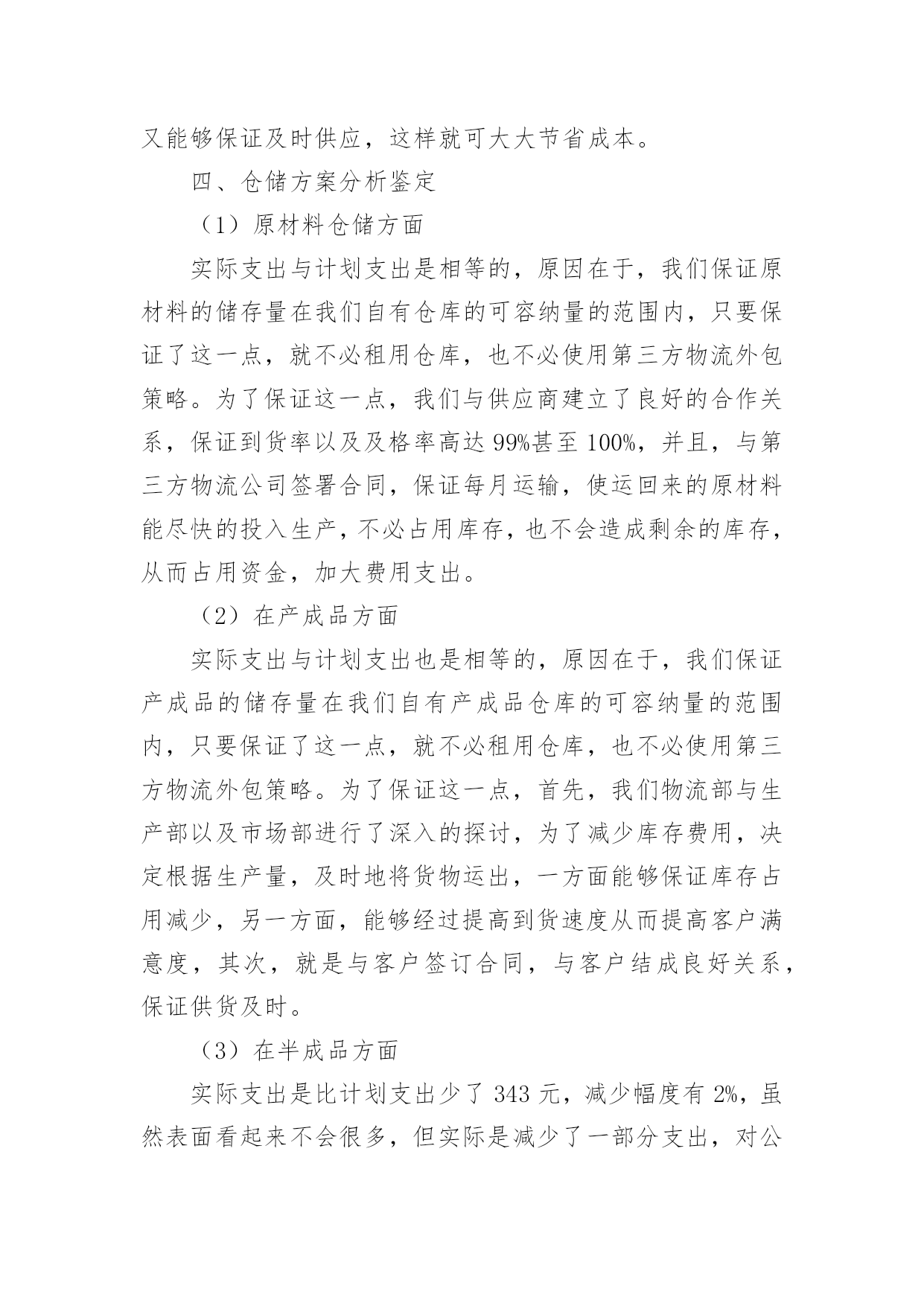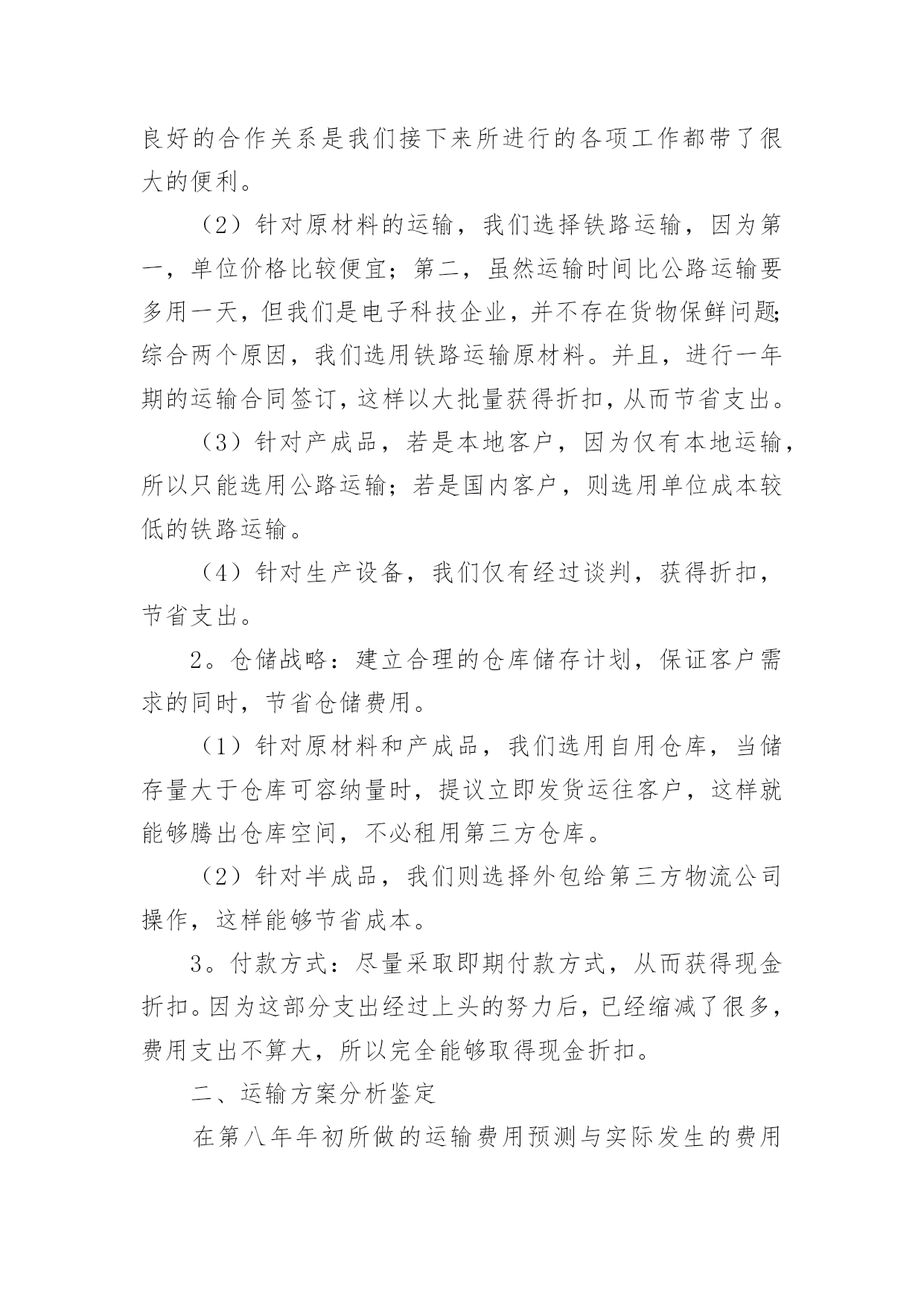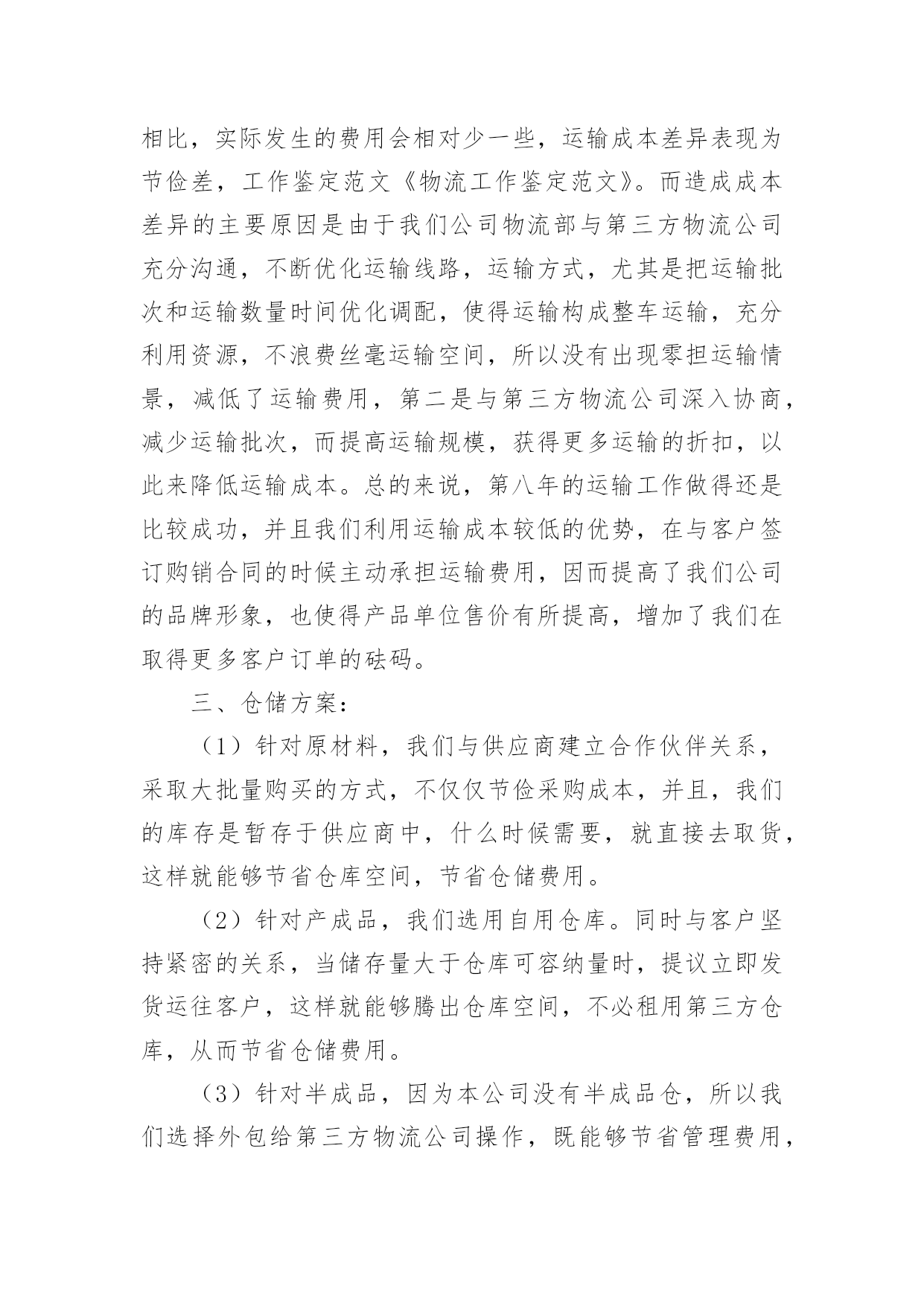 物流工作自我鉴定自我鉴定是个人在一个时期对自己的学习或工作生活的自我总结,自我鉴定可以提升对发现问题的能力,不如立即行动起来写一份自我鉴定吧。自我鉴定怎么写才不会千篇一律呢?以下是小编整理的物流工作自我鉴定,仅供参考,欢迎大家阅读。物流工作自我鉴定1物流部在公司章程的指导下,在公司领导班子的带领下,紧紧围绕物流年度工作思路开展工作,落实目标管理职责,较好的完成了全年各项工作任务,物流工作鉴定范文。我物流部根据仓储的库存容量、仓储成本、运输成本等,在研究需求数量、采购时间、供应商的供货期、到货率等因素的情景下,做好物流工作,确定运输方式、运输批次以及提货时间,以保证原材料的及时供应和生产能够连续进行以及销售交货的及时和完好率。一、运输主要工作如下:1。运输战略:建立完善的物流配送体系,保证按客户的需要及时准确的配送货物,也使原材料及时送达以保证生产的正常运行,在第八年公司物流部的努力下,经过衡量成本费用和服务水平,确定了以下几种配送方式:(1)与四通物流公司建立了深厚的关系,保证货物准时装车发出,以铁路为核心建立夸克公司的物流配送体系。良好的合作关系是我们接下来所进行的各项工作都带了很大的便利。(2)针对原材料的运输,我们选择铁路运输,因为第一,单位价格比较便宜;第二,虽然运输时间比公路运输要多用一天,但我们是电子科技企业,并不存在货物保鲜问题;综合两个原因,我们选用铁路运输原材料。并且,进行一年期的运输合同签订,这样以大批量获得折扣,从而节省支出。(3)针对产成品,若是本地客户,因为仅有本地运输,所以只能选用公路运输;若是国内客户,则选用单位成本较低的铁路运输。(4)针对生产设备,我们仅有经过谈判,获得折扣,节省支出。2。仓储战略:建立合理的仓库储存计划,保证客户需求的同时,节省仓储费用。(1)针对原材料和产成品,我们选用自用仓库,当储存量大于仓库可容纳量时,提议立即发货运往客户,这样就能够腾出仓库空间,不必租用第三方仓库。(2)针对半成品,我们则选择外包给第三方物流公司操作,这样能够节省成本。3。付款方式:尽量采取即期付款方式,从而获得现金折扣。因为这部分支出经过上头的努力后,已经缩减了很多,费用支出不算大,所以完全能够取得现金折扣。二、运输方案分析鉴定在第八年年初所做的运输费用预测与实际发生的费用相比,实际发生的费用会相对少一些,运输成本差异表现为节俭差,工作鉴定范文《物流工作鉴定范文》。而造成成本差异的主要原因是由于我们公司物流部与第三方物流公司充分沟通,不断优化运输线路,运输方式,尤其是把运输批次和运输数量时间优化调配,使得运输构成整车运输,充分利用资源,不浪费丝毫运输空间,所以没有出现零担运输情景,减低了运输费用,第二是与第三方物流公司深入协商,减少运输批次,而提高运输规模,获得更多运输的折扣,以此来降低运输成本。总的来说,第八年的运输工作做得还是比较成功,并且我们利用运输成本较低的优势,在与客户签订购销合同的时候主动承担运输费用,因而提高了我们公司的品牌形象,也使得产品单位售价有所提高,增加了我们在取得更多客户订单的砝码。三、仓储方案:(1)针对原材料,我们与供应商建立合作伙伴关系,采取大批量购买的方式,不仅仅节俭采购成本,并且,我们的库存是暂存于供应商中,什么时候需要,就直接去取货,这样就能够节省仓库空间,节省仓储费用。(2)针对产成品,我们选用自用仓库。同时与客户坚持紧密的关系,当储存量大于仓库可容纳量时,提议立即发货运往客户,这样就能够腾出仓库空间,不必租用第三方仓库,从而节省仓储费用。(3)针对半成品,因为本公司没有半成品仓,所以我们选择外包给第三方物流公司操作,既能够节省管理费用,又能够保证及时供应,这样就可大大节省成本。四、仓储方案分析鉴定(1)原材料仓储方面实际支出与计划支出是相等的,原因在于,我们保证原材料的储存量在我们自有仓库的可容纳量的范围内,只要保证了这一点,就不必租用仓库,也不必使用第三方物流外包策略。为了保证这一点,我们与供应商建立了良好的合作关系,保证到货率以及及格率高达99%甚至100%,并且,与第三方物流公司签署合同,保证每月运输,使运回来的原材料能尽快的投入生产,不必占用库存,也不会造成剩余的库存,从而占用资金,加大费用支出。(2)在产成品方面实际支出与计划支出也是相等的,原因在于,我们保证产成品的储存量在我们自有产成品仓库的可容纳量的范围内,只要保证了这一点,就不必租用仓库,也不必使用第三方物流外包策略。为了保证这一点,首先,我们物流部与生产部以及市场部进行了深入的探讨,为了减少库存费用,决定根据生产量,及时地将货物运出,一方面能够保证库存占用减少,另一方面,能够经过提高到货速度从而提高客户满意度,其次,就是与客户签订合同,与客户结成良好关系,保证供货及时。(3)在半成品方面
