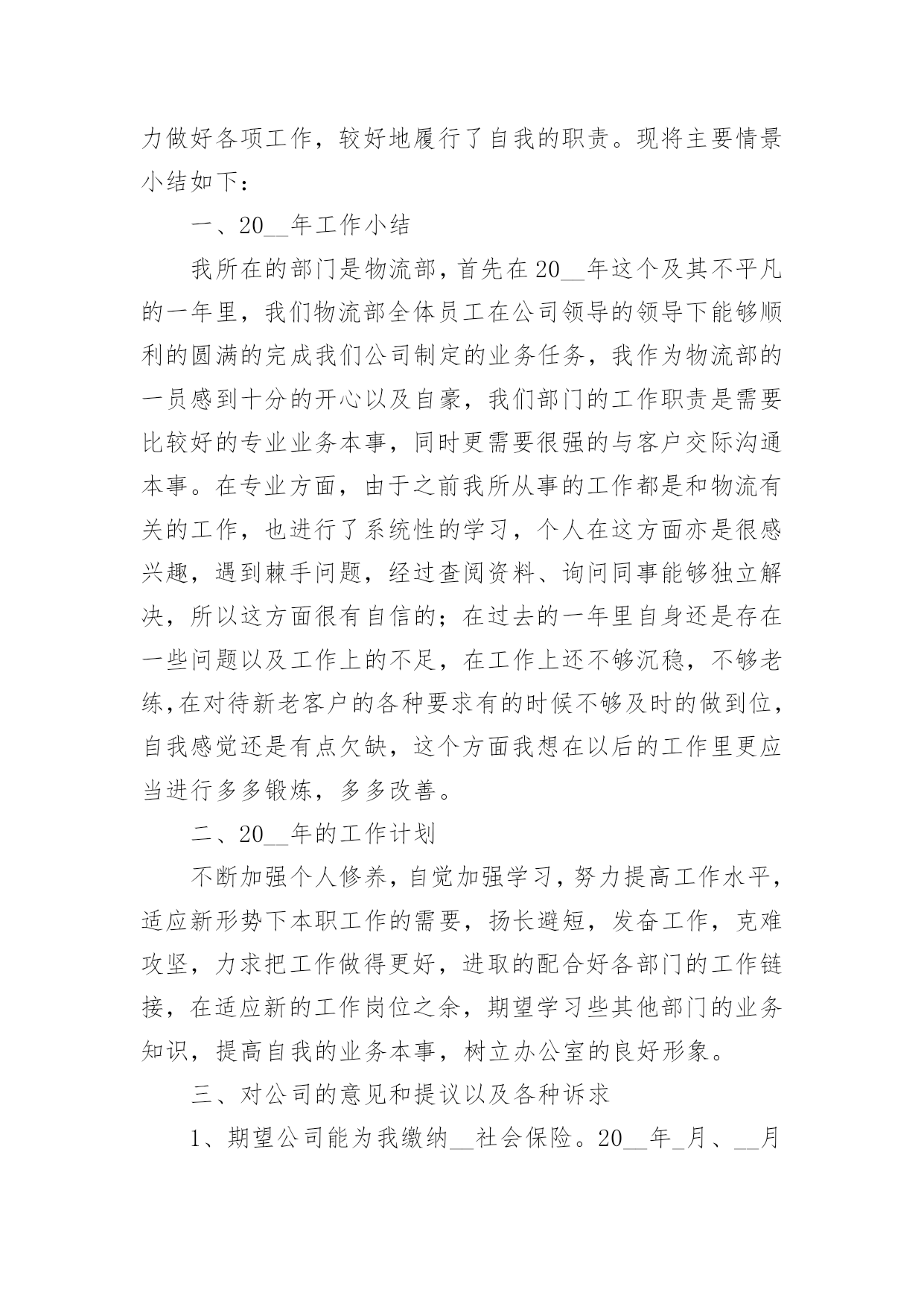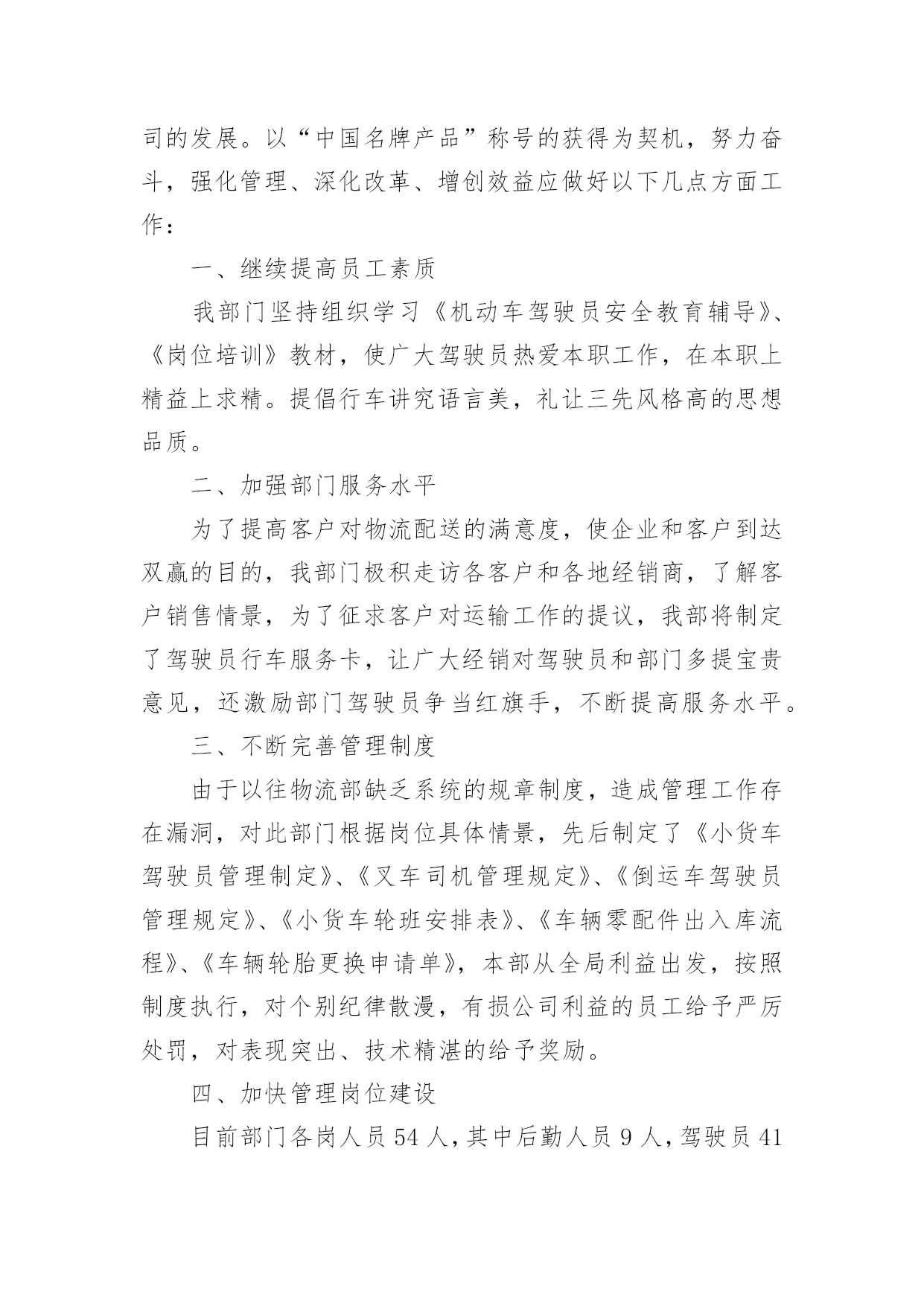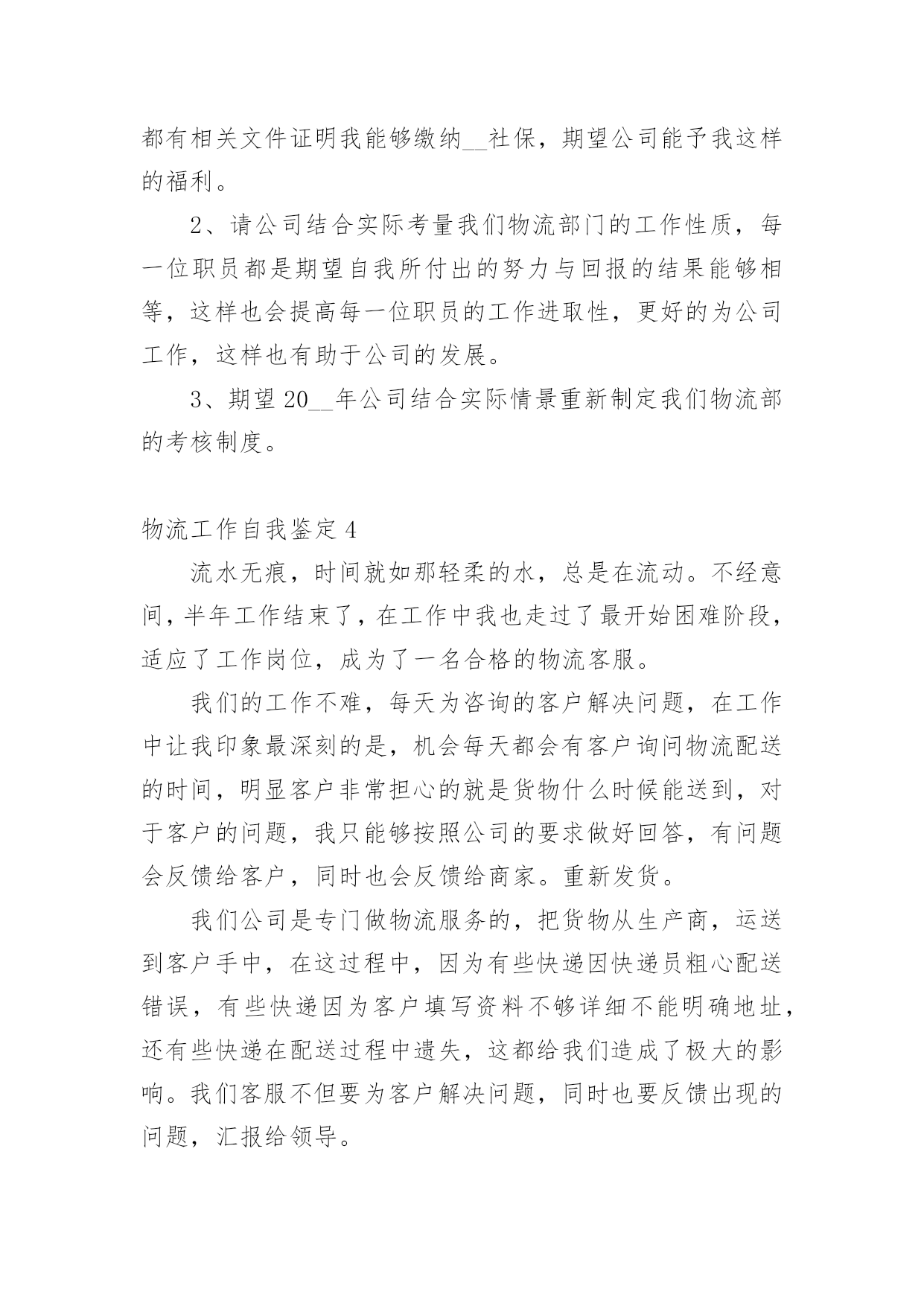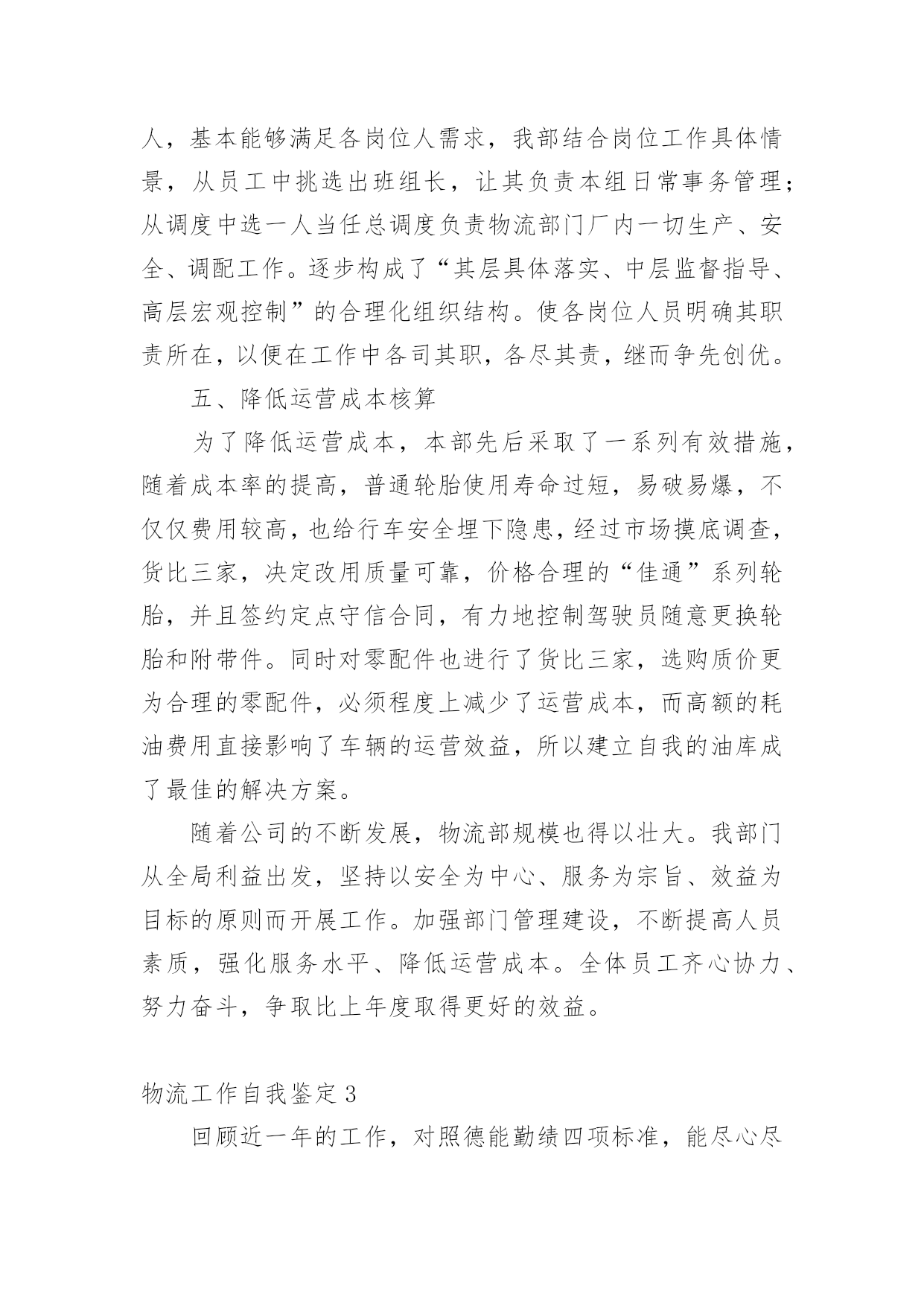 物流工作自我鉴定自我鉴定是个人在一个时期对自己的学习或工作生活的自我总结,自我鉴定可以提升对发现问题的能力,不如立即行动起来写一份自我鉴定吧。自我鉴定怎么写才不会千篇一律呢?以下是小编整理的物流工作自我鉴定,仅供参考,欢迎大家阅读。物流工作自我鉴定1物流部在公司章程的指导下,在公司领导班子的带领下,紧紧围绕物流年度工作思路开展工作,落实目标管理职责,较好的完成了全年各项工作任务,物流工作鉴定范文。我物流部根据仓储的库存容量、仓储成本、运输成本等,在研究需求数量、采购时间、供应商的供货期、到货率等因素的情景下,做好物流工作,确定运输方式、运输批次以及提货时间,以保证原材料的及时供应和生产能够连续进行以及销售交货的及时和完好率。一、运输主要工作如下:1。运输战略:建立完善的物流配送体系,保证按客户的需要及时准确的配送货物,也使原材料及时送达以保证生产的正常运行,在第八年公司物流部的努力下,经过衡量成本费用和服务水平,确定了以下几种配送方式:(1)与四通物流公司建立了深厚的关系,保证货物准时装车发出,以铁路为核心建立夸克公司的物流配送体系。良好的合作关系是我们接下来所进行的各项工作都带了很大的便利。(2)针对原材料的运输,我们选择铁路运输,因为第一,单位价格比较便宜;第二,虽然运输时间比公路运输要多用一天,但我们是电子科技企业,并不存在货物保鲜问题;综合两个原因,我们选用铁路运输原材料。并且,进行一年期的运输合同签订,这样以大批量获得折扣,从而节省支出。(3)针对产成品,若是本地客户,因为仅有本地运输,所以只能选用公路运输;若是国内客户,则选用单位成本较低的铁路运输。(4)针对生产设备,我们仅有经过谈判,获得折扣,节省支出。2。仓储战略:建立合理的仓库储存计划,保证客户需求的同时,节省仓储费用。(1)针对原材料和产成品,我们选用自用仓库,当储存量大于仓库可容纳量时,提议立即发货运往客户,这样就能够腾出仓库空间,不必租用第三方仓库。(2)针对半成品,我们则选择外包给第三方物流公司操作,这样能够节省成本。3。付款方式:尽量采取即期付款方式,从而获得现金折扣。因为这部分支出经过上头的努力后,已经缩减了很多,费用支出不算大,所以完全能够取得现金折扣。二、运输方案分析鉴定在第八年年初所做的运输费用预测与实际发生的费用相比,实际发生的费用会相对少一些,运输成本差异表现为节俭差,工作鉴定范文《物流工作鉴定范文》。而造成成本差异的主要原因是由于我们公司物流部与第三方物流公司充分沟通,不断优化运输线路,运输方式,尤其是把运输批次和运输数量时间优化调配,使得运输构成整车运输,充分利用资源,不浪费丝毫运输空间,所以没有出现零担运输情景,减低了运输费用,第二是与第三方物流公司深入协商,减少运输批次,而提高运输规模,获得更多运输的折扣,以此来降低运输成本。总的来说,第八年的运输工作做得还是比较成功,并且我们利用运输成本较低的优势,在与客户签订购销合同的时候主动承担运输费用,因而提高了我们公司的品牌形象,也使得产品单位售价有所提高,增加了我们在取得更多客户订单的砝码。三、仓储方案:(1)针对原材料,我们与供应商建立合作伙伴关系,采取大批量购买的方式,不仅仅节俭采购成本,并且,我们的库存是暂存于供应商中,什么时候需要,就直接去取货,这样就能够节省仓库空间,节省仓储费用。(2)针对产成品,我们选用自用仓库。同时与客户坚持紧密的关系,当储存量大于仓库可容纳量时,提议立即发货运往客户,这样就能够腾出仓库空间,不必租用第三方仓库,从而节省仓储费用。(3)针对半成品,因为本公司没有半成品仓,所以我们选择外包给第三方物流公司操作,既能够节省管理费用,又能够保证及时供应,这样就可大大节省成本。四、仓储方案分析鉴定(1)原材料仓储方面实际支出与计划支出是相等的,原因在于,我们保证原材料的储存量在我们自有仓库的可容纳量的范围内,只要保证了这一点,就不必租用仓库,也不必使用第三方物流外包策略。为了保证这一点,我们与供应商建立了良好的合作关系,保证到货率以及及格率高达99%甚至100%,并且,与第三方物流公司签署合同,保证每月运输,使运回来的原材料能尽快的投入生产,不必占用库存,也不会造成剩余的库存,从而占用资金,加大费用支出。(2)在产成品方面实际支出与计划支出也是相等的,原因在于,我们保证产成品的储存量在我们自有产成品仓库的可容纳量的范围内,只要保证了这一点,就不必租用仓库,也不必使用第三方物流外包策略。为了保证这一点,首先,我们物流部与生产部以及市场部进行了深入的探讨,为了减少库存费用,决定根据生产量,及时地将货物运出,一方面能够保证库存占用减少,另一方面,能够经过提高到货速度从而提高客户满意度,其次,就是与客户签订合同,与客户结成良好关系,保证供货及时。(3)在半成品方面