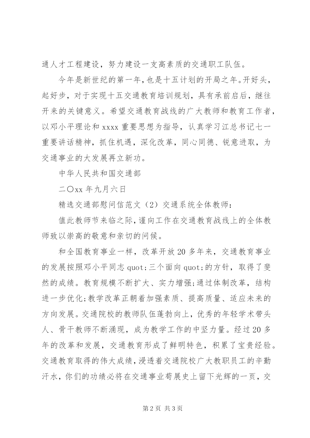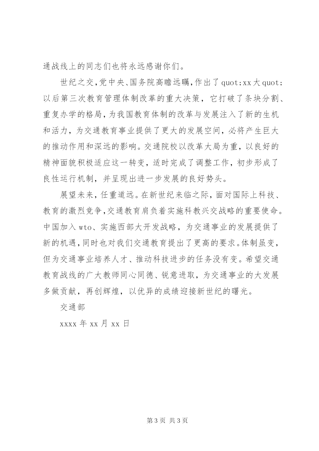 第PAGE\*Arabic\*MERGEFORMAT3页共NUMPAGES\*MERGEFORMAT3页精选交通部慰问信范文精选交通部慰问信范文(1)交通系统全体教职员工同志们:值此我国第xx个教师节来临之际,谨向工作在交通教育战线上的全体教师和教育工作者致以崇高的敬意和节目的问候。改革开放20多年来,交通教育事业按照邓小平同志三个面向的方针,取得了令人瞩目的成绩。教学改革正朝着加强素质、提高质量、适应未来的方向发展。交通院校的教师队伍蓬勃向上,骨干教师、优秀的年轻学术带头人不断涌现,成为教学工作的中坚力量。交通教育形成了鲜明特色,积累了宝贵经验。交通教育取得的成绩,凝聚了交通系统广大教师和教育工作者的心血和智慧。21世纪的第一个五年,是我国改革开放深入发展,经济结构进行战略性调整,建立比较完善的社会主义市场经济体制,实施现代化建设第三步战略部署的关键时期。中国加入世贸组织、实施西部大开发战略,为交通事业的发展提供了新的机遇,同时也对交通教育提出了新的更高的要求。交通事业发展的关键取决于职工队伍素质的全面提高。十五期间,交通行业将进一步实施科教兴交战略,以科技创新和人才培养为依托,加快交通现代化建设。交通教育要以提高职工队伍整体素质为目标,以改革和创新为动力,以推进交通职工各类教育培训为手段,进一步加强交通人才工程建设,努力建设一支高素质的交通职工队伍。今年是新世纪的第一年,也是十五计划的开局之年。开好头,起好步,对于实现十五交通教育培训规划,具有承前启后,继往开来的关键意义。希望交通教育战线的广大教师和教育工作者,以邓小平理论和xxxx重要思想为指导,认真学习江总书记七一重要讲话精神,抓住机遇,深化改革,同心同德、锐意进取,为交通事业的大发展再立新功。中华人民共和国交通部二○xx年九月六日精选交通部慰问信范文(2)交通系统全体教师:值此教师节来临之际,谨向工作在交通教育战线上的全体教师致以崇高的敬意和亲切的问候。和全国教育事业一样,改革开放20多年来,交通教育事业的发展按照邓小平同志quot;三个面向quot;的方针,取得了斐然的成绩。教育规模不断扩大、实力增强;通过体制改革,结构进一步优化;教学改革正朝着加强素质、提高质量、适应未来的方向发展。交通院校的教师队伍蓬勃向上,优秀的年轻学术带头人、骨干教师不断涌现,成为教学工作的中坚力量。经过20多年的改革和发展,交通教育形成了鲜明特色,积累了宝贵经验。交通教育取得的伟大成绩,浸透着交通院校广大教职员工的辛勤汗水,你们的功绩必将在交通事业苟展史上留下光辉的一页,交通战线上的同志们也将永远感谢你们。世纪之交,党中央、国务院高瞻远瞩,作出了quot;xx大quot;以后第三次教育管理体制改革的重大决策,它打破了条块分割、重复办学的格局,为我国教育体制的改革与发展注入了新的生机和活力,为交通教育事业提供了更大的发展空间,必将产生巨大的推动作用和深远的影响。交通院校以改革大局为重,以良好的精神面貌积极适应这一转变,适时完成了调整工作,初步形成了良性运行机制,并呈现出进一步发展的良好势头。展望未来,任重道远。在新世纪来临之际,面对国际上科技、教育的激烈竞争,交通教育肩负着实施科教兴交战略的重要使命。中国加入wto、实施西部大开发战略,为交通事业的发展提供了新的机遇,同时也对我们交通教育提出了更高的要求。体制虽变,但为交通事业培养人才、推动科技进步的任务没有变。希望交通教育战线的广大教师同心同德、锐意进取,为交通事业的大发展多做贡献,再创辉煌,以优异的成绩迎接新世纪的曙光。交通部xxxx年xx月xx日