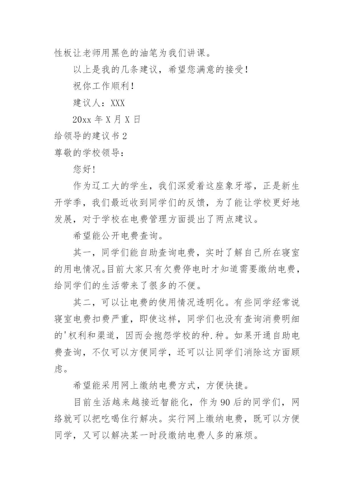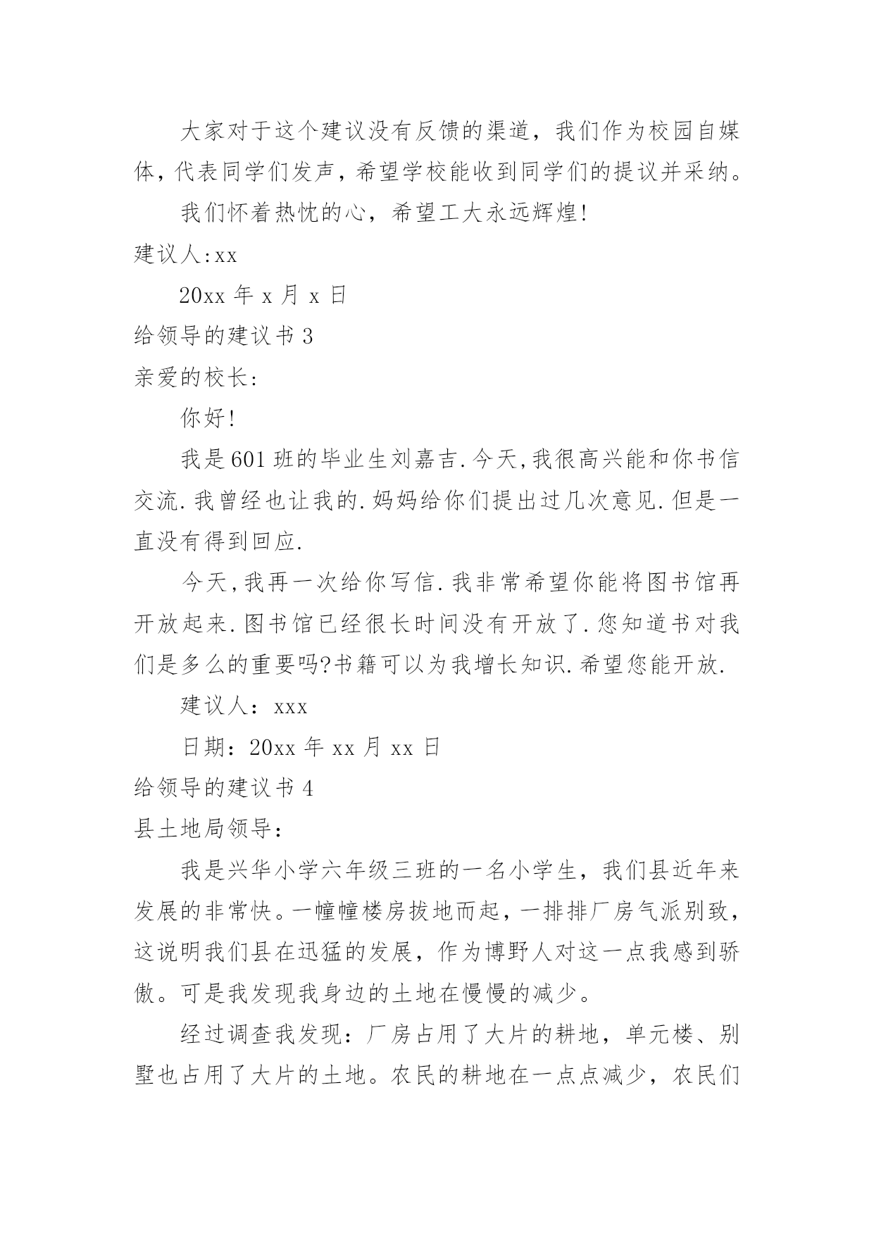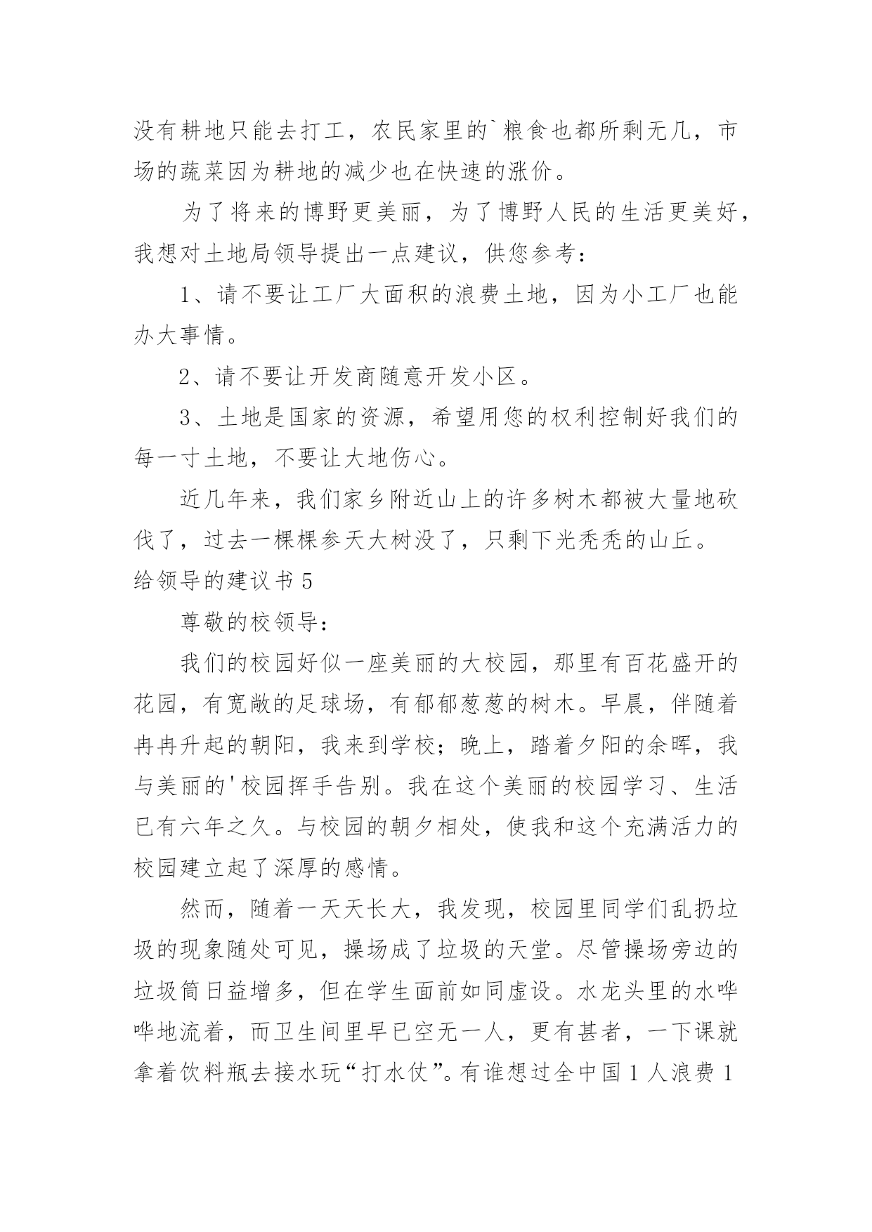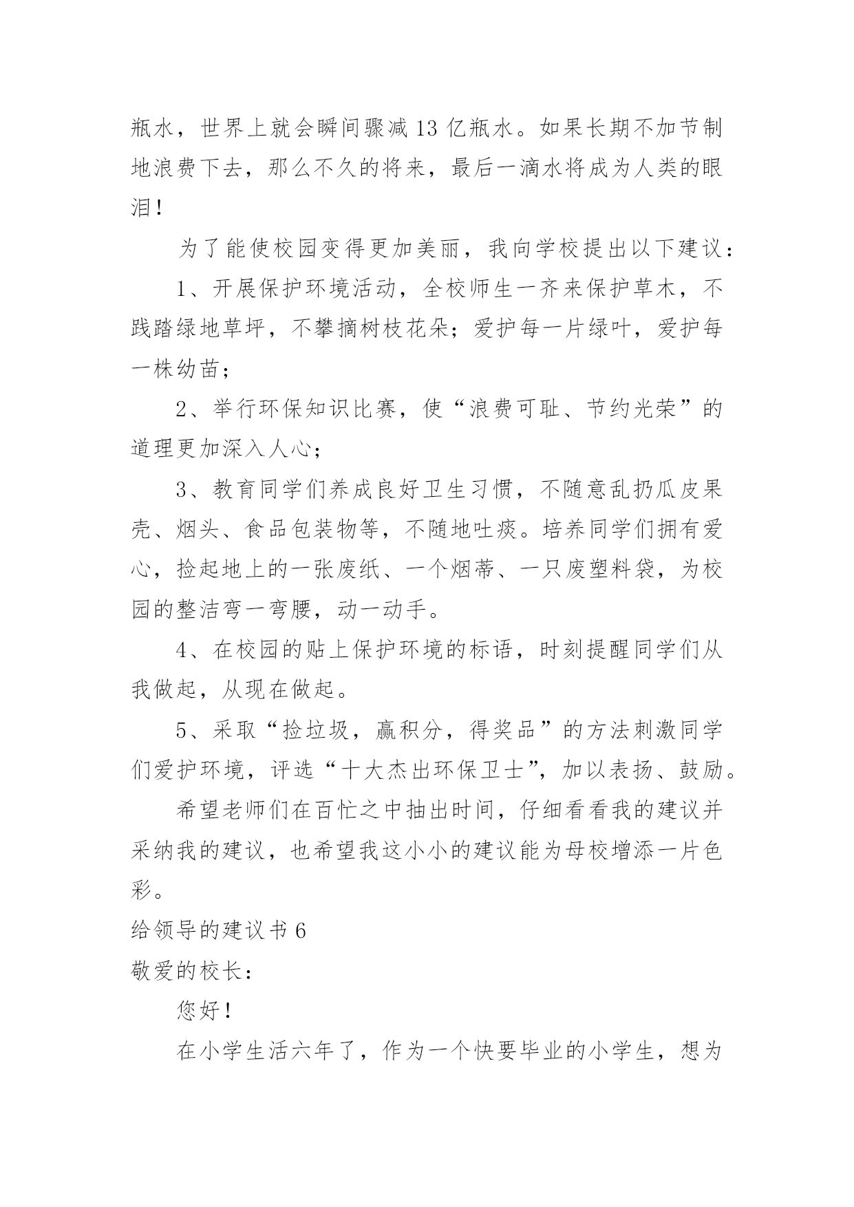 给领导的建议书给领导的建议书在不断进步的时代,建议书与我们的生活息息相关,当建议书是面对领导和有关部门时,可以中肯地提出自己对对方工作的意见和自己的建议。怎么写建议书才能避免踩雷呢?下面是小编为大家整理的给领导的建议书,希望对大家有所帮助。给领导的建议书1尊敬的校长:您好!首先感想您在百忙中抽空我的建议书。我想在这里,举出学校一些待改进的.地方,请校长采纳:1、使用礼貌用语,讲话注意场合,态度友善。2、节约纸张、用水、用电在公共场所不喧哗、不随地吐痰,减少噪音与二氧化碳的污染。3、爱护公用设施、爱护庄稼、花草、树木、爱护动物和生态环境。4、学校以后要多开展丰富多彩的课外活动,使同学们培养健康爱好的兴趣,不再乱花钱购买零食。5、为了保护我们班级的卫生,把黑板改善为白色的磁性板让老师用黑色的油笔为我们讲课。以上是我的几条建议,希望您满意的接受!祝你工作顺利!建议人:XXX20xx年X月X日给领导的建议书2尊敬的学校领导:您好!作为辽工大的学生,我们深爱着这座象牙塔,正是新生开学季,我们最近收到同学们的反馈,为了能让学校更好地发展,对于学校在电费管理方面提出了两点建议。希望能公开电费查询。其一,同学们能自助查询电费,实时了解自己所在寝室的用电情况。目前大家只有欠费停电时才知道需要缴纳电费,给同学们的生活带来了很多的不便。其二,可以让电费的使用情况透明化。有些同学经常说寝室电费扣费严重,即使这样,同学们也没有查询消费明细的'权利和渠道,因而会抱怨学校的种.种。如果开通自助电费查询,不仅可以方便同学,还可以让同学们消除这方面顾虑。希望能采用网上缴纳电费方式,方便快捷。目前生活越来越接近智能化,作为90后的同学们,网络就可以把吃喝住行解决。实行网上缴纳电费,既可以方便同学,又可以解决某一时段缴纳电费人多的麻烦。大家对于这个建议没有反馈的渠道,我们作为校园自媒体,代表同学们发声,希望学校能收到同学们的提议并采纳。我们怀着热忱的心,希望工大永远辉煌!建议人:xx20xx年x月x日给领导的建议书3亲爱的校长:你好!我是601班的毕业生刘嘉吉.今天,我很高兴能和你书信交流.我曾经也让我的.妈妈给你们提出过几次意见.但是一直没有得到回应.今天,我再一次给你写信.我非常希望你能将图书馆再开放起来.图书馆已经很长时间没有开放了.您知道书对我们是多么的重要吗?书籍可以为我增长知识.希望您能开放.建议人:xxx日期:20xx年xx月xx日给领导的建议书4县土地局领导:我是兴华小学六年级三班的一名小学生,我们县近年来发展的非常快。一幢幢楼房拔地而起,一排排厂房气派别致,这说明我们县在迅猛的发展,作为博野人对这一点我感到骄傲。可是我发现我身边的土地在慢慢的减少。经过调查我发现:厂房占用了大片的耕地,单元楼、别墅也占用了大片的土地。农民的耕地在一点点减少,农民们没有耕地只能去打工,农民家里的`粮食也都所剩无几,市场的蔬菜因为耕地的减少也在快速的涨价。为了将来的博野更美丽,为了博野人民的生活更美好,我想对土地局领导提出一点建议,供您参考:1、请不要让工厂大面积的浪费土地,因为小工厂也能办大事情。2、请不要让开发商随意开发小区。3、土地是国家的资源,希望用您的权利控制好我们的每一寸土地,不要让大地伤心。近几年来,我们家乡附近山上的许多树木都被大量地砍伐了,过去一棵棵参天大树没了,只剩下光秃秃的山丘。给领导的建议书5尊敬的校领导:我们的校园好似一座美丽的大校园,那里有百花盛开的花园,有宽敞的足球场,有郁郁葱葱的树木。早晨,伴随着冉冉升起的朝阳,我来到学校;晚上,踏着夕阳的余晖,我与美丽的'校园挥手告别。我在这个美丽的校园学习、生活已有六年之久。与校园的朝夕相处,使我和这个充满活力的校园建立起了深厚的感情。然而,随着一天天长大,我发现,校园里同学们乱扔垃圾的现象随处可见,操场成了垃圾的天堂。尽管操场旁边的垃圾筒日益增多,但在学生面前如同虚设。水龙头里的水哗哗地流着,而卫生间里早已空无一人,更有甚者,一下课就拿着饮料瓶去接水玩“打水仗”。有谁想过全中国1人浪费1瓶水,世界上就会瞬间骤减13亿瓶水。如果长期不加节制地浪费下去,那么不久的将来,最后一滴水将成为人类的眼泪!为了能使校园变得更加美丽,我向学校提出以下建议:1、开展保护环境活动,全校师生一齐来保护草木,不践踏绿地草坪,不攀摘树枝花朵;爱护每一片绿叶,爱护每一株幼苗;2、举行环保知识比赛,使“浪费可耻、节约光荣”的道理更加深入人心;3、教育同学们养成良好卫生习惯,不随意乱扔瓜皮果壳、烟头、食品包装物等,不随地吐痰。培养同学们拥有爱心,捡起地上的一张废纸、一个烟蒂、一只废塑料袋,为校园的整洁弯一弯腰,动一动手。4、在校园的贴上保护环境的标语,时刻提醒同学们从我做起,从现在做起。5、采取“捡垃圾,赢积分,得奖品”的方