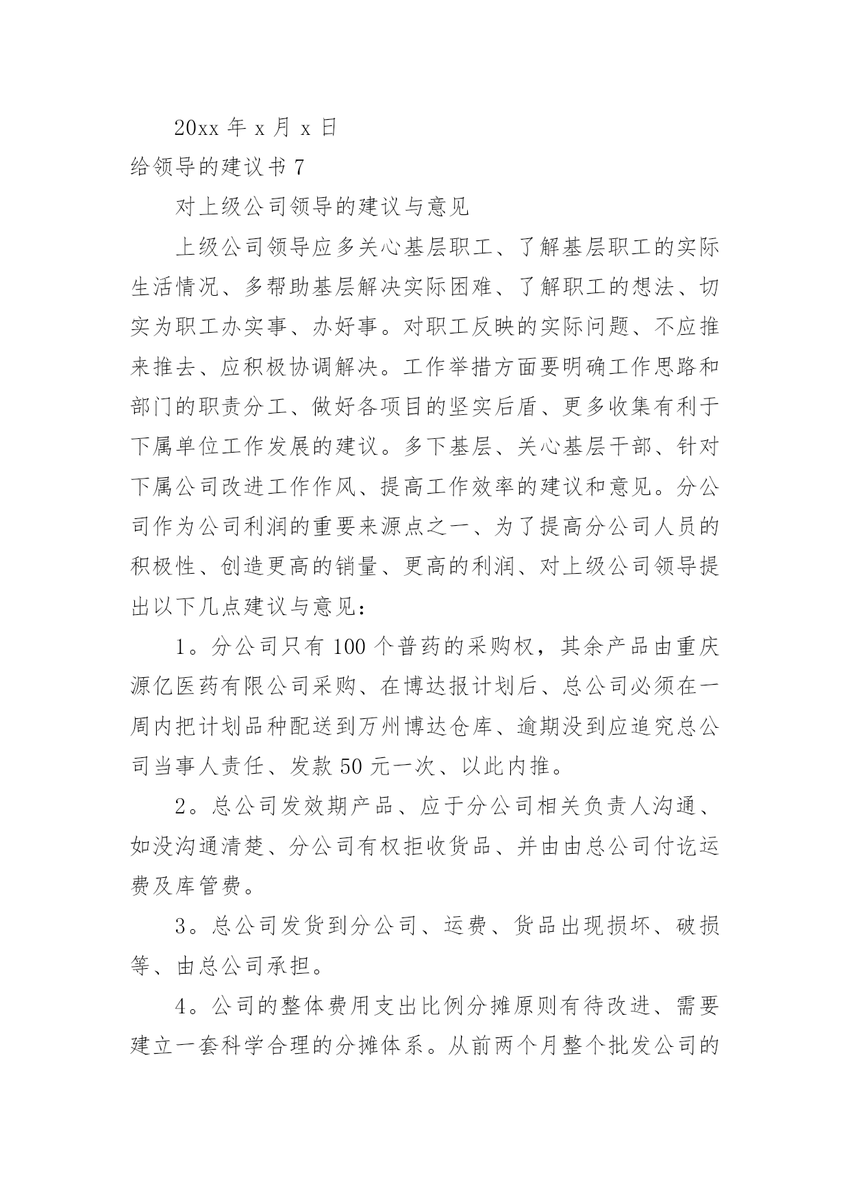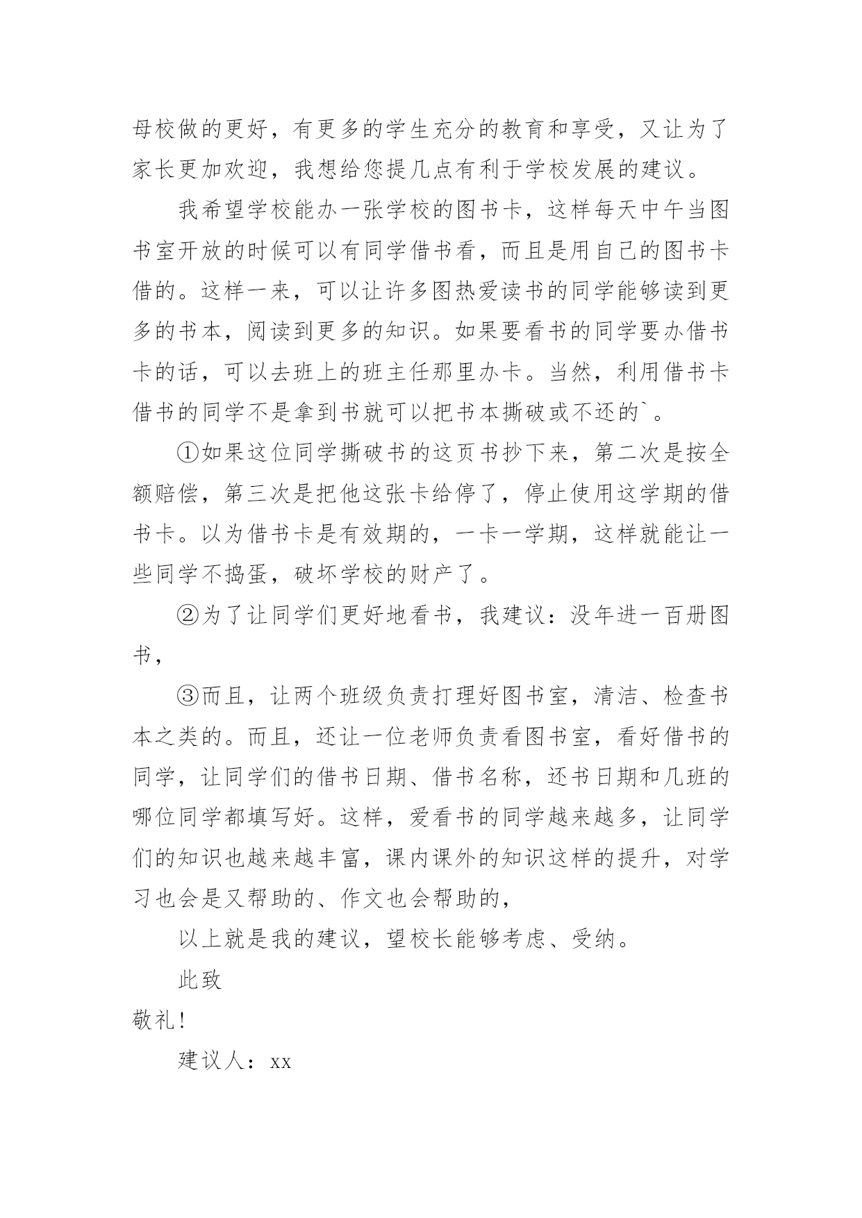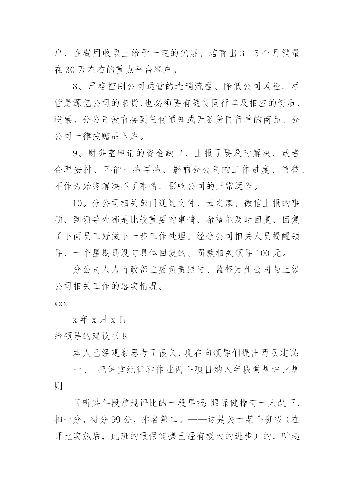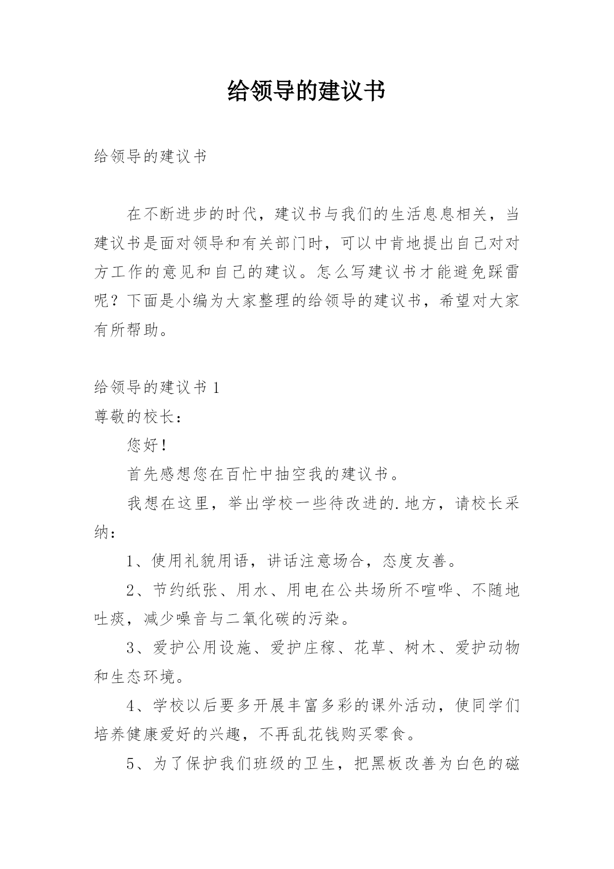 给领导的建议书给领导的建议书在不断进步的时代,建议书与我们的生活息息相关,当建议书是面对领导和有关部门时,可以中肯地提出自己对对方工作的意见和自己的建议。怎么写建议书才能避免踩雷呢?下面是小编为大家整理的给领导的建议书,希望对大家有所帮助。给领导的建议书1尊敬的校长:您好!首先感想您在百忙中抽空我的建议书。我想在这里,举出学校一些待改进的.地方,请校长采纳:1、使用礼貌用语,讲话注意场合,态度友善。2、节约纸张、用水、用电在公共场所不喧哗、不随地吐痰,减少噪音与二氧化碳的污染。3、爱护公用设施、爱护庄稼、花草、树木、爱护动物和生态环境。4、学校以后要多开展丰富多彩的课外活动,使同学们培养健康爱好的兴趣,不再乱花钱购买零食。5、为了保护我们班级的卫生,把黑板改善为白色的磁性板让老师用黑色的油笔为我们讲课。以上是我的几条建议,希望您满意的接受!祝你工作顺利!建议人:XXX20xx年X月X日给领导的建议书2尊敬的学校领导:您好!作为辽工大的学生,我们深爱着这座象牙塔,正是新生开学季,我们最近收到同学们的反馈,为了能让学校更好地发展,对于学校在电费管理方面提出了两点建议。希望能公开电费查询。其一,同学们能自助查询电费,实时了解自己所在寝室的用电情况。目前大家只有欠费停电时才知道需要缴纳电费,给同学们的生活带来了很多的不便。其二,可以让电费的使用情况透明化。有些同学经常说寝室电费扣费严重,即使这样,同学们也没有查询消费明细的'权利和渠道,因而会抱怨学校的种.种。如果开通自助电费查询,不仅可以方便同学,还可以让同学们消除这方面顾虑。希望能采用网上缴纳电费方式,方便快捷。目前生活越来越接近智能化,作为90后的同学们,网络就可以把吃喝住行解决。实行网上缴纳电费,既可以方便同学,又可以解决某一时段缴纳电费人多的麻烦。大家对于这个建议没有反馈的渠道,我们作为校园自媒体,代表同学们发声,希望学校能收到同学们的提议并采纳。我们怀着热忱的心,希望工大永远辉煌!建议人:xx20xx年x月x日给领导的建议书3亲爱的校长:你好!我是601班的毕业生刘嘉吉.今天,我很高兴能和你书信交流.我曾经也让我的.妈妈给你们提出过几次意见.但是一直没有得到回应.今天,我再一次给你写信.我非常希望你能将图书馆再开放起来.图书馆已经很长时间没有开放了.您知道书对我们是多么的重要吗?书籍可以为我增长知识.希望您能开放.建议人:xxx日期:20xx年xx月xx日给领导的建议书4县土地局领导:我是兴华小学六年级三班的一名小学生,我们县近年来发展的非常快。一幢幢楼房拔地而起,一排排厂房气派别致,这说明我们县在迅猛的发展,作为博野人对这一点我感到骄傲。可是我发现我身边的土地在慢慢的减少。经过调查我发现:厂房占用了大片的耕地,单元楼、别墅也占用了大片的土地。农民的耕地在一点点减少,农民们没有耕地只能去打工,农民家里的`粮食也都所剩无几,市场的蔬菜因为耕地的减少也在快速的涨价。为了将来的博野更美丽,为了博野人民的生活更美好,我想对土地局领导提出一点建议,供您参考:1、请不要让工厂大面积的浪费土地,因为小工厂也能办大事情。2、请不要让开发商随意开发小区。3、土地是国家的资源,希望用您的权利控制好我们的每一寸土地,不要让大地伤心。近几年来,我们家乡附近山上的许多树木都被大量地砍伐了,过去一棵棵参天大树没了,只剩下光秃秃的山丘。给领导的建议书5尊敬的校领导:我们的校园好似一座美丽的大校园,那里有百花盛开的花园,有宽敞的足球场,有郁郁葱葱的树木。早晨,伴随着冉冉升起的朝阳,我来到学校;晚上,踏着夕阳的余晖,我与美丽的'校园挥手告别。我在这个美丽的校园学习、生活已有六年之久。与校园的朝夕相处,使我和这个充满活力的校园建立起了深厚的感情。然而,随着一天天长大,我发现,校园里同学们乱扔垃圾的现象随处可见,操场成了垃圾的天堂。尽管操场旁边的垃圾筒日益增多,但在学生面前如同虚设。水龙头里的水哗哗地流着,而卫生间里早已空无一人,更有甚者,一下课就拿着饮料瓶去接水玩“打水仗”。有谁想过全中国1人浪费1瓶水,世界上就会瞬间骤减13亿瓶水。如果长期不加节制地浪费下去,那么不久的将来,最后一滴水将成为人类的眼泪!为了能使校园变得更加美丽,我向学校提出以下建议:1、开展保护环境活动,全校师生一齐来保护草木,不践踏绿地草坪,不攀摘树枝花朵;爱护每一片绿叶,爱护每一株幼苗;2、举行环保知识比赛,使“浪费可耻、节约光荣”的道理更加深入人心;3、教育同学们养成良好卫生习惯,不随意乱扔瓜皮果壳、烟头、食品包装物等,不随地吐痰。培养同学们拥有爱心,捡起地上的一张废纸、一个烟蒂、一只废塑料袋,为校园的整洁弯一弯腰,动一动手。4、在校园的贴上保护环境的标语,时刻提醒同学们从我做起,从现在做起。5、采取“捡垃圾,赢积分,得奖品”的方
